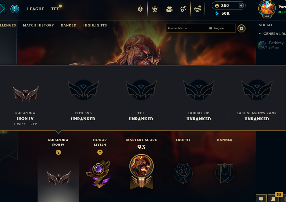 ⚡ 【 ME 】 ⸱ Iron IV 2% WR +39Games ⚡ | Hand - ( leveled + De-ranked ✌️ ) | Unverified ✅ | 30044 BE 💵 | 350 RP 💰 | Untouched-Loot 🔒