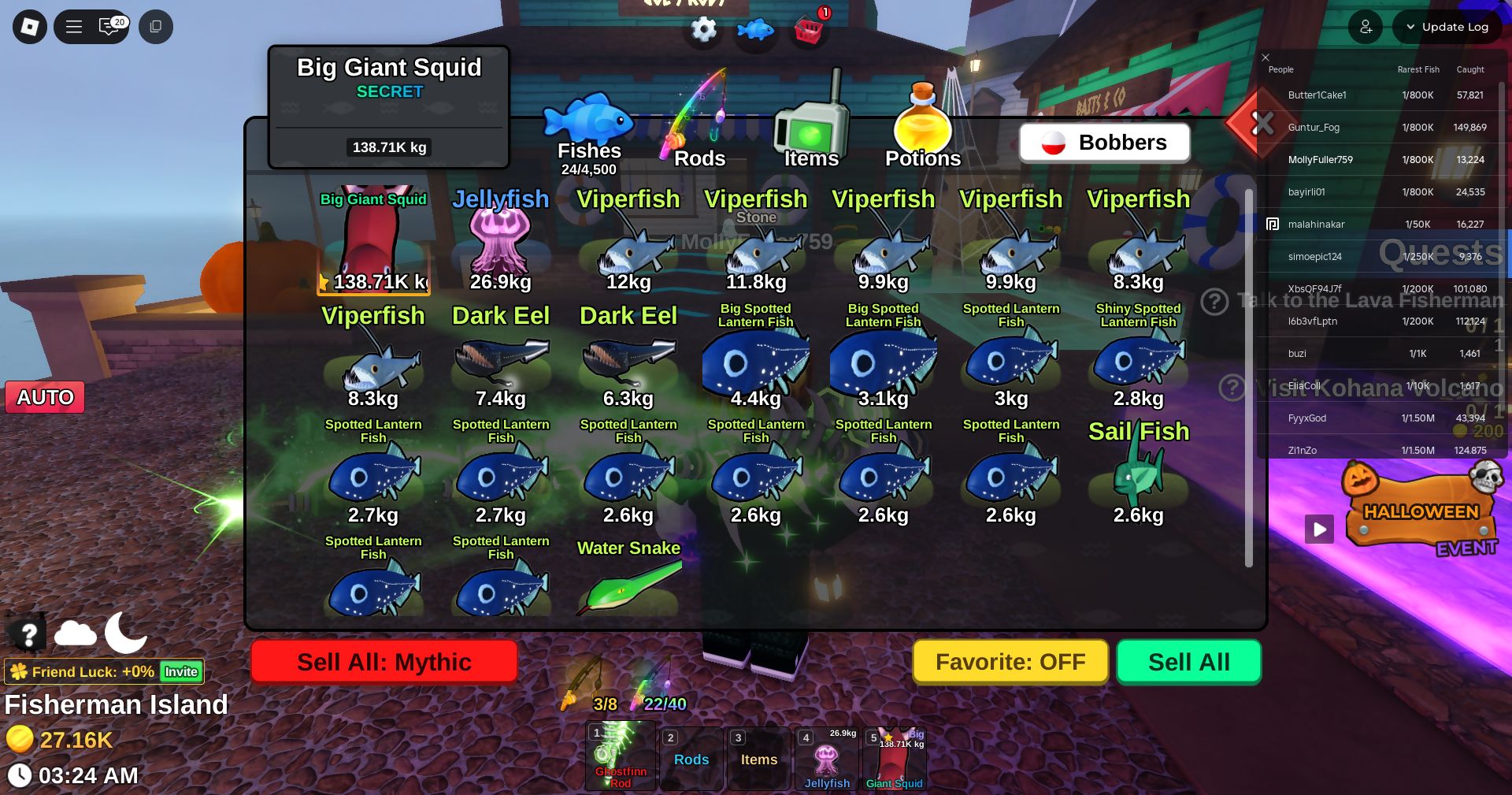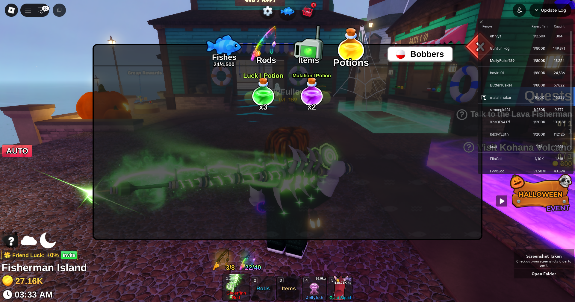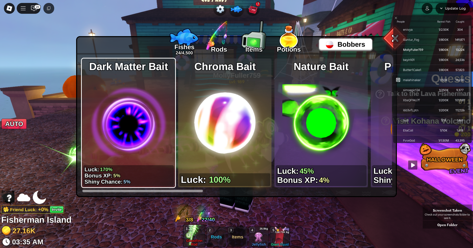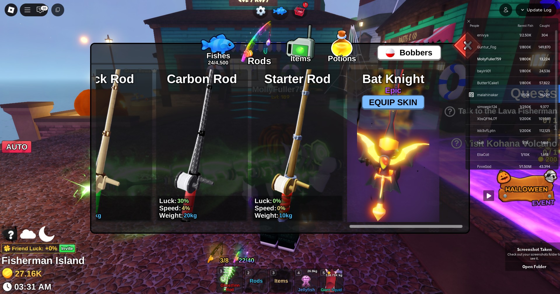 Fish it Account ❄️ Ghostfinn Rod ❄️ Flourescent Rod ❄️ dark matter bait ❄️ secret + mythic Fish ❄️ 1/800k catch ❄️ 27k Coin ❄️ Skin Rods ❄️ Level 189