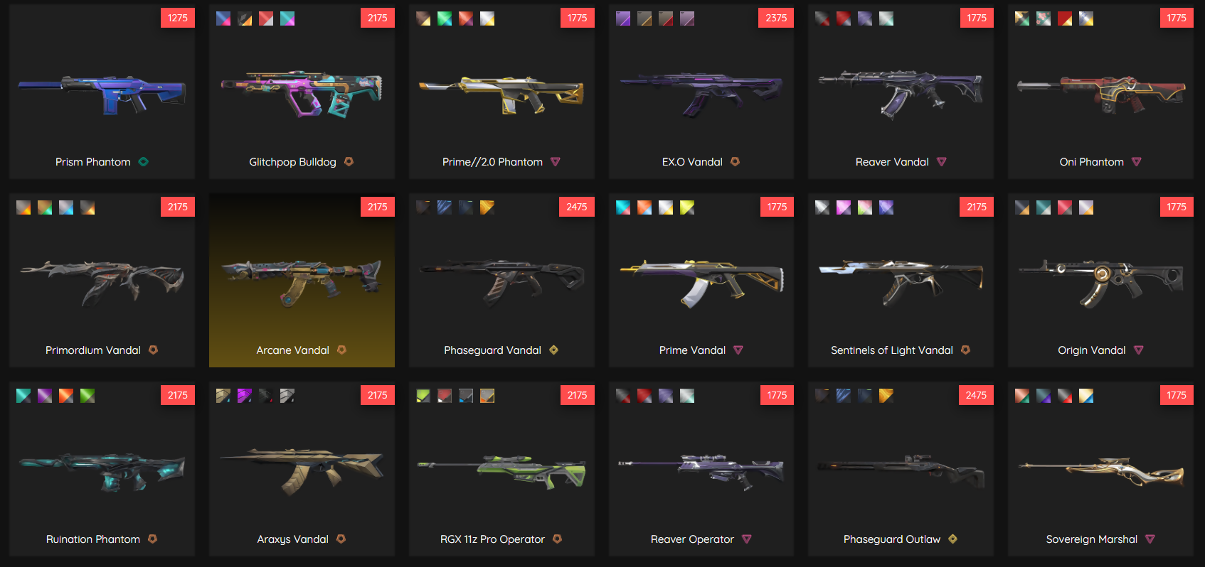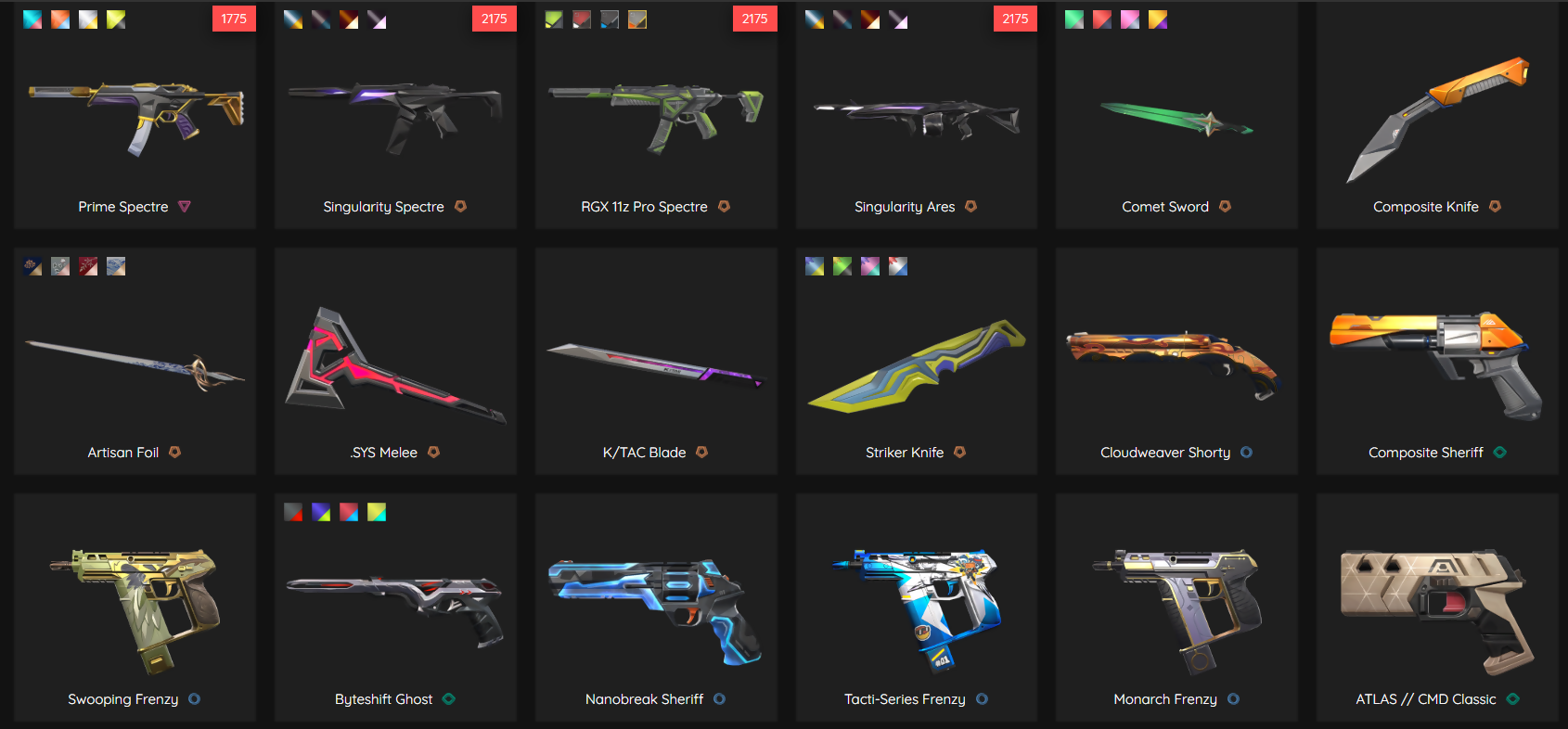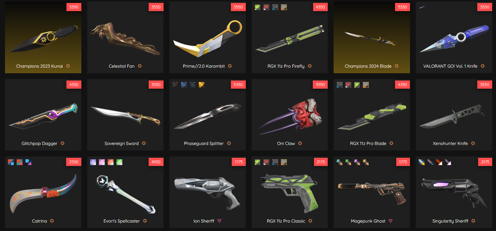 Champions 2023 Kunai, Champions 2024 Blade, Evori's Spellcaster, Phaseguard Splitter, Glitchpop Dagger, RGX Firefly + Blade, Prime 2.0 Karambit, Sovereign Sword, Oni Claw, Celestial Fan, Catrina, VALORANT GO! Vol. 1, Xenohunter