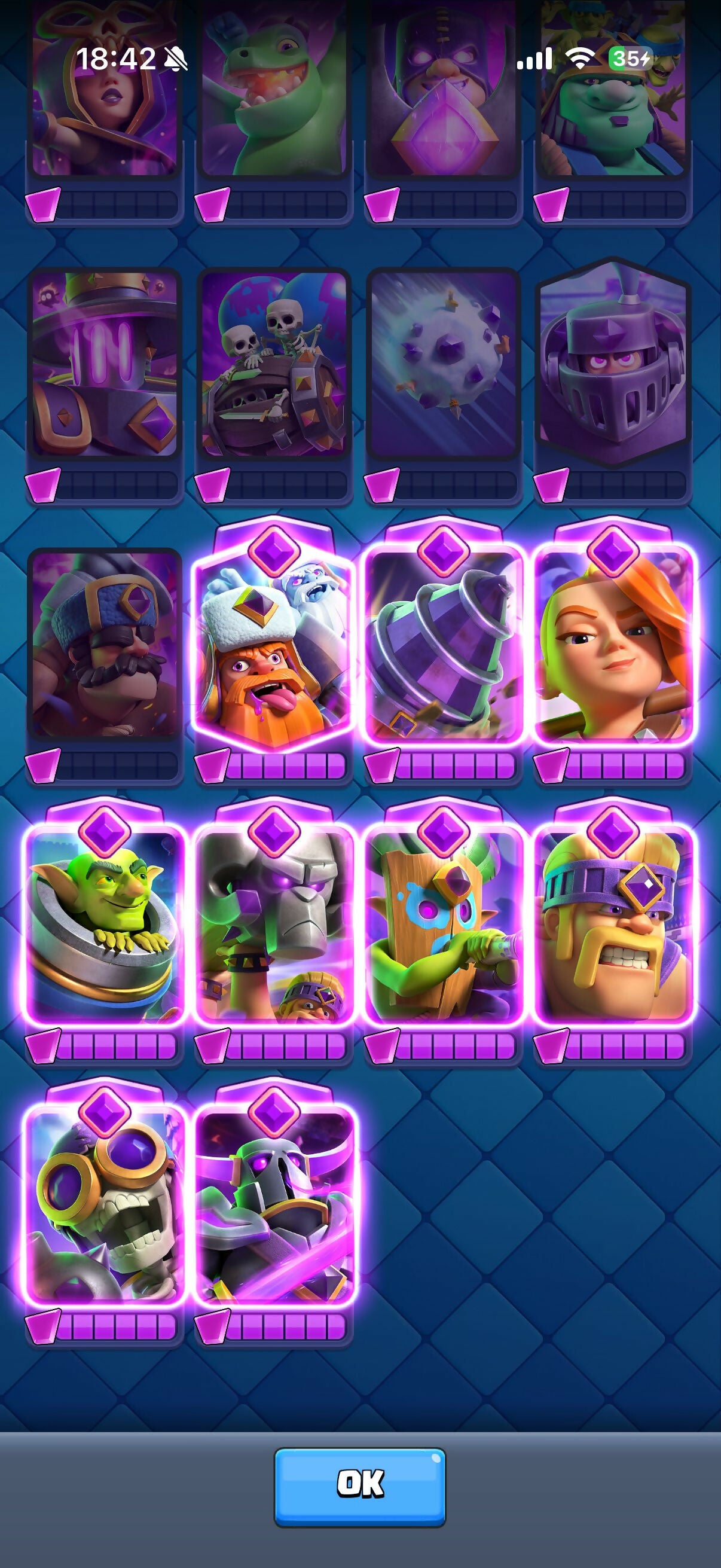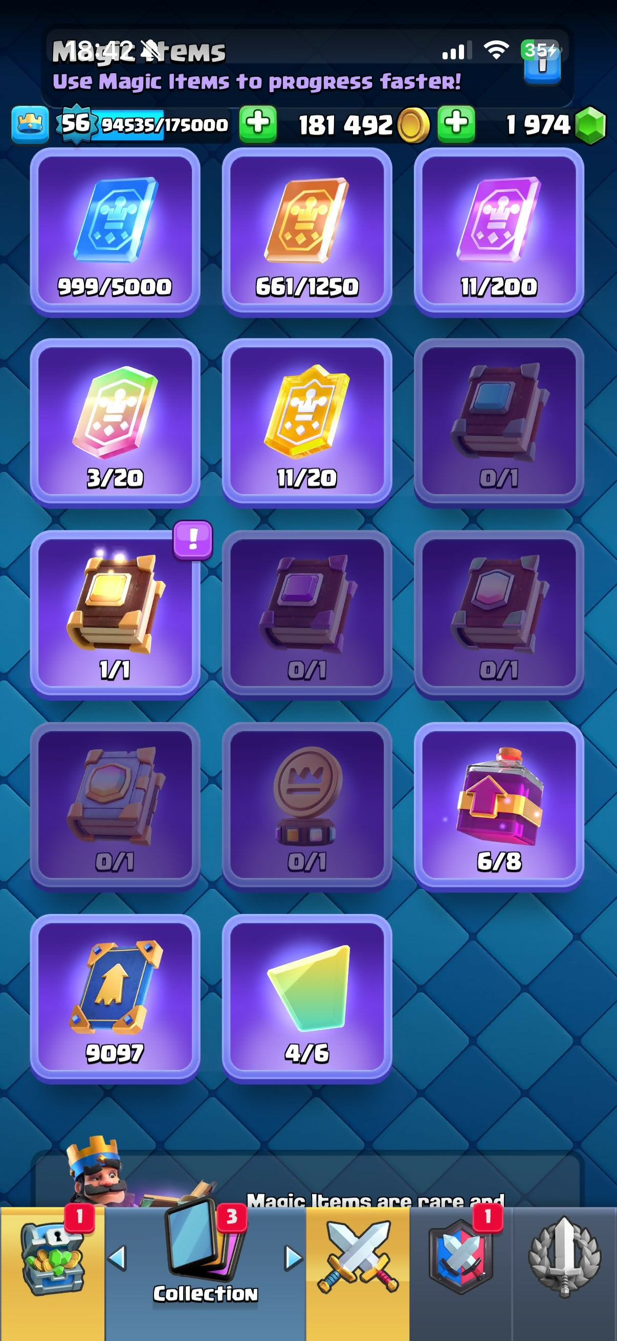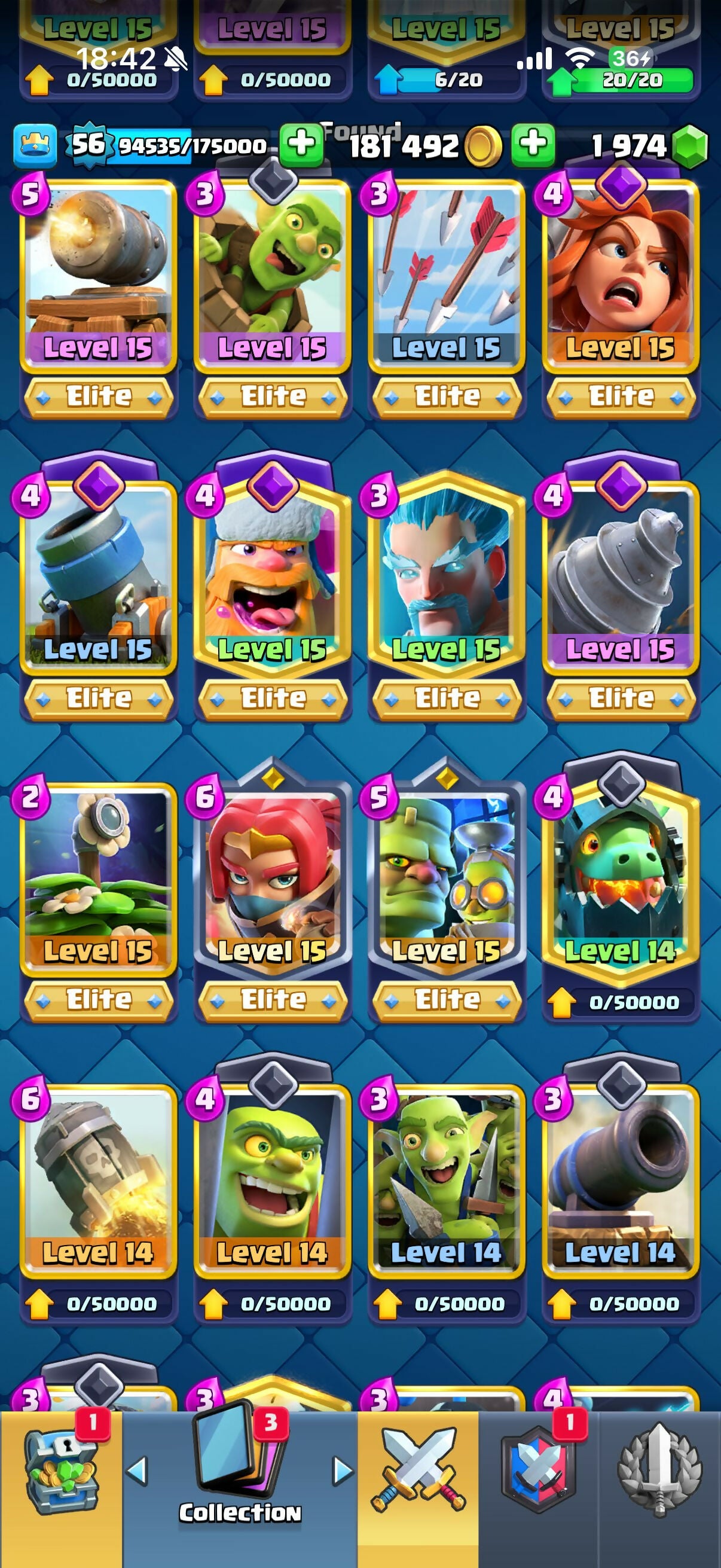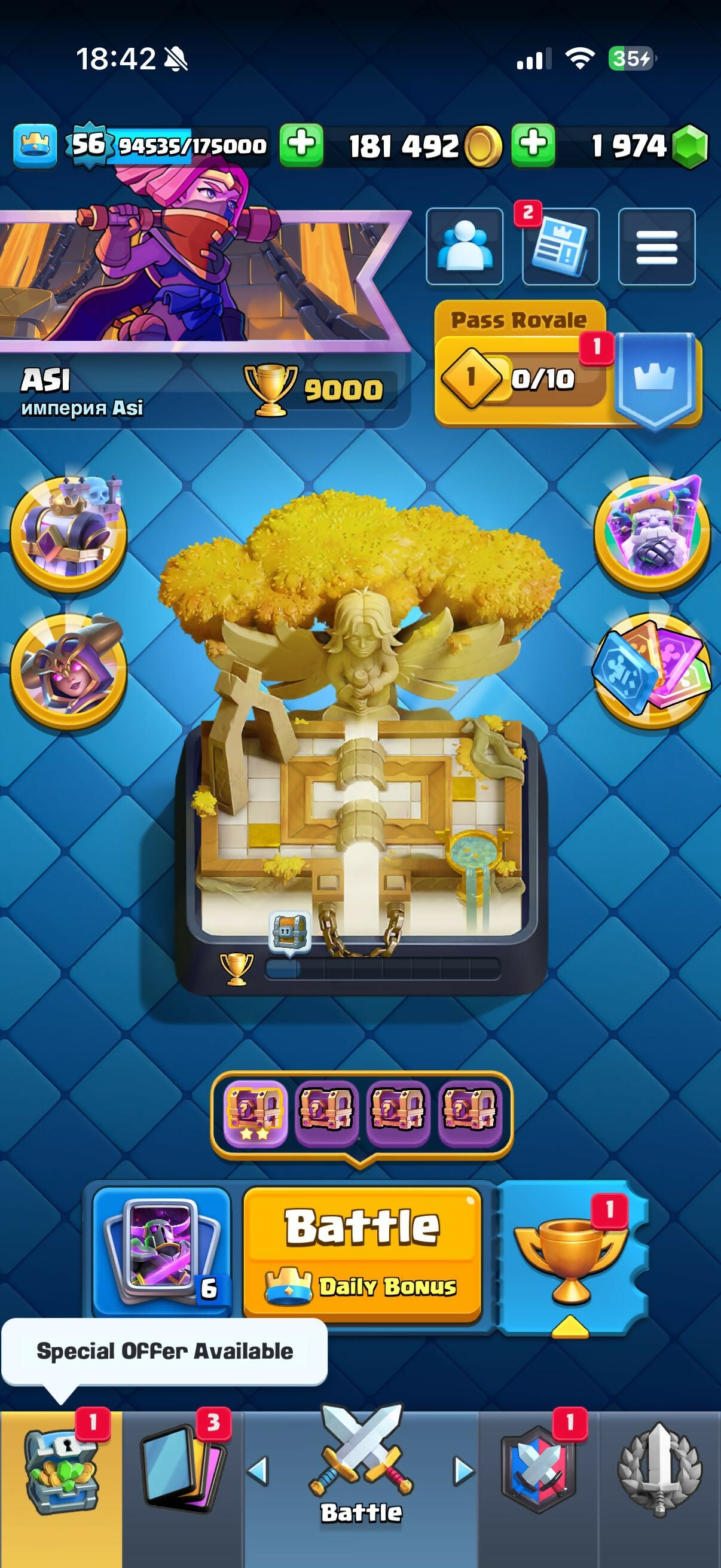 9 эво, 11-15, arena 23, 56 level, trophies 9000, cards 119, legendary cards 20, No