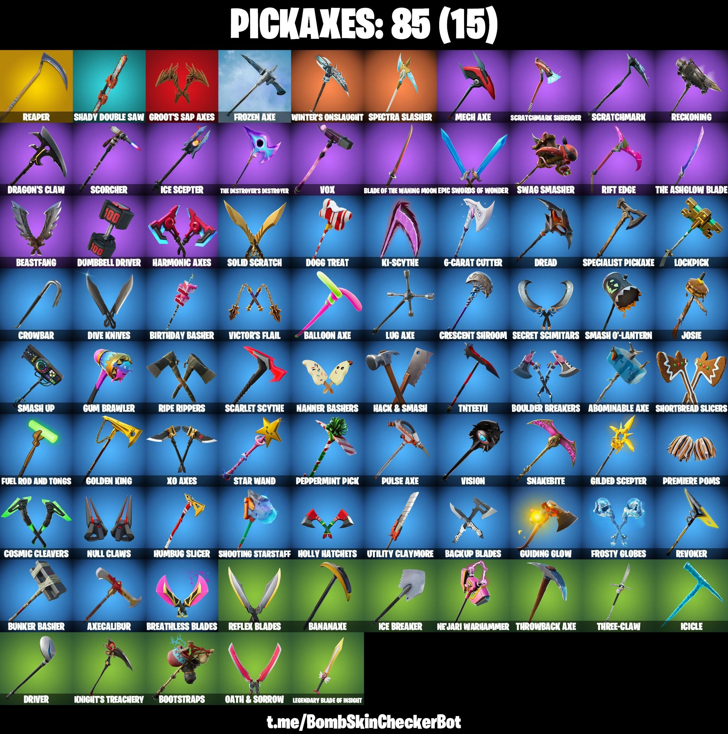 6-Carat Cutter, A Warrior Prepares, A.I.M., Abominable Axe, Agent Peely, Axecalibur, Backlash, Backup Blades, Balloon Axe, Bananaxe, Battle Call, Beastfang, Beep Beep, Birthday Basher, Blackheart, Blade of the Waning Moon, Blizzabelle, Blue Squire, Blue Team Leader, Boogie Down, Boomin', Bootstraps, Boulder Breakers, Boy's A Liar, Breathless Blades, Brutus, Bullseye, Bunker Basher, Bunker Jonesy, Calamity, Calculated, Call Me, Cap Kick, Cat Flip, Catalyst, Choice Knit, Clean Sweep, Cluck Strut, Coin Flip, Conga, Cosmic Cleavers, Crackabella, Crescent Shroom, Crowbar, Crowning Achievement, Dabstand, Dark Bomber, Deadpool, Deep Dab, Demi, Derby Dominator, Diamond Diva, Dire, Dive Knives, Dj Yonder, Do The 'Split, Dogg Treat, Doze Dab, Dragon Stance, Dragon's Claw, Dread, Drift (Stage 5), Driver, Dumbbell Driver, Dummy, Dusk, Dynamo, Electro Swing, Ember, Envoy, Epic Swords of Wonder, Fable, Flamenco, Flashback Breakdown, Flippin' Away, Flippin' Incredible, Floss, Free Flow, Frosty Globes, Frozen Axe, Frozen Love Ranger, Frozen Raven, Frozen Red Knight, Fuel Rod And Tongs, Gear Specialist Maya, Gentleman's Dab, Get Funky, Get Loose, Giddy-Up, Gilded Scepter, Ginger Gunner, Golden King, Golf Clap, Groot's Sap Axes, Guiding Glow, Gum Brawler, Hack & Smash, Hand Signals, Harmonic Axes, Haze, Heart Sign, Hello Friend, Holly Hatchets, Hot Marat, Humbug Slicer, Huntress, Hybrid, I Declare!, Ice Breaker, Ice Scepter, Icicle, Infinite Dab, Insight, It's Go Time!, Jack Gourdon, Jaywalking, Josie, Jump Jets, Ki-Scythe, Knights Treachery, Kondor, Krisabelle, Kuno, Kyra, Laid Back Shuffle, Legendary Blade of Insight, Lexa, Lil Split, Lil' Longboat, Lockpick, Love It!, Lt. Evergreen, Lug Axe, Lynx, Mancake, Mandalorian, Mashed Potato, Master Key, Mave, Maven, Meat Grinder, Mech Axe, Menace, Meowscles, Mic Drop, Midas (Fully Golden), Nana Nana, Nanner Bashers, Nejari Warhammer, Nightshade, Null Claws, Oath & Sorrow, Omegarok, Onesie, Pandemonium, Par Patroller, Party Hips, Paws & Claws, Peace Out, Peely, Peppermint Pick, Point It Out, Point Patroller, Pony Up, Powder, Predator, Premiere Poms, Prodigy, Pulse Axe, Raise The Cup, Rap Boy, Real Slim Shady, Reaper, Reckoning, Red Card, Red Knight, Red-Nosed Raider, Redline, Reese, Reflex Blades, Regal Wave, Renegade Lynx, Respect The Peace, Revoker, Ride The Pony, Rift Edge, Ripe Rippers, Rock Paper Scissors, Rox, Royale Knight, Ruin, Running Man, Sad Trombone, Salute, Scarlet Scythe, Scorcher, Scratchmark, Scratchmark Shredder, Secret Scimitars, Sentinel, Sgt. Winter, Shady Double Saw, Sharpshooter, Shimmer, Shooting Starstaff, Shortbread Slicers, Side Hustle, Sidewinder, Sign Spinner, Sing Along, Singularity, Siren, Skye, Sledgehammer, Slim Shady, Slitherin', Slow Clap, Smash O'-Lantern, Smash Up, Snakebite, Snoop's Walk, Snoozefest, Snowshaker, So Square, Solid Scratch, Specialist Pickaxe, Spectra Knight, Spectra Slasher, Springy, Stand Surfer, Standing Bow, Star Wand, Stash'd, Stratus, Summit Striker, Sun Strider, Swag Smasher, Swipe It, Take The Cake, Take The Elf, The Ace, The Ashglow Blade, The Destroyer's Destroyer, The Dip, The Ice King, The Prisoner, The Worm, Three-Claw, Throwback Axe, Tilted Teknique, Tinseltoes, Tn Teeth, Tntina, Tra La La, Trog, Utility Claymore, Vega, Vendetta, Verve, Victor's Flail, Vision, Vox, Wakandan Salute, Wave, Whistle Warrior, Wilde, Winter's Onslaught, Wolf, Work It Out, X-Lord, Xo Axes, Yay!, You're Awesome, Yulejacket, Zenith