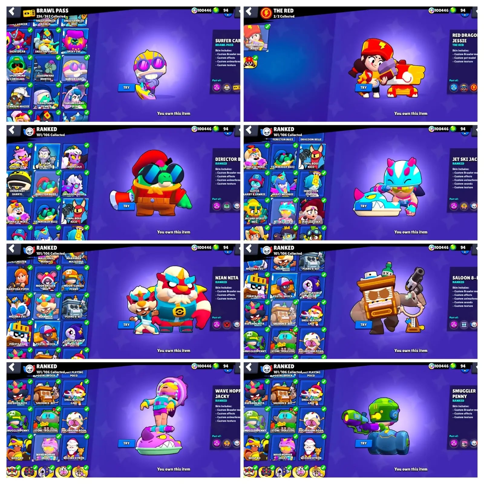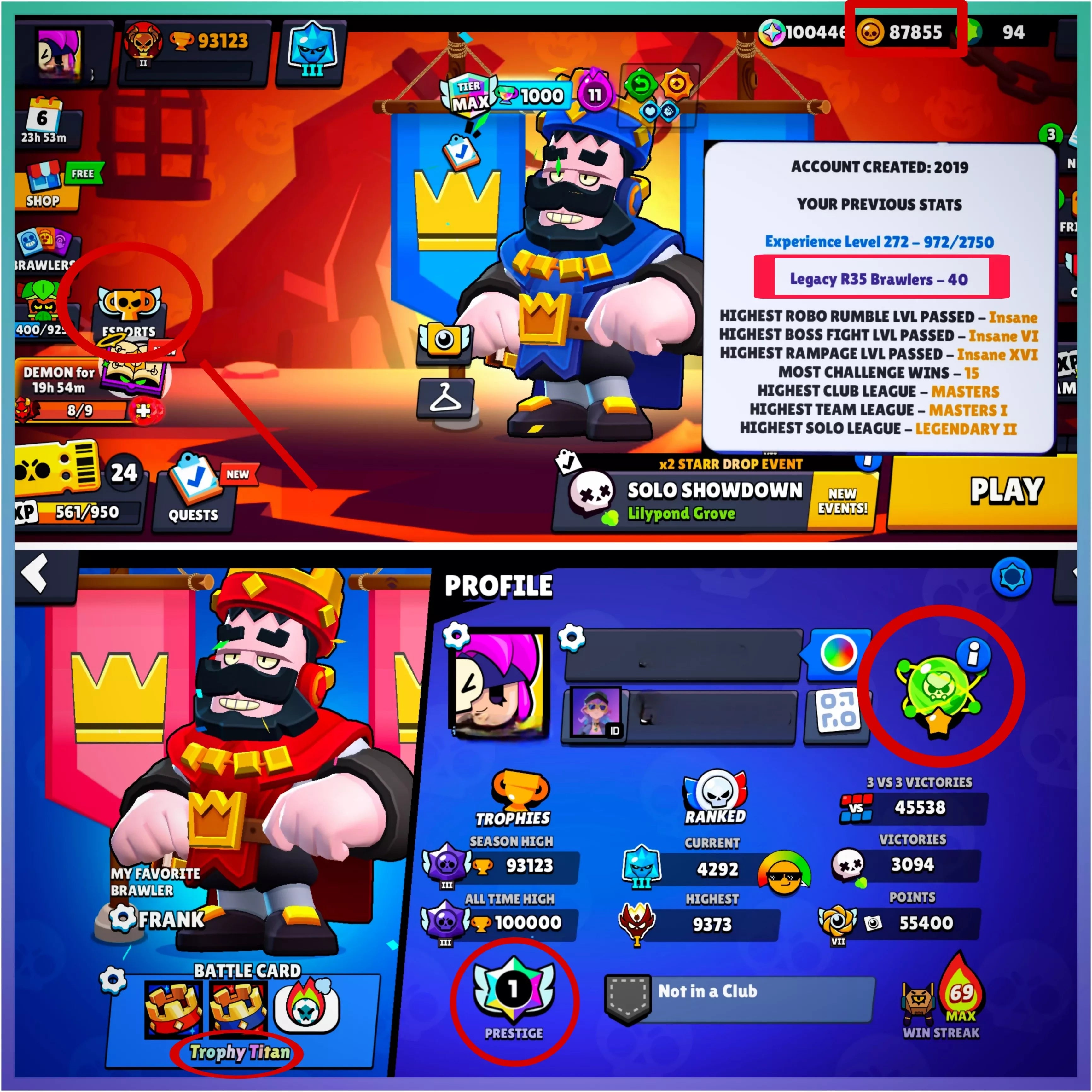 100k trophies || 40 R35 LEGACY || ALIEN FAME || KING FRANKS SKINS || ALL HYPER AND MAX BRAWLERS || 460 + PREMIUM SKINS || TROPHY TITAN || 58 + TITTLES || 7/7 MASTERS || 15 GOLD SKINS || R35 PIN || INSTANT DELIVERY