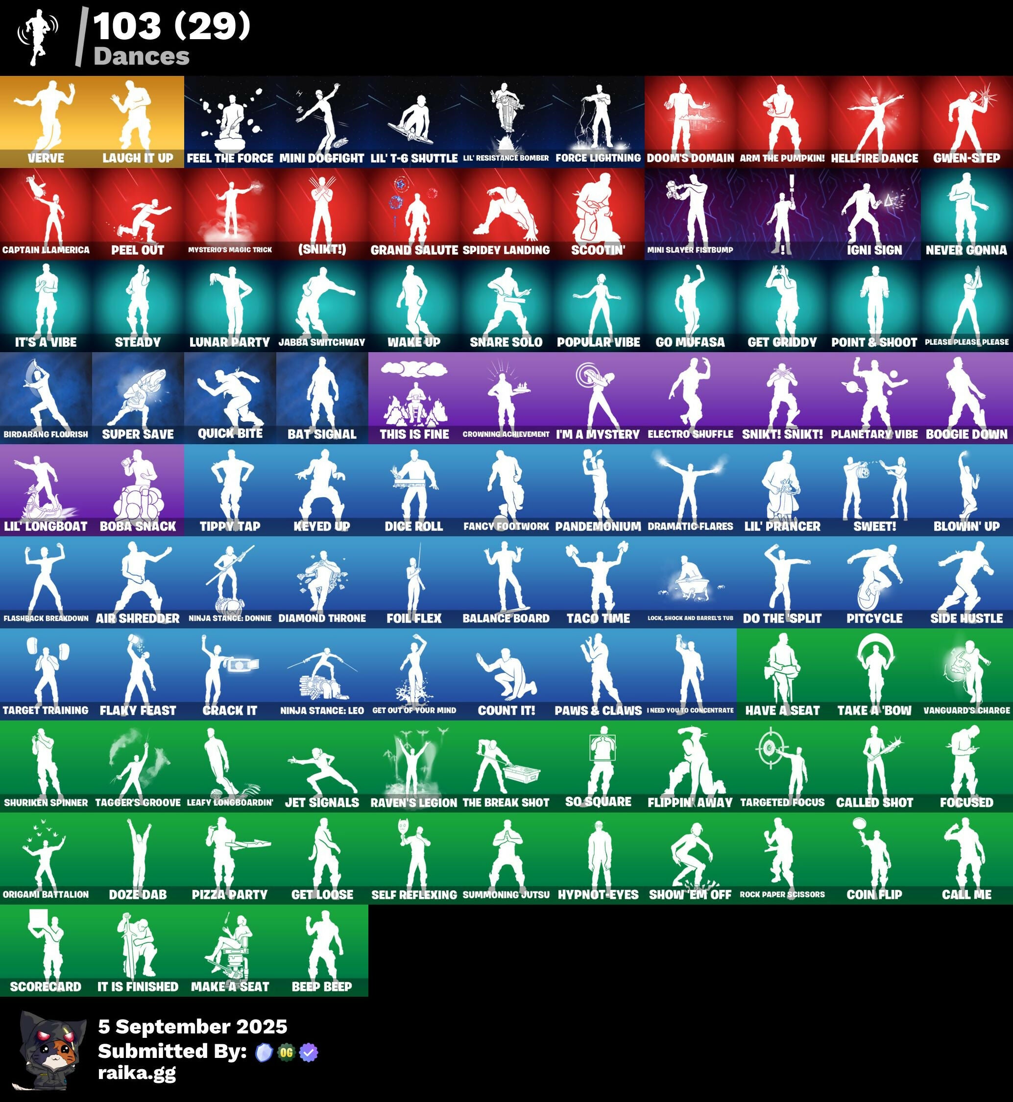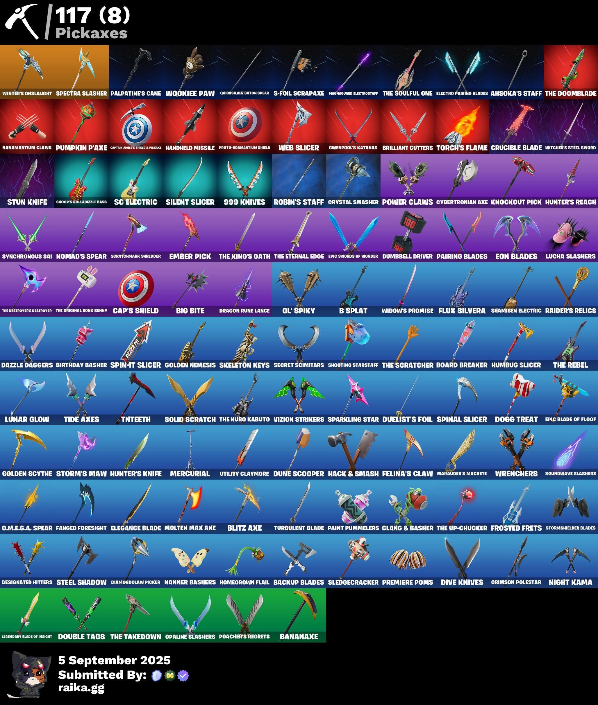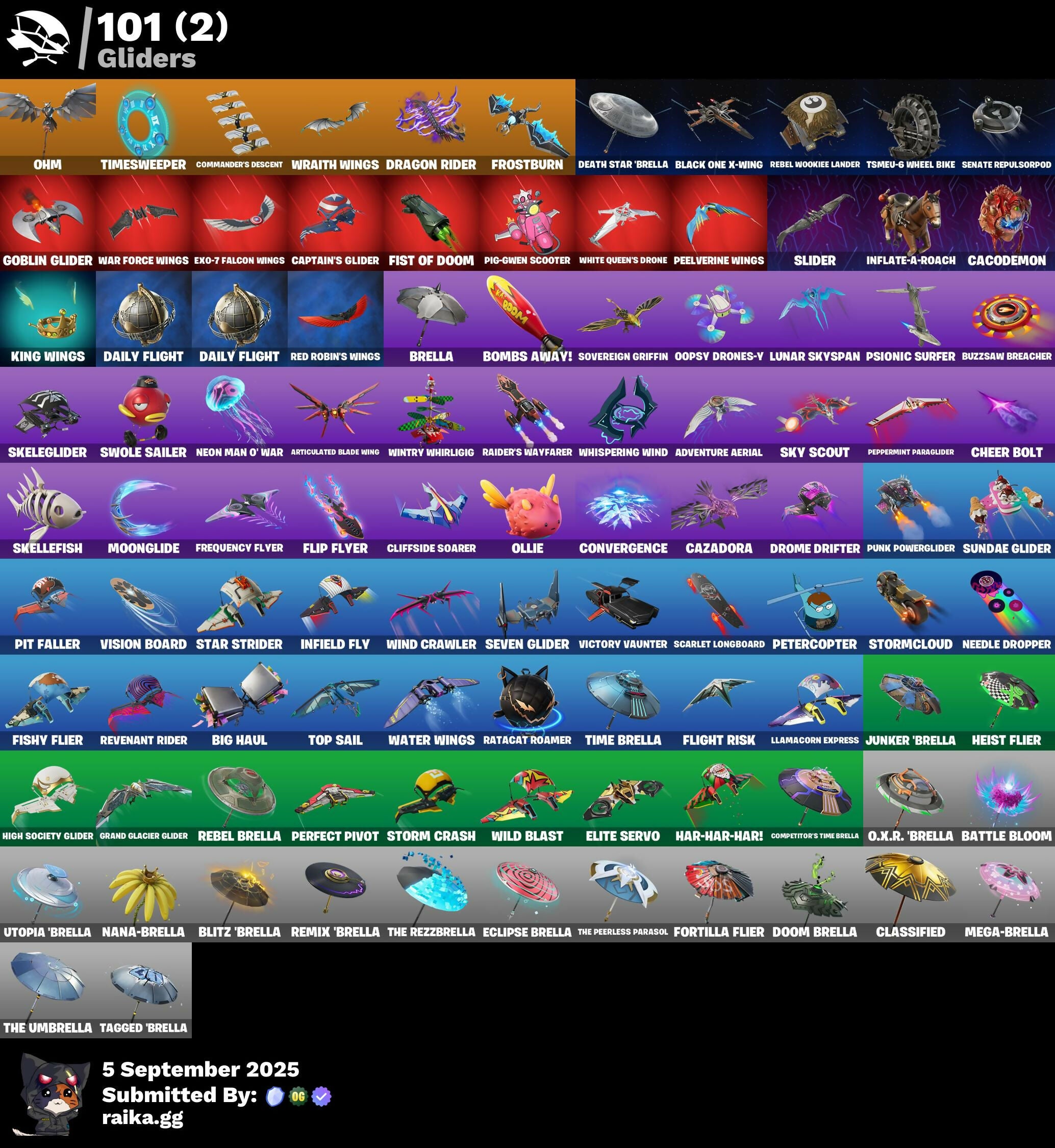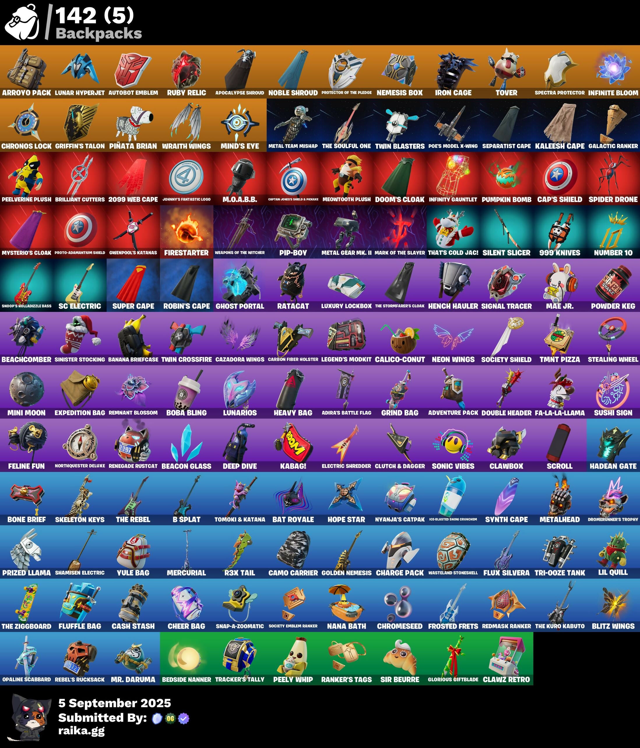 (Snikt!), 2099 Web Cape, 999 Knives, Adira, Adira's Battle Flag, Adonis Creed, Adventure Aerial, Adventure Pack, Agent Peely, Ahsoka's Staff, Air Shredder, Alto, Antonia, Apocalypse Shroud, Apprentice Evie, Arctic Adeline, Arm The Pumpkin!, Arroyo Pack, Articulated Blade Wing, Ascension Nezumi, Astro Armor, Autobot Emblem, B Splat, Backup Blades, Balance Board, Banana Briefcase, Bananaxe, Bat Royale, Bat Signal, Battle Bloom, Beachcomber, Beacon Glass, Bedside Nanner, Beep Beep, Big Bite, Big Haul, Birdarang Flourish, Birthday Basher, Black One X-Wing, Blaze, Blitz 'Brella, Blitz Axe, Blitz Wings, Blowin' Up, Board Breaker, Boba Bling, Boba Snack, Bombs Away!, Bone Brief, Boogie Down, Brella, Brilliant Cutters, Brutus, Bullpen Brawler Dusty, Burning Ambition Valeria, Buzzsaw Breacher, Cacodemon, Calico-Conut, Call Me, Called Shot, Camo Carrier, Cap's Shield, Captain America, Captain Jones, Captain Jones's Shield & Pickaxe, Captain Llamerica, Captain's Glider, Carbon Fiber Holster, Cash Stash, Cazadora, Cazadora Wings, Champion Sparkplug, Charge Pack, Cheer Bag, Cheer Bolt, Chromeseed, Chronos Lock, Clang & Basher, Classified, Clawbox, Clawz Retro, Cliffside Soarer, Club President Helsie, Clutch & Dagger, Coin Flip, Commander's Descent, Competitor's Time Brella, Convergence, Count It!, Crack It, Crimson Polestar, Crucible Blade, Crustina, Crystal Smasher, Cybertronian Axe, Daily Flight, Dark Doggo, Dazzle Daggers, Deadpool Unmasked, Death Star 'Brella, Deep Dive, Designated Hitters, Diamond Throne, Diamondclaw Picker, Dice Roll, Dive Knives, Do The Split, Dogg Treat, Doom Brella, Doom's Cloak, Doom's Domain, Double Header, Double Tags, Doze Dab, Dragon Rider, Dragon Rune Lance, Dramatic Flares, Drome Drifter, Dromerunner's Trophy, Duelist's Foil, Dumbbell Driver, Dune Scooper, Dusk Knight, Eclipse Brella, Electric Shredder, Electro Pairing Blades, Electro Shuffle, Elegance Blade, Elite Servo, Ember Pick, Emma Frost, Eon Blades, Epic Blade of Floof, Epic Swords of Wonder, Evie, Exo-7 Falcon Wings, Expedition Bag, Fa-La-La-Llama, Fade, Fancy Footwork, Fanged Foresight, Feel The Force, Felina's Claw, Feline Fun, Firestarter, Fishy Flier, Fist Of Doom, Fistbump, Flaky Feast, Flashback Breakdown, Flight Risk, Flip Flyer, Flippin' Away, Fluffle Bag, Flux Silvera, Focused, Foil Flex, Force Lightning, Fortilla Flier, Frequency Flyer, Frostburn, Frosted Frets, Galactic Ranker, Gear Specialist Maya, General Grievous, Get Griddy, Get Loose, Get Out Of Your Mind, Ghost Enforcer, Ghost Portal, Glorious Giftblade, Go Mufasa, Goblin Glider, Golden Nemesis, Golden Scythe, Grand Glacier Glider, Grand Salute, Green Goblin, Griffin's Talon, Grind Bag, Guff, Gwen-Step, Gwenpool, Gwenpool's Katanas, Hack & Smash, Hadean Gate, Handheld Missile, Har-Har-Har!, Harbinger Armor Omegadork, Have A Seat, Haylee Skye, Heavy Bag, Heist Flier, Hellfire Dance, Hench Hauler, High Society Glider, Holiday Boxy, Homegrown Flail, Hope, Hope Star, Humbug Slicer, Hunter's Knife, Hunter's Reach, Hypnot-Eyes, I Need You To Concentrate, I'm A Mystery, Ice-Blasted Snow Cruncher, Iconic Era, Igni Sign, Infield Fly, Infinite Bloom, Infinity Gauntlet, Inflate-A-Roach, Iridia Vayne, Iron Cage, It Is Finished, It's A Vibe, Jabba Switchway, Jet Signals, Johnny Storm, Johnny's Fantastic Logo, Jones Unchained, Jules, Junker 'Brella, Kabag!, Kado Thorne, Kaleesh Cape, Keyed Up, Killswitch, King Wings, Kit, Knockout Pick, Laugh It Up, Leafy Longboardin', Legend's Modkit, Legendary Blade of Insight, Lil Quill, Lil Split, Lil' Longboat, Lil' Prancer, Lil' Resistance Bomber, Lil' T-6 Shuttle, Lionel Messi, Llamacorn Express, Lock, Shock And Barrel's Tub, Lorenzo, Lucha Slashers, Lunar Glow, Lunar Hyperjet, Lunar Party, Lunar Skyspan, Lunarios, Luxury Lockbox, M.O.A.B.B., Mae, Mae Jr., Magnaguard Electrostaff, Make A Seat, Malik (Solitary Defender), Marauder's Machete, Mariposa, Marius, Mark Of The Slayer, Masked, Mega-Brella, Meowscles, Meowtooth Plush, Mercurial, Metal Gear Mk. II, Metal Team Mishap, Metalhead, Mind's Eye, Mini Dogfight, Mini Moon, Mini Slayer, Molten Max Axe, Montague, Moonglide, Mr. Daruma, Mysterio's Cloak, Mysterio's Magic Trick, Nana Bath, Nana-Brella, Nanamatium Claws, Nanner Bashers, Naruto Uzumaki, Needle Dropper, Nemesis Box, Neon Man O' War, Neon Wings, Never Gonna, Night Kama, Ninja Stance: Donnie, Ninja Stance: Leo, Nisha, Nitelite, Noble Shroud, Nolan Chance, Nomad's Spear, Northquester Deluxe, Number 10, Nyanja's Catpak, O.M.E.G.A. Spear, O.X.R. 'Brella, Ohm, Ol' Spiky, Ollie, Oopsy Drones-V, Opaline Scabbard, Opaline Slashers, Optimus Prime, Origami Battalion, Paint Pummellers, Pairing Blades, Palpatine's Cane, Pandemonium, Pandora's Armor Doom, Paws & Claws, Peel Out, Peelverine, Peelverine Plush, Peelverine Wings, Peely Whip, Peppermint Paraglider, Perfect Pivot, Peter Griffin, Petercopter, Pig-Gwen Scooter, Pip-Boy, Piper Pace, Pit Faller, Pitcycle, Pizza Party, Piñata Brian, Planetary Vibe, Please Please Please, Poacher's Regrets, Poe Dameron, Poe's Model X-Wing, Point & Shoot, Poised Playmaker, Popular Vibe, Powder Keg, Power Claws, Premiere Poms, Prized Llama, Protector Of The Pledge, Proto-Adamantium Shield, Psionic Surfer, Pumpkin Bomb, Pumpkin P'Axe, Punk Powerglider, Pureadise Meowscles, Quick Bite, Quicksilver Baton Spear, R3X Tail, Raider's Relics, Raider's Wayfarer, Ranker's Tags, Ratacat, Ratacat Roamer, Raven, Raven's Legion, Rebel Brella, Rebel Wookiee Lander, Rebel's Rucksack, Red Robin's Wings, Redmask Ranker, Reef Cake Fish Thicc, Relik, Remix 'Brella, Remnant Blossom, Renegade Lynx, Renegade Raider, Renegade Rustcat, Revenant Rider, Rian, Riptide, Robin, Robin's Cape, Robin's Staff, Rock Paper Scissors, Ruby Relic, S-Foil Scrapaxe, SC Electric, Santa Dogg, Scarlet Defender, Scarlet Longboard, Scootin', Scorecard, Scratchmark Shredder, Scroll, Secret Scimitars, Self Reflexing, Senate Repulsorpod, Separatist Cape, Seven Glider, Shadow Enforcer, Shady Doggo, Shamisen Electric, Shock Brawler Osc