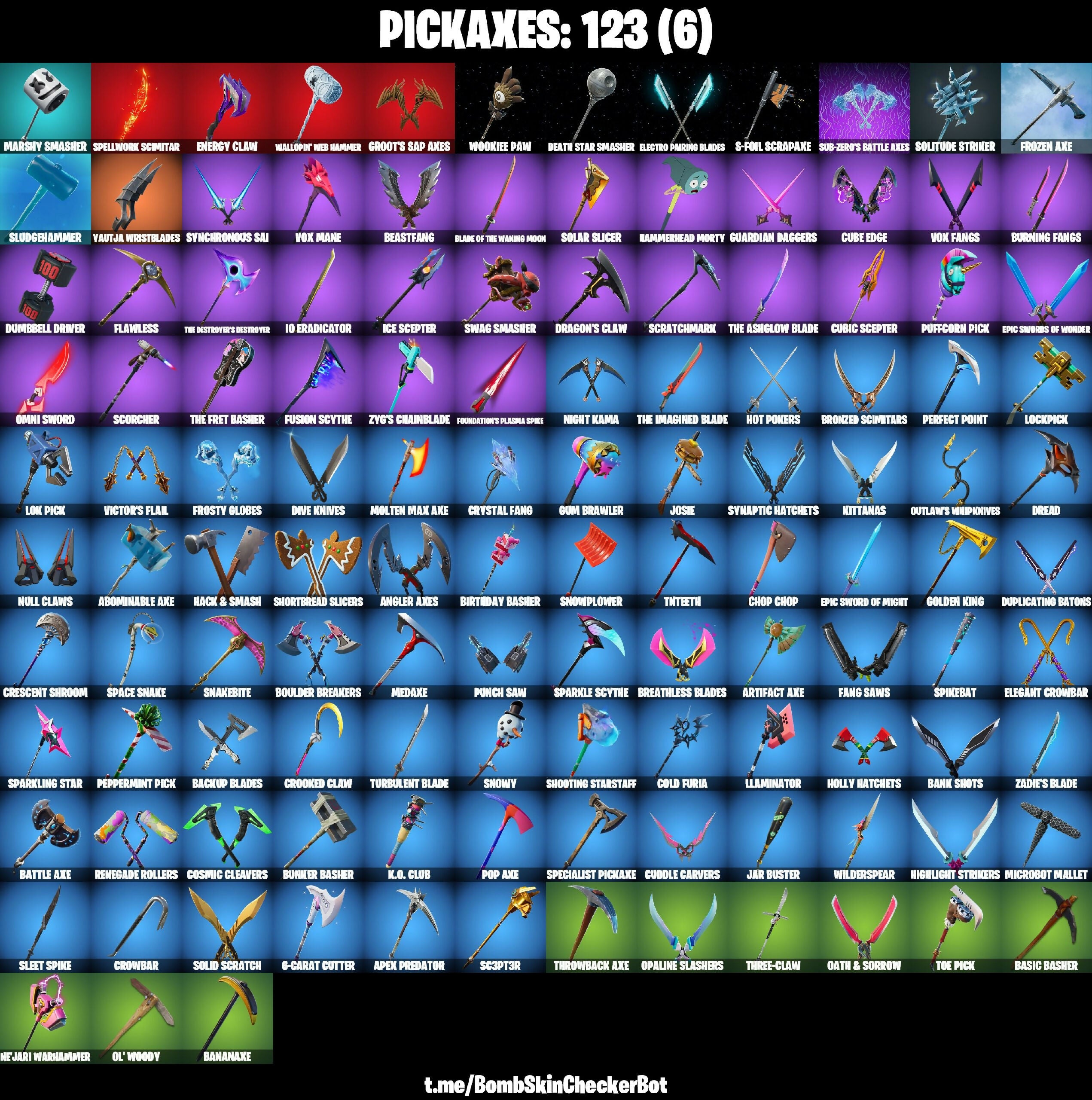 10 Eradicator, 6-Carat Cutter, 8-Ball Vs Scratch, A Warrior Prepares, Abominable Axe, Agent Peely, Angler Axes, Apex Predator, Ariana Grande, Artifact Axe, Aura, Backup Blades, Bananaxe, Bank Shots, Baron's Hoard, Basic Basher, Battle Axe, Beastfang, Beep Beep, Birthday Basher, Blackheart, Blade Of The Waning Moon, Blowing Bubbles, Boing!, Boogie Down, Boomin', Boulder Breakers, Breakneck, Breakpoint, Breathless Blades, Bronzed Scimitars, Brutus (Fully Golden), Bunker Basher, Burning Fangs, Call Me, Cameo Vs Chic, Cat Flip, Catalyst, Choice Knit, Chop Chop, Chugga-Chugga, Clark Kent, Clean Sweep, Cloud Striker, Coin Flip, Cold Furia, Conga, Conjure Weapon, Cosmic Cleavers, Count It!, Crescent Shroom, Crooked Claw, Crowbar, Crowning Achievement, Crystal Fang, Cube Assassin, Cube Edge, Cubic Scepter, Cuddle Carvers, Cyclo Curl, Dabstand, Dagger Dance, Deadpool, Death Star Smasher, Diamond Diva, Dive Knives, Doctor Slone, Doctor Strange, Don't Start Now, Dragon Stance, Dragon's Claw, Dread, Droop, Dumbbell Driver, Duplicating Batons, Duplikates, Electro Pairing Blades, Elegant Crowbar, Ember, Energy Claw, Epic Sword Of Might, Epic Swords Of Wonder, Erisa, Eternal Voyager, Fang Saws, Featherweight, Fierce, Fist Bump, Flawless, Flippin' Away, Foundation's Plasma Spike, Free Flow, Frosty Globes, Frozen Axe, Fusion, Fusion Scythe, Fyra, Gear Specialist Maya, Get Funky, Get Griddy, Get Schwifty, Goku Black, Golden King, Golf Clap, Good Guy, Groot's Sap Axes, Guardian Daggers, Guggimon, Gum Brawler, Gumbo, Gunnar, Hack & Smash, Hammerhead Morty, Harlowe, Haven, Haze, Heart Sign, Heartburst, Hello Friend, High Five, Highlight Strikers, Holly Hatchets, Hoop Master, Hot Pokers, Hula Hoopin', Hybrid, I Declare!, Ice Scepter, Introducing..., Iris, It's... You?, Jar Buster, Jaywalking, Joey, Josie, Journey Vs Hazard, K.O. Club, Keep It Mello, Kiara K.O., Kick Back, Kittanas, Kondor, Krisabelle, Kymera, Lexa, Lil' Monster, Lil' Saucer, Llambro, Llaminator, Lockpick, Lok Pick, Lok-Bot, Love It!, Lt. Evergreen, Lt. John Llama, Lunar Charge, Luxe, Lynx, Mancake, Mandalorian, Marshmello, Marshy Smasher, Mashed Potato, Master Chief, Master Key, Mave, Mecha Morty, Medaxe, Members Only, Menace, Meowscles, Mezmer, Mic Drop, Microbot Mallet, Midas (Fully Golden), Mini Dogfight, Molten Max Axe, Moxie, Mwahaha, Nailed It, Nana Nana, Nejari Warhammer, Night Kama, Null Claws, Oath & Sorrow, Ol' Woody, Omni Sword, Onesie, Opaline Slashers, Outlaw's Whipknives, Pandemonium, Paws & Claws, Peely, Peppermint Pick, Perfect Point, Point & Shoot, Point It Out, Point Patroller, Polar Peely, Pop Axe, Powder, Predator, Prowler, Puffcorn Pick, Punch Saw, Raven's Legion, Reese, Regal Wave, Remedy Vs Toxin, Renegade Rollers, Respect The Peace, Rick Sanchez, Rippley Vs Sludge, Ronin, Ruin, S-Foil Scrapaxe, Sad Trombone, Sandstorm, Sc3pt3r, Scorcher, Scratchmark, Segway Tour, Sgt. Winter, Shanta, Shaolin Sip, Sharpshooter, Shimmer, Shooting Starstaff, Shortbread Slicers, Show 'Em Off, Side Hustle, Sidewinder, Sing Along, Ska-Stra-Terrestrial, Skully, Skye, Sleet Spike, Sludgehammer, Snakebite, Snoozefest, Snow Stealth Slone, Snowmando, Snowplower, Snowshaker, Snowy, So Square, Solar Slicer, Solid Scratch, Solitude Striker, Sorana, Space Snake, Sparkle Scythe, Sparkle Supreme, Sparkling Star, Specialist Pickaxe, Spellwork Scimitar, Spiderman (No Way Home), Spiderman Gilded Reality, Spikebat, Springy, Standing Bow, Starlit, Stride, Sub-Zero's Battle Axes, Summer Skye, Summit Striker, Sunny, Swag Smasher, Synaptic Hatchets, Synchronous Sai, Take The Cake, Take The Elf, The Ashglow Blade, The Break, The Burning Wolf, The Destroyer's Destroyer, The Foundation, The Fret Basher, The Ice King, The Imagined, The Imagined Blade, The Origin, The Prisoner, The Rick Dance, The Scientist, Three-Claw, Throwback Axe, Tilted Teknique, Tnteeth, Tntina, Toe Pick, Tra La La, Trog, Tsuki 2.0, Turbulent Blade, Turk Vs Riptide, Ultima Knight, Underworld Desdemona, Vanguard Zadie, Vautja Wristblades, Verve, Vi, Victor's Flail, Vox Fangs, Vox Hunter, Vox Mane, Vulcan Salute, Wakandan Salute, Wallopin' Web Hammer, Waterworks, Wavy T, Wilde, Wilderspear, Wookiee Paw, Wooly Warrior, X-Lord, Xoxo, Yay!, Yond3r, Zadie's Blade, Zenith, Zyg, Zyg's Chainblade