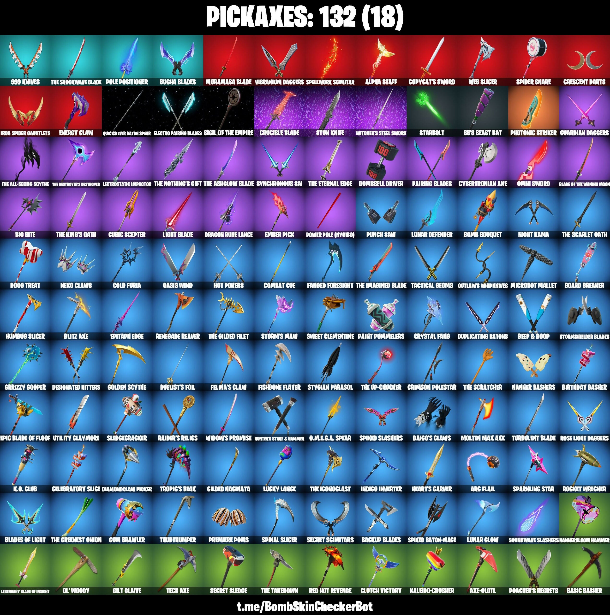 1-Ball, 999 Knives, Adira, Aerial Assault Bomber, Alpha Staff, Arachrobatics, Arc Flail, Arctic Adeline, Axe-Olotl, Axo, BB's Beast Bat, Backup Blades, Balance Board, Baron's Hoard, Basic Basher, Battle Call, Beast Boy, Beep & Boop, Beerus, Big Bite, Big Fan, Birthday Basher, Black Panther, Blade Of The Waning Moon, Blades Of Light, Blaze, Blitz Axe, Blitz Knight, Blowin' Up, Board Breaker, Boba Snack, Bomb Bouquet, Boogie Down, Boosting Ki, Bring It Around, Bugha, Bugha Blades, Bytes, Called Shot, Captain Marvel, Card Drop, Celebratory Slice, Chaos Director, Charging Up, Chrome Punk, Clone Trooper, Clutch Victory, Cobalt Snowfoot, Combat Cue, Conjure Weapon, Copines, Copycat's Sword, Count It!, Crescent Darts, Crimson Polestar, Crowning Achievement, Crucible Blade, Crystal, Crystal Fang, Cubic Scepter, Curling Iron, Cybertronian Axe, Cyclo Curl, Dagger Dance, Daigo, Daigo's Claws, Dance Monkey, Daredevil, Dark Doggo, Darth Vader, Designated Hitters, Diamond Throne, Diamondclaw Picker, Dirtbike Challenge, Doctor Strange, Dogg Treat, Doom Slayer, Doze Dab, Dragon Rune Lance, Duelist's Foil, Dumbbell Driver, Dupli-Kate, Duplicating Batons, Duplikates, Durrr Taisho, Dusty, Dynamo TNTina, Electro Pairing Blades, Ember Pick, Energy Claw, Epic Blade Of Floof, Epitaph Edge, Erisa, Evie, Fanged Foresight, Fast Flex, Felina, Felina's Claw, Fishbone Flayer, Fist Bump, Foil Flex, Geralt of Rivia, Get Griddy, Gilded Naginata, Gildhart, Gilt Glaive, Godzilla Evolved, Gold Furia, Golden Scythe, Good Game, Well Played, Grizz, Grizzly Gooper, Guardian Daggers, Guff Gringle, Gum Brawler, Gunnar, Heart Sign, Heart's Carver, Heartburst, Helichopper, Hero Baymax, Hit It, Holiday Boxy, Hope, Hot Pokers, Humbug Slicer, Hunter's Stake & Hammer, Hypnot-Eyes, I Need You To Concentrate, I'm A Mystery, Igni Sign, Imperial March, Indiana Jones, Indigo Inverter, Invisible Cut, Iron Spider, Iron Spider Gauntlets, It Is Finished, It's... You?, Jackie, Jade, Jet Signals, Joni The Red, Juice Wrld, K.O. Club, Kaleido-Crusher, Kendo, Kiara K.O., Knife Sharpener, LBC '93 Dogg, Lady of Cranes, Laser Focused, Launch Day Lewis Hamilton, Lebron James, Lectrostatic Impactor, Legendary Blade Of Insight, Lennox Rose, Lewis Hamilton, Light Blade, Lil' Godzilla Attack, Lil' Podracer, Lil' Prancer, Lil' Tank, Lizzik, Love It!, Lucky Lance, Lunar Defender, Lunar Glow, Lunar Party, Major Mancake, Make A Seat, Malik, Marshinobi, Massai, Maximum Bounce, Mecha Strike Commander, Meow Skulls, Meowdas, Microbot Mallet, Min-Joon, Mini Slayer Fistbump, Molten Max Axe, Montague, Moon Knight, Muramasa Blade, NBA 75 Baller, Nanner Bashers, Nanner Ringer, Nannerbloom Hammer, Nathan Drake, Neko Claws, Nezumi, Night Kama, Ninja Stance: Leo, Nisha, Nyanja, O.M.E.G.A. Spear, Oasis Wind, Ol' Woody, Omg I Love It, Omni Sword, Oscar, Outlaw's Whipknives, Paint Pummellers, Pairing Blades, Paradigm (Reality-669), Peter Griffin, Phaedra, Phantasm, Photonic Striker, Poacher's Regrets, Point & Shoot, Pole Positioner, Popular Vibe, Power Pole (Nyobo), Premiere Poms, Prowler, Punch Saw, Purr-Demonium, Quicksilver Baton Spear, Raider's Relics, Raven Team Syd, Raven's Legion, Reality's Master, Red Hot Revenge, Renegade Reaver, Renegade Rebel, Rhythm Of Chaos, Rocket Wrecker, Rose Light Daggers, Runway Racer, Sabina, Santa Dogg, Secret Scimitars, Secret Sledge, Segway Tour, Selene, Shadow Blade Hope, Shamisen-Sational, Show 'Em Off, Showtime, Shuriken Spinner, Sigil Of The Empire, Skatemonster, Skele-Dance, Skull Commander, Slayer Juice Wrld, Sled Ready Guff, Sledgecracker, Snap, Snikit! Snikit!, Solid Snake, Son Goku, Soundwave Slashers, Southpaw, Sparkling Star, Spellwork Scimitar, Spider Gwen Aurelian, Spider Snare, Spider-Man (No Way Home), Spider-Man Zero, Spider-Punk, Spidey Landing, Spiked Baton-Mace, Spiked Slashers, Spinal Slicer, Spirit Strider, Stand Surfer, Standing Bow, Starbolt, Starfire, Starfire's Flourish, Steady, Storm's Maw, Stormfarer, Stormshielder Blades, Stun Knife, Stygian Parasol, Surfin' Bird, Sweaty Rotation, Sweet Clementine, Sweet!, Synchronous Sai, Tactical Geoms, Tagger's Groove, Take A Bow, Taskmaster, Tech Axe, Telekinetic Power Breakfast, The Ageless, The All-Seeing Scythe, The Ashglow Blade, The Break, The Break Shot, The Destroyer's Destroyer, The Dip, The Eternal Edge, The Gilded Filet, The Greenest Onion, The Herald, The Iconoclast, The Imagined, The Imagined Blade, The King's Oath, The Nothing's Gift, The Origin, The Scarlet Oath, The Scratcher, The Shockwave Blade, The Takedown, The Up-Chucker, Thudthumper, Toasty Roast, Tropic's Beak, Tsuki 2.0, Tune Squad Lebron, Turbulent Blade, Twyn, Undercover Skye, Underworld Desdemona, Utility Claymore, Valeria, Vengeance Jones, Veronika, Vibranium Daggers, Wanna See Me, Web Slicer, Welsie, Widow's Promise, Winterfest Bushranger, Witcher's Steel Sword, Wolverine Zero, Xander, Yarn Ball, Yulejacket, Zoe Clash