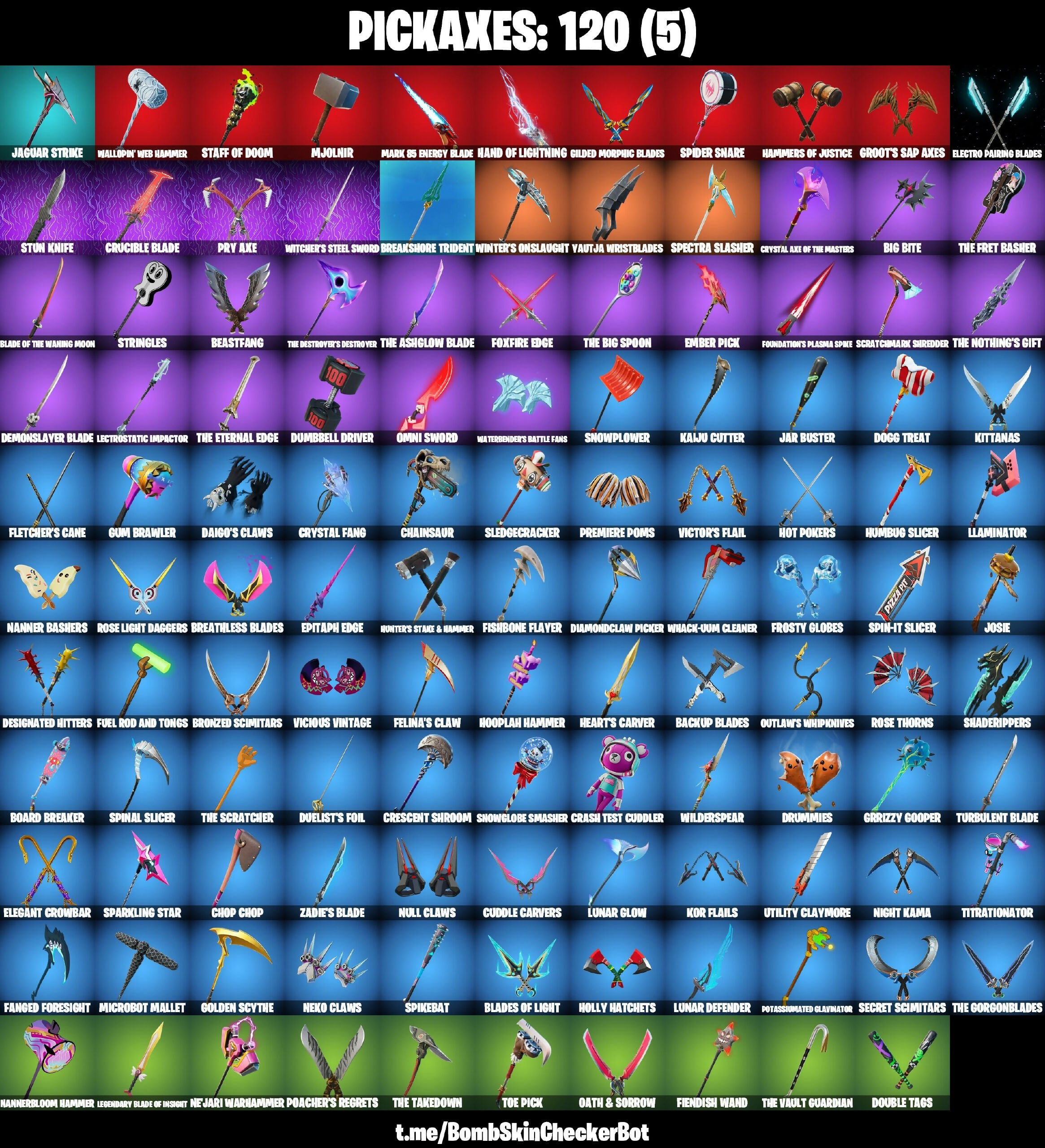 A Warrior Prepares, Agent Jones, Aphrodite, Arachrobatics, Arctic Adeline, Avatar's Flourish, Backup Blades, Balance Board, Baron's Hoard, Bean Bag, Beastfang, Big Bite, Big Dill, Blade of the Waning Moon, Blades of Light, Board Breaker, Boba Snack, Boomin', Boots 'N' Cats, Breakshore Trident, Breathless Blades, Bronzed Scimitars, Bytes, Called Shot, Card Drop, Cardistry, Cassidy Quinn, Cerberus, Chainsaur, Charlotte, Chef's Special, Choice Knit, Chop Chop, Chrome Punk, Clean Sweep, Cluck, Conch Call, Cozy Commander, Crash Test Cuddler, Crescent Shroom, Crowning Achievement, Crucible Blade, Crystal Axe of the Masters, Crystal Fang, Cuddle Carvers, Daigo, Daigo's Claws, Demonslayer Blade, Designated Hitters, Diamond Throne, Diamondclaw Picker, Dice Roll, Dirtbike Challenge, Do The 'Split, Doctor Doom, Dogg Treat, Doom Slayer, Double Tags, Doze Dab, Drummies, Duelist's Card Trick, Duelist's Foil, Dumbbell Driver, Dusty, Electro Pairing Blades, Electrostatic Impactor, Elegant Crowbar, Ember Pick, Epitaph Edge, Era, Evasive Maneuvers, Expressionism, Fanged Foresight, Felina's Claw, Fiendish Wand, Fishbone Flayer, Fist Bump, Flashback Breakdown, Fletcher Kane, Fletcher's Cane, Foil Flex, Foundation's Plasma Spike, Foxfire Edge, Frost Squad, Frosty Globes, Fuel Rod and Tongs, Geralt of Rivia, Gilded Morphic Blades, Godzilla Evolved, Gold Blooded Ace, Golden Scythe, Good Guy, Grizzly Gooper, Groot, Groot's Sap Axes, Grriz, Guggimon, Gum Brawler, Gumbo, Hammers of Justice, Hand of Lightning, Hand-Forged, Hang Loose Celebration, Harlowe, Haven, Heart's Carver, Helsie, Hero Baymax, Holiday Boxy, Holly Hatchets, Hooplah Hammer, Hope, Hot Pokers, Howl, Humbug Slicer, Hunter's Stake & Hammer, Hypnot-Eyes, I Need You To Concentrate, I'm A Mystery, Igni Sign, Imani, Invisible Cut, It Is Finished, It's Chemistry!, It's... You?, Jade, Jaguar Strike, Jar Buster, Jennifer Walters, Jet Signals, Joey, Josie, Joss, Kaiju Cutter, Keisha Cross, Kendo, Kittanas, Knife Sharpener, Kondor, Kor, Kor Flails, Korra, Krisabelle, Kymera, Laminator, Lara Croft, Laser Focused, Legendary Blade of Insight, Lennox Rose, Lexa, Lil Split, Lil' Godzilla Attack, Lil' Longboat, Lil' Monster, Lil' Prancer, Lil' Saucer, Lil' Station Wagon Ready When You Are, Lil' T-6 Shuttle, Love It!, Lt. John Llama, Lunar Charge, Lunar Defender, Lunar Glow, Lunar Party, Make A Seat, Mancake, Mandalorian, Marge Simpson, Mark 85 Energy Blade, Mashed Potato, Massai, Mave, Medusa, Menace, Meow Skulls, Microbot Mallet, Mini Slayer Fistbump, Mjolnir, Montague, Mwahaha, Mystica, Mystique, Nailed It, Nanner Bashers, Nannerbloom Hammer, Ne Jari, Neko Claws, Neymar Jr, Nezumi, Night Kama, Ninja Stance Donnie, Ninja Stance: Leo, Nisha, Nolan Chance, Null Claws, Nyanja, Oath & Sorrow, Omegarok, Omg I Love It, Omni Sword, Oscar, Outlaw Midas, Outlaw's Mugshot, Outlaw's Whipknives, Outlaws Strut, Paradigm (Reality-659), Peter Griffin, Piper Pace, Pitcycle, Poacher's Regrets, Polar Peely, Poseidon, Potassiumated Glavinator, Predator, Premiere Poms, Pry Axe, Puppet Dance, Raven's Legion, Raz, Reality's Master, Reese, Renegade Lynx, Renzo The Destroyer, Ronin, Rose Light Daggers, Rose Thorns, Runway Racer, Santa Dogg, Scout Regiment Salute, Scratchmark Shredder, Secret Scimitars, Selene, Serpentine Summoning, Shadebox, Shaderpippers, Shadow Blade Hope, Shamisen-Sational, Shanta, Sing Along, Ska-stra-terrestrial, Sled Ready Guff, Sledgecracker, Snowglobe Smasher, Snowmando, Snowplower, Solid Snake, Sparkling Star, Spectra Knight, Spectra Slasher, Spider Snare, Spider-Man, Spidergwen Aurelian, Spikebat, Spin-It Slicer, Spinal Slicer, Spirit Strider, Staff of Doom, Stand Surfer, Standing Bow, Storm, Stray, Stringles, Stun Knife, Sunny, Swag Shot, Sweet Shot, Sweet Swing, Tarana, Tempest Flight, The Ageless, The Ashglow Blade, The Big Spoon, The Break, The Destroyer's Destroyer, The Eternal Edge, The Foundation, The Fret Basher, The Gorgonblades, The Herald, The Night Rose, The Nothing's Gift, The Scratcher, The Takedown, The Vault Guardian, Thor, Thunder, Titrationator, Toasty Roast, Toe Pick, Tony Stark, Toona Fish, Tsuki 2.0, Turbulent Blade, Twyn, Utility Claymore, Valentina, Valentina's Verve, Valeria, Vautja Wristblades, Vengeance Jones, Vicious Vintage, Victor's Flail, Vulcan Salute, Wakandan Salute, Wallopin' Web Hammer, Wardhammer, Waterbender's Battle Fans, Whack-Vum Cleaner, Wilderspear, Winter's Onslaught, Winterfest Bushranger, Witcher's Steel Sword, Wolverine, Yarn Ball, Yulejacket, Zade's Blade, Zeus
