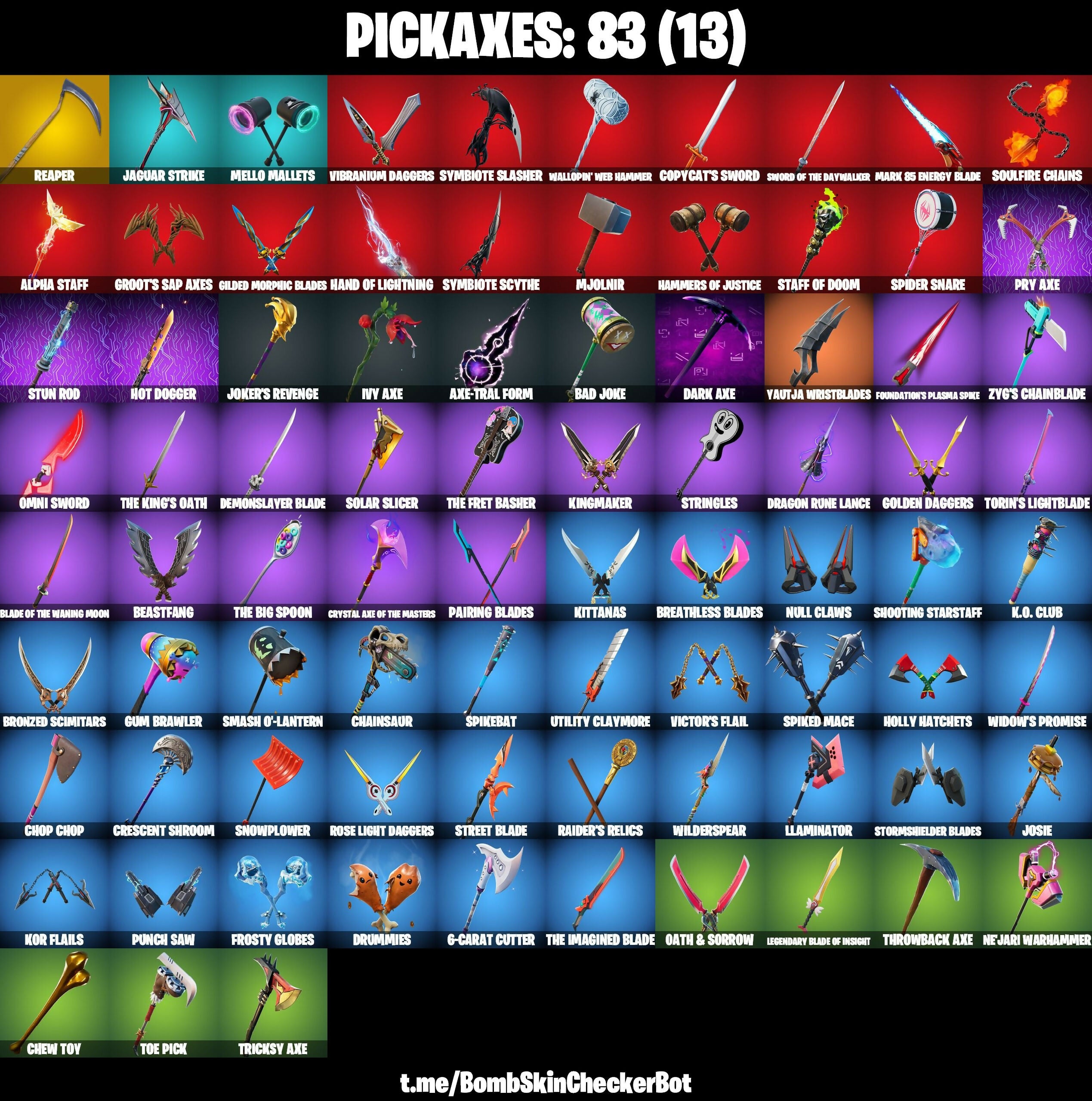 6-Carat Cutter, A Warrior Prepares, Adira, Agent Jones, Alpha Staff, Atlantean Fishstick, Aura, Axe-Tral Form, Azarath Metrion Zinthos!, Backlash, Bad Joke, Battle Call, Bean Bag, Beastfang, Black Panther, Blade, Blade of the Waning Moon, Blinding Lights, Blowin' Up, Boomin', Boots 'N' Cats, Breathless Blades, Brolly Stroll, Bronzed Scimitars, Captain Marvel, Cardistry, Chainsaur, Charlotte, Chew Toy, Chimichanga!, Choice Knit, Chop Chop, Chris Redfield, Clean Groove, Clean Sweep, Cluck, Codename E.L.F., Controller Crew, Copycat's Sword, Crescent Shroom, Crowning Achievement, Crystal, Crystal Axe of the Masters, Cyclo Curl, Dark Axe, Dark Jonesy, Dark Red Knight, Dark Wild Card, Daywalker's Kata, Deep Dab, Demonslayer Blade, Denied, Diamond Diva, Doctor Doom, Don't Start Now, Dragon Rune Lance, Drop The Bass, Drummies, Dummy, Dynamo, Eddie Brock, Electro Swing, Evasive Maneuvers, Evie, Fa-La-La-La-Fishstick, Fabio Sparklemane, Finger Guns, Fishstick, Flippin' Away, Focused, Foundation's Plasma Spike, Frosty Globes, Frozen Fishstick, Frozen Nog Ops, Galaxy Scout, Gangnam Style, Ghost Rider, Ghoul Trooper, Gilded Morphic Blades, Gingerbread Raider, Go Mufasa, Go! Go! Go!, Golden Daggers, Groot, Groot's Sap Axes, Guggimon, Gum Brawler, Gumbo, Gun Show, Gunnar, Hammers of Justice, Hand of Lightning, Hand-Forged, Harlowe, Haven, Holly Hatchets, Hot Dogger, Hot Stuff, Howl, Imperial Stormtrooper, It Is Finished, It's... You?, Ivy Axe, J.B. Chimpanski, Jaguar Strike, Jennifer Walters, Jill Valentine, Joey, Joker's Revenge, Josie, Jumbo Popcorn, K.O. Club, Kiara K.O., Kingmaker, Kittanas, Kondor, Kor, Kor Flails, Krisabelle, Kymera, Lara Croft, Laugh It Up, Legendary Blade of Insight, Lexa, Lil' Monster, Lil' Rover, Lil' Saucer, Llaminator, Love It!, Lt. John Llama, Lunar Charge, Lunch Break, Malik, Mancake, Mandalorian, Manic, Marigold, Mark 85 Energy Blade, Marked Marauder, Marsh Walk, Marshmello, Mashed Potato, Master Chief, Mave, Mello Mallets, Menace, Metal Mouth, Midas Rex, Mjolnir, Monks, Mwahaha, Mystique, Nailed It, Ne'Jari Warhammer, Neymar Jr, Ninja Style, No Sweat, Null Claws, Oath & Sorrow, Omni Sword, Out West, Pairing Blades, Pirouette, Pitch Patroller, Pizza Party, Poised Playmaker, Poison Ivy, Polar Peely, Poof, Predator, Prowler, Pry Axe, Punch Saw, Raider's Relics, Raz, Ready When You Are, Reaper, Rebirth Raven, Recon Expert, Recon Specialist, Red Card, Reese, Renegade, Rock Out, Ronin, Rose Light Daggers, Sabina, Sand Walk, Savage, Say So, Scootin', Seeker, Segway Tour, Shadow Enforcer, Shadow Midas, Shanta, Shanty For A Squad, Shooting Starstaff, Shuriken Spinner, Sing Along, Ska-Stra-Terrestrial, Smash O'-Lantern, Snap, Snowplower, Solar Slicer, Soulfire Chains, Sparkplug, Spider Snare, Spiderman Gilded Reality, Spikebat, Spiked Mace, Staff of Doom, Steady, Storm, Stormfarer, Stormshielder Blades, Street Blade, Stringles, Stun Rod, Sunny, Swamp Stalker, Sword of the Daywalker, Symbiote Scythe, Symbiote Slasher, T-800, Take The Cake, Tarana, Taskmaster, Team Mech, Team Monster, Tess, Thanos, The Big Spoon, The Cube Queen, The Devourer, The Flash, The Foundation, The Fret Basher, The Imagined, The Imagined Blade, The Joker, The King's Oath, The Renegade, Thor, Throwback Axe, Toasty, Toe Pick, Tony Stark, Toona Fish, Toosie Slide, Torin, Torin's Lightblade, Tricksy Axe, Tsuki 2.0, Utility Claymore, Vautja Wristblades, Venom, Vibranium Daggers, Victor's Flail, Vulcan Salute, Wakandan Salute, Wallopin' Web Hammer, Waterworks, Whiplash, Widow's Promise, Wilderspear, Wolverine, Zadie, Zyg, Zyg's Chainblade