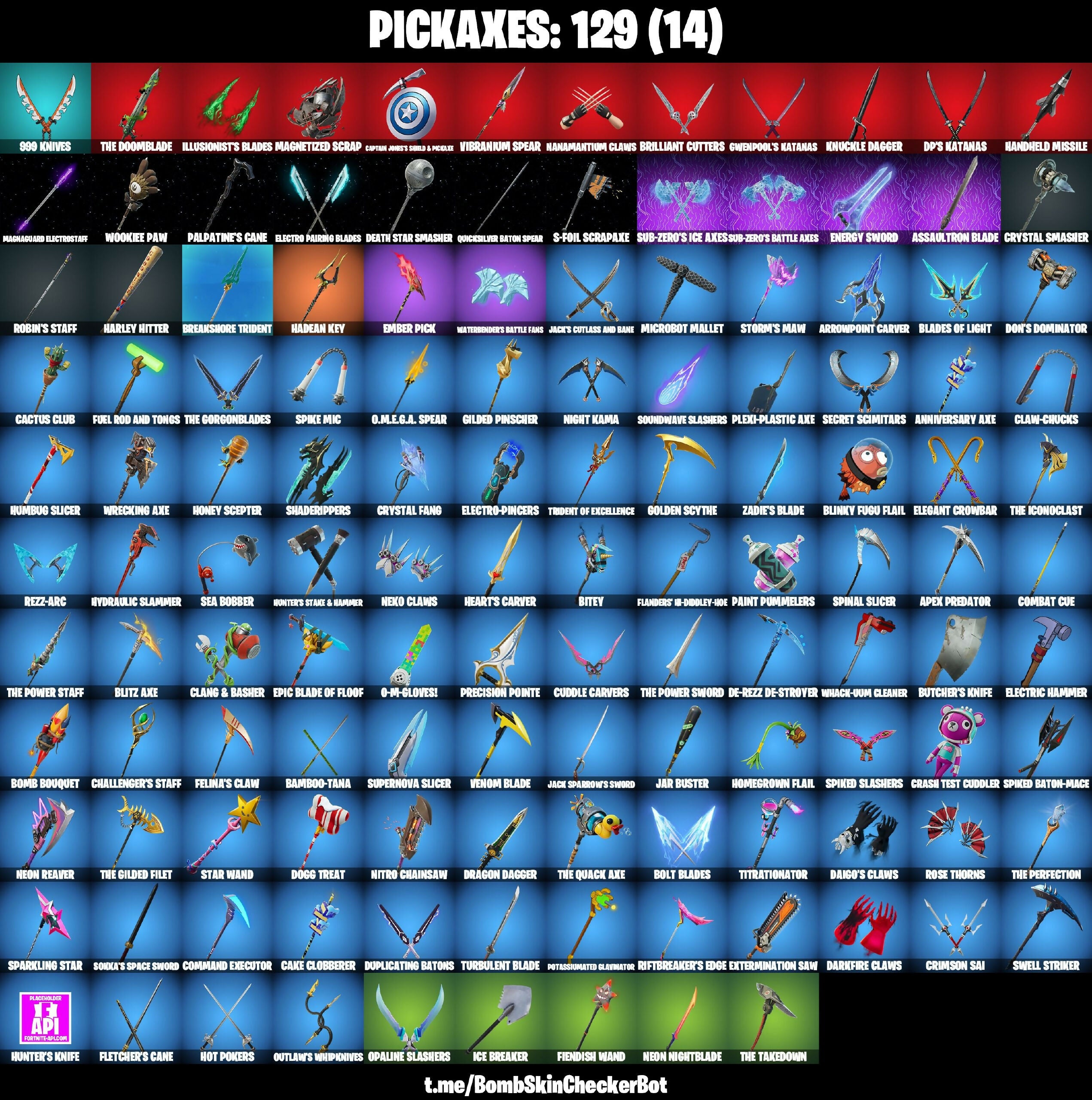 (Snikit!), 1-Ball, 212th Battalion Trooper, 501st Trooper, 999 Knives, Agent Patch, Ahsoka's Clone Trooper, Anniversary Axe, Apex Predator, Aphrodite, Apprentice Evie, Arcane Research, Arrowpoint Carver, Artemis, Ascend!, Assaultron Blade, Avatar's Flourish, Backbeat Bow, Bamboo-Tana, Baron's Hoard, Battle Blessing, Battle Gamer Mae, Bender Bending Rodriguez, Berzerk Banana Beam, Big Dill, Bike To Go, Birdarang Flourish, Bitey, Blades of Light, Blinky Fishstick, Blinky Fugu Flail, Blitz Axe, Blitz Knight, Bolt Blades, Bomb Bouquet, Boogie Down, Breakshore Trident, Brilliant Cutters, Brite Moves, Brite Raider, Bug Punk Sunny, Butcher’s Knife, Cactus Club, Cake Clobberer, Captain Jones, Captain Jones’s Shield & Pickaxe, Captain L America, Cassidy Quinn, Cauldron Chill, Cerberus, Challenger’s Staff, Chaos Director, Chun-Li, Clang & Basher, Clara, Claw-Chucks, Clone Trooper, Codsworth's Cleanup, Combat Cue, Command Executor, Conch Call, Coruscant Guard, Crab Walkin', Crash Test Cuddler, Crimson Sai, Crowning Achievement, Crystal Fang, Crystal Smasher, Cuddle Carvers, Cursed Jack Sparrow, DP’s Katanas, Daigo, Daigo’s Claws, Darkfire Claws, De-Rezz De-Stroyer, Deadpool (Pen & Ink), Death Star Smasher, Dill With It, Dino Megazord, Disassemble, Dogg Treat, Don’s Dominator, Doom, Doom's Domain, Dragon Dagger, Dragon Dagger's Song, Duelist's Card Trick, Dummy, Dupli-Kate, Duplicating Batons, Duplikates, Dynamo Tintina, Electric Hammer, Electro Pairing Blades, Electro-Pincers, Elegant Crowbar, Ember Pick, Emma Frost, Emperor Palpatine, Energy Sword, Epic Blade of Floof, Explorer Emilie, Extermination Saw, Feel The Force, Felina, Felina’s Claw, Fiendish Wand, Fire Show, Fireworks Salvo, Fist Bump, Flanders H-Diddley-Hoe, Fletcher Kane, Fletcher’s Cane, Focus, Foil Flex, For O.K.R!, Force Lightning, Frozen Treat Cart, Fuel Rod and Tongs, Gangnam Style, General Grievous, General's War Table, Get Griddy, Get Lost, Gilded Pinscher, Godzilla Evolved, Golden Scythe, Good Sportsmanship, Green Ranger, Gwen-step, Gwenpool, Gwenpool’s Katanas, Hadean Key, Hades, Handheld Missile, Harley Hitter, Haylee Skye, Heads Up, Heart Sign, Heart’s Carver, Hellfire Dance, Hero Baymax, Holiday Boxy, Homegrown Flail, Honey Scepter, Hot Pokers, Houdini, Humbug Slicer, Hunter’s Knife, Hunter’s Stake & Hammer, Hydraulic Slammer, Hype!, I'm The Visual, Ice Breaker, Illusionist's Blades, Invisible Cut, Iridia Vayne, It's Chemistry!, Jack Sparrow, Jack Sparrow’s Sword, Jackie, Jack’s Cutlass and Bane, Jade, Jar Buster, Jar Of Dirt, Jet Signals, Job Well Done, Joss, Keisha Cross, Kendo, Killswitch, Knuckle Dagger, Korra, Lapin, Leafy Longboardin', Light Rider, Lil' Armored Truck, Lil' Ghost, Lil' Godzilla Attack, Lil' Resistance Bomber, Lil' Station Wagon, Lil' Zord Battle Mode, Lina Scorch, Lizzik, Lt. Ripp Slade, Magnaguard Electrostaff, Magnetized Scrap, Make A Seat, Marge Simpson, Meat Grinder, Medusa, Megalo Don, Meowdas, Mic'd Up Moves, Microbot Mallet, Microflip, Mini Dogfight, Moonlit Mystery, Morgan Myst, Mr. Dappermint, My Cabbages!, Mysterio, Mysterio's Magic Trick, Namamanitum Claws, Ned Flanders, Neon Nightblade, Neon Reaver, Nexo Claws, Night Kama, Ninja Stance: Donnie, Ninja Stance: Leo, Ninja Stance: Mikey, Ninja Stance: Raph, Nitro Chainsaw, Nyanja, O-M Gloves!, O.M.E.G.A. Spear, Onyx Winter, Opaline Slashers, Origami Battalion, Outlaw Midas, Outlaw's Mugshot, Outlaw's Strut, Outlaw’s Whipknives, Paint Pummeler, Palpatine’s Cane, Parade Riffs, Party Hips, Pea Part Harmony, Peabody, Peel Out, Peelerine, Pig The Butcher, Plexi-Plastic Axe, Poe Dameron, Polly, Poseidon, Potassiummated Gladiator, Precision Pointe, Puppet Dance, Purr-Demonium, Quicksilver Baton Spear, Rap Boy Reloaded, Rap Monster, Raven's Legion, Real Slim Shady, Reporting For Duty, Rezz-Arc, Rezzblocks, Rhythm Of Chaos, Riftbreaker’s Edge, Ringmaster Scarr, Robin, Robin’s Staff, Rose Thorns, Roundhouse, Rust, S-Foil Scrape Axe, Sand Walk, Santa Dogg, Sea Bobber, Secret Scimitars, Serpentine Summoning, Shadebox, Shaderippers, Shadow Blade Hope, Shadow Enforcer, Shamisen-sational, Show 'Em Off, Shuri, Skatemonster, Slayer Juice Wrld, Sokka’s Space Sword, Soundwave Slashers, Sparkling Star, Sparrow Run, Spider-Man Noir, Spike Mic, Spiked Baton-Mace, Spiked Slashers, Spinal Slicer, Spinback, Spirit Strider, Springfielder Peely, Stand Surfer, Star Wand, Storm’s Maw, Strap Spin, Stupid Sexy Skiing, Sub-Zero (Mk3), Sub-Zero’s Battle Axes, Sub-Zero’s Ice Axes, Subzero Cryptic, Super Save, Superman, Supernova Slicer, Sweet Swing, Swell Striker, Synth Step, Synthwave, T-60 Power Armor, Tagger's Groove, Take A Bow, Targeted Focus, Tatsuo, Tempest Flight, The Batman Who Laughs, The Break, The Break Shot, The Doomblade, The Gilded Filet, The Gorgonblades, The Iconoclast, The Machinist, The Night Rose, The Perfection, The Power Staff, The Power Sword, The Quack Axe, The Takedown, This Is The Way, Titrationator, Trailblazer Tai, Trident of Excellence, Turbulent Blade, Undercover Skye, Unsc Spartan, Valentina, Valentina's Verve, Vanguard Zadie, Vanguard's Charge, Venom Blade, Vibranium Spear, War Machine, Wasteland Rock, Wastelander Magneto, Waterbender’s Battle Fans, Wavebreaker, Whack-Oum Cleaner, What? No Way!, Winterfest Bushranger, Wolf Pack Trooper, Wookiee Paw, Wookiee Team Leader, Wrecking Axe, Yarn Ball, Yellowjacket, Yoo-Mi, Yulejacket, Zadie’s Blade, Zeus, Ziggy