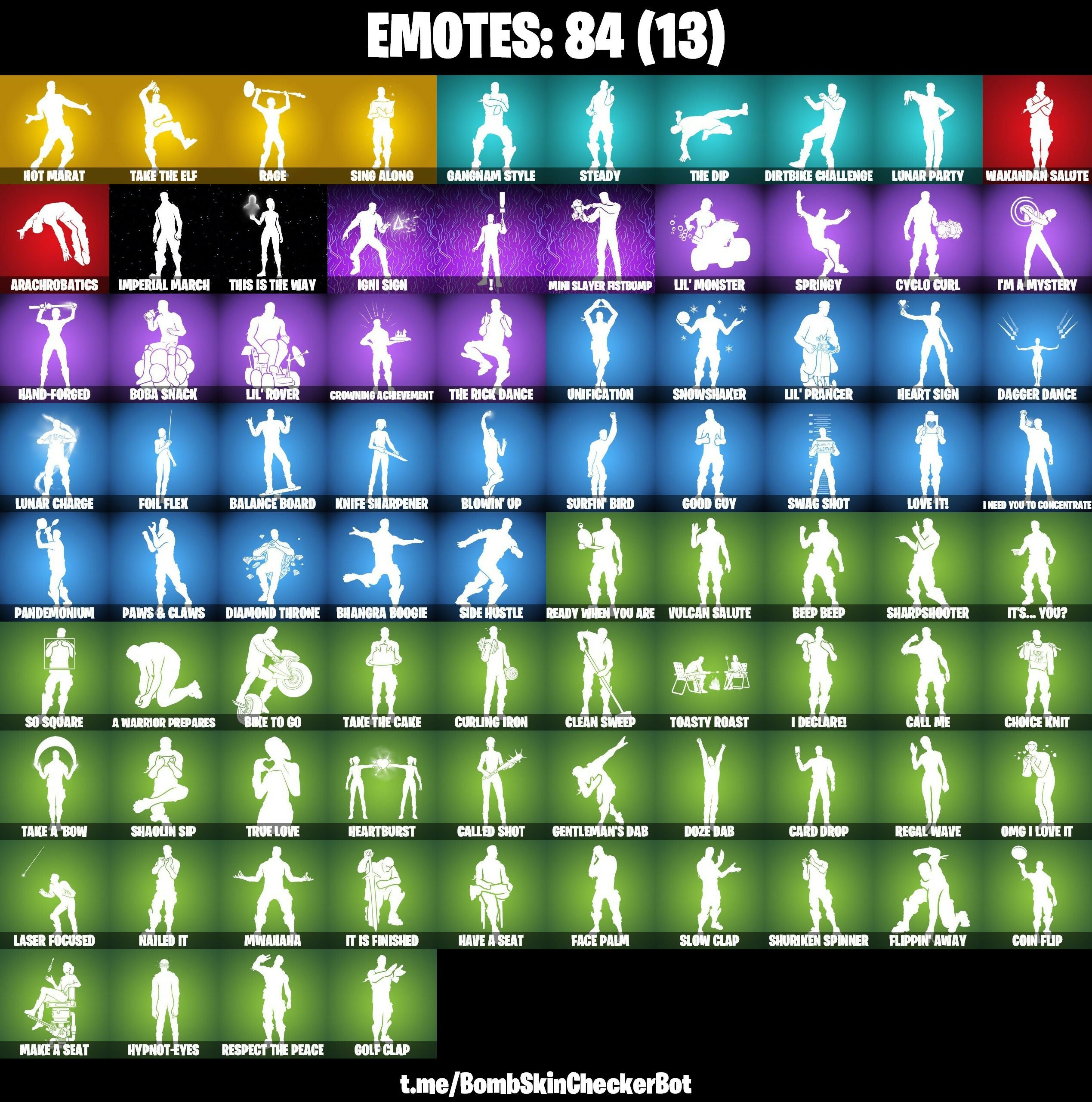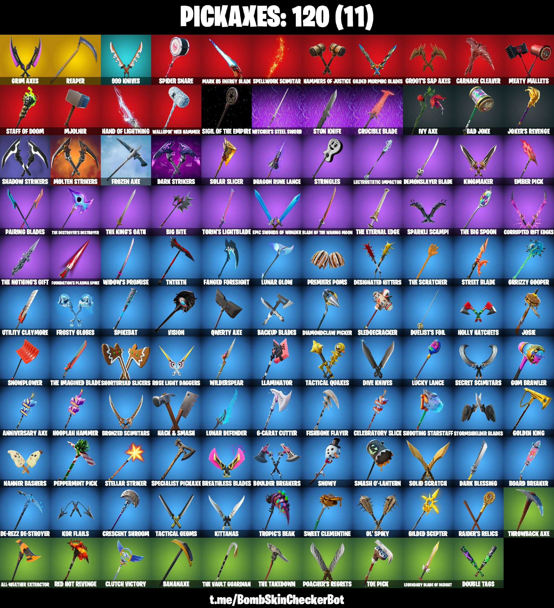 6-Carat Cutter, 999 Knives, A Warrior Prepares, Adira, Agent Peely, All-Weather Extractor, Anniversary Axe, Arachnrobatics, Arctic Adeline, Axo, Backup Blades, Bad Joke, Balance Board, Bananaxe, Beep Beep, Bhangra Boogie, Big Bite, Bike To Go, Blade of the Waning Moon, Blaze, Blowin' Up, Board Breaker, Boba Snack, Boulder Breakers, Brainiac, Breakpoint, Breathless Blades, Bronzed Scimitars, Brutus (Fully Golden), Bytes, Call Me, Called Shot, Card Drop, Carnage, Carnage Cleaver, Celebratory Slice, Charlotte, Choice Knit, Chrome Punk, Clean Sweep, Clutch Victory, Coin Flip, Commando, Contract Giller, Corrupted Rift Edges, Crescent Shroom, Crowning Achievement, Crucible Blade, Cuddlepool, Curling Iron, Cyclo Curl, D'Ark, Dagger Dance, Danger Zone, Dark Blessing, Dark Power Chord, Dark Strikers, Darth Vader, De-Rezz, De-Stroyer, Deadpool, Demonslayer Blade, Desdemona, Designated Hitters, Diamond Diva, Diamond Throne, Diamondclaw Picker, Dirtbike Challenge, Dive Knives, Doctor Doom, Doom Slayer, Double Tags, Doze Dab, Dragon Rune Lance, Driftwalker, Duelist's Foil, Dusty, Ember Pick, Epic Swords of Wonder, Evie, Fabio Sparklemane, Face Palm, Fanged Foresight, First Strike Specialist, Fishbone Flayer, Fishstick, Flippin' Away, Foil Flex, Foundation's Plasma Spike, Frost Squad, Frosty Globes, Frozen Axe, Game Knight, Gangnam Style, Gear Specialist Maya, Gentleman's Dab, Geralt of Rivia, Gilded Morphic Blades, Gilded Scepter, Gold Blooded Ace, Golden King, Golf Clap, Good Guy, Grim Axes, Grizzy Gooper, Groot, Groot's Sap Axes, Grriz, Gum Brawler, Gumbo, Hack & Smash, Hammers of Justice, Hand of Lightning, Hand-Forged, Harlowe, Have A Seat, Haven, Hawin Classic, Heart Sign, Heartburst, Hedron, Helsie, Holiday Boxy, Holly Hatchets, Hooplah Hammer, Hope, Hot Marat, Hot Zone, Hypnot-Eyes, I Declare!, I Need You To Concentrate, I'm A Mystery, Igni Sign, Imperial March, Indiana Jones, It Is Finished, It's... You?, Ivy Axe, J.B. Chimpanski, Jackie, Jennifer Walters, Joker's Revenge, Jonesy The First, Josie, Kingmaker, Kittanas, Knife Sharpener, Kor, Kor Flails, Krisabelle, Laser Focused, Lectrostatic Impactor, Legendary Blade of Insight, Lennox Rose, Lil' Monster, Lil' Prancer, Lil' Rover, Llaminator, Love It!, Lt. Evergreen, Lt. John Llama, Lucky Lance, Lumi Jellie, Lunar Charge, Lunar Defender, Lunar Glow, Lunar Party, Major Mancake, Make A Seat, Malik, Mark 85 Energy Blade, Massai, Meaty Mallets, Meow Skulls, Meowscles, Midas (Fully Golden), Midas Rex, Min-Joon, Mini Slayer Fistbump, Mjolnir, Molten Omen, Molten Strikers, Montague, Mwahaha, Mystique, Nailed It, Nanner Bashers, Nezumi, Nisha, Ol' Spiky, Omg I Love It, Oscar, Pairing Blades, Pandemonium, Paradigm (Reality-659), Paws & Claws, Peppermint Pick, Peter Griffin, Plastic Patroller, Poacher's Regrets, Poison Ivy, Polar Peely, Premiere Poms, Qwerty Axe, Rage, Raider's Relics, Ravenpool, Ready When You Are, Reaper, Red Hot Revenge, Regal Wave, Renzo the Destroyer, Respect The Peace, Ronin, Rose Light Daggers, Runway Racer, Sabina, Secret Scimitars, Seeker, Selene, Shadow Ark, Shadow Strikers, Shanta, Shaolin Sip, Sharpshooter, Shooting Starstaff, Shortbread Slicers, Shuriken Spinner, Side Hustle, Sigil of the Empire, Sing Along, Skye, Slayer Juice Wrld, Sled Ready Guff, Sledgecracker, Slim Shady, Slow Clap, Smash O'-Lantern, Snap, Snowmando, Snowplower, Snowshaker, Snowy, So Square, Solar Slicer, Solid Scratch, Solid Snake, Sparkli Scampi, Specialist Pickaxe, Spellwork Scimitar, Spider Snare, Spider-Man, Spidergwen Aurelian, Spikebat, Springy, Staff of Doom, Steady, Stellar Striker, Storm, Stormfarer, Stormshielder Blades, Street Blade, Stringles, Stun Knife, Surfin' Bird, Swag Shot, Sweet Clementine, Tactical Geoms, Tactical Quaxes, Take A 'Bow, Take The Cake, Take The Elf, The Ageless, The Big Spoon, The Cube Queen, The Destroyer's Destroyer, The Dip, The Eternal Edge, The Foundation, The Imagined Blade, The Joker, The King's Oath, The Nothing's Gift, The Rick Dance, The Scratcher, The Takedown, The Vault Guardian, This Is The Way, Thor, Throwback Axe, TinTeeth, Tntina, Toasty Roast, Toe Pick, Tony Stark, Toona Fish, Torin, Torin's Lightblade, Tower Recon Specialist, Tricksy, Tropic's Beak, True Love, Tsuki, Twyn, Unchained Ramirez, Unification, Utility Claymore, Valeria, Vengeance Jones, Vision, Vulcan Salute, Wakandan Salute, Wallopin' Web Hammer, Widow's Promise, Wilderspear, Winterfest Bushranger, Witchers Steel Sword, Wolverine, Wooly Warrior, Yuletide Ranger