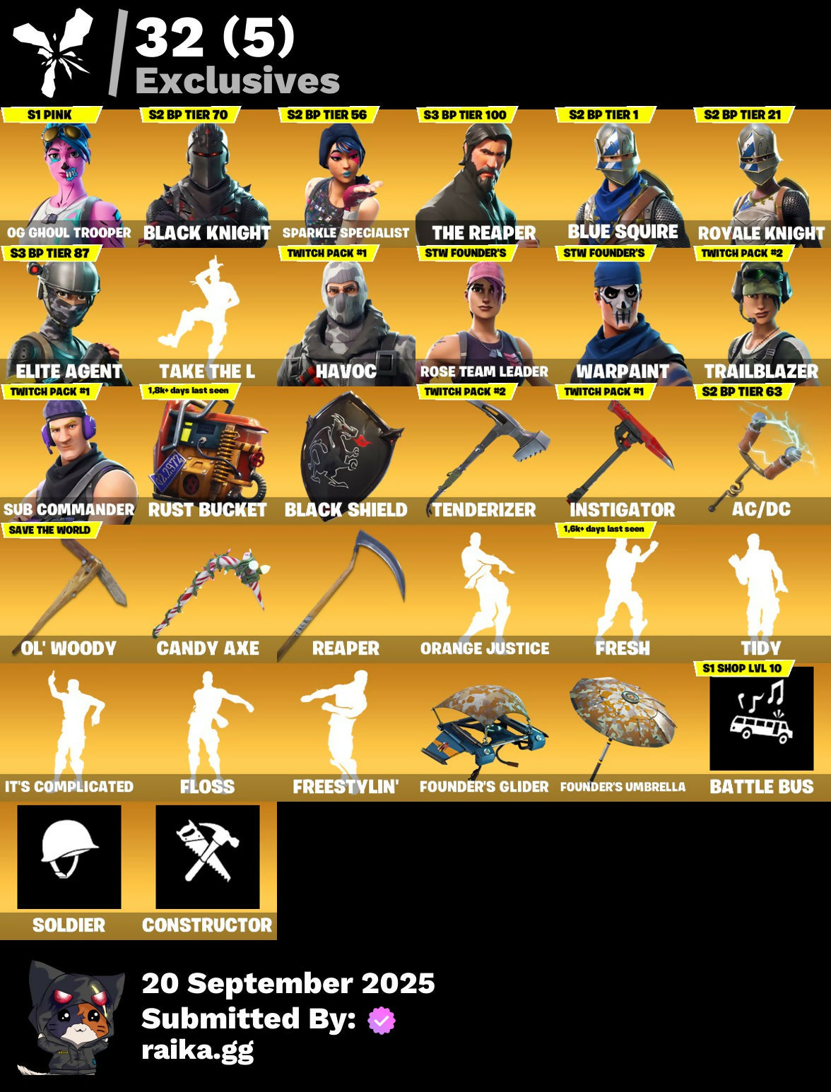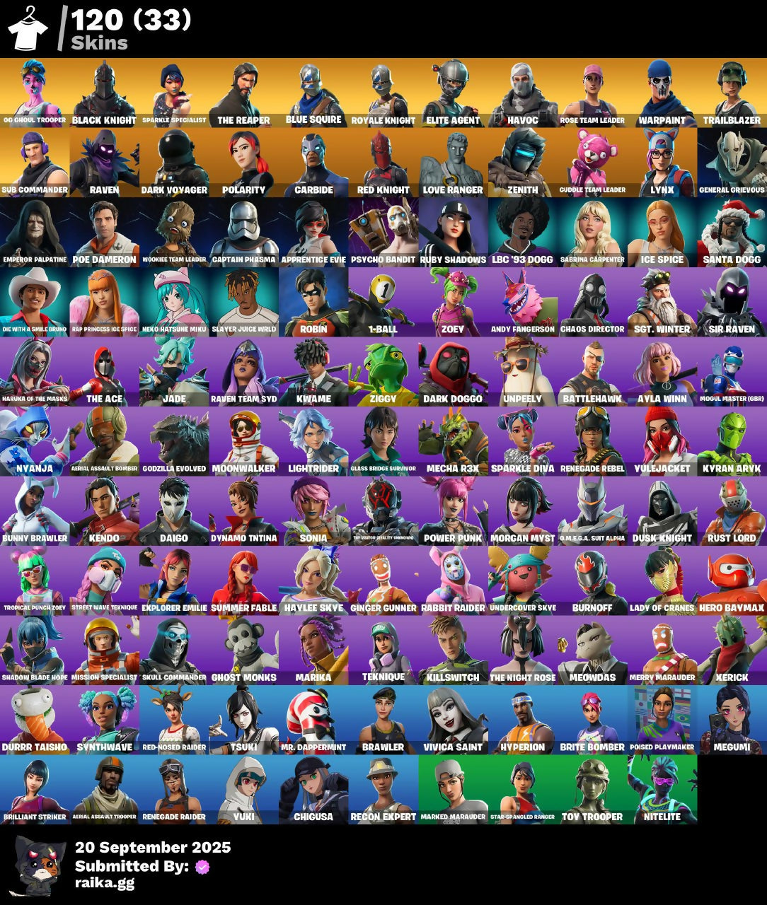 120 skins ✅ OG STW ✅ Og Ghoul Trooper ✅Pink Ghoul Trooper ✅ Black Knight ✅ Sparkle Specialist ✅ The Reaper ✅ Blue Squire ✅ 2950 VB