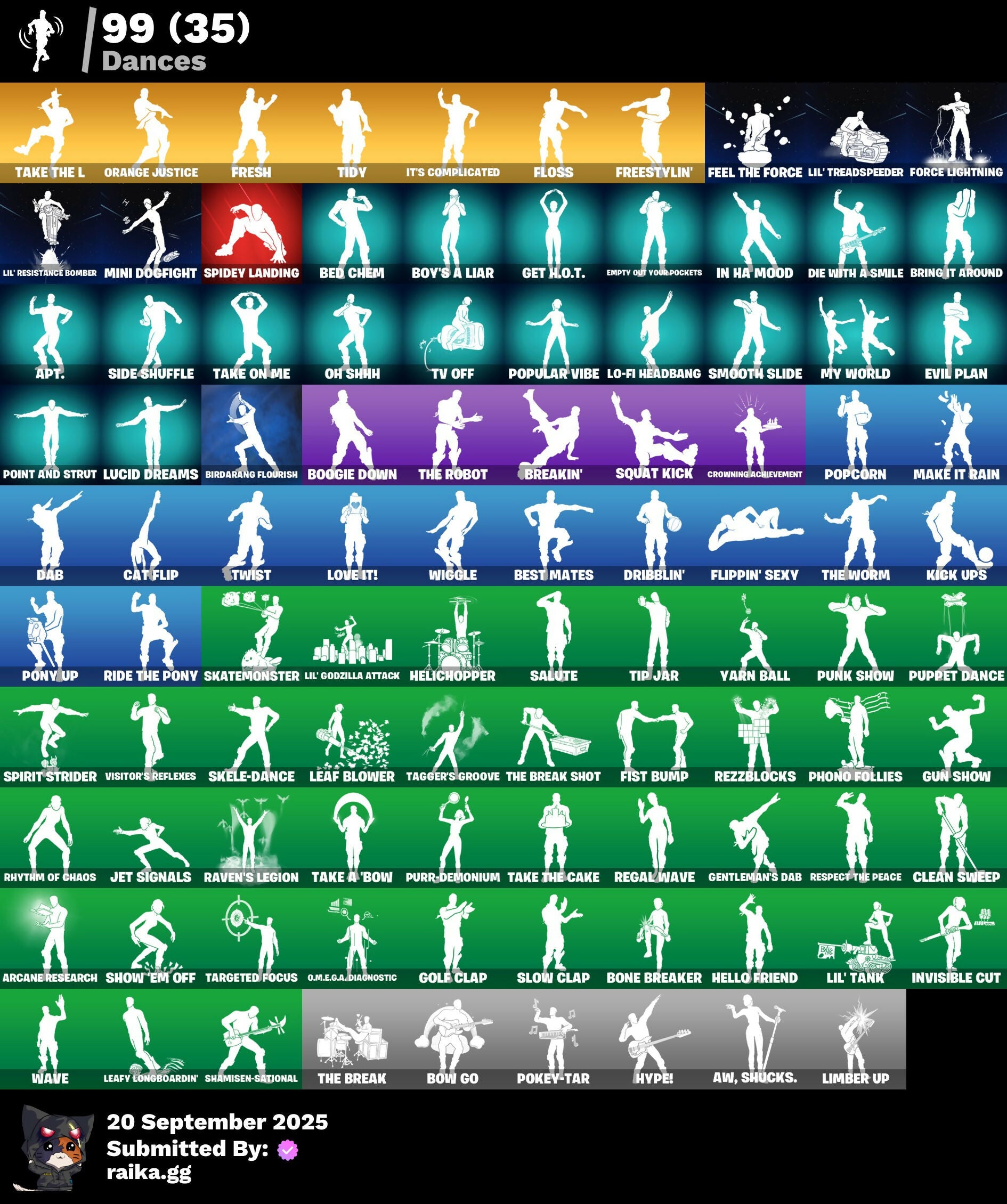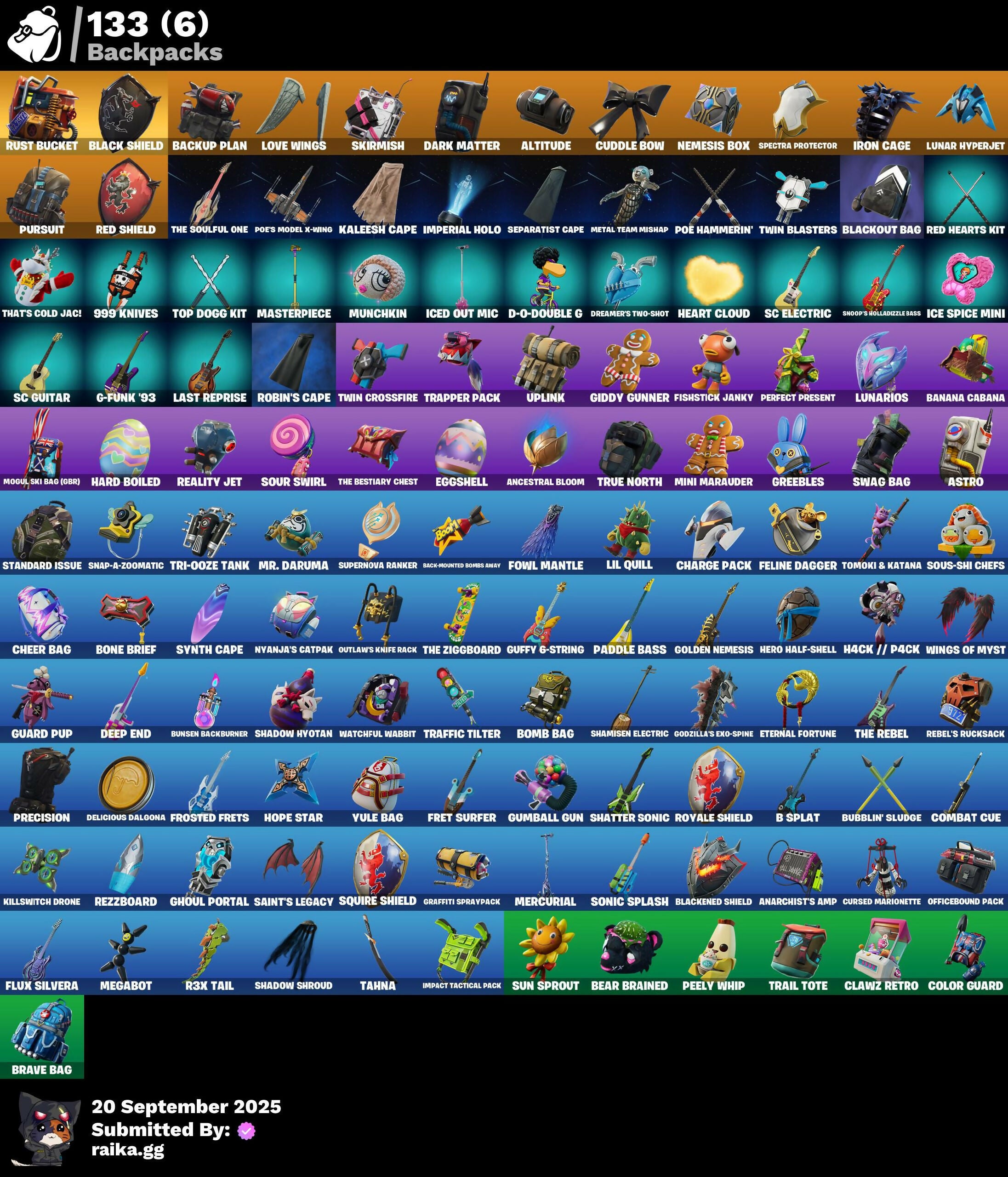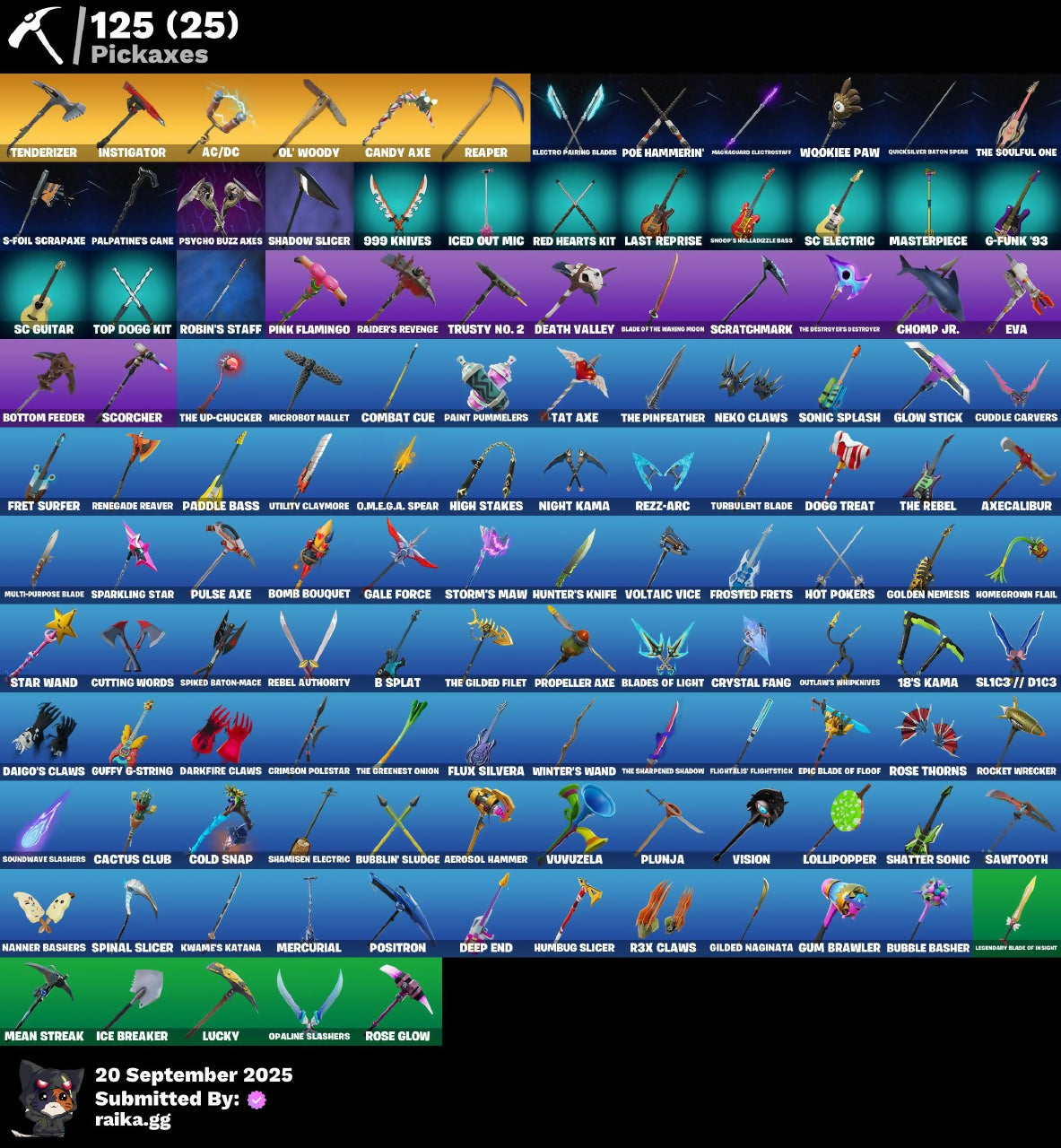 1-Ball, 18's Kama, 999 Knives, Ac/Dc, Aerial Assault Bomber, Aerial Assault Trooper, Aerosol Hammer, Altitude, Anarchist's Amp, Ancestral Bloom, Andy Fangerson, Apprentice Evie, Apt., Arcane Research, Astro, Aw, Shucks., Axecalibur, Ayla Winn, B Splat, Backup Plan, Banana Cabana, Battle Bus, Battlehawk, Bear Brained, Bed Chem, Best Mates, Birdarang Flourish, Black Knight, Black Shield, Blackened Shield, Blackout Bag, Blade Of The Waning Moon, Blades Of Light, Blue Squire, Bomb Bag, Bomb Bouquet, Bone Breaker, Bone Brief, Boogie Down, Bottom Feeder, Bow Go, Boy's A Liar, Brave Bag, Brawler, Breakin', Brilliant Striker, Bring It Around, Brite Bomber, Bubble Basher, Bubblin' Sludge, Bunny Brawler, Bunsen Backburner, Burnoff, Cactus Club, Candy Axe, Captain Phasma, Carbide, Cat Flip, Chaos Director, Charge Pack, Cheer Bag, Chigusa, Chomp Jr., Clawz Retro, Clean Sweep, Cold Snap, Color Guard, Combat Cue, Constructor, Crimson Polestar, Crowning Achievement, Crystal Fang, Cuddle Bow, Cuddle Carvers, Cuddle Team Leader, Cursed Marionette, Cutting Words, D-O-Double G, Dab, Daigo, Daigo's Claws, Dark Doggo, Dark Matter, Dark Voyager, Darkfire Claws, Death Valley, Deep End, Delicious Dalgona, Die With A Smile, Die With A Smile Bruno, Dogg Treat, Dreamer's Two-Shot, Dribblin', Durrr Taisho, Dusk Knight, Dynamo Tntina, EVA, Eggshell, Electro Pairing Blades, Elite Agent, Emperor Palpatine, Empty Out Your Pockets, Epic Blade Of Floof, Eternal Fortune, Evil Plan, Explorer Emilie, Feel The Force, Feline Dagger, Fishstick Janky, Fist Bump, Flightallis' Flightstick, Flippin' Sexy, Floss, Flux Silvera, Force Lightning, Founder's Glider, Founder's Umbrella, Fowl Mantle, Freestylin', Fresh, Fret Surfer, Frosted Frets, G-Funk '93, Gale Force, General Grievous, Gentleman's Dab, Get H.O.T., Ghost Monks, Ghoul Portal, Giddy Gunner, Gilded Naginata, Ginger Gunner, Glass Bridge Survivor, Glow Stick, Godzilla Evolved, Godzilla's Exo-Spine, Golden Nemesis, Golf Clap, Graffiti Spraypack, Greebles, Guard Pup, Guffy 6-String, Gum Brawler, Gumball Gun, Gun Show, H4CK // P4CK, Hard Boiled, Haruka Of The Masks, Havoc, Haylee Skye, Heart Cloud, Helichopper, Hello Friend, Hero Baymax, Hero Half-Shell, High Stakes, Homegrown Flail, Hope Star, Hot Pokers, Humbug Slicer, Hunter’s Knife, Hype!, Hyperion, Ice Breaker, Ice Spice, Ice Spice Mini, Iced Out Mic, Impact Tactical Pack, Imperial Holo, In Ha Mood, Instigator, Invisible Cut, Iron Cage, It's Complicated, Jade, Jet Signals, Kaleesh Cape, Kendo, Kick Ups, Killswitch, Killswitch Drone, Kwame, Kwame's Katana, Kyrian Aryk, Lady Of Cranes, Last Reprise, Lbc '93 Dogg, Leaf Blower, Leafy Longboardin', Legendary Blade Of Insight, Lightrider, Lil Quill, Lil' Godzilla Attack, Lil' Resistance Bomber, Lil' Tank, Lil' Treadspeeder, Limber Up, Lo-Fi Headbang, Lollipopper, Love It!, Love Ranger, Love Wings, Lucid Dreams, Lucky, Lunar Hyperjet, Lunarios, Lynx, Magnaguard Electrostaff, Make It Rain, Marika, Marked Marauder, Masterpiece, Mean Streak, Mecha R3X, Megabot, Megumi, Meowdas, Mercurial, Merry Marauder, Metal Team Mishap, Microbot Mallet, Mini Dogfight, Mini Marauder, Mission Specialist, Mogul Master (Gbr), Mogul Ski Bag (GBR), Moonwalker, Morgan Myst, Mr. Dappermint, Mr. Daruma, Multi-Purpose Blade, Munchkin, My World, Nanner Bashers, Neko Claws, Neko Hatsune Miku, Nemesis Box, Night Kama, Nitelite, Nyanja, Nyanja's Catpak, O.M.E.G.A. Diagnostic, O.M.E.G.A. Spear, O.M.E.G.A. Suit Alpha, Officebound Pack, Og Ghoul Trooper, Oh Shhh, Ol' Woody, Opaline Slashers, Orange Justice, Outlaw's Knife Rack, Outlaw's Whipknives, Paddle Bass, Paint Pummelers, Palpatine's Cane, Peely Whip, Perfect Present, Phono Follies, Pink Flamingo, Plun-ja, Poe Dameron, Poe Hammerin', Poe's Model X-Wing, Point And Strut, Poised Playmaker, Pokey-Tar, Polarity, Pony Up, Popcorn, Popular Vibe, Positron, Power Punk, Precision, Propeller Axe, Psycho Bandit, Psycho Buzz Axes, Pulse Axe, Punk Show, Puppet Dance, Purr-Demonium, Pursuit, Quicksilver Baton Spear, R3x Claws, R3x Tail, Rabbit Raider, Raider's Revenge, Rap Princess Ice Spice, Raven, Raven Team Syd, Raven's Legion, Reality Jet, Reaper, Rebel Authority, Rebel's Rucksack, Recon Expert, Red Hearts Kit, Red Knight, Red Shield, Red-Nosed Raider, Regal Wave, Renegade Raider, Renegade Reaver, Renegade Rebel, Respect The Peace, Rezz-Arc, Rezzblocks, Rezzboard, Rhythm Of Chaos, Ride The Pony, Robin, Robin's Cape, Robin's Staff, Rocket Wrecker, Rose Glow, Rose Team Leader, Rose Thorns, Royale Knight, Royale Shield, Ruby Shadows, Rust Bucket, Rust Lord, S-Foil Scrapaxe, SC Electric, SC Guitar, Sabrina Carpenter, Saint's Legacy, Salute, Santa Dogg, Sawtooth, Scorcher, Scratchmark, Separatist Cape, Sgt. Winter, Shadow Blade Hope, Shadow Hyotan, Shadow Shroud, Shadow Slicer, Shamisen Electric, Shamisen-Sational, Shatter Sonic, Show 'Em Off, Side Shuffle, Sir Raven, Skatemonster, Skele-Dance, Skirmish, Skull Commander, Slayer Juice Wrld, Slic3 // D1c3, Slow Clap, Smooth Slide, Snap-A-Zoomatic, Snoop's Holladazzle Bass, Snoop's Holladizzle Bass, Soldier, Sonia, Sonic Splash, Soundwave Slashers, Sour Swirl, Sous-Shi Chefs, Sparkle Diva, Sparkle Specialist, Sparkling Star, Spectra Protector, Spidey Landing, Spiked Baton-Mace, Spinal Slicer, Spirit Strider, Squat Kick, Squire Shield, Standard Issue, Star Wand, Star-Spangled Ranger, Storm’s Maw, Street Wave Teknique, Sub Commander, Summer Fable, Sun Sprout, Supernova Ranker, Swag Bag, Synth Cape, Synthwave, TV Off, Tagger's Groove, Tahna, Take A Bow, Take On Me, Take The Cake, Take The L, Targeted Focus, Tat Axe, Teknique, Tenderizer, That's Cold Jac!, The Ace, The Bestiary Chest, The Break, The Break Shot, The Destroyer's Destroyer, The Gilded Filet, The Greenest Onion, The Night Rose, The Pinfeather, The Reaper, The Rebel, The Robot, The Sharpened Shadow, The Soulful One, The Up-Chucker, The Visitor (Reality Unknown), The Worm, The Ziggboard, Tidy, Tip Jar, Tomoki & Katana, Top Dogg Kit, Toy Trooper, Traffic Tilter, Tr