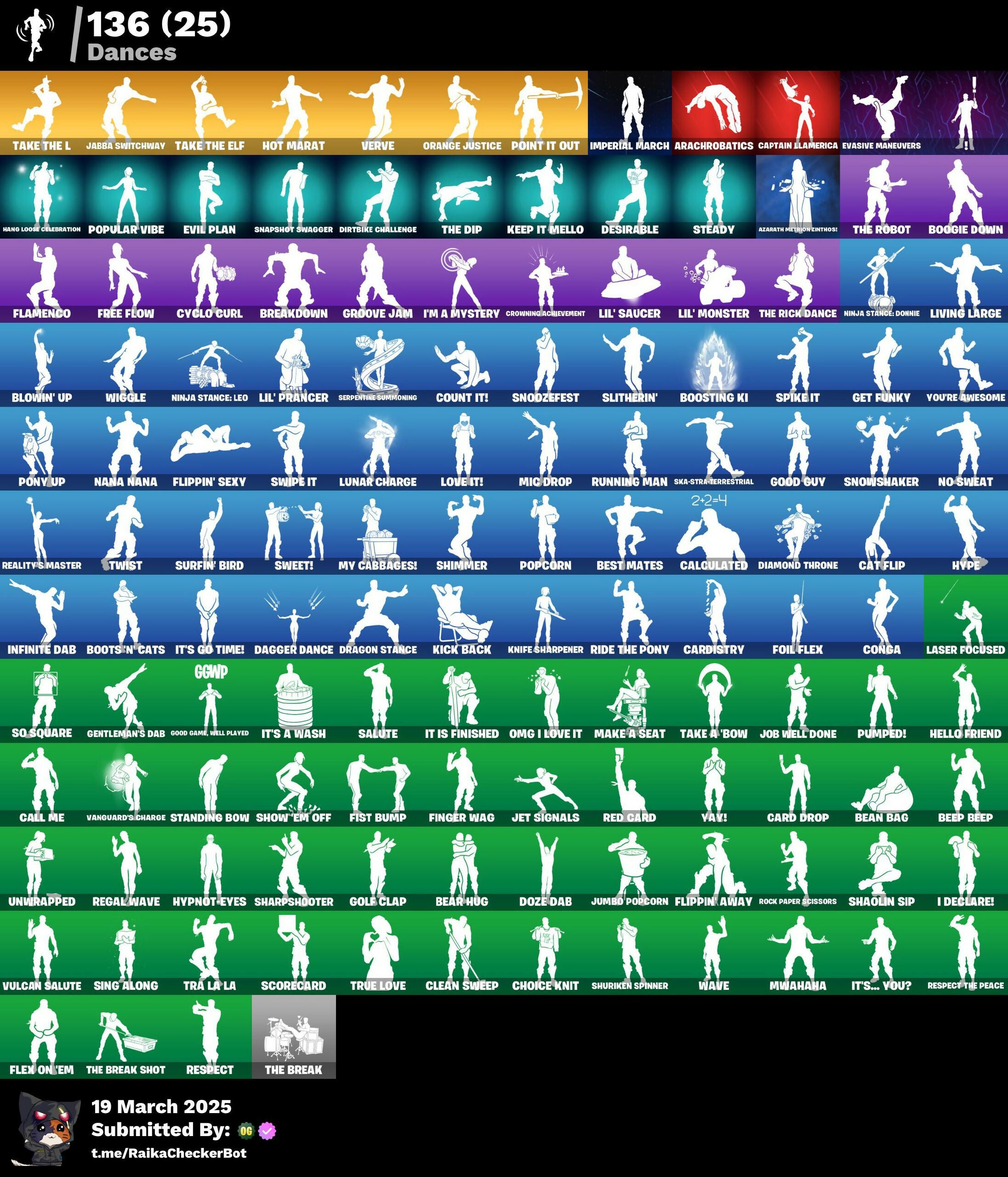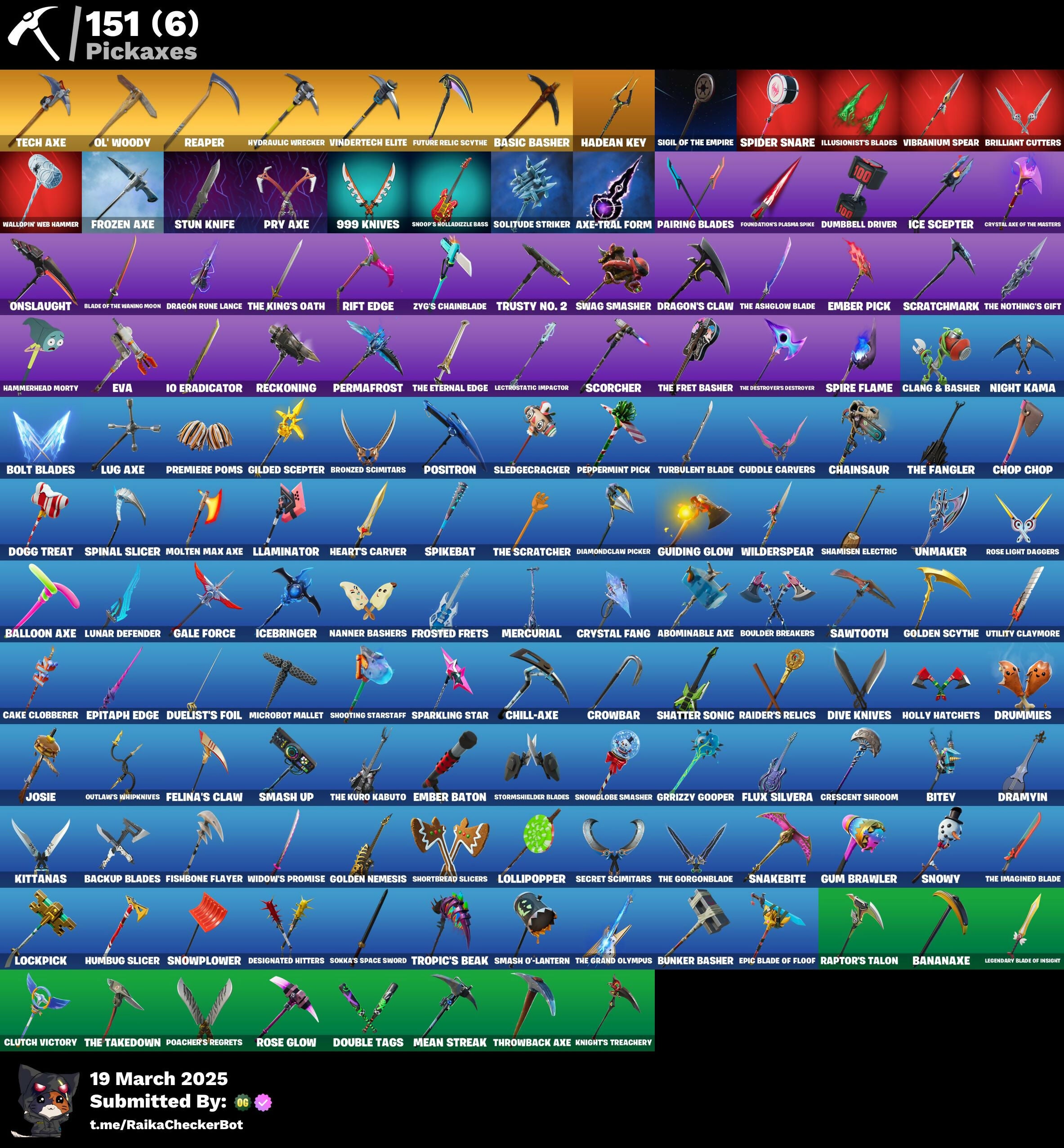999 Knives, A.I.M., Abominable Axe, Adira, Agent Jones, AraChrobatics, Arctic Adeline, Axe-Tral Form, Backup Blades, Balloon Axe, Bananaxe, Basic Basher, Battlehawk, Bean Bag, Bear Hug, Beep Beep, Best Mates, Bitey, Blackheart, Blade Of The Waning Moon, Blowin' Up, Blue Team Leader, Bolt Blades, Boogie Down, Boosting Ki, Boots'n' Cats, Boulder Breakers, Breakdown, Brilliant Cutters, Brite Bomber, Bronzed Scimitars, Bullseye, Bunker Basher, Bunny Brawler, Bytes, Cake Clobberer, Calamity, Calculated, Call Me, Captain Ilamerica, Carbide, Card Drop, Cardistry, Cat Flip, Chainsaur, Chill-Axe, Choice Knit, Chop Chop, Chrome Punk, Clang & Basher, Clean Sweep, Cluck, Clutch Victory, Commando, Conga, Count It!, Crescent Shroom, Crowbar, Crystal Axe Of The Masters, Crystal Fang, Cuddle Carvers, Cyclo Curl, DJ Yonder, Dagger Dance, Dark Bomber, Dark Voyager, Darth Vader, Designated Hitters, Desirable, Diamond Throne, Diamondclaw Picker, Dire, Dirtbike Challenge, Dive Knives, Doctor Slone, Dogg Treat, Double Tags, Doze Dab, Dragon Rune Lance, Dragon Stance, Dragon's Claw, Dramyin, Dream, Drift, Drummies, Duelist's Foil, Dumbbell Driver, Dusk, Elite Agent, Ember, Ember Baton, Ember Pick, Enforcer, Epic Blade Of Floof, Epitaph Edge, Etheria, Eva, Evasive Maneuvers, Evie, Evil Plan, Fable, Felina, Felina's Claw, Finger Wag, Fishbone Flayer, Fist Bump, Flamenco, Flex On 'Em, Flippin' Away, Flippin' Sexy, Flux Silvera, Foil Flex, Foundation's Plasma Spike, Free Flow, Frostbite, Frosted Frets, Frozen Axe, Future Relic Scythe, Gale Force, Gentleman's Dab, Get Funky, Ghoul Trooper, Giddy-Up, Gilded Scepter, Ginger Gunner, Golden Nemesis, Golden Scythe, Golf Clap, Good Guy, Groove Jam, Grriz, Grrizzy Gooper, Guggimon, Guiding Glow, Gum Brawler, Gumbo, Hadean Key, Hammerhead Morty, Hana, Hang Loose Celebration, Harlowe, Haven, Headhunter Prime, Heart's Carver, Hello Friend, Holiday Boxy, Holly Hatchets, Hope, Hot Marat, Humbug Slicer, Huntress, Hybrid, Hydraulic Wrecker, Hype, Hypnot-Eyes, I Declare!, I'm A Mystery, IO Eradicator, Ice Scepter, Icebringer, Illusionist's Blades, Imperial March, Infinite Dab, It Is Finished, It's A Wash, It's Go Time!, It's... You, Jabba Switchway, Jet Signals, Job Well Done, Joey, Josie, Jumbo Popcorn, Jun-Hwan, Keep It Mello, Kick Back, Kittanas, Knife Sharpener, Knight's Treachery, Krisabelle, Kymera, Lara Croft, Laser Focused, Lectrostatic Impactor, Legendary Blade Of Insight, Lennox Rose, Lil' Monster, Lil' Prancer, Lil' Saucer, Living Large, Llaminator, Lockpick, Lollipopper, Love It!, Love Ranger, Lt. Evergreen, Lt. John Llama, Lug Axe, Lunar Charge, Lunar Defender, Lynx, Make A Seat, Malik, Marked Marauder, Mean Streak, Meow Skulls, Mercurial, Mic Drop, Microbot Mallet, Mission Specialist, Molten Max Axe, Montague, Moonwalker, Mwahaha, My Cabbages!, Nana Nana, Nanner Bashers, Night Kama, Nightshade, Ninja Stance: Donnie, Ninja Stance: Leo, Nisha, No Sweat, Ol' Woody, Omega (Stage 5), Omg I Love It, Onesie, Onslaught, Orange Justice, Oscar, Outlaw's Whipknives, Pairing Blades, Paradigm (Reality-659), Peely, Peppermint Pick, Permafrost, Peter Griffin, Poacher's Regrets, Point It Out, Poised Playmaker, Polar Peely, Pony Up, Popcorn, Popular Vibe, Positron, Powder, Premiere Poms, Pry Axe, Pumped!, Ragnarok, Raider's Relics, Raptor's Talon, Raz, Reality's Master, Reaper, Rebirth Raven, Reckoning, Recon Raptor, Red Card, Redline, Regal Wave, Respect, Respect The Peace, Rick Sanchez, Ride The Pony, Rift Edge, Rock Paper Scissors, Rogue Agent, Ronin, Rook, Rose Glow, Rose Light Daggers, Rose Team Leader, Running Man, Runway Racer, Rust Lord, Sabina, Salute, Santa Dogg, Sawtooth, Scorcher, Scorecard, Scratchmark, Secret Scimitars, Serpentine Summoning, Sgt. Winter, Shamisen Electric, Shanta, Shaolin Sip, Sharpshooter, Shatter Sonic, Shimmer, Shooting Starstaff, Shortbread Slicers, Show 'Em Off, Shuriken Spinner, Sidewinder, Sigil Of The Empire, Sing Along, Ska-Stra-Terrestrial, Slayer Juice Wrld, Sled Ready Guff, Sledgecracker, Sledgehammer, Slitherin', Smash O'-Lantern, Smash Up, Snakebite, Snap, Snapshot Swagger, Snoop's Holladdzzle Bass, Snoozefest, Snowglobe Smasher, Snowplower, Snowshaker, Snowy, So Square, Sokka's Space Sword, Solid Snake, Solitude Striker, Sparkling Star, Spider Snare, Spider-Gwen, Spider-Man, Spike It, Spikebat, Spinal Slicer, Spire Assassin, Spire Flame, Squad Leader, Standing Bow, Steady, Stormfarer, Stormshielder Blades, Stun Knife, Sun Strider, Sunny, Surfin' Bird, Swag Smasher, Sweet!, Swipe It, Take A* Bow, Take The Elf, Take The L, Tarana, Tech Axe, Teknique, The Ace, The Ashglow Blade, The Break, The Break Shot, The Destroyer's Destroyer, The Dip, The Eternal Edge, The Fangler, The Foundation, The Fret Basher, The Gorgonblade, The Grand Olympus, The Herald, The Ice King, The Imagined Blade, The King's Oath, The Kuro Kabuto, The Nothing's Gift, The Prisoner, The Reaper, The Rick Dance, The Robot, The Scratcher, The Takedown, The Visitor, Throwback Axe, Toy Trooper, Tra La La, Trog, Tropic's Beak, True Love, Trusty No. 2, Turbulent Blade, Twist, Twyn, Unmaker, Unwrapped, Utility Claymore, Valeria, Valor, Vanguard's Charge, Vengeance Jones, Verve, Vibranium Spear, Vindertech Elite, Vivi Chroma, Vulcan Salute, Wallopin' Web Hammer, Warpaint, Wave, Whistle Warrior, Widow's Promise, Wiggle, Wilderspear, Windwalker Echo, Winterfest Bushranger, Wooly Warrior, Yay!, You're Awesome, Yulejacket, Zenith, Zoey, Zyg, Zyg's Chainblade