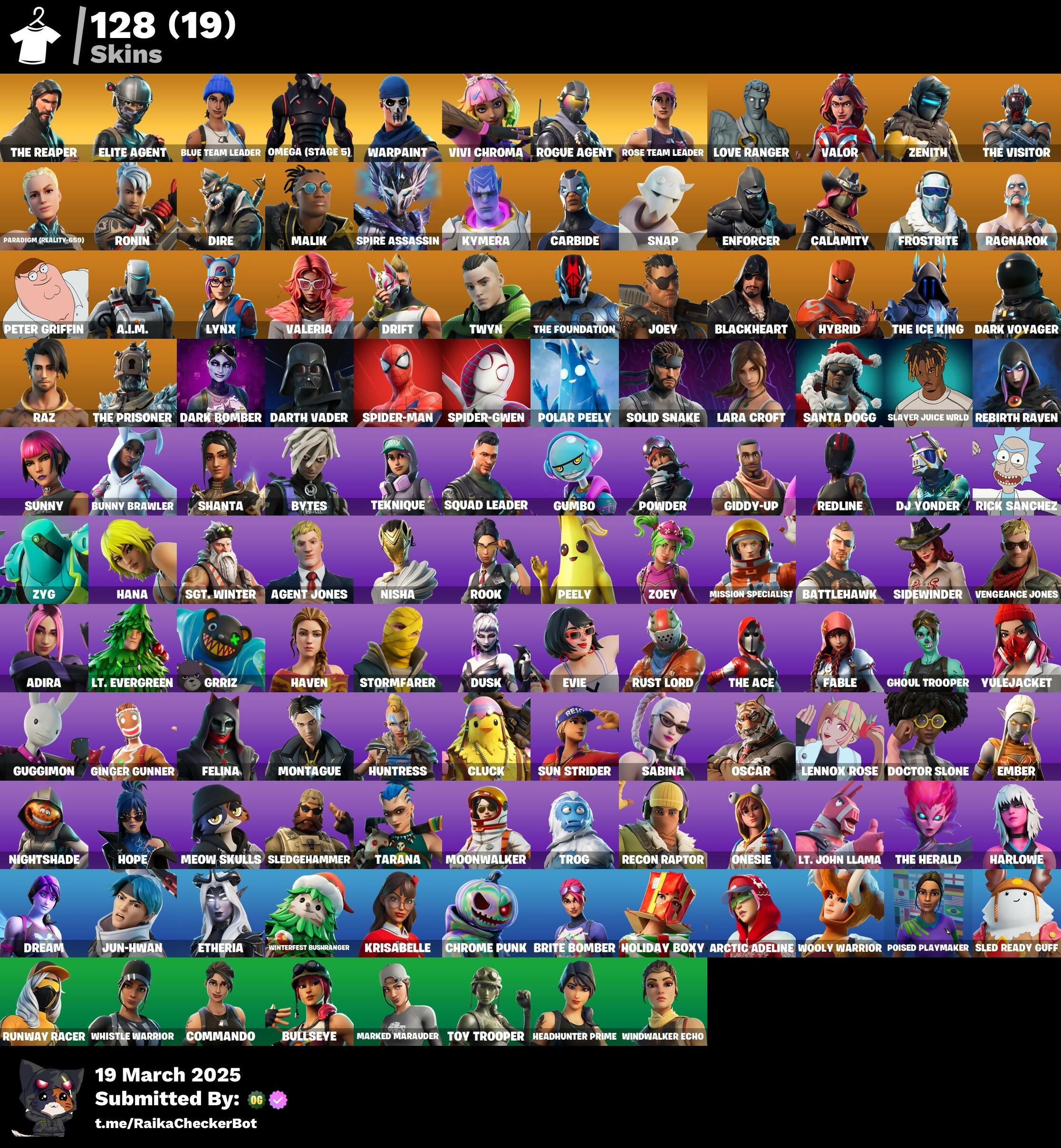 128 skins | OG STW | The Reaper | Elite Agent | Blue Team Leader | Mako | Take The L | Omega (stage 5) | Vivi Chroma | Rogue Agent | Love Ranger | 105 VB