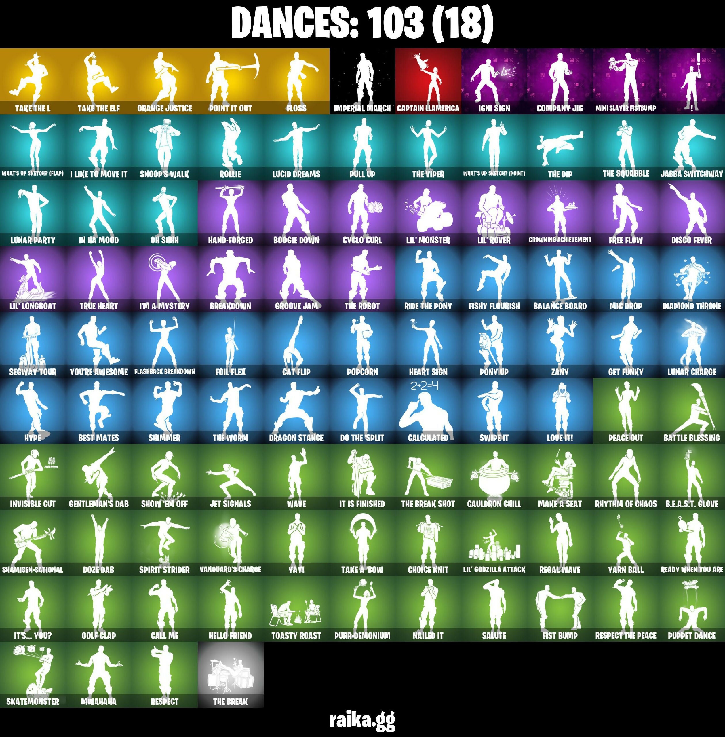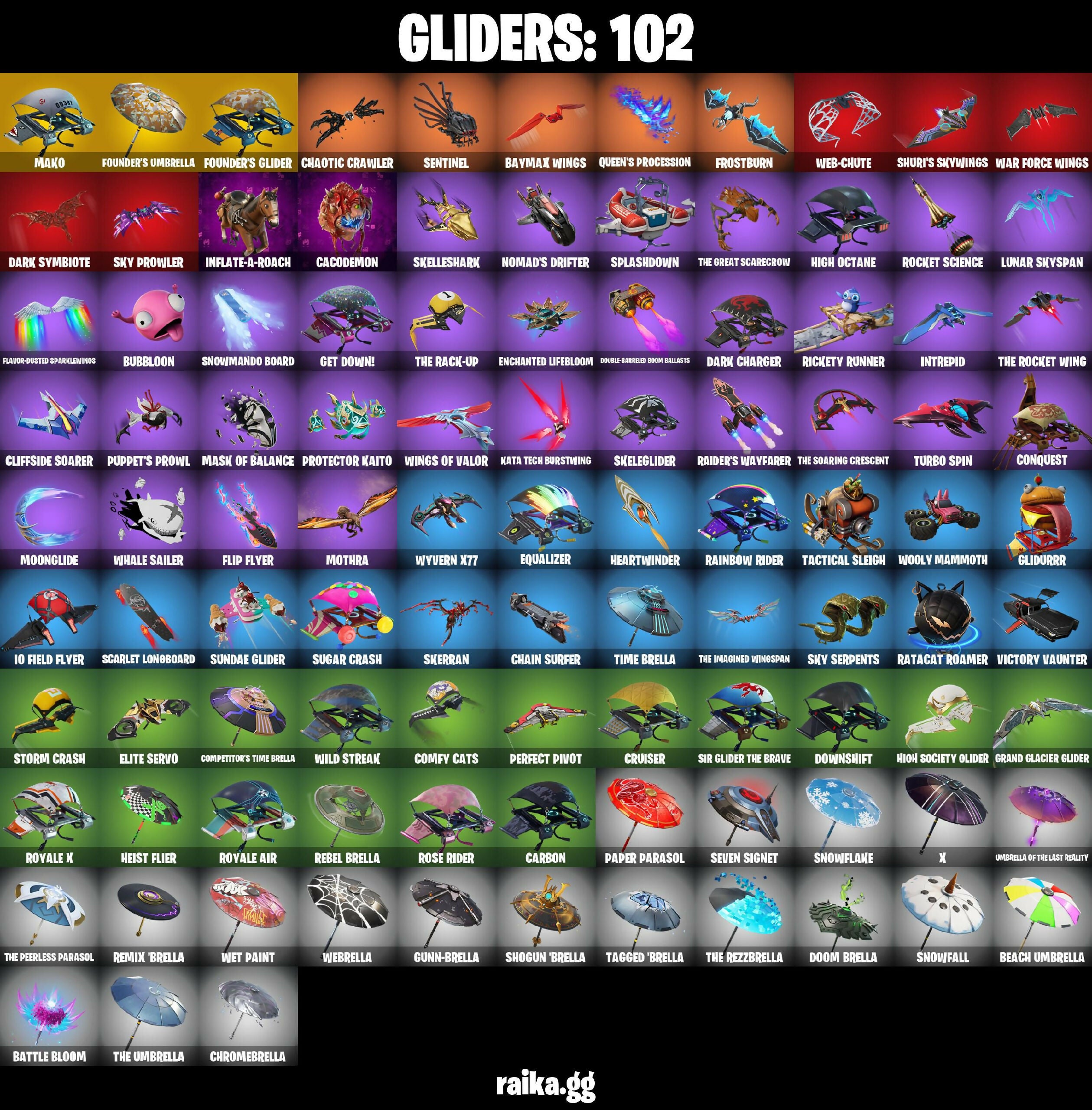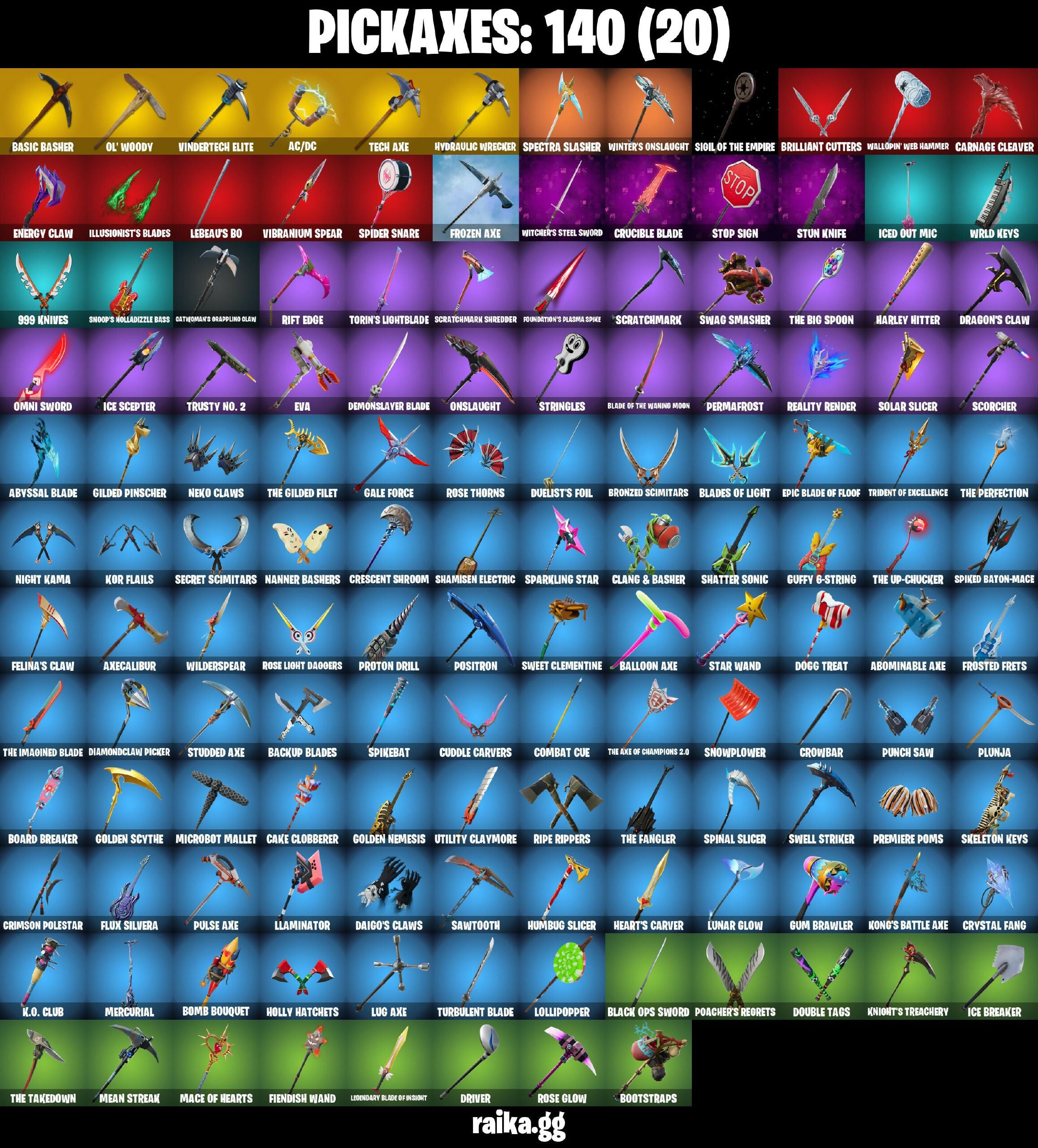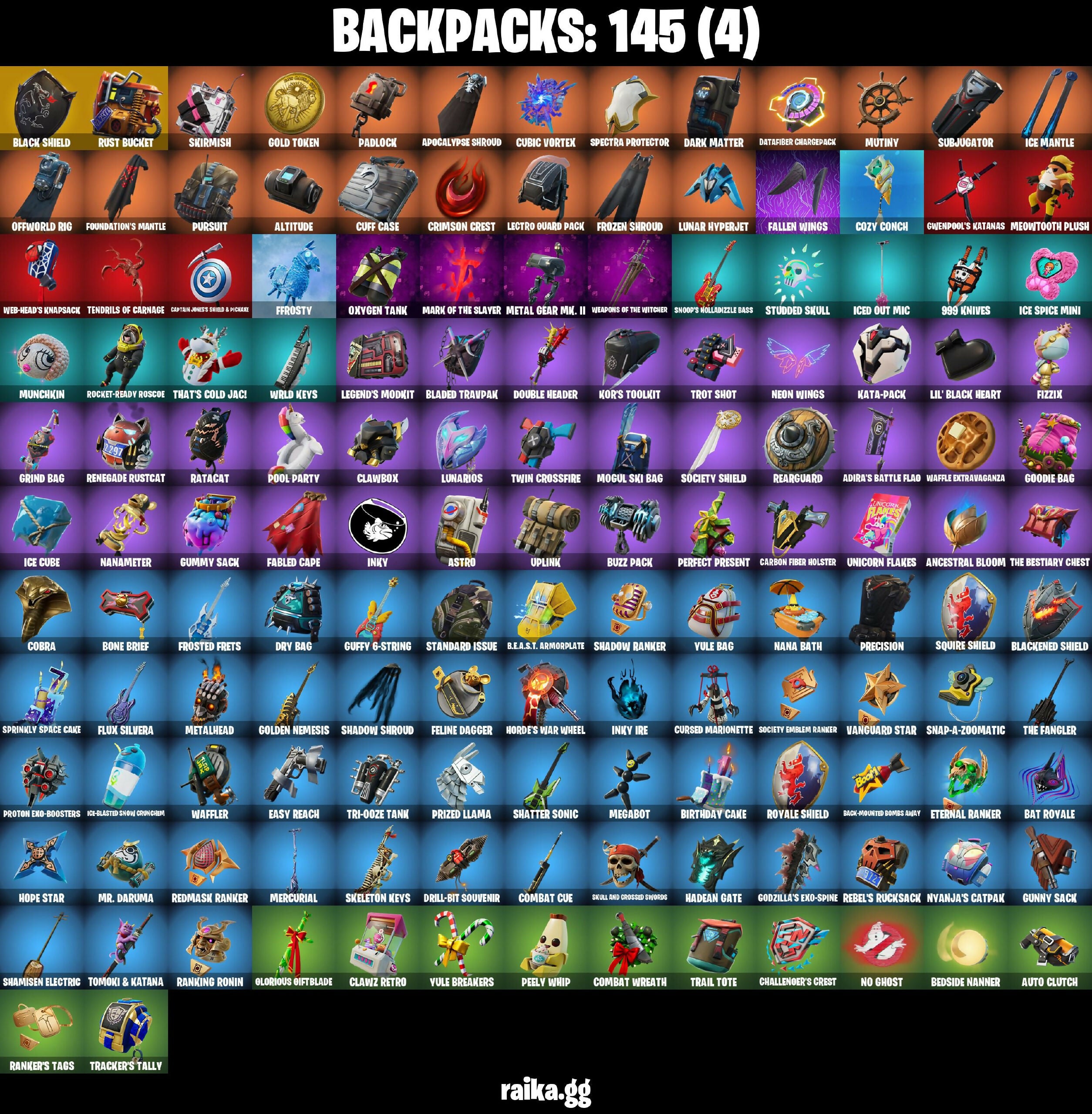 1-Ball, 999 Knives, AC/DC, Abominable Axe, Absenz, Abyssal Blade, Adira's Battle Flag, Aerial Assault Trooper, Altitude, Ancestral Bloom, Apocalypse Shroud, Astro, Astro Armor, Auto Clutch, Axecalibur, B.E.A.S.T. Armorplate, B.E.A.S.T. Glove, Back-Mounted Bombs Away, Backlash, Backup Blades, Balance Board, Balloon Axe, Basic Basher, Bat Royale, Battle Blessing, Battle Bloom, Battlehawk, Baymax Wings, Beach Umbrella, Bedside Nanner, Best Mates, Birthday Cake, Black Knight, Black Ops Sword, Black Shield, Blackened Shield, Blackheart, Blackheart (Stage 8), Blade Of The Waning Moon, Bladed Travpak, Blades Of Light, Blizzabelle, Blue Squire, Board Breaker, Bomb Bouquet, Bone Brief, Boogie Down, Bootstraps, Breakdown, Brilliant Cutters, Bronzed Scimitars, Bubloon, Buzz Pack, Cacodemon, Cake Clobberer, Calculated, Call Me, Captain Jones's Shield & Pickaxe, Captain Llamerica, Carbide, Carbon, Carbon Fiber Holster, Carnage, Carnage (Maximum), Carnage Cleaver, Cat Flip, Catwoman's Grappling Claw, Cauldron Chill, Chain Surfer, Chalked Up 1-Ball, Challenger's Crest, Chaos Director, Chaotic Crawler, Charlotte, Choice Knit, Chromebrella, Clang & Basher, Clawbox, Clawz Retro, Cliffside Soarer, Cobra, Color Crush, Combat Cue, Combat Wreath, Comfy Cats, Company Jig, Competitor's Time Brella, Conquest, Cozy Commander, Cozy Conch, Cozy Knit Jonesy, Crescent Shroom, Crimson Crest, Crimson Polestar, Crowbar, Crowning Achievement, Crucible Blade, Cruiser, Crystal Fang, Cubic Vortex, Cuddle Carvers, Cuff Case, Cursed Marionette, Cyclo Curl, Daigo, Daigo's Claws, Dark Charger, Dark Doggo, Dark Matter, Dark Symbiote, Dark Voyager, Datafiber Chargepack, Demon Hunter Hope, Demonslayer Blade, Desert Dominator, Diamond Throne, Diamondclaw Picker, Disco Fever, Do The Split, Dogg Treat, Doom Brella, Doom Dancer, Doom Slayer, Double Header, Double Tags, Double-Barreled Boom Ballasts, Downshift, Doze Dab, Dragon Stance, Dragon's Claw, Drift, Drift Stage 5, Drill-Bit Souvenir, Driver, Dry Bag, Duelist's Foil, Dynamo Tntina, Dynamo Tntoon-A, Easy Reach, Eleven, Elite Agent, Elite Servo, Enchanted Lifebloom, Energized Godzilla, Energy Claw, Enforcer, Epic Blade Of Floof, Equalizer, Eternal Ranker, Eva, Fabio Sparklemane, Fabled Cape, Fallen Love Ranger, Fallen Wings, Felina, Felina's Claw, Feline Dagger, Ffrosty, Fiendish Wand, Fishy Flourish, Fist Bump, Fizzix, Flashback Breakdown, Flatfoot, Flavor-Dusted Sparklewings, Flip Flyer, Floss, Flux Silvera, Foil Flex, Foundation's Mantle, Foundation's Plasma Spike, Founder's Glider, Founder's Umbrella, Free Flow, Frostburn, Frosted Frets, Frozen Axe, Frozen Shroud, Gale Force, Gentleman's Dab, Geralt of Rivia, Get Down!, Get Funky, Gilded Pinscher, Glidurrr, Glorious Giftblade, Godzilla Evolved, Godzilla's Exo-Spine, Gold Token, Golden Nemesis, Golden Scythe, Golf Clap, Goodie Bag, Grand Glacier Glider, Grind Bag, Groove Jam, Guardian Jade, Guffy 6-String, Gum Brawler, Gumbo, Gumbo (Sour), Gummy Sack, Gunn-Brella, Gunnar, Gunny Sack, Gwenpool's Katanas, Hadean Gate, Hand-Forged, Hardsnore Armor Omegafox, Harley Hitter, Harlowe, Harlowe (Helmet), Haven, Haven (Tropical Chirper), Heart Sign, Heart's Carver, Heartwinder, Heist Flier, Hello Friend, Hero Baymax, High Octane, High Society Glider, Holiday Boxy, Holly Hatchets, Holly Jammer, Hope, Hope Star, Horde's War Wheel, Humbug Slicer, Huntress, Hybrid, Hybrid (Stage 4), Hydraulic Wrecker, Hype, I Like To Move It, I'm A Mystery, IO Field Flyer, Ice Breaker, Ice Cube, Ice King (Gold), Ice Mantle, Ice Scepter, Ice Spice, Ice Spice Mini, Ice-Blasted Snow Crunch, Iced Out Mic, Igni Sign, Illusionist's Blades, Imperial March, In Ha Mood, Inflate-A-Roach, Inky, Inky Ire, Intrepid, Invisible Cut, It Is Finished, It's... You?, J.B. Chimpanski, J.B. Chimpanski (Helmet), Jabba Switchway, Jade, Jaina, Jet Signals, Jolly Jammer, Juice Wrld, K.O. Club, Kata Tech Burstwing, Kata-Pack, Kendo, Kintsugi Daigo, Knight's Treachery, Kong, Kong's Battle Axe, Kor, Kor (Trenchcoat), Kor Flails, Kor's Toolkit, Krisabelle, Lebeaŭ's Bo, Lectro Guard Pack, Legend's Modkit, Legendary Blade Of Insight, Lewis Hamilton, Lil Split, Lil' Black Heart, Lil' Godzilla Attack, Lil' Longboat, Lil' Monster, Lil' Rover, Llaminator, Lollipopopper, Love It!, Lt. John Llama, Lt. John Llama (Olded Reality), Lucid Dreams, Lucky Nyanja, Lug Axe, Lunar Charge, Lunar Glow, Lunar Hyperjet, Lunar Party, Lunar Skyspan, Lunarios, Lynx, Lynx (Stage 4 - No Ponytail), Mace Of Hearts, Make A Seat, Mako, Manic, Mark of the Slayer, Mask Of Balance, Massai, Mean Streak, Mechagodzilla, Megabot, Meowdas, Meowtooth Plush, Mercurial, Metal Gear Mk. II, Metalhead, Mic Drop, Microbot Mallet, Midnight Skye, Mini Slayer Fistbump, Mission Specialist, Mogul Master, Mogul Ski Bag, Montague, Moonglide, Moonwalker, Mothra, Mr. Daruma, Mrs. Incredible, Munchkin, Mutiny, Mwahaha, Nailed It, Nana Bath, Nanameter, Nanner Bashers, Neko Claws, Neon Wings, Night Kama, Nisha, No Ghost, Nomad's Drifter, Nyanja, Nyanja's Catpak, Offworld Rig, Oh Shhh, Ol' Woody, Omega, Omegarok, Omni Sword, Onesie, Onslaught, Orange Justice, Oscar, Oxygen Tank, PJ Patroller, Padlock, Paper Parasol, Par Patroller, Peace Out, Peely Whip, Perfect Pivot, Perfect Present, Permafrost, Plunja, Poacher's Regrets, Point It Out, Polar Peely, Pony Up, Pool Party, Popcorn, Positron, Powder, Powder (White), Precision, Premiere Poms, Prized Llama, Protector Kaito, Proton Drill, Proton Exo-Boosters, Prowler, Pull Up, Pulse Axe, Punch Saw, Puppet Dance, Puppet's Prowl, Purr-Demonium, Pursuit, Queen's Procession, Racer Kendo, Ragnarok, Ragnarok (No Shoulder Pad), Raider's Wayfarer, Rainbow Rider, Ranker's Tags, Ranking Ronin, Rap Princess Ice Spice, Ratacat, Ratacat Roamer, Ready When You Are, Reality Render, Rearguard, Rebel Brella, Rebel's Rucksack, Redline, Redmask Ranker, Regal Wave, Remix 'Brella, Renegade Lynx, Renegade Raider, Renegade Rustcat, Respect, Respect The Peace, Restored Night Rose, Reverb, Rhythm Of Chaos, Rickety Runner, Rid