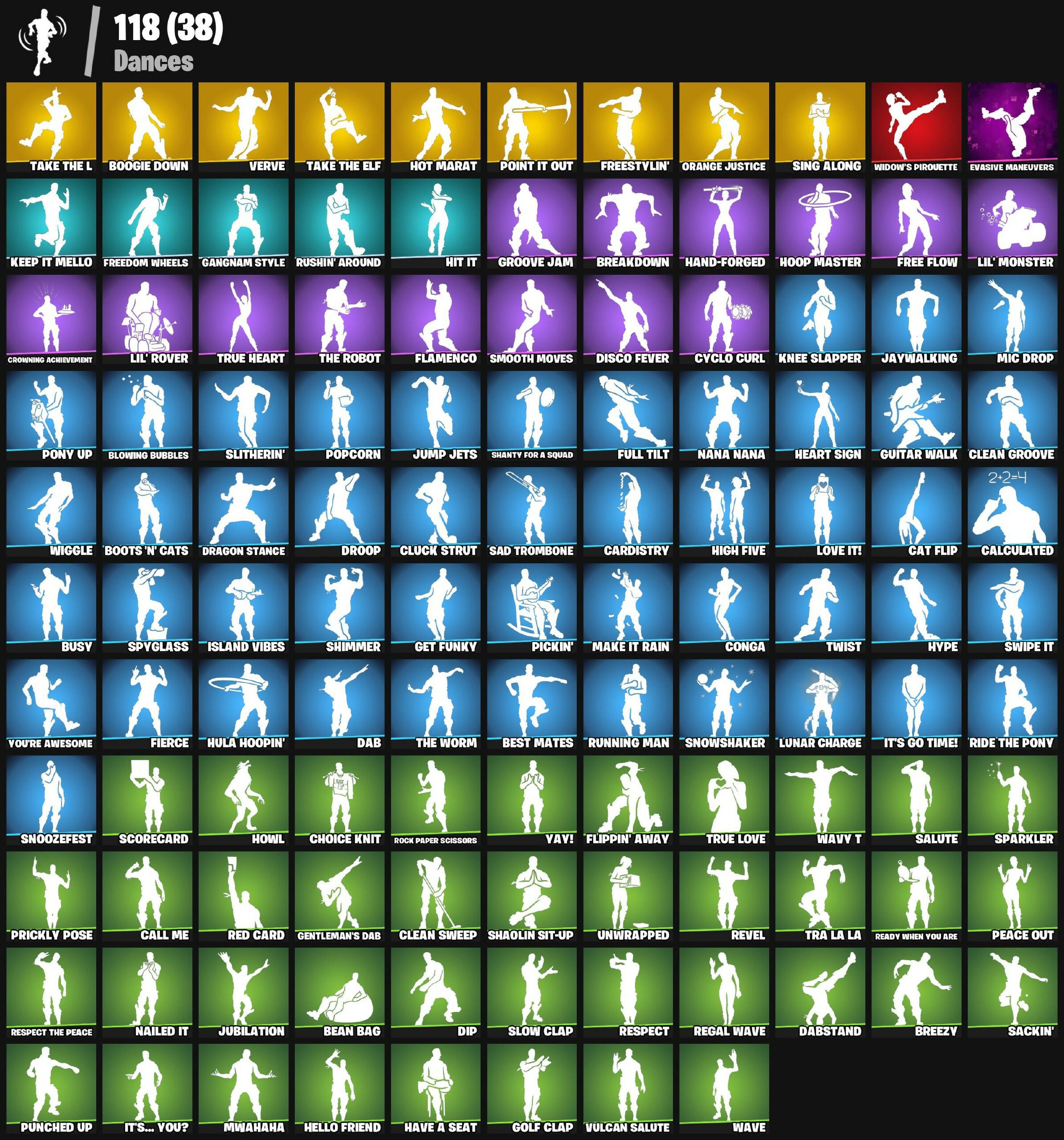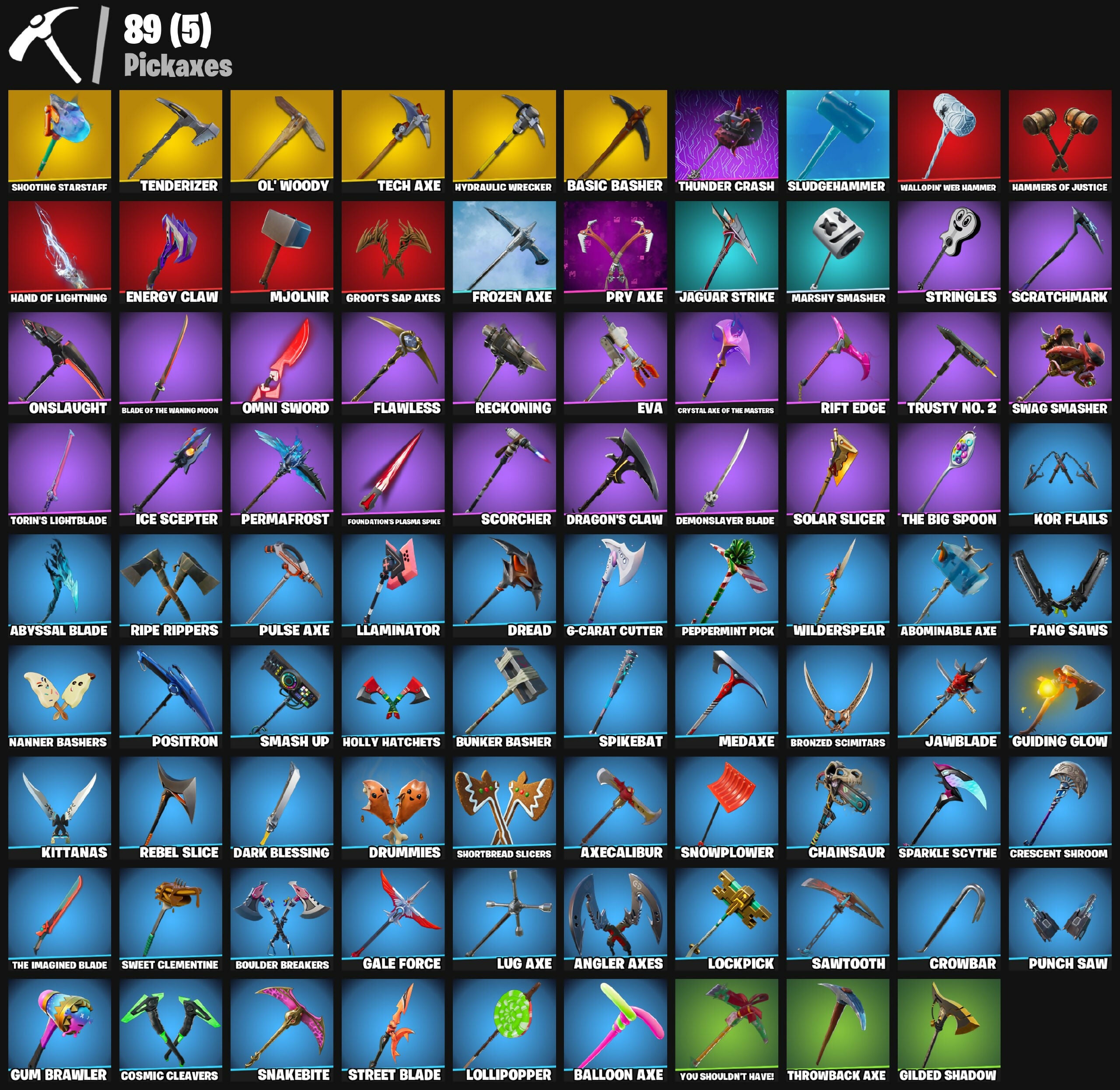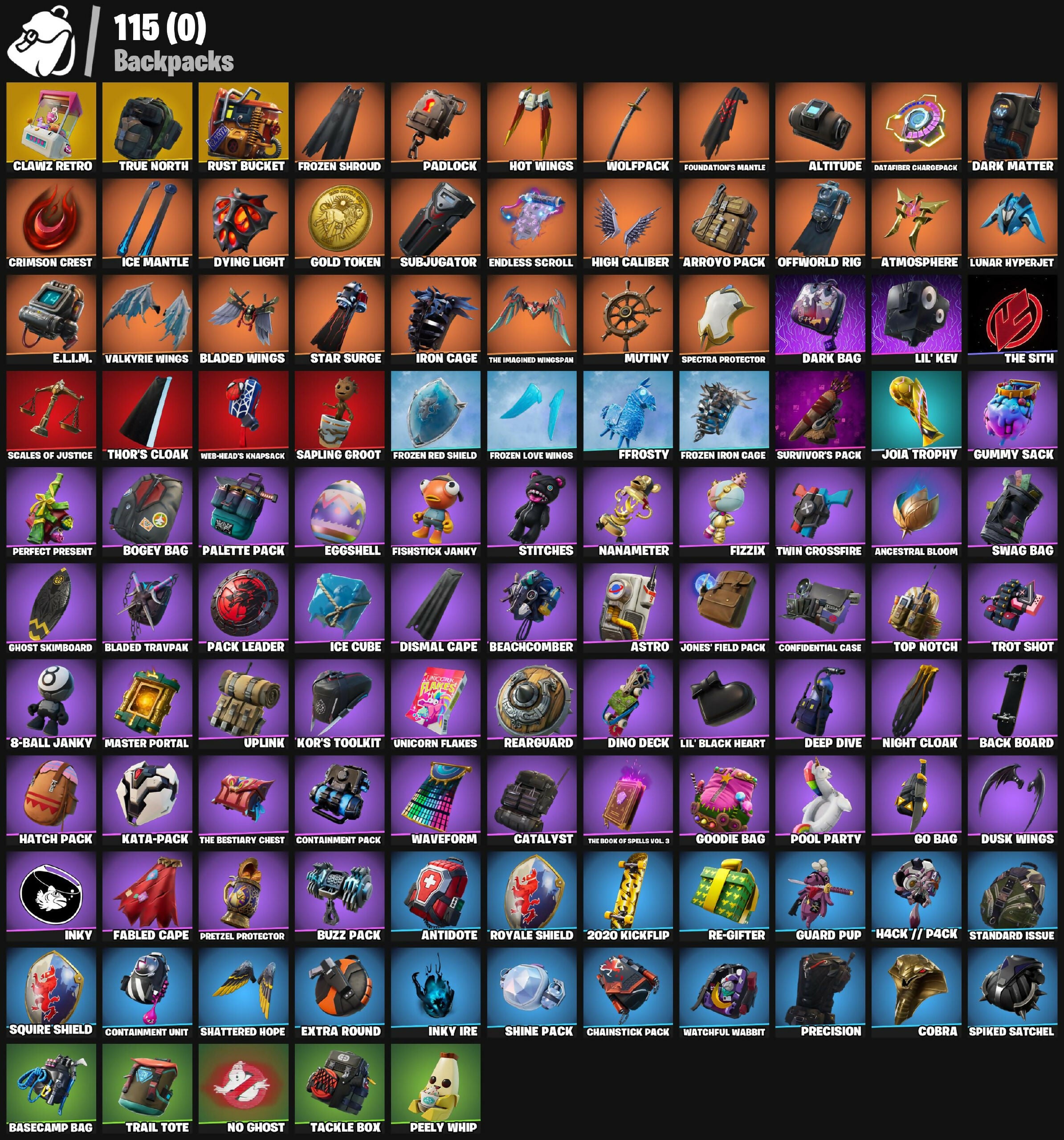 2020 Kickflip, 6-Carat Cutter, 8-Ball Janky, 8-Ball vs Scratch, A.I.M., Abominable Axe, AbseNz, Abyssal Blade, Agent Jones, Altitude, Ancestral Bloom, Angler Axes, Antidote, Arroyo Pack, Astro, Astro Jack, Astroworld Cyclone, Atmosphere, Axecalibur, Back Board, Balloon Axe, Basecamp Bag, Basic Basher, Batman, Battle Bus, Battlehawk, Beachcomber, Bean Bag, Best Mates, Blackheart, Blade Of The Waning Moon, Bladed Travpak, Bladed Wings, Blowing Bubbles, Blue Squire, Bogey Bag, Boogie Down, Boots 'N' Cats, Boulder Breakers, Branded Brawler, Breakdown, Breezy, Brite Bomber, Bronzed Scimitars, Bullseye, Bunker Basher, Bunker Jonesy, Bunny Brawler, Busy, Buzz Pack, Calamity, Calculated, Call Me, Carbide, Cardistry, Cat Flip, Catalyst, Chainsaur, Chainstick Pack, Chapter 3 Island Theme, Chapter 4 Island Theme, Chapter 5 Island Theme, Charlotte, Chigusa, Choice Knit, Clawz Retro, Clean Groove, Clean Sweep, Cluck, Cluck Strut, Cobra, Confidential Case, Conga, Containment Pack, Containment Unit, Cosmic Cleavers, Crescent Shroom, Crimson Crest, Crowbar, Crowning Achievement, Crystal Axe Of The Masters, Cuddle Hearts, Cyclo Curl, DJ Yonder, Dab, Dabstand, Dark Bag, Dark Blessing, Dark Bomber, Dark Matter, Dark Voyager, Datafiber Chargepack, Deep Dive, Demonslayer Blade, Diamond Diva, Dino Deck, Dip, Dire, Disco Fever, Dismal Cape, Dizzie, Dragon Stance, Dragon's Claw, Dread, Drift, Droop, Drummies, Dusk, Dusk Wings, Dying Light, Dynamic Dribbler, D’ark, E.L.I.M., Eggshell, Elite Agent, Ember, Endless Scroll, Energy Claw, Enforcer, Eva, Evasive Maneuvers, Extra Round, Fable, Fabled Cape, Fang Saws, Ffrosty, Fierce, Fishstick Janky, Fizzix, Flamenco, Flawless, Flip Reset, Flippin' Away, Foundation's Mantle, Foundation's Plasma Spike, Free Flow, Freedom Wheels, Freestylin', Frozen Axe, Frozen Iron Cage, Frozen Love Ranger, Frozen Love Wings, Frozen Raven, Frozen Red Knight, Frozen Red Shield, Frozen Shroud, Fryangles, Full Tilt, Gale Force, Gangnam Style, Gentleman's Dab, Get Funky, Ghost Skimboard, Giddy-Up, Gilded Shadow, Go Bag, Gold Token, Golf Clap, Goodie Bag, Grim Fable, Groot, Groots Sap Axes, Groove Jam, Guard Pup, Guiding Glow, Guitar Walk, Gum Brawler, Gumbo, Gummy Sack, Gumshoe, Gunnar, H4ck // P4ck, Hack // Pack, Hammers Of Justice, Hand Of Lightning, Hand-Forged, Harlowe, Harmonizer, Hatch Pack, Have A Seat, Haven, Heart Sign, Heartspan, Heidi, Hello Friend, High Caliber, High Five, Hit It, Holly Hatchets, Hoop Master, Hop And A Wink, Hot Marat, Hot Wings, Howl, Hula Hoopin', Huntress, Hybrid, Hydraulic Wrecker, Hype, I Am Fearless, Ice Cube, Ice Mantle, Ice Scepter, Inky, Inky Ire, Iron Cage, Isabelle, Island Vibes, It's Go Time!, It's... You?, Jack Gourdon, Jaguar Strike, Jawblade, Jawbreaker, Jaywalking, Jennifer Walters, Joia Trophy, Jones' Field Pack, Journey vs Hazard, Jubilation, Jump Jets, Kata-Pack, Keep It Mello, Kiara K.O., Kittanas, Knee Slapper, Kor, Kor Flails, Kor's Toolkit, Krisabelle, Lace, Lara Croft, Lego Fortnite Theme, Lil' Black Heart, Lil' Kev, Lil' Monster, Lil' Rover, Llaminator, Lobby Classic, Lockpick, Lollipopper, Love It!, Lt. Evergreen, Lt. John Llama, Lug Axe, Lunar Charge, Lunar Hyperjet, Luxe, Lynx, Make It Rain, Marshy Smasher, Master Key, Master Portal, Medaxe, Megumi, Mic Drop, Midnight Ops, Midsummer Midas, Mission Specialist, Mjolnir, Moonwalker, Mutiny, Mwahaha, Nailed It, Nana Nana, Nanameter, Nanner Bashers, Neymar Jr, Night Cloak, Nightshade, No Ghost, Nog Ops, Offworld Rig, Ol' Woody, Omega (Stage 5), Omni Sword, Onesie, Onslaught, Orange Justice, Pack Leader, Padlock, Palette Pack, Peace Out, Peely, Peely Whip, Peppermint Pick, Per Aspera Ad Astra, Perfect Present, Permafrost, Pickin', Plague, Point It Out, Polar Peely, Pony Up, Pool Party, Popcorn, Positron, Powder, Precision, Pretzel Protector, Prickly Pose, Prowler, Pry Axe, Pulse Axe, Punch Saw, Punched Up, Racer's Instincts, Ragnarok, Rainbow Fog, Raven, Raz, Re-Gifter, Ready When You Are, Rearguard, Rebel Slice, Reckoning, Red Card, Red-Nosed Raider, Redline, Regal Wave, Remedy vs Toxin, Respect, Respect The Peace, Revel, Ride The Pony, Rift Edge, Ripe Rippers, Rippley vs Sludge, Rock Paper Scissors, Rogue Agent, Ronin, Rook, Rox, Royale Knight, Royale Shield, Ruin, Running Man, Rushin' Around, Rust Bucket, Rust Lord, Sackin', Sad Trombone, Salute, Sapling Groot, Sawtooth, Scales of Justice, Scarlet Defender, Scorcher, Scorecard, Scratchmark, Seeker, Sentinel, Sgt. Winter, Shanta, Shanty For A Squad, Shaolin Sit-Up, Shattered Hope, Shimmer, Shine Pack, Shogun, Shooting Starstaff, Shortbread Slicers, Sidewinder, Sing Along, Sledgehammer, Slitherin', Slow Clap, Sludgehammer, Smash Up, Smooth Moves, Snakebite, Snoozefest, Snowflake, Snowplower, Snowshaker, Solar Slicer, Sparkle Scythe, Sparkler, Spectra Protector, Spider-Man, Spikebat, Spiked Satchel, Spyglass, Squad Leader, Squire Shield, Standard Issue, Star Surge, Stitches, Storm, Street Blade, Stringles, Subjugator, Summit Striker, Sun Strider, Survivor's Pack, Swag Bag, Swag Smasher, Sweet Clementine, Swipe It, Tackle Box, Take The Elf, Take The L, Tarana, Tech Axe, Teknique, Tenderizer, The Ace, The Bestiary Chest, The Big Spoon, The Book Of Spells Vol. 3, The Ice King, The Imagined, The Imagined Blade, The Imagined Wingspan, The Prisoner, The Re-OG, The Reaper, The Robot, The Sith, The Visitor, The Worm, Thor, Thor's Cloak, Throwback Axe, Thunder Crash, Tilted Teknique, Toona Fish, Top Notch, Torin, Torin's Lightblade, Tra La La, Trail Tote, Trailblazer, Triple Threat, Trog, Trot Shot, True Heart, True Love, True North, Trusty No. 2, Tsuki 2.0, Turk vs Riptide, Twin Crossfire, Twist, Unicorn Flakes, Unwrapped, Uplink, Valkyrie, Valkyrie Wings, Valor, Vega, Verve, Vulcan Salute, Vulture, Wallopin' Web Hammer, Watchful Wabbit, Wave, Waveform, Wavy T, Web-Head's Knapsack, Whiplash, Widow's Pirouette, Wiggle, Wilde, Wilderspear, Wingman, Wolfpack, Wolverine, Wooly Warrior, X-Lord, YOND3R, Yay!, You Shouldn't Have!, You're Awesome, Yuki, Z