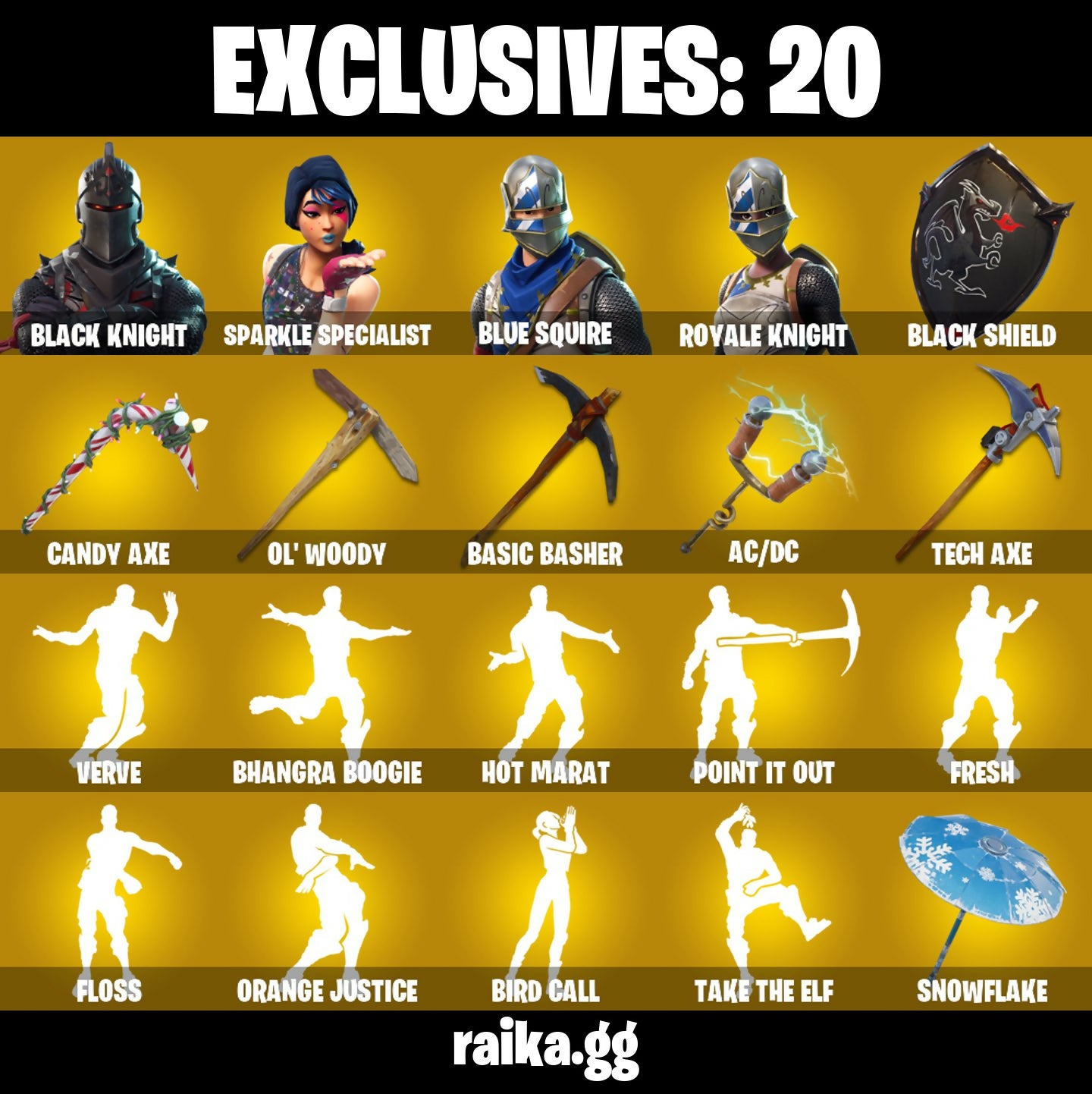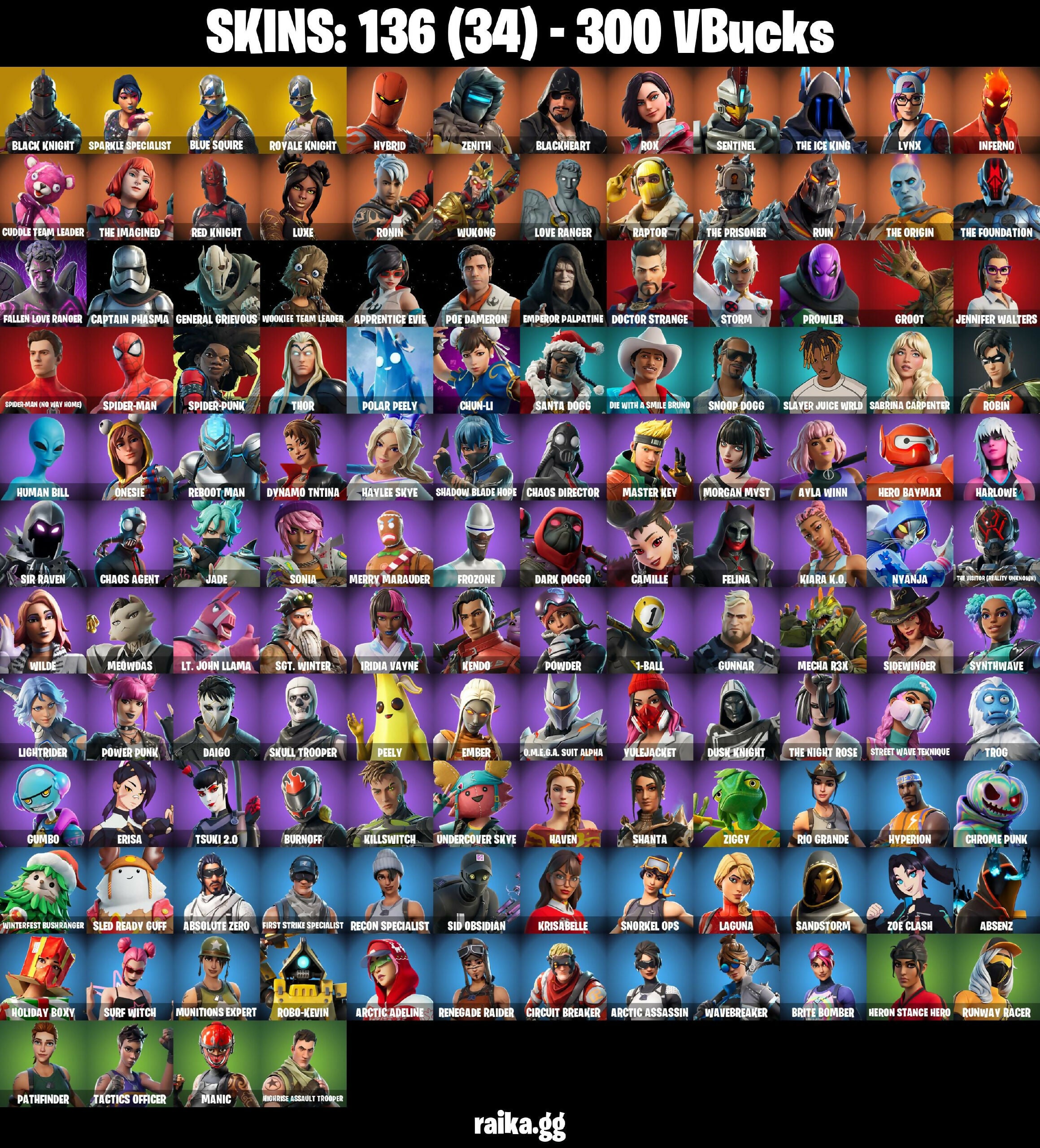 136 skins ✅ Black Knight ✅ Sparkle Specialist ✅ Blue Squire ✅ Royale Knight ✅ Renegade Raider ✅ Hybrid ✅ Zenith ✅ Blackheart ✅ Rox ✅ Sentinel ✅ 300 VB
