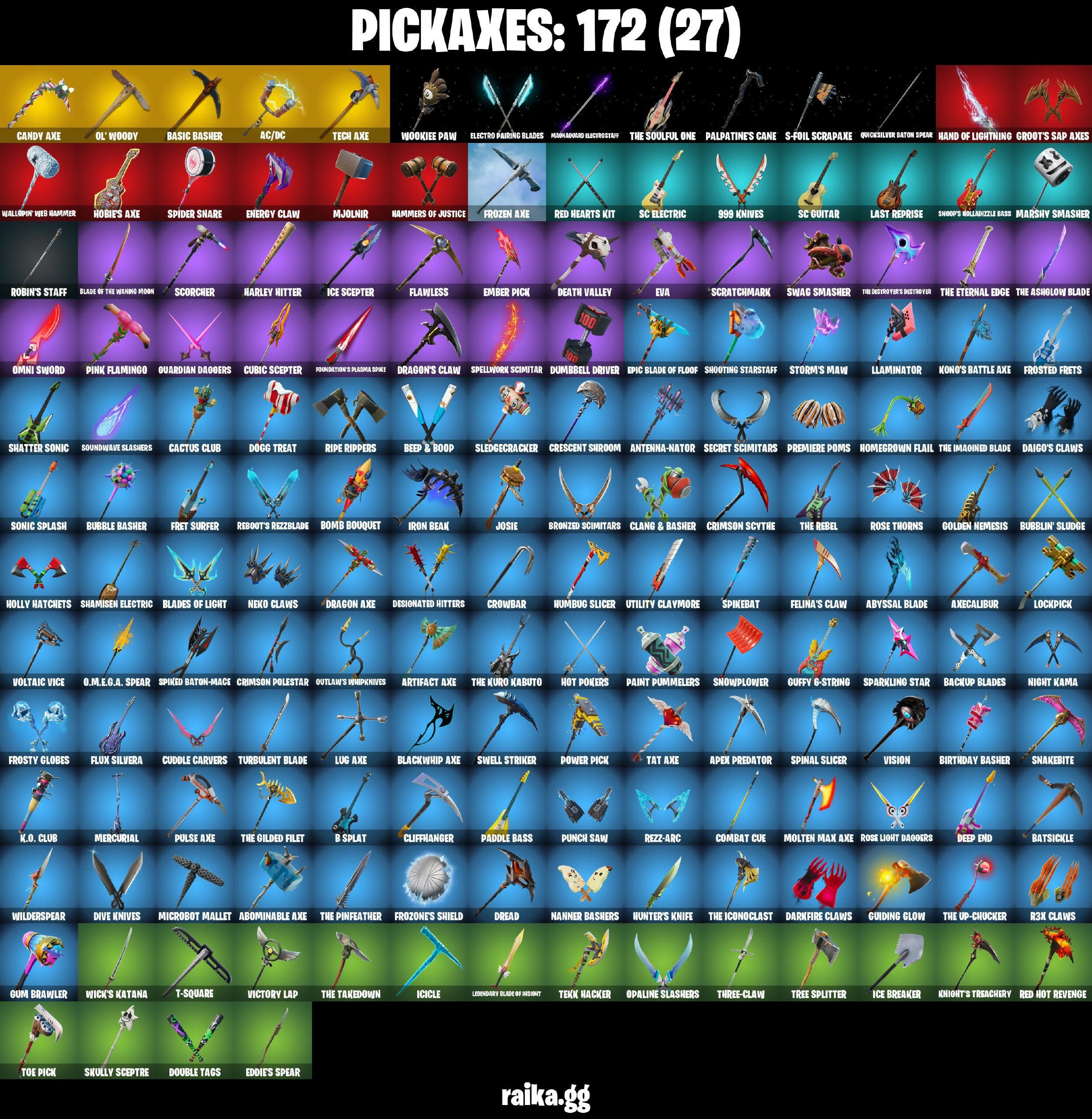 1-Ball, 999 Knives, AC/DC, Abominable Axe, Absent, Absolute Zero, Abyssal Blade, Antenna-Nator, Apex Predator, Apprentice Evie, Arcane Research, Arctic Adeline, Arctic Assassin, Artifact Axe, Aw, Shucks., Axegallibur, Ayla Winn, B Splat, Backup Blades, Baron's Hoard, Basic Basher, Batsickle, Battle Blessing, Beep & Boop, Bhangra Boogie, Bird Call, Birdarang Flourish, Birthday Basher, Black Knight, Black Shield, Blackheart, Blackwhip Axe, Blade of the Waning Moon, Blades of Light, Blue Squire, Bomb Bouquet, Bone Breaker, Boogie Down, Bow Go, Breaking Point, Brite Bomber, Bronzed Scimitars, Bubble Basher, Bubblin' Sludge, Bunny Hop, Burnoff, Cactus Club, Calculated, Call Me, Camille, Candy Axe, Captain Phasma, Cat Flip, Chaos Agent, Chaos Director, Choice Knit, Chrome Punk, Chun-Li, Circuit Breaker, Clang & Basher, Cliffhanger, Combat Cue, Conga, Conjure Weapon, Crescent Shroom, Crimson Polestar, Crimson Scythe, Crowbar, Crowning Achievement, Cubic Scepter, Cuddle Carvers, Cuddle Team Leader, Curling Iron, Cyclo Curl, Dab, Dagger Dance, Daigo, Daigo's Claws, Dark Doggo, Darkfire Claws, Death Valley, Deep End, Designated Hitters, Die With A Smile, Die With A Smile Bruno, Dive Knives, Doctor Strange, Dogg Treat, Double Tags, Doze Dab, Dragon Axe, Dragon Stance, Dragon's Claw, Dread, Dumbbell Driver, Dusk Knight, Dynamo Tntina, Eddie's Spear, Electro Pairing Blades, Electro Shuffle, Ember, Ember Pick, Emperor Palpatine, Energy Claw, Epic Blade of Floof, Erisa, Eva, Everybody Loves Me, Fallen Love Ranger, Feel The Force, Felina, Felina's Claw, Fierce, First Strike Specialist, Fist Bump, Flapper, Flawless, Flippin' Away, Floss, Flux Silvera, Foil Flex, Foundation's Plasma Spike, Free Flow, Freedom Wheels, Fresh, Fret Surfer, Frosted Frets, Frosty Globes, Frozen Axe, Frozone, Frozone's Shield, General Grievous, Gentleman's Dab, Get Funky, Get Gone, Golden Nemesis, Golf Clap, Groot, Groot's Sap Axes, Guardian Daggers, Guffy 6-String, Guiding Glow, Gum Brawler, Gumbo, Gun Show, Gunnar, Hammers of Justice, Hand of Lightning, Harley Hitter, Harlowe, Have A Seat, Haven, Haylee Skye, Heart Sign, Hello Friend, Hero Baymax, Heron Stance Hero, Highrise Assault Trooper, Hobie's Axe, Holiday Boxy, Holly Hatchets, Homegrown Flail, Hoop Master, Hot Marat, Hot Pokers, Hulk Smash!, Human Bill, Humbug Slicer, Hunter's Knife, Hybrid, Hype!, Hyperion, Hypnot-eyes, Ice Breaker, Ice Scepter, Icicle, Inferno, Invisible Cut, Iridia Vayne, Iron Beak, It's A Vibe, It's Go Time!, It's... You?, Jade, Jennifer Walters, Jet Signals, Josie, K.O. Club, Keep It Mello, Kendo, Kiara K.O., Killswitch, Knight's Treachery, Kong's Battle Axe, Krisabelle, Laguna, Last Reprise, Leafy Longboardin', Lightrider, Lil' Godzilla Attack, Lil' Monster, Lil' Prancer, Lil' Resistance Bomber, Lil' Treadspeeder, Limber Up, Llaminator, Lockpick, Love It!, Love Ranger, Lt. John Llama, Lug Axe, Lunar Charge, Luxe, Lynx, Make A Seat, Manic, Marshy Smasher, Master Key, Mecha R3X, Meowdas, Mercurial, Merry Marauder, Mic Drop, Microbot Mallet, Mini Dogfight, Mjolnir, Molten Max Axe, Morgan Myst, Munitions Expert, Mwahaha, Nana Nana, Nanner Bashers, Neko Claws, Night Kama, Ninja Stance: Leo, Nuthin But A G Thang, Nyanja, O.M.E.G.A. Diagnostic, O.M.E.G.A. Spear, O.M.E.G.A. Suit Alpha, Ol' Woody, Omni Sword, Onesie, Opaline Slashers, Orange Justice, Origami Battalion, Outlaw's Whipknives, Paddle Bass, Paint Pummeler, Palpatine's Cane, Pathfinder, Peace Out, Peely, Pink Flamingo, Poe Dameron, Point & Shoot, Point It Out, Pokey-tar, Polar Peely, Pony Up, Powder, Power Pick, Power Punk, Premiere Poms, Prowler, Pulse Axe, Punch Saw, Punk Show, Puppet Dance, Pure Salt, Purr-demonium, Quicksilver Baton Spear, R3X Claws, Raptor, Raven's Legion, Reboot Man, Reboot's Rezzblade, Recon Specialist, Red Hearts Kit, Red Hot Revenge, Red Knight, Regal Wave, Renegade Raider, Rezz-Arc, Rezzblocks, Rhythm Of Chaos, Ride The Pony, Rio Grande, Ripe Rippers, Robin, Robin's Staff, Robo-Kevin, Rock Paper Scissors, Ronin, Rose Light Daggers, Rose Thorns, Rox, Royale Knight, Ruin, Runway Racer, S-Foil Scrapaxe, SC Electric, SC Guitar, Sabrina Carpenter, Salute, Sandstorm, Santa Dogg, Scorcher, Scratchmark, Secret Scimitars, Segway Tour, Sentinel, Sgt. Winter, Shadow Blade Hope, Shadow Boxer, Shadow Spar, Shamisen Electric, Shamisen-sational, Shanta, Shatter Sonic, Shimmer, Shooting Starstaff, Show 'Em Off, Sid Obsidian, Sidewinder, Sing Along, Sir Raven, Skatemonster, Skull Trooper, Skully Sceptre, Slayer Juice Wrld, Sled Ready Guff, Sledgecracker, Slow Clap, Snakebite, Snikt! Snikt!, Snoop Dogg, Snoop's Holladizze Bass, Snoop's Walk, Snoozefest, Snorkel Ops, Snowflake, Snowplower, So Square, Sonia, Sonic Splash, Soundwave Slashers, Sparkle Specialist, Sparkling Star, Spellwork Scimitar, Spider Snare, Spider-Man, Spider-Man (No Way Home), Spider-Punk, Spikebat, Spiked Baton-Mace, Spinal Slicer, Spirit Strider, Storm, Storm's Maw, Street Wave Teknique, Surf Witch, Swag Smasher, Sweet!, Swell Striker, Synthwave, T-Square, Tactics Officer, Tagger's Groove, Take On Me, Take The Elf, Targeted Focus, Tat Axe, Tech Axe, Tekk Hacker, The Ashglow Blade, The Break, The Break Shot, The Destroyer's Destroyer, The Eternal Edge, The Foundation, The Gilded Filet, The Ice King, The Iconoclast, The Imagined, The Imagined Blade, The Kuro Kabuto, The Night Rose, The Origin, The Pinfeather, The Prisoner, The Rebel, The Soulful One, The Takedown, The Up-Chucker, The Visitor (Reality Unknown), The Worm, Thor, Three-Claw, Tip Jar, Toe Pick, Tree Splitter, Trog, True Love, Tsuki 2.0, Turbulent Blade, Undercover Skye, Utility Claymore, Verve, Victory Lap, Vision, Visitor's Reflexes, Voltaic Vice, Vulejacket, Wakandan Salute, Wallopin' Web Hammer, Wave, Wavebreaker, Wick's Katana, Wilde, Wilderspear, Winterfest Bushranger, Wookiee Paw, Wookiee Team Leader, Wukong, Yarn Ball, Yay!, Zenith, Ziggy, Zoe Clash, ¡Que No Panda El Chonco!