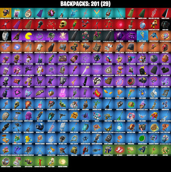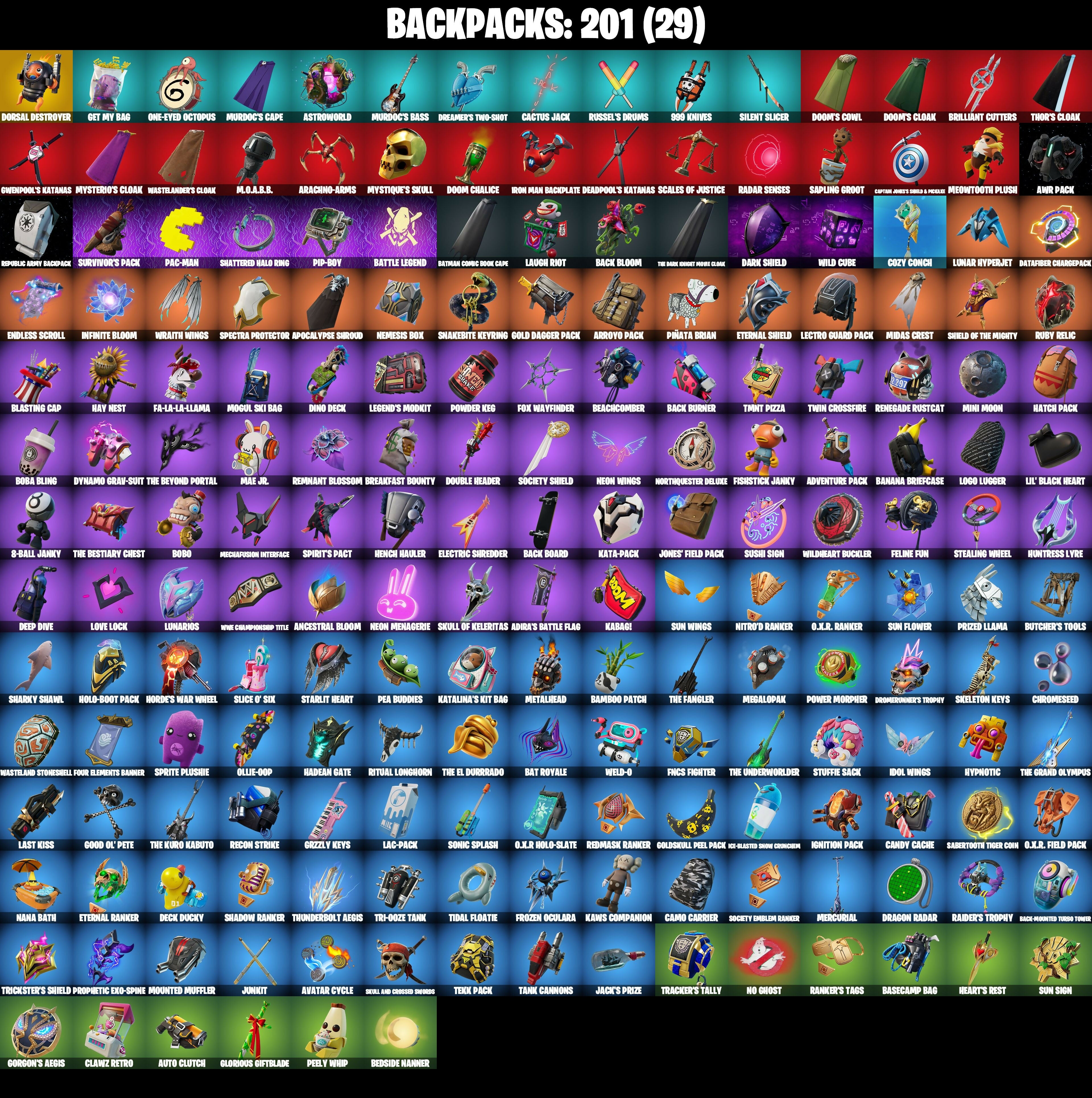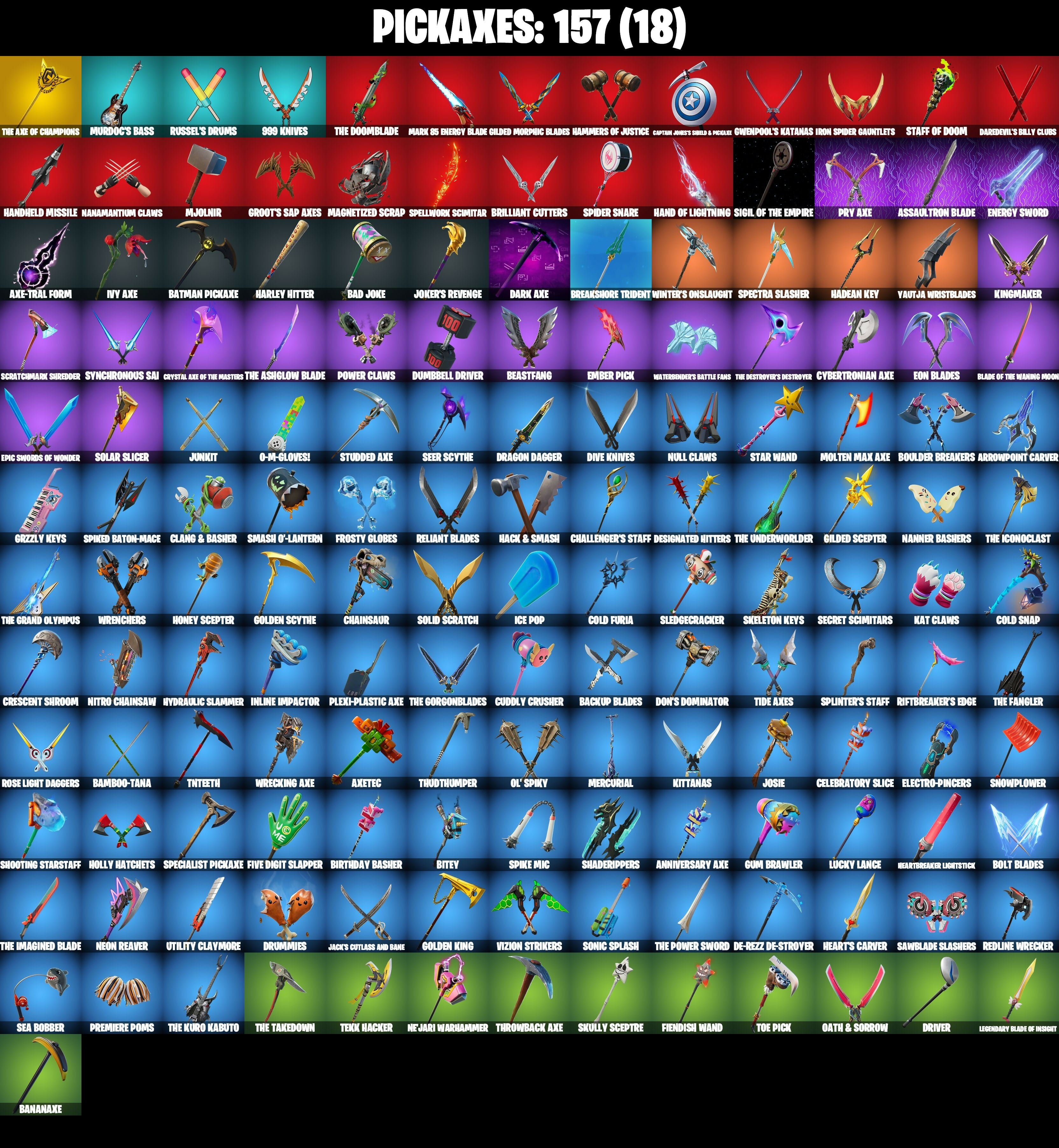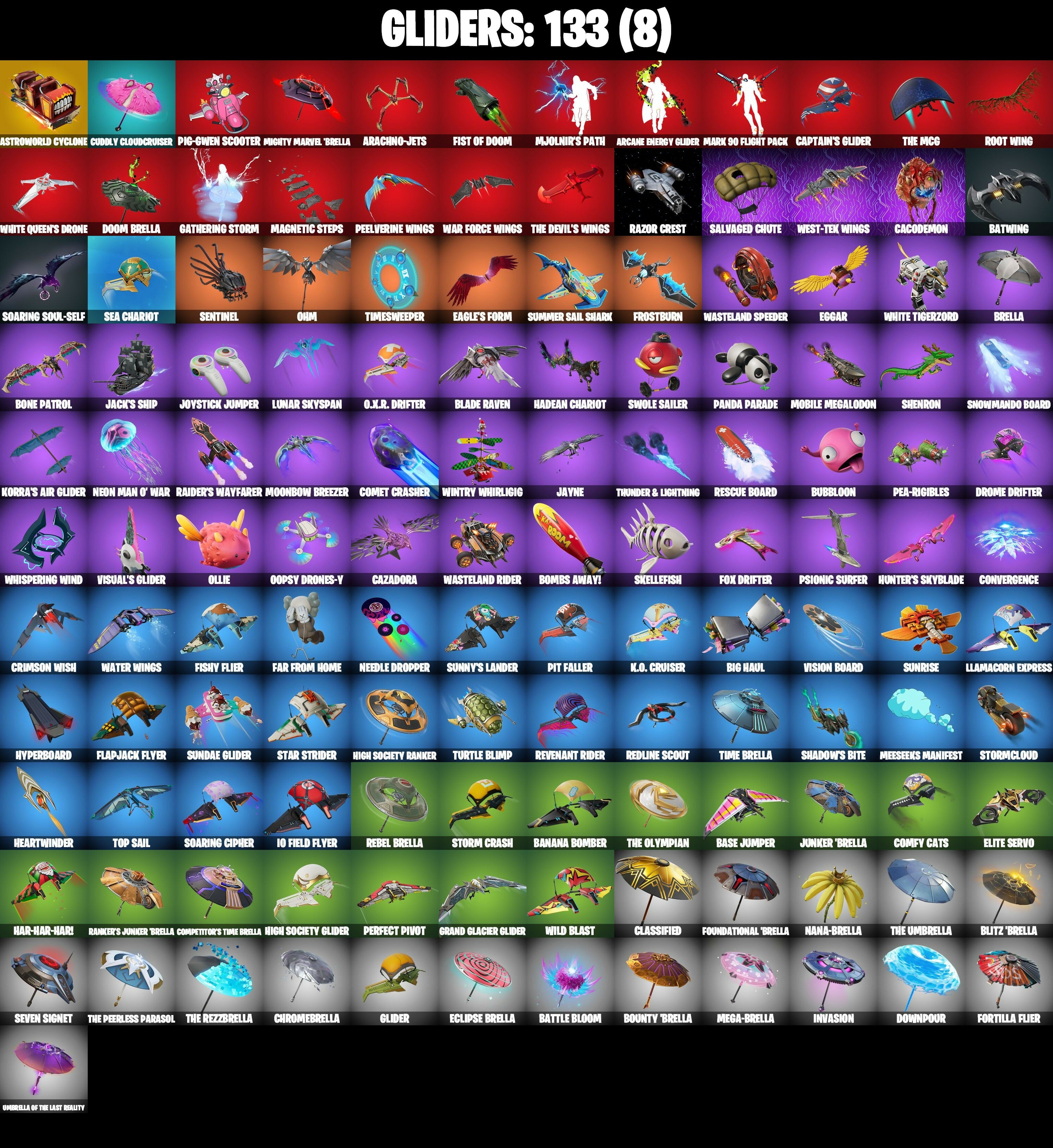 (Snikt!), 10 Field Flyer, 8-Ball Janky, 999 Knives, Adira's Battle Flag, Adventure Pack, Agent Jones, Agent Jones (Agent Jones Jones Jones 3.0), Agent Patch, Agent Peely, Air Shredder, Ancestral Bloom, Anniversary Axe, Aphrodite, Apocalypse Shroud, Arachno-Arms, Arachno-Jets, Arcane Energy Glider, Arctic Adeline, Arrowpoint Carver, Arroyo Pack, Artemis, Ask Me, Assaultron Blade, Astro Jack, Astroworld, Astroworld Cyclone, Augury, Aura, Auto Clutch, Autograph, Please!, Avatar Cycle, Avatar's Flourish, Awr Pack, Axe-tral Form, Axetec, Back Bloom, Back Board, Back Burner, Back-Whounted Turbo Tower, Backup Blades, Bad Joke, Bamboo Patch, Bamboo-Tana, Banana Bomber, Banana Briefcase, Bananaxe, Base Jumper, Basecamp Bag, Bat Royale, Batman Comic Book Cape, Batman Comic Book Outfit, Batman Pickaxe, Battle Bloom, Battle Gamer Mae, Battle Legend, Batwing, Beachcomber, Bean Bag, Beastfang, Beavis, Bedside Nanner, Beep Beep, Big Haul, Bike To Go, Birthday Basher, Bitey, Blade Raven, Blade of the Waning Moon, Blasting Cap, Blitz 'Brella, Boba Bling, Bobo, Bold Stance, Bolt Blades, Bombs Away!, Bone Patrol, Bonehead, Boneless, Boogie Down, Boomin', Boosting Ki, Boots 'N' Cats, Boulder Breakers, Bounty 'Brella, Breakfast Bounty, Breakshore Trident, Brella, Brilliant Cutters, Brite Moves, Brite Raider, Brutus (Fully Golden), Bubbloon, Burpee, Butcher's Tools, Buzz Beat, Cacodemon, Cactus Jack, Call Me, Camo Carrier, Candy Cache, Captain America's Shield & Pickle, Captain Amric's Shield & Pickle, Captain Clamerica, Captain Jones, Captain's Glider, Cardistry, Cauldron Chill, Cazadora, Celebratory Slice, Cerberus, Chainsaw, Challenger's Staff, Chaos Director, Choice Knit, Chrome Punk, Chromebrella, Chromeseed, Clang & Basher, Classified, Clawz Retro, Clean Sweep, Click!, Cluck, Cluck (Cluck (Slurpy)), Codsworth's Cleanup, Coin Flip, Cold Furia, Cold Snap, Comet Crasher, Comfy Cats, Competitor's Time Brella, Concha Call, Contract Giller, Convergence, Count It!, Cozy Chomps, Cozy Conch, Crescent Shroom, Crimson Wish, Crowning Achievement, Crystal Axe of the Masters, Cuddly Cloudcruiser, Cuddly Crusher, Curling Iron, Cybertronian Axe, Cyclo Curl, Dagger Dance, Dali, Danica, Daredevil, Daredevil's Billy Clubs, Dark Axe, Dark Jonesy, Dark Red Knight, Dark Shield, Dark Wild Card, Datafiber Chargepack, De-Rizz De-Stroyer, Deadpool, Deadpool (Mask Off), Deadpool's Katanas, Deck Ducky, Deep Dive, Designated Hitters, Desirable, Dino Deck, Disassemble, Dive Knives, Do The 'Split, Doctor Doom, Don's Dominator, Doom, Doom (Pandora’s Ashmode Doom), Doom Brella, Doom Chalice, Doom's Cloak, Doom's Cowl, Doom's Domain, Dorsal Destroyer, Double Header, Downpour, Doze Dab, Dragon Dagger, Dragon Dagger's Song, Dragon Radar, Dreamer's Two-Shot, Driver, Drome Drifter, Dromerunner's Trophy, Drummies, Dumbbell Driver, Dynamo Grav-Suit, Eagle's Form, Eclipse Brella, Eggar, Electric Shredder, Electro-Pincers, Elite Servo, Ember Pick, Emma Frost, Endless Scroll, Energy Sword, Eon Blades, Epic Swords of Wonder, Eternal Knight, Eternal Ranker, Eternal Shield, Evasive Maneuvers, Everybody Loves Me, Evil Plan, Fa-La-La-Llama, Face Palm, Fade, Fade (Masked Fade), Far From Home, Feline Fun, Fiendish Wand, Fire Show, Fireworks Team Leader, Fishstick Janky, Fishy Flier, Fist Of Doom, Five Digit Slapper, Flapjack Flyer, Flashback Breakdown, Flippin' Away, Fngs Fighter, Foil Flex, For O.X.R!, Fortilla Flier, Foundational 'Brella, Four Elements Banner, Fox Drifter, Fox Wayfinder, Frostburn, Frosty Globes, Frozen Oculara, Gangnam Style, Gathering Storm, Gear Specialist Maya, General's War Table, Get Griddy, Get My Bag, Gilded Morphic Blades, Gilded Scepter, Glider, Glorious Giftblade, Go Mufasa, Gold Dagger Pack, Golden King, Golden Scythe, Goldsoul Peel Pack, Good Ol' Pete, Good Sportsmanship, Gorgon's Aegis, Grand Glacier Glider, Green Ranger, Green Ranger (White Ranger), Grizzly Keys, Groot, Groot's Sap Axes, Gum Brawler, Gurrisey, Gwen-Step, Gwenpool, Gwenpool's Katanas, Hack & Smash, Hadean Chariot, Hadean Gate, Hadean Key, Hades, Hammers of Justice, Hana, Hana Park, Hand of Lightning, Handheld Missile, Har-Har-Har!, Harley Hitter, Hatch Pack, Hay Man, Hay Nest, Head Banger, Heart's Carver, Heart's Rest, Heartbreaker Lightstick, Heartwinder, Hellfire Dance, Hench Hauler, High Society Glider, High Society Ranker, Hit It, Holiday Boxy, Holly Hatchets, Holo-Boot Pack, Honey Scepter, Horde's War Wheel, Howl, Hunter's Skyblade, Huntress Lyre, Hydraulic Slammer, Hyperboard, Hypnot-Eyes, Hypnotic, I Declare!, I'm The Visual, Ice Pop, Ice-Blasted Snow Cowqueen, Idol Wings, Ignition Pack, Imperial March, Infinite Bloom, Inline Impactor, Invasion, Iron Man Backplate, Iron Spider, Iron Spider Gauntlets, It Is Finished, It's... You?, Ivy Axe, Jack's Cutlass and Dagger, Jack's Prize, Jack's Ship, Jayne, Jennifer Walters, John Cena, Joker's Revenge, Joltara, Jones' Field Pack, Josie, Joystick Jumper, Jules, Junker 'Brella, Junkit, K.O. Cruiser, Kabagi, Kat Claws, Kata-Pack, Katalina, Katalina's Kit Bag, Kaws Companion, Kawspeely, Keyed Up, Kingmaker, Kit, Kittanas, Kondor, Korra, Korra (Balanced), Korra's Air Glider, Krisabelle, Lac-Pack, Lara Croft, Last Kiss, Laugh It Up, Laugh Riot, Lectro Guard Pack, Legend's Modkit, Legendary Blade of Insight, Lexa, Lil Split, Lil Split (The Breaker Lil Split), Lil' Black Heart, Lil' Bounce, Lil' Ducky Train, Lil' Ghost, Lil' Longboat, Lil' Prancer, Lllamacorn Express, Logo Logger, Love It!, Love Lock, Lt. Ripp Slade, Lucky Lance, Lunar Hyperjet, Lunar Skyspan, Lunarios, M.O.A.B.B., Mae Jr., Magnetic Steps, Magnetized Scrap, Make A Seat, Mandalorian, Mangcake, Mark 85 Energy Blade, Mark 90 Flight Pack, Marked Marauder, Marshmello, Mashed Potato, Master Chief (Matt Black), Mave, Mecharusion Interface, Medusa, Meeseeks Manifest, Mega-Brella, Megalo Don, Megalo Don (Extra Rogue Megalo Don), Megalopax, Menace, Meowscles, Meowtooth Plush, Mercurial, Metalhead, Mezmier, Microflip, Midas (Fully Golden), Midas Crest, Mi
