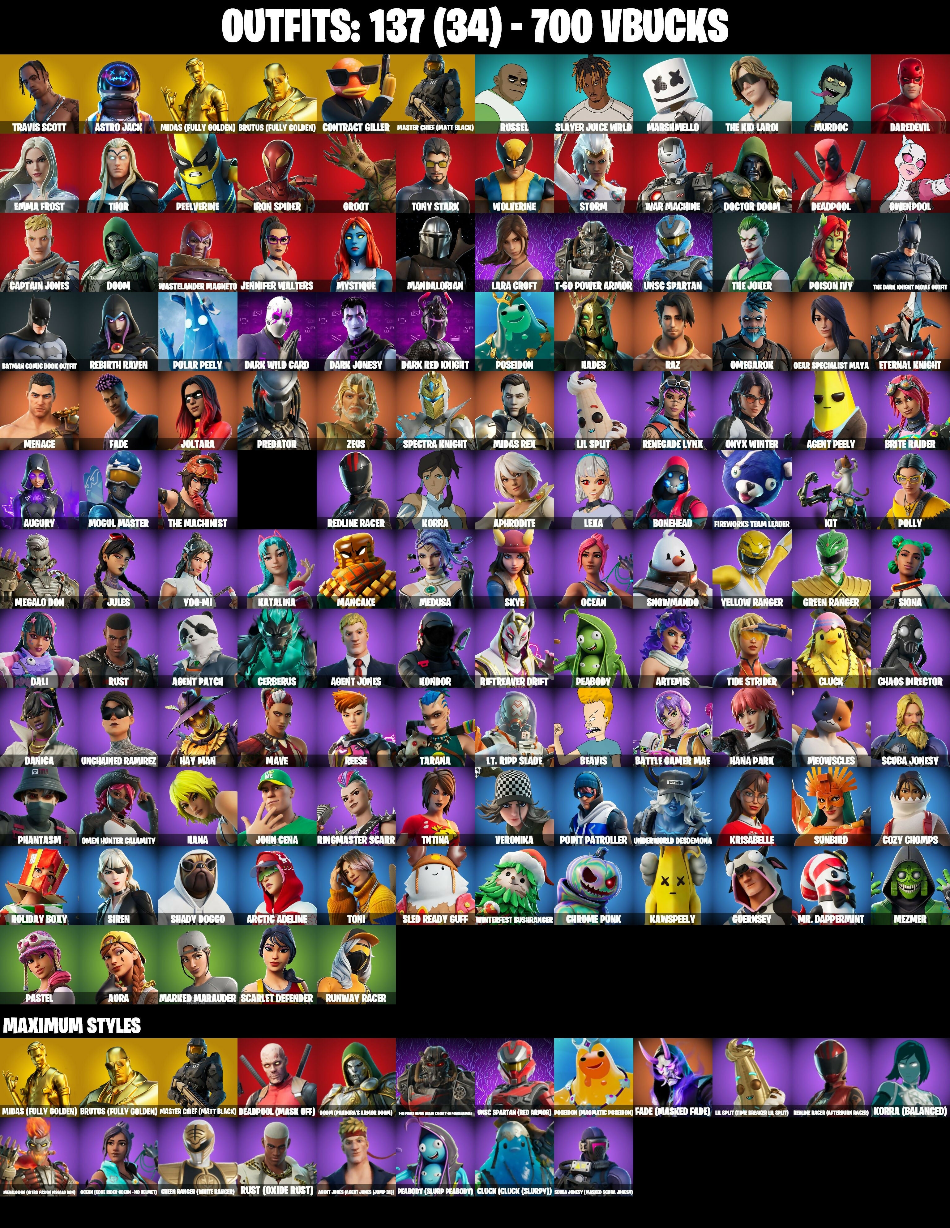 137 Skins | Travis Scott , Master Chief (Matt Black) , Astro Jack , Go Mufasa | 700 VBucks | [PC/PSN/XBOX/NINTENDO]