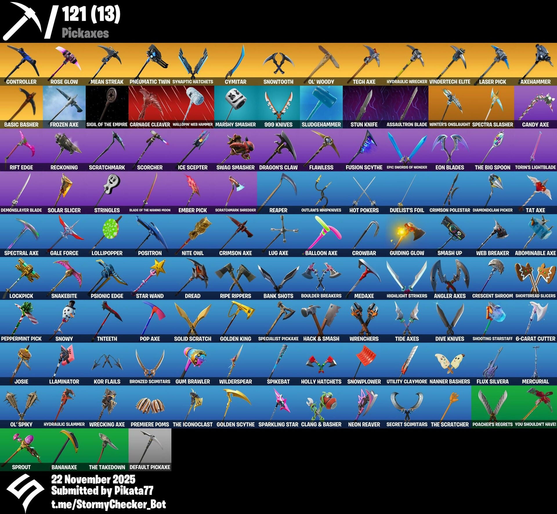 6-Carat Cutter, 8-Ball Vs Scratch, 999 Knives, A.I.M., Abominable Axe, Agent Peely, Air Horn, Air Shredder, Angler Axes, Assaultron Blade, Axehammer, Balloon Axe, Bananaxe, Bank Shots, Baron's Hoard, Basic Basher, Battlehawk, Beep Beep, Behold!, Blackheart, Blade of the Waning Moon, Blue Striker, Blue Team Leader, Boing!, Boogie Down, Boulder Breakers, Brainiac, Bronzed Scimitars, Brutus, Bullseye, Bunker Jonesy, Calamity, Calculated, Call Me, Cameo Vs Chic, Candy Axe, Carbide, Carbon Commando, Card Drop, Carnage, Carnage Cleaver, Cat Flip, Champion Sparkplug, Charlotte, Choice Knit, Clang & Basher, Clean Sweep, Cloud Striker, Cobalt, Codename E.L.F., Codsworths Cleanup, Coin Flip, Conga, Controller, Crackshot, Crescent Shroom, Crimson Axe, Crimson Polestar, Crowbar, Crowning Achievement, Cyclo Curl, Cymitar, DJ Yonder, Dance Moves, Deadpool, Default Pickaxe, Demonslayer Blade, Diamond Diva, Diamond Throne, Diamondclaw Picker, Dire, Dive Knives, Do The 'Split, Doze Dab, Dragon Stance, Dragon's Claw, Dread, Drift, Droop, Drum Major, Duelist's Foil, Dusk, Electro Shuffle, Electro Swing, Ember, Ember Pick, Eon Blades, Epic Swords of Wonder, Explorer Emilie, Fabio Sparklmane, Fable, Fade, Fierce, Fire Show, Flamenco, Flashback Breakdown, Flawless, Flippin' Away, Flippin' Sexy, Flux Silvera, Foil Flex, Free Flow, Frozen Axe, Frozen Fishstick, Frozen Nog Ops, Fusion, Fusion Scythe, Gale Force, Gear Specialist Maya, Gentleman's Dab, Get Funky, Get Griddy, Giddy-Up, Golden King, Golden Scythe, Golf Clap, Guiding Glow, Gum Brawler, Gumbo, Gun Show, Hack & Smash, Hana, Hand-Forged, Hang On, Harlowe, Haven, Heart Sign, Hello Friend, High Five, Highlight Strikers, Holiday Boxy, Holly Hatchets, Hoop Master, Hope, Hot Marat, Hot Pokers, Hula Hoopin', Huntress, Hybrid, Hydraulic Slammer, Hydraulic Wrecker, Hype, I Declare!, I'm A Mystery, Ice Scepter, Imperial March, Introducing..., Iris, It Is Finished, It's Go Time!, It's... You?, J.B. Chimpanski, Josie, Journey Vs Hazard, Jubilation, Jules, Karve, Keep It Mello, Keyed Up, Kit, Knife Sharpener, Kor, Kor Flails, Krisabelle, Laguna, Laser Pick, Laugh It Up, Lil Split, Lil' Longboat, Lil' Monster, Lil' Rover, Llaminator, Lock It Up, Lockpick, Lollipopper, Love It!, Lt. Evergreen, Lt. John Llama, Lug Axe, Lunar Charge, Luxe, Lynx, Make A Seat, Marshmello, Marshy Smasher, Master Key, Mean Streak, Medaxe, Meowscles, Mercurial, Mic Drop, Midas, Montague, Mr. Dappermint, Mwahaha, Nailed It, Nalia, Nana Nana, Nanner Bashers, Neon Reaver, Nightlife, Nightshade, Nisha, Nite Owl, Nog Ops, Ocean, Ol' Spiky, Ol' Woody, Omegarok, Onesie, Orange Justice, Oscar, Outlaw's Whipknives, Pandemonium, Party Hips, Pastel, Pathfinder, Paws & Claws, Pea Part Harmony, Peabody, Peace Out, Peely, Peppermint Pick, Peter Griffin, Phantasm, Pneumatic Twin, Poacher's Regrets, Point It Out, Point Patroller, Poised Playmaker, Polar Peely, Pop Axe, Popcorn, Positron, Powder, Premiere Poms, Prickly Pose, Prodigy, Psionic Edge, Ready When You Are, Reaper, Reckoning, Recon Ranger, Redline, Regal Wave, Remedy Vs Toxin, Renegade Lynx, Respect, Respect The Peace, Ride The Pony, Rift Edge, Ringmaster Scarr, Ripe Rippers, Rippley Vs Sludge, Ronin, Rose Glow, Rose Team Leader, Rox, Ruin, Running Man, Runway Racer, Rust, Savage, Scorcher, Scratchmark, Scratchmark Shredder, Scuba Jonesy, Secret Scimitars, Sentinel, Sgt. Winter, Shanta, Shaolin Sit-Up, Sharpshooter, Shimmer, Shooting Starstaff, Shortbread Slicers, Show 'Em Off, Side Hustle, Sidewinder, Sigil of the Empire, Sing Along, Siren, Skye, Slayer Juice Wrld, Slitherin', Sludgehammer, Smash Up, Snakebite, Snoozefest, Snowplower, Snowshaker, Snowtooth, Snowy, So Square, Solar Slicer, Solid Scratch, Solid Snake, Sparkling Star, Specialist Pickaxe, Spectra Knight, Spectra Slasher, Spectral Axe, Spider-Man, Spikebat, Springy, Sprout, Squad Leader, Square Up, Stand Surfer, Star Wand, Stringles, Stun Knife, Sultura, Summit Striker, Sun Strider, Surf Witch, Surfin' Bird, Swag Smasher, Switchstep, Synaptic Hatchets, T-60 Power Armor, Take A 'Bow, Take The Elf, Tat Axe, Tech Axe, Teknique, The Ace, The Big Spoon, The Break Shot, The Cube Queen, The Devourer, The Dip, The Ice King, The Iconoclast, The Machinist, The Prisoner, The Scratcher, The Takedown, Tide Axes, Tippy Tap, Tnteeth, Tntina, Toona Fish, Torin, Torin's Lightblade, Tra La La, Trilogy, Triple Threat, Trog, True Love, Turk Vs Riptide, Utility Claymore, Valeria, Valor, Vengeance Jones, Verve, Vindertech Elite, Wallopin' Web Hammer, Warpaint, Wasteland Rock, Waterworks, Wavy T, Waypoint, Web Breaker, Wilderspear, Wingman, Winter's Onslaught, Winterfest Bushranger, Wooly Warrior, Wrecking Axe, Wrenchers, Yay!, You Shouldn't Have!, You're Awesome, Zenith, Zoey