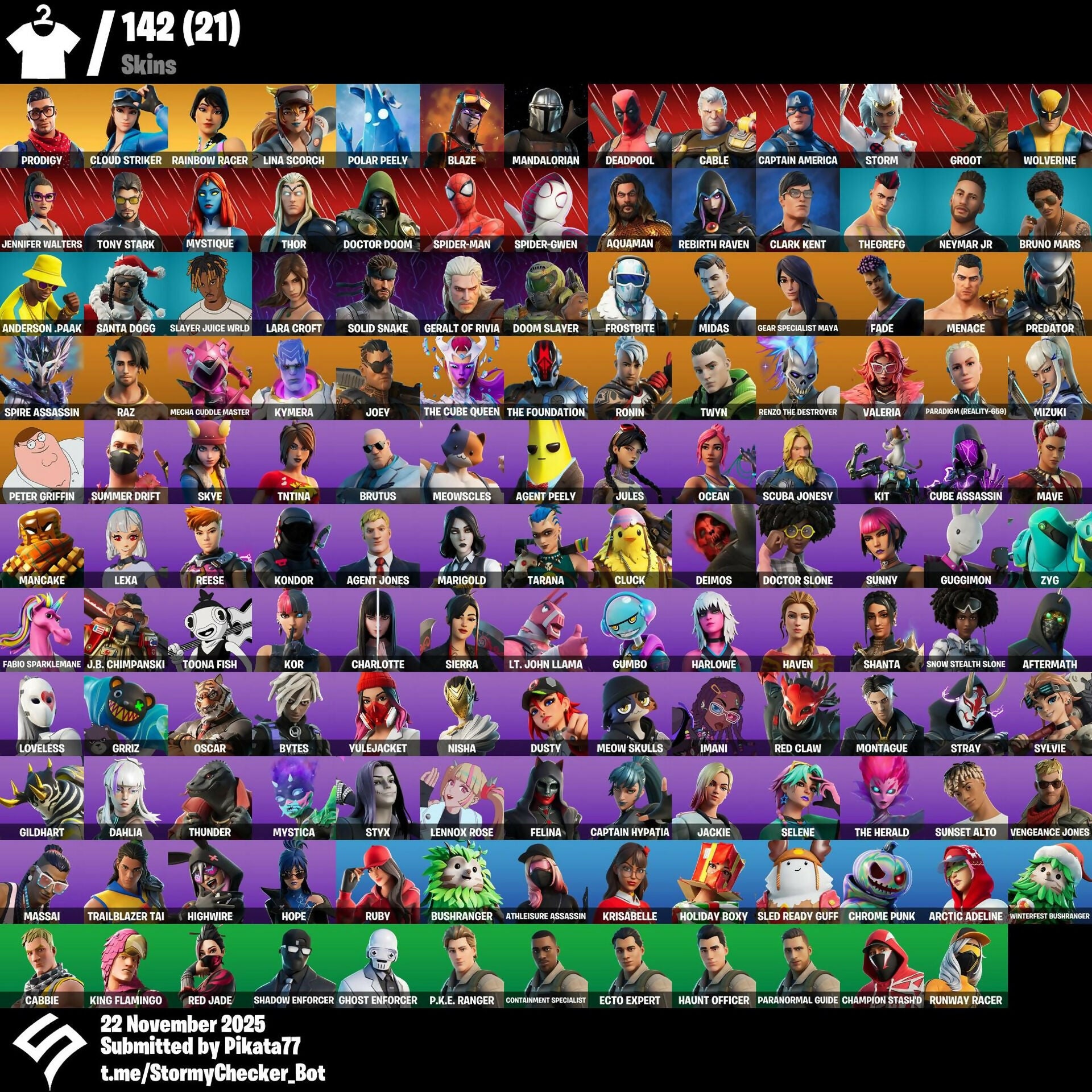 142 Skins | Lina Scorch | Prodigy | Cloud Striker | Rainbow Racer | Solid Snake | Drive Shaft | Ol' Woody | Basic Basher | 50 VB