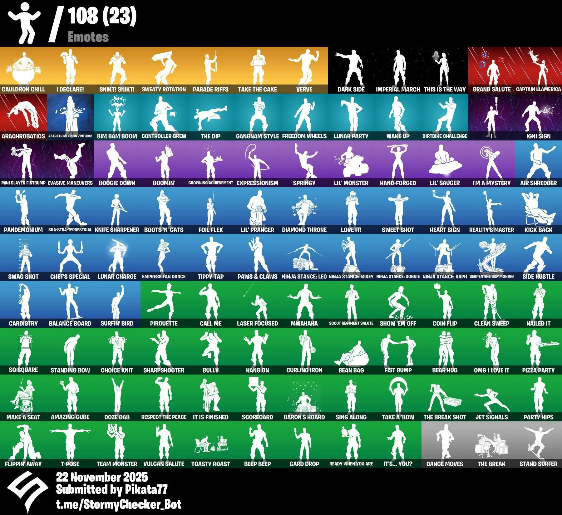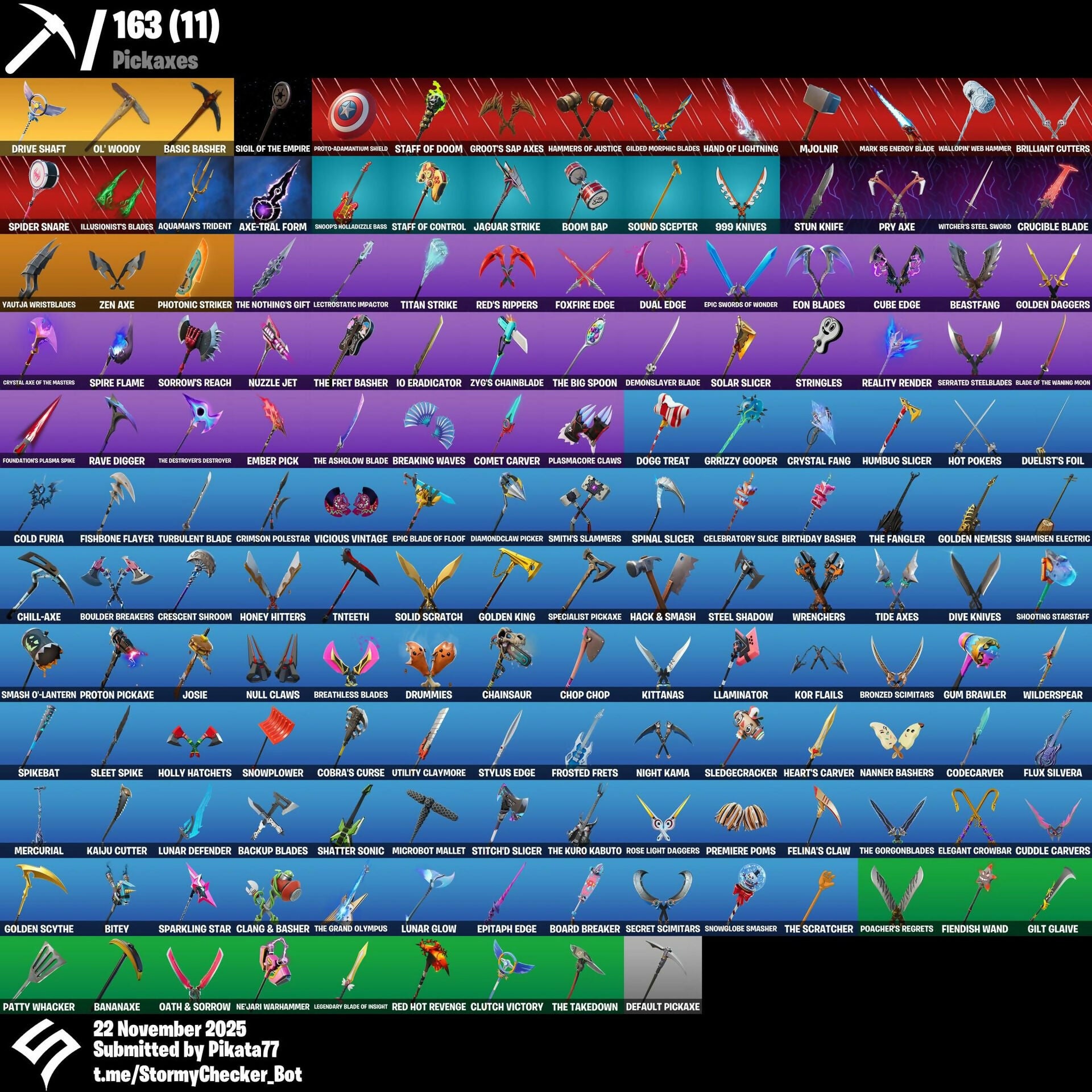 999 Knives, Aftermath, Agent Jones, Agent Peely, Air Shredder, Amazing Cube, Anderson .Paak, Aquaman, Aquaman's Trident, Arachrobatics, Arctic Adeline, Athleisure Assassin, Axe-Tral Form, Azarath Metrion Zinthos!, Backup Blades, Balance Board, Bananaxe, Baron's Hoard, Basic Basher, Bean Bag, Bear Hug, Beastfang, Beep Beep, Bim Bam Boom, Birthday Basher, Bitey, Blade of the Waning Moon, Blaze, Board Breaker, Boogie Down, Boom Bap, Boomin', Boots 'n' Cats, Boulder Breakers, Breaking Waves, Breathless Blades, Brilliant Cutters, Bronzed Scimitars, Bruno Mars, Brutus, Bully, Bushranger, Bytes, Cabbie, Cable, Call Me, Captain America, Captain Hypatia, Captain Llamerica, Card Drop, Cardistry, Cauldron Chill, Celebratory Slice, Chainsaur, Champion Stash'd, Charlotte, Chef's Special, Chill-Axe, Choice Knit, Chop Chop, Chrome Punk, Clang & Basher, Clark Kent, Clean Sweep, Cloud Striker, Cluck, Clutch Victory, Cobra's Curse, Codecarver, Coin Flip, Cold Furia, Comet Carver, Containment Specialist, Controller Crew, Crescent Shroom, Crimson Polestar, Crucible Blade, Crystal Axe of the Masters, Crystal Fang, Cube Assassin, Cube Edge, Cuddle Carvers, Curling Iron, Dahlia, Dance Moves, Dark Side, Deadpool, Default Pickaxe, Deimos, Demonslayer Blade, Diamond Throne, Diamondclaw Picker, Dirtbike Challenge, Dive Knives, Doctor Doom, Doctor Slone, Dogg Treat, Doom Slayer, Doze Dab, Drive Shaft, Drummies, Dual Edge, Duelist's Foil, Dusty, Ecto Expert, Elegant Crowbar, Ember Pick, Empress Fan Dance, Eon Blades, Epic Blade of Floof, Epic Swords of Wonder, Epitaph Edge, Evasive Maneuvers, Expressionism, Fabio Sparklemane, Fade, Felina, Felina's Claw, Fiendish Wand, Fishbone Flayer, Fist Bump, Flippin' Away, Flux Silvera, Foil Flex, Foundation's Plasma Spike, Foxfire Edge, Freedom Wheels, Frostbite, Frosted Frets, Gangnam Style, Gear Specialist Maya, Geralt Of Rivia, Ghost Enforcer, Gilded Morphic Blades, Gildhart, Gilt Glaive, Golden Daggers, Golden King, Golden Nemesis, Golden Scythe, Grand Salute, Groot, Groot's Sap Axes, Growning Achievement, Grriz, Grrizzy Gooper, Guggimon, Gum Brawler, Gumbo, Hack & Smash, Hammers of Justice, Hand of Lightning, Hand-Forged, Hang On, Harlowe, Haunt Officer, Haven, Heart Sign, Heart's Carver, Highwire, Holiday Boxy, Holly Hatchets, Honey Hitters, Hope, Hot Pokers, Humbug Slicer, I Declare!, I'm A Mystery, IO Eradicator, Igni Sign, Illusionist's Blades, Imani, Imperial March, It Is Finished, It's... You?, J.B. Chimpanski, Jackie, Jaguar Strike, Jennifer Walters, Jet Signals, Joey, Josie, Jules, Kaiju Cutter, Kick Back, King Flamingo, Kit, Kittanas, Knife Sharpener, Kondor, Kor, Kor Flails, Krisabelle, Kymera, Lara Croft, Laser Focused, Lectrostatic Impactor, Legendary Blade of Insight, Lennox Rose, Lexa, Lil' Monster, Lil' Prancer, Lil' Saucer, Lina Scorch, Llaminator, Love It!, Loveless, Lt. John Llama, Lunar Charge, Lunar Defender, Lunar Glow, Lunar Party, Make A Seat, Mancake, Mandalorian, Marigold, Mark 85 Energy Blade, Massai, Mave, Mecha Cuddle Master, Menace, Meow Skulls, Meowscles, Mercurial, Microbot Mallet, Midas, Mini Slayer Fistbump, Mizuki, Mjolnir, Montague, Mwahaha, Mystica, Mystique, Nailed It, Nanner Bashers, Ne-Jari Warhammer, Neymar Jr, Night Kama, Ninja Stance: Donnie, Ninja Stance: Leo, Ninja Stance: Mikey, Ninja Stance: Raph, Nisha, Null Claws, Nuzzle Jet, Oath & Sorrow, Ocean, Ol' Woody, Omg I Love It, Oscar, P.K.E. Ranger, Pandemonium, Parade Riffs, Paradigm (Reality-659), Paranormal Guide, Party Hips, Patty Whacker, Paws & Claws, Peter Griffin, Photonic Striker, Pirouette, Pizza Party, Plasmacore Claws, Poacher's Regrets, Polar Peely, Predator, Premiere Poms, Prodigy, Proto-Adamantium Shield, Proton Pickaxe, Pry Axe, Rainbow Racer, Rave Digger, Raz, Ready When You Are, Reality Render, Reality's Master, Rebirth Raven, Red Claw, Red Hot Revenge, Red Jade, Red's Rippers, Reese, Renzo The Destroyer, Respect The Peace, Ronin, Rose Light Daggers, Ruby, Runway Racer, Santa Dogg, Scorecard, Scout Regiment Salute, Scuba Jonesy, Secret Scimitars, Selene, Serpentine Summoning, Serrated Steelblades, Shadow Enforcer, Shamisen Electric, Shanta, Sharpshooter, Shatter Sonic, Shooting Starstaff, Show 'Em Off, Side Hustle, Sierra, Sigil of the Empire, Sing Along, Ska-Stra-Terrestrial, Skye, Slayer Juice Wrld, Sled Ready Guff, Sledgecracker, Sleet Spike, Smash O'-Lantern, Smith's Slammers, Snikt! Snikt!, Snoop's Holladazzle Bass, Snow Stealth Slone, Snowglobe Smasher, Snowplower, So Square, Solar Slicer, Solid Scratch, Solid Snake, Sorrow's Reach, Sound Scepter, Sparkling Star, Specialist Pickaxe, Spider Snare, Spider-Gwen, Spider-Man, Spikebat, Spinal Slicer, Spire Assassin, Spire Flame, Springy, Staff of Control, Staff of Doom, Stand Surfer, Standing Bow, Steel Shadow, Stitch'd Slicer, Storm, Stray, Stringles, Stun Knife, Stylus Edge, Styx, Summer Drift, Sunny, Sunset Alto, Surfin' Bird, Swag Shot, Sweaty Rotation, Sweet Shot, Sylvie, T-Pose, Take A Bow, Take The Cake, Tarana, Team Monster, The Ashglow Blade, The Big Spoon, The Break, The Break Shot, The Cube Queen, The Destroyer's Destroyer, The Dip, The Fangler, The Foundation, The Fret Basher, The Gorgonblades, The Grand Olympus, The Herald, The Kuro Kabuto, The Nothing's Gift, The Scratcher, The Takedown, TheGrefg, This Is The Way, Thor, Thunder, Tide Axes, Tippy Tap, Titan Strike, Tnteeth, Tntina, Toasty Roast, Tony Stark, Toona Fish, Trailblazer Tai, Turbulent Blade, Twyn, Utility Claymore, Valeria, Vengeance Jones, Verve, Vicious Vintage, Vulcan Salute, Wake Up, Wallopin' Web Hammer, Wilderspear, Winterfest Bushranger, Witcher's Steel Sword, Wolverine, Wrenchers, Yautja Wristblades, Yulejacket, Zen Axe, Zyg, Zyg's Chainblade