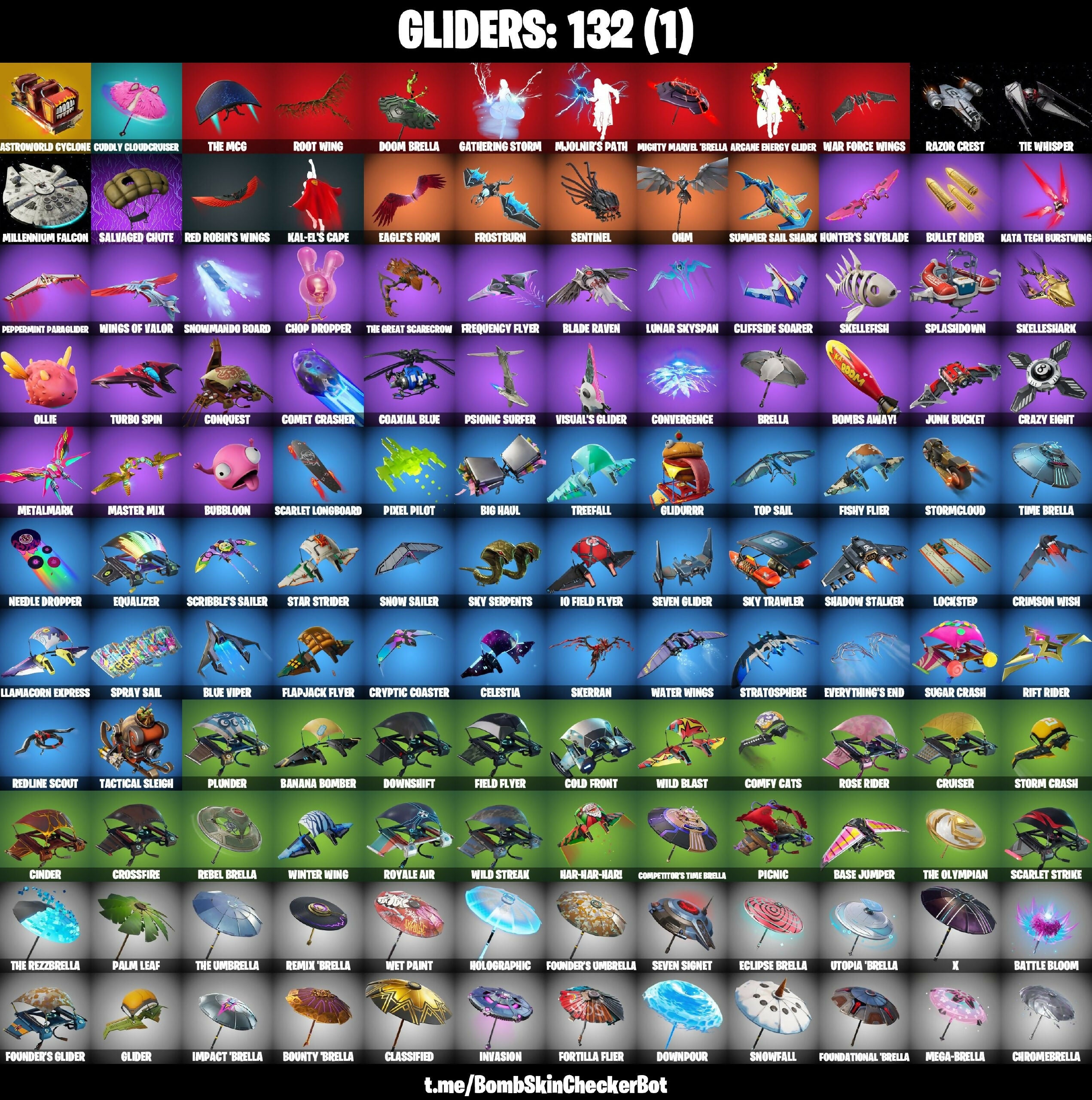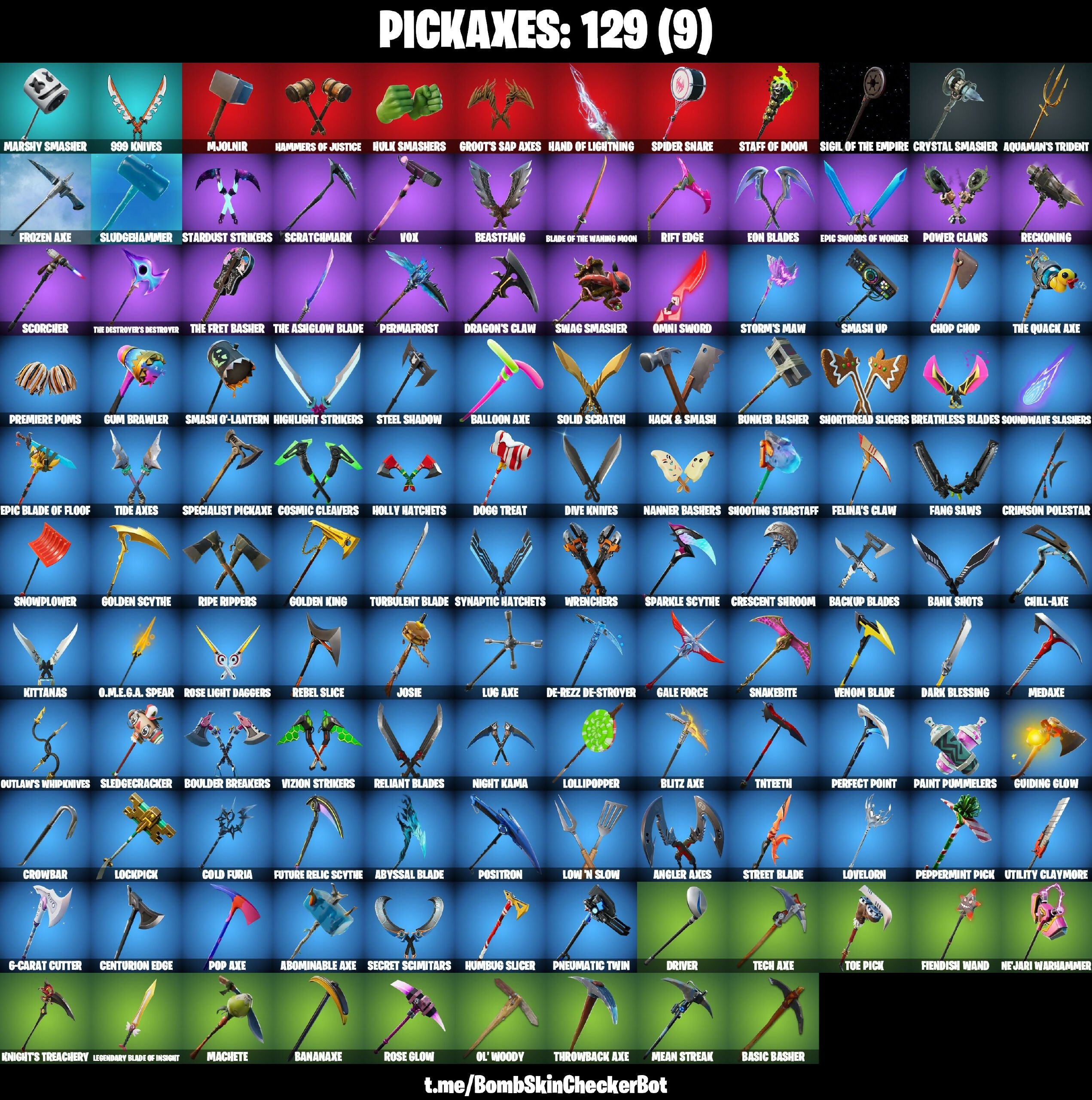6-Carat Cutter, 8-Ball Vs Scratch, 999 Knives, Abominable Axe, Absenz, Abyssal Blade, Agent Peely, Air Shredder, Angler Axes, Aquaman, Aquaman's Trident, Arcane Energy Glider, Arctic Adeline, Armadillo, Astroworld Cyclone, Atlantean Fishstick, Aura, Backup Blades, Balloon Axe, Banana Bomber, Bananaxe, Bandolier, Bank Shots, Base Jumper, Basic Basher, Battle Bloom, Battle Call, Battlehawk, Beastfang, Beep Beep, Bhangra Boogie, Big Haul, Bike To Go, Billy Bounce, Biz, Blackheart, Blade Of The Waning Moon, Blade Raven, Blitz Axe, Blowing Bubbles, Blue Viper, Boing!, Bombs Away!, Boobytrapped, Boogie Down, Boomin', Boulder Breakers, Bounty Brella, Breakdown, Breakneck, Breathless Blades, Brella, Brutus (Fully Golden), Bubloon, Bullet Rider, Bullseye, Bunker Basher, Bunker Jonesy, Calamity, Calculated, Call Me, Cameo Vs Chic, Carbide, Carbon Commando, Cat Flip, Catalyst, Cauldron Chill, Celestia, Centurion, Centurion Edge, Chalk Outline, Chaos Double Agent, Chicken Wing It, Chill-Axe, Choice Knit, Chop Chop, Chop Dropper, ChromeBrella, Cinder, Cipher, Classified, Clean Sweep, Cliffside Soarer, Cloaked Shadow, Cluck Strut, Coaxial Blue, Cobalt, Coin Flip, Cold Front, Comet Crasher, Comfy Cats, Competitor's Time Brella, Conga, Conquest, Convergence, Cosmic Cleavers, Crazy Eight, Crescent Shroom, Crimson Polestar, Crimson Wish, Criterion, Crossfire, Crowbar, Crowning Achievement, Cruiser, Cryptic Coaster, Crystal, Crystal Smasher, Cuddly Cloudcruiser, Curling Iron, D'Ark, DJ Yonder, Dabstand, Dark Blessing, Dark Tricera Ops, De-Rezz De-Stroyer, Deadpool, Deep End, Desirable, Diamond Diva, Dive Knives, Dizzie, Doctor Doom, Dogg Treat, Doom Brella, Double Agent Hush, Double Agent Wildcard, Doublecross, Downpour, Downshift, Doze Dab, Dragon Stance, Dragon's Claw, Drift, Drift (Stage 5), Driver, Droop, Eagle's Form, Eclipse Brella, Eon Blades, Epic Blade Of Floof, Epic Swords Of Wonder, Equalizer, Eternal Knight, Everything's End, Face Palm, Fade, Fang Saws, Fast Flex, Featherweight, Felina, Felina's Claw, Field Flyer, Fiendish Wand, Finesse Finisher, First Order Banner, Fishy Flier, Fixer, Flapjack Flyer, Flapjackie, Flippin' Away, Flippin' Sexy, Focused, Follow The Butterfly, Fortilla Flier, Foundational Brella, Founder's Glider, Founder's Umbrella, Frequency Flyer, Frostbite, Frostburn, Frozen Axe, Frozen Love Ranger, Frozen Raven, Frozen Red Knight, Future Relic Scythe, GG Smiley, Galaxy Scout, Gale Force, Gathering Storm, Gear Specialist Maya, Gentleman's Dab, Get Funky, Get Griddy, Get Schwifty, Giddy-Up, GlidURRR, Glider, Gold Furia, Golden King, Golden Scythe, Golf Clap, Good Game, Well Played, Groot, Groot's Sap Axes, Guggimon, Guiding Glow, Gum Brawler, Hack & Smash, Hammers Of Justice, Hand Of Lightning, Have A Seat, Hello Friend, High Five, Highlight Strikers, Hit It, Holly Hatchets, Holographic, Hot Marat, Hula Hoopin', Hulk Smashers, Humbug Slicer, Hunter's Skyblade, Huntress, Hybrid, Hype!, I Declare!, IO Field Flyer, Impact Brella, Imperial March, Insight, Introducing..., Invasion, Iris, It Is Finished, It's... You?, Jabba Switchway, Jaywalking, Jennifer Walters, Joey, Jolly Jammer, Josie, Journey Vs Hazard, Jules, Jump Jets, Junk Bucket, Kal-El's Cape, Kata Tech Burstwing, Keep It Mello, Keyed Up, Kiss The Cup, Kit, Kittanas, Knight's Treachery, Kondor, Krisabelle, Kymera, Laguna, Laugh It Up, Lebron James, Legendary Blade Of Insight, Lil' Prancer, Lil' Saucer, Lil' Warthog, Lina Scorch, Llamacorn Express, Lock It Up, Lockpick, Lockstep, Lollipopper, Love It!, Lovelorn, Low 'N Slow, Lt. Evergreen, Lug Axe, Lunar Skyspan, Lynx, Machete, Make A Seat, Mandalorian, Mangake, Marshy Smasher, Master Mix, Mave, Mean Streak, Mecha Team Banner, Medaxe, Mega-Brella, Meowscles, Metalmark, Mic Drop, Midas (Fully Golden), Midas' Shadow, Mighty Marvel Brella, Millennium Falcon, Mjolnir, Mjolnir's Path, Munitions Expert, Nailed It, Nanner Bashers, Ne'Jari Warhammer, Needle Dropper, Neo's Bullet Time, Night Kama, O.M.E.G.A. Spear, Ocean, Ohm, Ol' Woody, Ollie, Omni Sword, Orange Justice, Outlaw's Whipknives, Paint Pummelers, Palm Leaf, Pandemonium, Party Hips, Pastel, Paws & Claws, Peace Out, Peely, Peppermint Paraglider, Peppermint Pick, Perfect Point, Permafrost, Picnic, Pixel Pilot, Planetary Vibe, Plunder, Pneumatic Twin, Point Patroller, Polar Peely, Pop Axe, Popcorn, Positron, Powder, Power Chord, Power Claws, Premiere Poms, Prodigy, Psionic Surfer, Pull Up, Pumped!, Rage, Rage Quit, Ragnarok (Stage 6), Raise The Cup, Razor Crest, Rebel Brella, Rebel Slice, Reckoning, Recon Expert, Recon Ranger, Red Robin's Wings, Red Strike, Redline, Redline Scout, Reese, Regal Wave, Relay, Reliant Blades, Remedy Vs Toxin, Remix Brella, Respect The Peace, Rezzblocks, Ride The Pony, Rift Edge, Rift Rider, Riley, Ripe Rippers, Rippley Vs Sludge, Rogue Agent, Rollie, Rook, Root Wing, Rose Glow, Rose Light Daggers, Rose Rider, Rose Team Leader, Rox, Royale Air, Royale Bomber, Running Man, Rust Bucket, Sackin', Sad Trombone, Salute, Salvaged Chute, Santa Dogg, Say So, Scarlet Longboard, Scarlet Strike, Scorcher, Scratchmark, Scribble's Sailer, Scuba Jonesy, Secret Scimitars, Seeker, Sentinel, Seven Glider, Seven Signet, Sgt. Winter, Shadow Boxer, Shadow Ops, Shadow Stalker, Shadow Vox, Shake & Slash, Sharpshooter, Shimmer, Shooting Starstaff, Shortbread Slicers, Show 'Em Off, Showboat, Side Hustle, Sidewinder, Sigil Of The Empire, Sign Spinner, Sing Along, Siona, Ska-Stra-Terrestrial, Skelefish, Skelleshark, Skerran, Skull Ranger, Sky Serpents, Sky Trawler, Skye, Slammin' Bass, Sled Ready Guff, Sledgecracker, Sledgehammer, Sludgehammer, Smash O'-Lantern, Smash Up, Smizze, Snakebite, Snoozefest, Snow Sailer, Snowfall, Snowmando Board, Snowplower, Snowshaker, So Square, Solid Scratch, Soundwave Slashers, Sparkle Scythe, Sparkle Supreme, Specialist Pickaxe, Spider Snare, Spider-Man (No Way Home), Spike It, Splashdown, Spray Sail, Spring-Loaded, Springy, Square Up, Staff Of Doom, Stand Surfer, Star Strider, Star-Spang