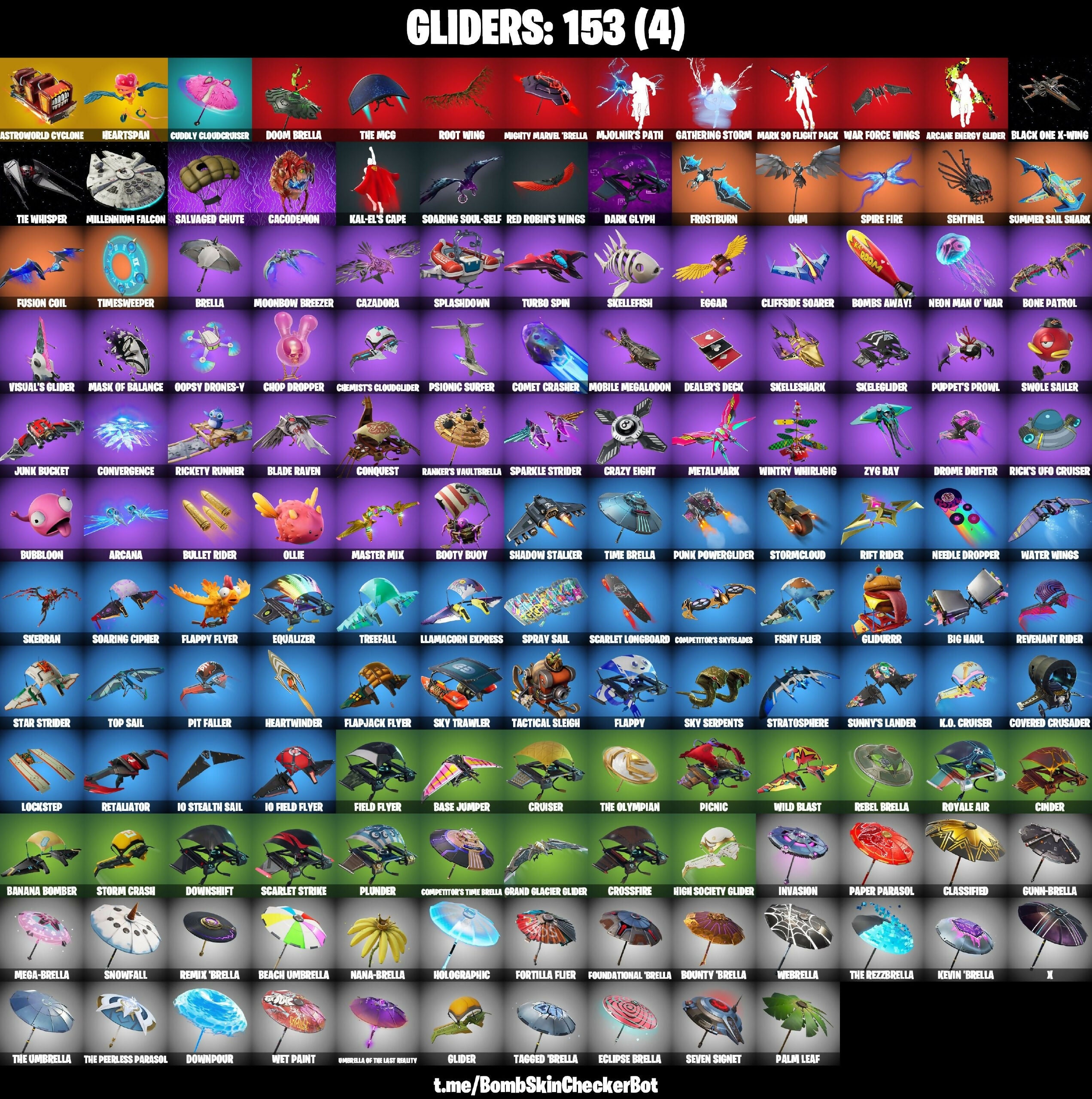 10 Field Flyer, 10 Stealth Sail, 8-Ball vs Scratch, 999 Knives, A Warrior Prepares, Abominable Axe, Agent Jones, Agent Peely, Air Shredder, Angler Axes, Apex Predator, Aquaman, Aquaman's Trident, Arcana, Arcane Energy Glider, Artifact Axe, Assault Trooper, Astroworld Cyclone, Atlantean Fishstick, Axe-Tral Form, Backup Blades, Balloon Axe, Banana Bomber, Bananaxe, Bank Shots, Baron's Hoard, Base Jumper, Beach Umbrella, Bean Bag, Beep Beep, Big Haul, Billy Bounce, Birdie, Bitey, Black One X-Wing, Blackheart, Blade Of The Waning Moon, Blade Raven, Blitz Axe, Blowing Bubbles, Boing!, Bolt Blades, Bombs Away!, Bone Patrol, Boogie Down, Boots 'N' Cats, Booty Buoy, Boulder Breakers, Bounty 'Brella, Breakdown, Breakpoint, Breathless Blades, Brella, Brush Your Shoulders, Brutus (Fully Golden), Bubloon, Buckets, Bullet Rider, Bullseye, Bunker Basher, Bunker Jonesy, Bunny Brawler, Bunnywolf, Burn Bright, Butcher's Knife, Cacodemon, Calamity, Calculated, Call Me, Cameo vs Chic, Carbon Commando, Cardistry, Cat Flip, Catalyst, Cazadora, Centurion, Centurion Edge, Chainsaur, Challenger's Staff, Champion Siren, Chaos Scythe, Chemist's Cloudglider, Choice Knit, Chop Chop, Chop Dropper, Cinder, Clang & Basher, Classified, Clean Groove, Clean Sweep, Click!, Cliffside Soarer, Cluck, Cluck Strut, Cobalt, Coin Flip, Comet Crasher, Commando, Competitor's Skyblades, Competitor's Time Brella, Conga, Conquest, Controller, Convergence, Cosmic Cleavers, Count It!, Covered Crusader, Crabby, Crazy Eight, Crescent Shroom, Crimson Polestar, Criss Cross, Crossfire, Crowbar, Crowning Achievement, Cruiser, Crusher, Crystal Axe Of The Masters, Cuddly Cloudcruiser, Curling Iron, Cybertronian Axe, Cyclo Curl, Dabstand, Dagger Dance, Dark Glyph, Deadpool, Dealer's Deck, Demi, Derby Dynamo, Dive Knives, Dizzie, Dj Yonder, Doctor Doom, Doctor Slone, Doom Brella, Downpour, Downshift, Doze Dab, Dragon Stance, Dragon's Claw, Dread, Dream Feet, Drift, Drift (Stage 5), Drome Drifter, Droop, Drummies, Dumbbell Driver, Duplicating Batons, Dusk, Dynamo, Eclipse Brella, Eggar, Electro Pairing Blades, Elegant Crowbar, Ember, Ember Pick, Enforcer, Eon Blades, Epic Blade Of Floof, Epic Swords Of Wonder, Equalizer, Eternal Knight, Evasive Maneuvers, Fable, Fade, Featherweight, Feelin' Jaunty, Felina, Felina's Claw, Field Flyer, Fierce, First Order Banner, Fishy Flier, Fist Bump, Fist Pump, Flapjack Flyer, Flappy, Flappy Flyer, Flawless, Flippin' Away, Foil Flex, Fortilla Flier, Foundational 'Brella, Free Flow, Frostburn, Frosty Globes, Frozen Axe, Frozen Love Ranger, Frozen Raven, Frozen Red Knight, Fuel Rod And Tongs, Fusion, Fusion Coil, Fusion Scythe, Gathering Storm, Gear Specialist Maya, Gentleman's Dab, Get Funky, Giddy-Up, Gilded Morphic Blades, Gilded Pinscher, Gilded Scepter, Glider, Glidurr, Golden King, Golf Clap, Grand Glacier Glider, Grand Salute, Groot, Groot's Sap Axes, Guggimon, Guiding Glow, Gum Brawler, Gunn-Brella, Hack & Smash, Hammerhead Morty, Hammers Of Justice, Hand Of Lightning, Harley Hitter, Harley Quinn, Harmonic Axes, Have A Seat, Hayseed, Head Banger, Heart Sign, Heart's Carver, Heartspan, Heartwinder, Heist, Hello Friend, High Five, High Society Glider, Highlight Strikers, Holly Hatchets, Holographic, Hoop Master, Hoppity, Hot Marat, Hot Pokers, Hot Stuff, Howl, Hula Hoopin', Huntress, Hybrid, I Declare!, Ice Breaker, Infinite Dab, Introducing..., Invasion, Io Eradicator, Iris, It Is Finished, It's Go Time!, It's... You?, Jar Buster, Jaywalking, Jennifer Walters, Jet Signals, Jingu Bang, Joey, Josie, Journey vs Hazard, Jubilation, Jules, Jump Jets, Junk Bucket, K.O. Cruiser, Kal-El's Cape, Keep It Mello, Kevin 'Brella, Keyed Up, Kick Back, Kit, Kittanas, Knight's Treachery, Krisabelle, Kymera, Laguna, Laid Back Shuffle, Lara Croft, Laugh It Up, Lazy Shuffle, Legendary Blade Of Insight, Lil' Saucer, Llamacorn Express, Lock It Up, Lockpick, Lockstep, Love It!, Lt. Evergreen, Lug Axe, Luxe, Lynx, Major Glory, Make A Seat, Mark 85 Energy Blade, Mark 90 Flight Pack, Marsh Walk, Mask Of Balance, Master Key, Master Mix, Meat Grinder, Mech Axe, Medaxe, Mega-Brella, Meowscles (Fully Golden), Merry Marauder, Metalmark, Mic Drop, Microbot Mallet, Midas (Fully Golden), Midas' Shadow, Mighty Marvel Brella, Millennium Falcon, Mjolnir, Mjolnir's Path, Mobile Megalodon, Molten Max Axe, Moonbow Breezer, Munitions Major, Mystique, Nailed It, Nana Nana, Nana-Brella, Nanner Bashers, Needle Dropper, Neon Man O' War, Night Kama, Ninja Style, Nog Ops, O.M.E.G.A. Spear, Ocean, Ohm, Ol' Spiky, Ollie, Onesie, Oopsy Drones-V, Orange Justice, Outlaw's Whipknives, Palm Leaf, Pandemonium, Paper Parasol, Par Patroller, Pathfinder, Paws & Claws, Peace Out, Peely, Peppermint Pick, Perfect Point, Perfect Shadow, Permafrost, Picnic, Pig The Butcher, Pit Faller, Planetary Vibe, Plunder, Plunja, Pneumatic Twin, Point & Shoot, Point Patroller, Poised Playmaker, Polar Peely, Pom Pummellers, Pop Axe, Powder, Power Claws, Premiere Poms, Prodigy, Pry Axe, Psionic Surfer, Punchline, Punk Powerglider, Puppet's Prowl, Rage, Ragnarok (Stage 6), Raise The Roof, Ranker's Vaultbrella, Ravage, Raven's Legion, Raz, Reanimated, Rebel Brella, Rebel Slice, Rebirth Raven, Reckoning, Recon Expert, Recon Ranger, Red Robin's Wings, Redline, Regal Wave, Reliant Blades, Remedy vs Toxin, Remix 'Brella, Renegade, Respect The Peace, Retaliator, Revenant Rider, Rick's Ufo Cruiser, Rickety Runner, Rift Edge, Rift Rider, Riot Control Baton, Ripe Rippers, Rippley vs Sludge, Rook, Root Wing, Rox, Royale Air, Ruin, Running Man, Runway Racer, Rust Bucket, Sad Trombone, Salute, Salvaged Chute, Sasquatchin', Scarlet Defender, Scarlet Longboard, Scarlet Strike, Scootin, Scorcher, Scratchmark, Scuba Jonesy, Secret Scimitars, Sentinel, Serpentine Summoning, Seven Signet, Sgt. Sigil, Sgt. Winter, Shadow Boxer, Shadow Play: Toad, Shadow Skully, Shadow Stalker, Shadowbird, Shaolin Sip, Sharpshooter, Shimmer, Shogun, Shooting Starstaff, Shortbread Slicers, Side Hustle, Sidewinder, Sigil 