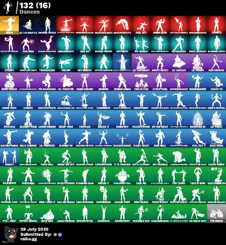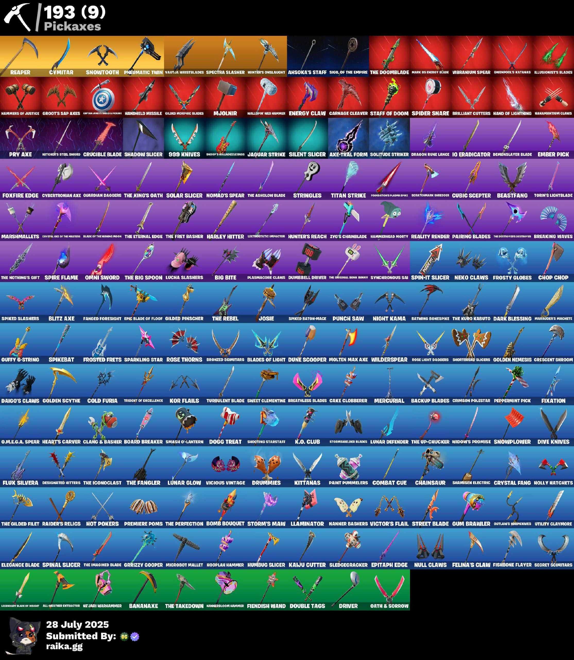 999 Knives, A Warrior Prepares, Adira, Agent Jones, Ahsoka Tano, Ahsoka's Staff, All-Weather Extractor, Antonia, Arachrobatics, Arctic Adeline, Axe-tral Form, Backup Blades, Balance Board, Bananaxe, Battle Blessing, Batwing Bonespike, Bean Bag, Beastfang, Beatz Bunny, Big Bite, Billy Bounce, Blade of the Waning Moon, Blades of Light, Blinding Lights, Blitz Axe, Blowin' Up, Board Breaker, Boba Snack, Bomb Bouquet, Boogie Down, Boomin', Boosting Ku, Bootsin' Cats, Breaking Point, Breaking Waves, Breathless Blades, Brilliant Cutters, Bring It Around, Bronzed Scimitars, Bytes, Cake Clobberer, Call Me, Called Shot, Captain Jones, Captain Jones's Shield & Pickaxe, Captain LaPierka, Cardistry, Carnage, Carnage Cleaver, Cauldron Chill, Chainsaur, Chaos Director, Charlotte, Chef's Special, Choice Knit, Chop Chop, Clang & Basher, Clark Kent, Clean Sweep, Cluck, Cold Furia, Combat Cue, Count It!, Crack It, Crescent Shroom, Crimson Polestar, Crucible Blade, Crystal Axe of the Masters, Crystal Fang, Cubic Scepter, Curling Iron, Cybertronian Axe, CycLo Curl, Cyimitar, Dagger Dance, Daigo, Daigo's Claws, Dark Blessing, Dark Doggo, Darth Vader, Day Tripper Festival, Demonslayer Blade, Designated Hitters, Dice Roll, Dive Knives, Do The Split, Doctor Doom, Doctor Slone, Dogg Treat, Don't Start Now, Doom, Doom Slayer, Double Tags, Doze Dab, Dragon Rune Lance, Dramatic Flares, Driver, Drummies, Duff Gringle, Dumbbell Driver, Dune Scooper, Dusty, D’ark, Electro Swing, Elegance Blade, Ember Pick, Emma Frost, Empress Ear Dance, Energy Claw, Entranced, Epic Blade of Floof, Epitaph Edge, Era, Eren Jaeger, Erisa, Evasive Maneuvers, Evie, Explorer Emilie, Expressionism, Fabio Sideburner, Fanged Foresight, Felina, Felina's Claw, Fiendish Wand, Fireworks Salvo, Fish Thicc, Fishbone Flayer, Fist Bump, Fixation, Flaky Feast, Flashback Unknown, Flippin' Away, Flux Silvera, Focus, Foil Flex, Foundation's Plasma Spike, Foxfire Edge, Frosted Frets, Frosty Globes, Full Tilt, Geralt of Rivia, Get Griddy, Get Outta Your Mind, Gilded Morphic Blades, Gilded Pinscher, Godzilla Evolved, Golden Nemesis, Golden Scythe, Good Guy, Grizzly Gooper, Groot, Groots Sap Axes, Groundwave Revenge, Grriz, Guardian Daggers, Guffy G-String, Guggimon, Gum Brawler, Gumbo, Gunnar, Gwen-Step, Gwenpool, Gwenpool's Katanas, Hammer Dance, Hammerhead Morty, Hammers of Justice, Hand of Lightning, Hand-Forged, Handheld Missile, Harley Hitter, Harlowe, Heart Sign, Heart's Carver, Hellfire Dance, Helsie, Hero Baymax, High Stance Leg, Highwire, Holiday Boxy, Holly Hatchets, Hooplah Hammer, Hot Pokers, Humbug Slicer, Hunter's Reach, Hypnot Eyes, Igni Sign, Illusionist's Blades, Imani, Imperial March, Invisible Cut, Io Eradicator, It Is Finished, It's... You, J.B. Chimpansi, Jabba Switchaway, Jackie, Jade, Jaguar Strike, Jennifer Walters, Jet Signals, Joey, Josie, K.O. Club, Kado Thorne, Kaiju Cutter, Kendo, Khaby Lame, Kiara K.O., Kick Back, Kittanas, Kondor, Kor, Kor Flails, Krisabelle, Kymera, Lara Croft, Laser Focused, Lectrostatic Impactor, Legendary Blade of Insight, Leka, Lennox Rose, Lil Godzilla Attack, Lil Split, Lil T-6 Shuttle, Lil Treat, Lil' Longboat, Lil' Monster, Lil' Prancer, Lil' Rover, Lil' Saucer, Lizzik, Llaminator, Lonely!, Lorenzo, Lt. Evergreen, Lt. John Llama, Lucha Slashers, Lunar Charge, Lunar Defender, Lunar Glow, Lunar Party, Mae, Major Mangake, Make A Seat, Make The Destroyer, Malik, Maman Brigitte Mojoelle, Mandalorian, Mangake, Marauder's Machete, Mariposa, Mark 85 Energy Blade, Marshmallets, Mashed Potato, Massai, Mave, Menace, Meow Skulls, Meowdas, Mercurial, Microbot Mallet, Mini Slayer Retsump, Mizuki, Mjolnir, Molten Max Axe, Mr. Dappermint, My World, Mysterio, Mystica, Mystique, Nailed It, Nanner Bashers, Nannerbloom Hammer, Nanomantium Claws, Nejari Warhammer, Neko Claws, Neymar Jr, Nezumi, Night Kama, Ninja Slayer Alley, Nolan Chance, Nomad's Spear, Null Claws, Nwanana, Nyanja, O.M.E.G.A. Spear, Oath & Sorrow, Omegarok, Omg I Love It, Omni Sword, Optimus Prime, Out West, Outlaw's Whipknives, Paint Pummellers, Pairing Blades, Peel Out, Peelverine, Peppermint Pick, Piper Page, Pity Cycle, Plasmacore Claws, Pneumatic Twin, Point & Shoot, Polar Peely, Polarity, Predator, Premiere Poms, Prowler, Prv Axe, Punch Saw, Puppet Dance, Purebedronium, Q-Ball, Raider's Relics, Raven, Raz, Ready Willing Quake, Reality Render, Reaper, Rebirth Raven, Red Jade, Reese, Relix, Renegade Lynx, Respect The Pack, Rhythm Of Bones, Rian, Rick Sanchez, Rogue Red Boomba, Ronin, Rose Light Daggers, Rose Thorns, Ruby Shadows, Ruffneck Engineer, Runway Racer, Sabina, Santa Dogg, Say So, Scorecard, Scout Emblem Salute, Scratchmark Shredder, Secret Scimitars, Seeker, Segway Tour, Selene, Self Reflexing, Shadow Blade Rose, Shadow Slicer, Shamisen Electric, Shanta, Shooting Starstaff, Shortbread Slicers, Show 'Em Off, Shuri, Shuriken Sadona, Shuriken Spinner, Sigil of the Empire, Silent Slicer, Silver Juice World, Sing Along, Skate Monster, Sled Ready Ruff, Sledgecracker, Smash O'-Lantern, Snap, Snikt!, Snikt! Snikt!, Snoop's Holladizzle Bass, Snow Shaker, Snowplower, Snowtooth, Solar Slicer, Solitude Striker, Sparkling Star, Spectra Knight, Spectra Slasher, Spider Snare, Spider-Gwen, Spider-Man, Spikebat, Spiked Baton-Mace, Spiked Slashers, Spin-It Slicer, Spinal Slicer, Spire Assassin, Spire Flame, Spirit Strider, Squ Square, Staff of Doom, Standing Bow, Steady, Storm, Storm's Maw, Stormfarer, Stormshielder Blades, Stray, Street Blade, Stringles, Sultura, Sunny, Sweet Clementine, Sweet Shot, Sweet!, Swing Shot, Synchronous Sai, Take A Bow, Take The Cake, Tandom Recker, Tarana, The Ageless, The Ashglow Blade, The Big Spoon, The Break, The Break Shot, The Cube Queen, The Destroyer's Destroyer, The Dip, The Doomblade, The Eternal Edge, The Fangler, The Foundation, The Fret Basher, The Gilded Filet, The Herald, The Iconoclast, The Imagined, The Imagined Blade, The King's Oath, The Kuro Kabuto, The Night Rose, The Nothing's Gift, The Origin, The Original