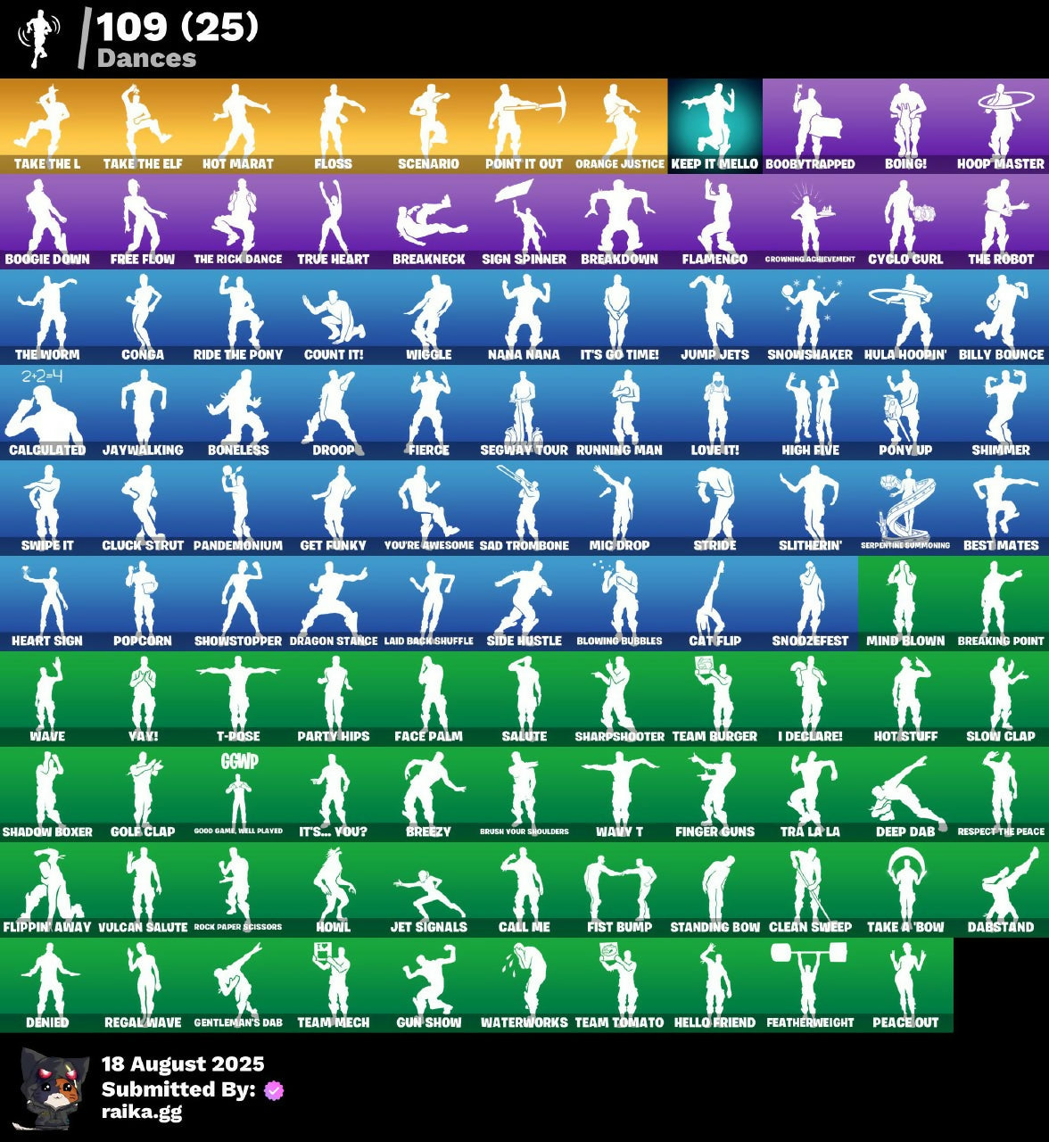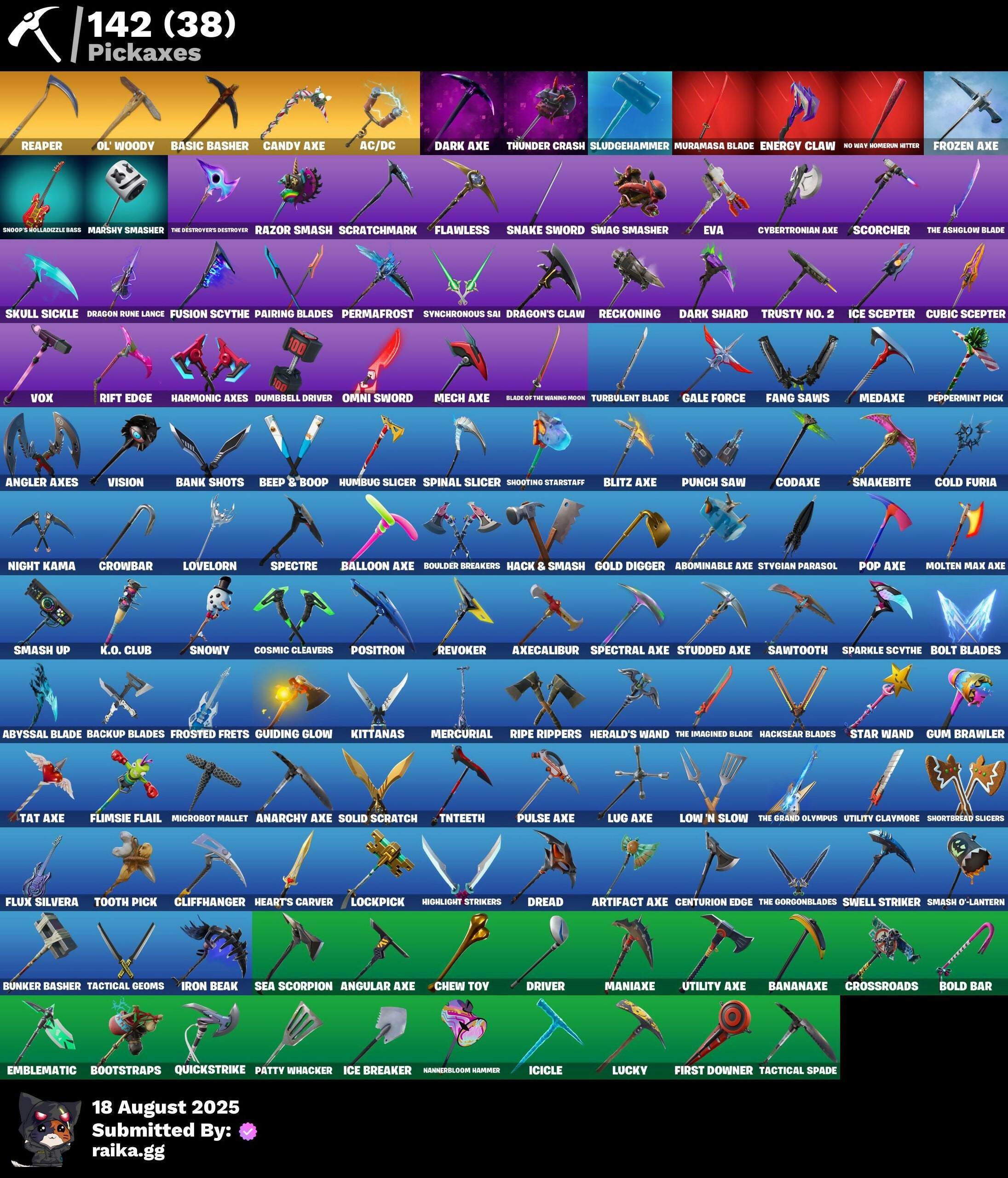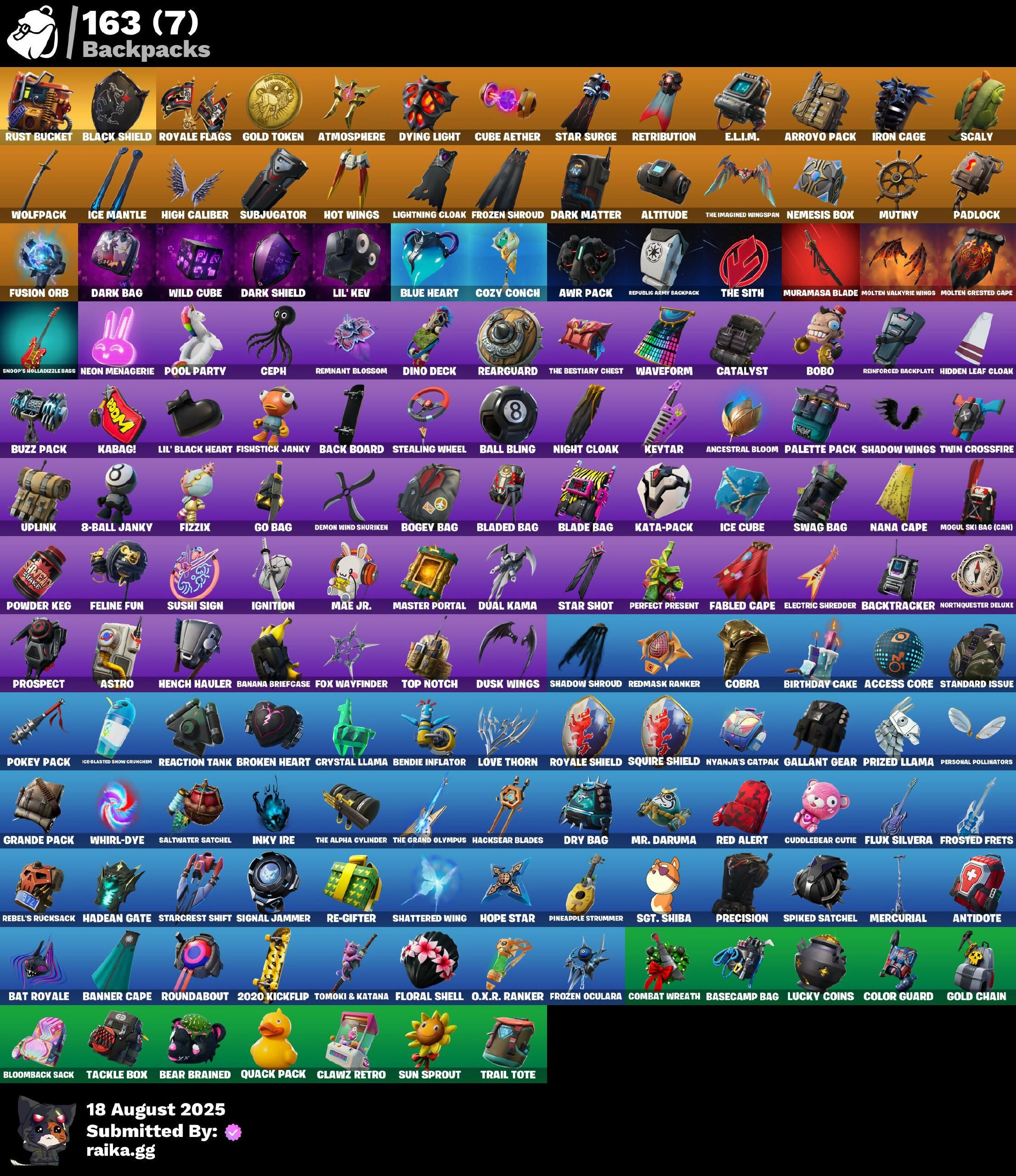 2020 Kickflip, 8-Ball Janky, 8-Ball vs Scratch, A.I.M., AC/DC, AWR Pack, Abbsenz, Abominable Axe, Absolute Zero, Abyssal Blade, Access Core, Agent Peely, Altitude, Anarchy Axe, Ancestral Bloom, Angler Axes, Angular Axe, Antidote, Arctic Assassin, Arroyo Pack, Artifact Axe, Assault Trooper, Astro, Astro Jack, Astroworld Cyclone, Atmosphere, Axecalibur, B.R.U.T.E. Gunner, Back Board, Backtracker, Backup Blades, Ball Bling, Balloon Axe, Banana Briefcase, Bananaxe, Bank Shots, Banner Cape, Basecamp Bag, Basic Basher, Bat Royale, Battle Bus, Battlehawk, Bear Brained, Beep & Boop, Bendie, Bendie Inflator, Best Mates, Billy Bounce, Birdie, Birthday Cake, Black Knight, Black Shield, Blackheart, Blade Bag, Blade of the Waning Moon, Bladed Bag, Blitz Axe, Bloomback Sack, Blowing Bubbles, Blue Heart, Blue Squire, Bobo, Bogey Bag, Boing!, Bold Bar, Bolt Blades, Boneless, Boobytrapped, Boogie Down, Bootstraps, Boulder Breakers, Brawler, Breakdown, Breaking Point, Breakneck, Breakpoint, Breezy, Broken Heart, Brush Your Shoulders, Brutus, Bunker Basher, Bunker Jonesy, Buzz Pack, Calamity, Calculated, Call Me, Cameo vs Chic, Candy Axe, Carbide, Cat Flip, Catalyst, Centurion, Centurion Edge, Ceph, Chew Toy, Clawz Retro, Clean Sweep, Cliffhanger, Cloaked Shadow, Clock Strut, Cobalt, Cobra, Codaxe, Cold Furia, Color Guard, Combat Tech Jules, Combat Wreath, Conga, Cosmic Cleavers, Count It!, Cozy Conch, Crossroads, Crowbar, Crowning Achievement, Crystal Llama, Cube Aether, Cubic Scepter, Cuddlebear Cutie, Cybertronian Axe, Cyclo Curl, DJ Yonder, Dabstand, Dark Axe, Dark Bag, Dark Bomber, Dark Jonesy, Dark Matter, Dark Red Knight, Dark Shard, Dark Shield, Dark Voyager, Dark Wild Card, Deadpool, Deep Dab, Demi, Demon Wind Shuriken, Denied, Desert Dominator, Dino Deck, Dire, Doublecross, Dragon Rune Lance, Dragon Stance, Dragon's Claw, Dread, Dream, Drift, Driver, Droop, Dry Bag, Dual Kama, Dumbbell Driver, Dusk, Dusk Wings, Dying Light, E.L.I.M., Electric Shredder, Elite Agent, Ember, Emblematic, Energy Claw, Enforcer, Eternal Voyager, Eva, Evie, Fable, Fabled Cape, Face Palm, Fang Saws, Featherweight, Feline Fun, Fierce, Finger Guns, First Downer, Fishstick (World Cup), Fishstick Janky, Fist Bump, Fizzix, Flamenco, Flawless, Flimsie Flail, Flippin' Away, Floral Shell, Floss, Flux Silvera, Fortune, Fox Wayfinder, Free Flow, Frosted Frets, Frozen Axe, Frozen Oculare, Frozen Shroud, Fusion, Fusion Orb, Fusion Scythe, Gale Force, Gallant Gear, Gear Specialist Maya, Gentleman's Dab, Get Funky, Ghoul Trooper, Giddy-up, Glow, Go Bag, Gold Chain, Gold Digger, Gold Token, Golf Clap, Good Game, Well Played, Grande Pack, Guiding Glow, Gum Brawler, Gun Show, Gunnar, Hack & Smash, Hacksear Blades, Hadean Gate, Harmonic Axes, Heart Sign, Hearts Carver, Hello Friend, Hench Hauler, Herald's Wand, Hidden Leaf Cloak, High Caliber, High Five, Highlight Strikers, Hoop Master, Hope Star, Hot Marat, Hot Stuff, Hot Wings, House Cat, Howl, Hula Hoopin', Humbug Slicer, Huntress, Hybrid, I Declare!, Ice Breaker, Ice Cube, Ice Mantle, Ice Scepter, Ice-Blaster Snow Grincherm, Icicle, Ignition, Ikonik, Inky Ire, Instinct, Iris, Iron Beak, Iron Cage, It's Go Time!, It's... You?, Jaywalking, Jet Signals, Journey vs Hazard, Jump Jets, K.O. Club, Kabag!, Kata-Pack, Keep It Mello, Keytar, Kiara K.O., Kittanas, Kuno, Laguna, Laid Back Shuffle, Lightning Cloak, Lil' Black Heart, Lil' Kev, Lockpick, Love It!, Love Thorn, Lovelorn, Low 'N Slow, Lt. Evergreen, Lucky, Lucky Coins, Lug Axe, Luxe, Lynx, Mae Jr., Mako, Maniaxe, Marked Marauder, Marshy Smasher, Master Key, Master Portal, Mech Axe, Medaxe, Mercurial, Mic Drop, Microbot Mallet, Min-Joon, Mind Blown, Mission Specialist, Mogul Master (CAN), Mogul Ski Bag (CAN), Molten Battle Hound, Molten Crested Cape, Molten Max Axe, Molten Valkyrie, Molten Valkyrie Wings, Monster Team Banner, Moonwalker, Mr. Daruma, Munitions Expert, Muramasa Blade, Mutiny, Nalia, Nana Cape, Nana Nana, Nannerbloom Hammer, Nemesis Box, Neon Menagerie, Night Cloak, Night Kama, Nightshade, Nitelite, No Way Homerun Hitter, Northquester Deluxe, Nyanja's Catpak, O.X.R. Ranker, Ol' Woody, Omni Sword, Onesie, Orange Justice, Padlock, Pairing Blades, Palette Pack, Pandemonium, Party Hips, Patty Whacker, Peace Out, Peely, Peppermint Pick, Perfect Present, Permafrost, Personal Pollinators, Phaedra, Pineapple Strummer, Point It Out, Pokey Pack, Pony Up, Pool Party, Pop Axe, Popcorn, Positron, Powder, Powder Keg, Precision, Prickly Patroller, Prized Llama, Prospect, Prowler, Pulse Axe, Punch Saw, Quack Pack, Quickstrike, Ragnarok, Raven, Razor Smash, Re-Gifter, Reaction Tank, Reaper, Rearguard, Rebel's Rucksack, Reckoning, Recon Specialist, Red Alert, Red Jade, Red Strike, Red-Nosed Raider, Redline, Redmask Ranker, Regal Wave, Reinforced Backplate, Remedy vs Toxin, Remnant Blossom, Respect The Peace, Retribution, Revoker, Rex, Ride The Pony, Rift Edge, Rio Grande, Ripe Rippers, Rippley vs Sludge, Rock Paper Scissors, Rogue Agent, Rook, Roundabout, Rox, Royale Flags, Royale Knight, Royale Shield, Ruby, Ruin, Running Man, Rust Bucket, Rust Lord, Sad Trombone, Sakura Haruno, Saltwater Satchel, Salute, Sandshark Driver, Sandstorm, Sasuke Uchiha, Sawtooth, Scaly, Scenario, Scorcher, Scratchmark, Scuba Crystal, Sea Scorpion, Segway Tour, Sentinel, Serpentine Summoning, Sgt. Green Clover, Sgt. Shiba, Sgt. Winter, Shadow Boxer, Shadow Ops, Shadow Shroud, Shadow Wings, Sharpshooter, Shattered Wing, Shimmer, Shooting Starstaff, Shortbread Slicers, Showdown, Showstopper, Side Hustle, Sidewinder, Sign Spinner, Signal Jammer, Skull Sickle, Sledgehammer, Slitherin', Slow Clap, Sludgehammer, Slurpentine, Smash O'-Lantern, Smash Up, Snake Sword, Snakebite, Snap, Snoop's Holladazzle Bags, Snoop's Holladizzle Bass, Snoozefest, Snowshaker, Snowy, Snuggs, Solid Scratch, Sparkle Scythe, Sparkle Specialist, Sparkle Supreme, Spartan Assassin, Spectral Axe, Spectre, Spiked Satchel, Spinal Slicer, Squire Shield, Standard Issue, Standing Bow, Star Shot, Star