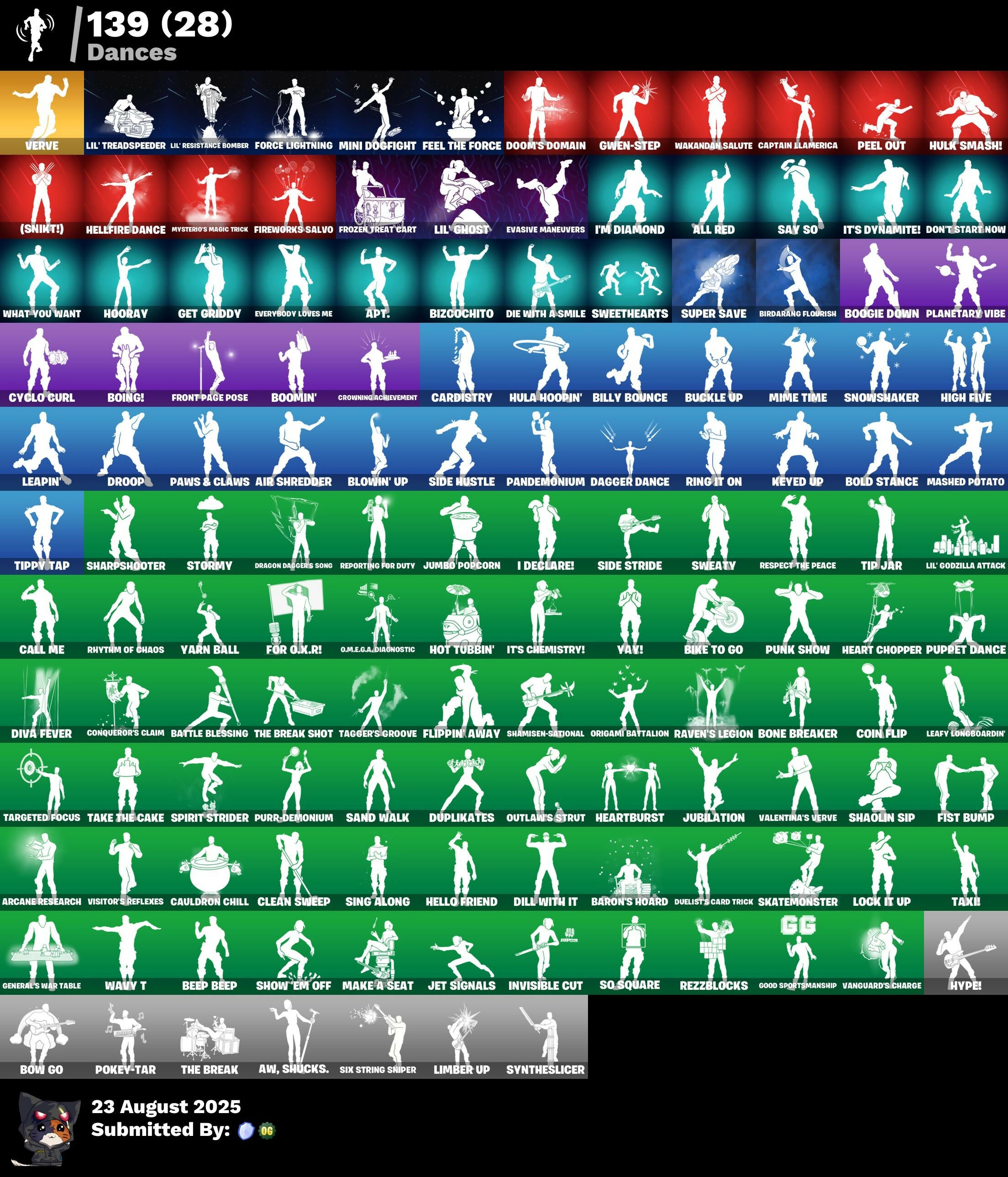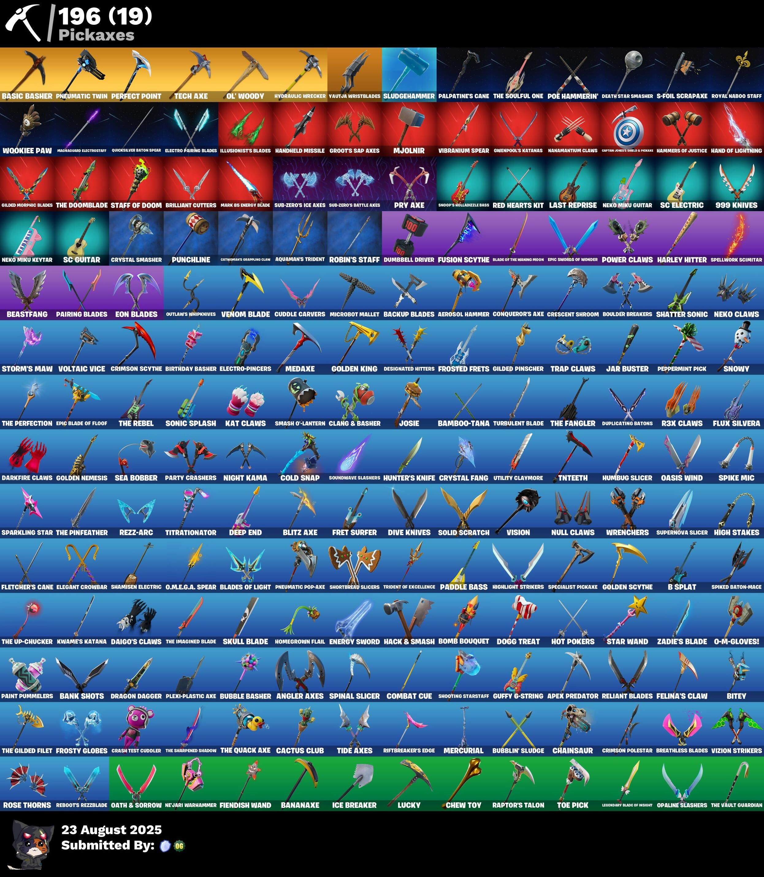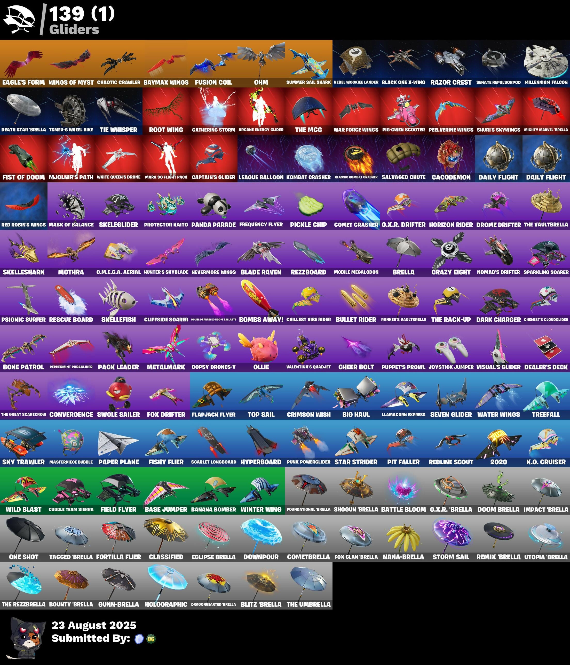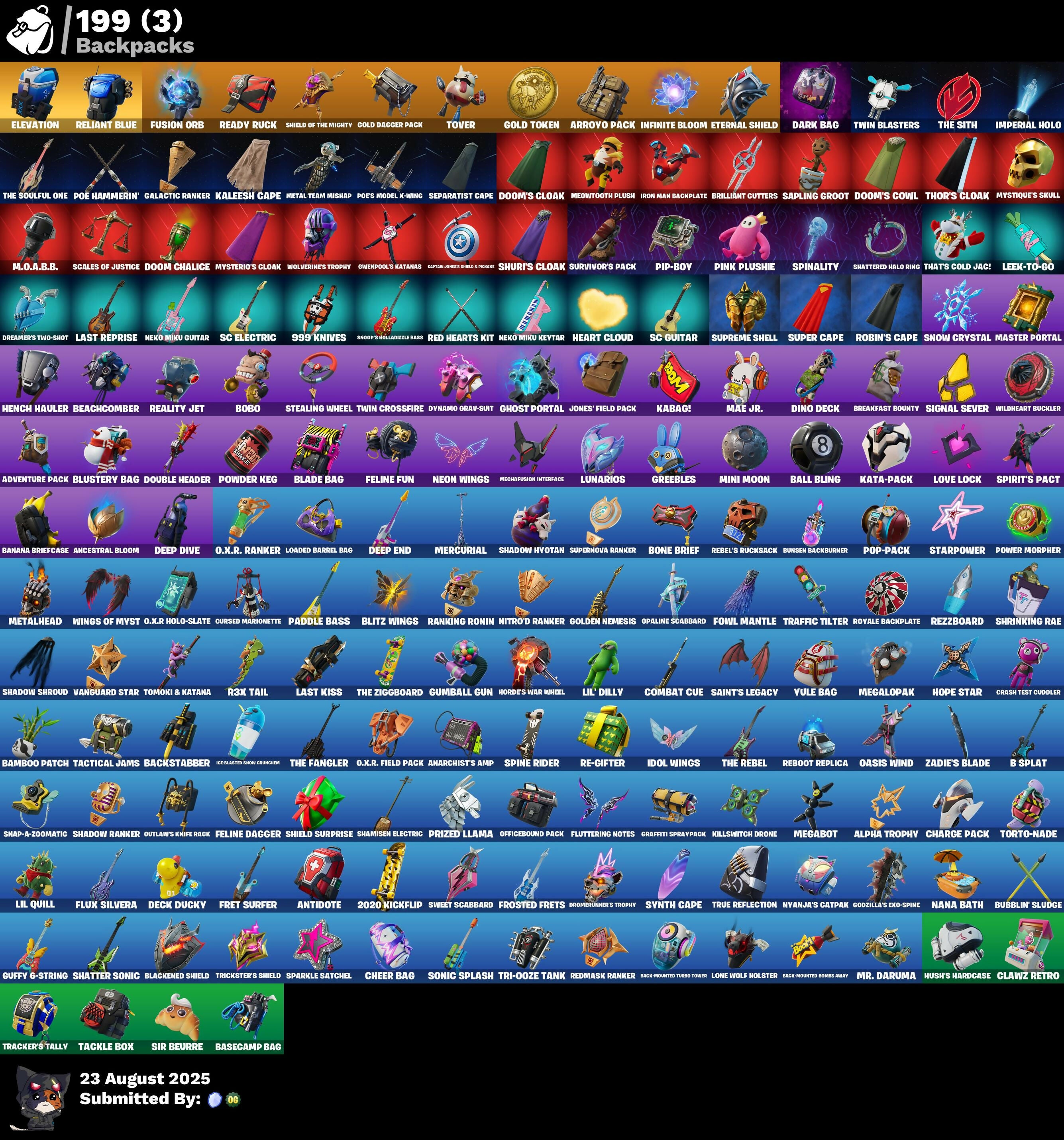 (Snikt!), 2020, 2020 Kickflip, 999 Knives, Adventure Pack, Aerosol Hammer, Agent Jones, Agent Patch, Agent Peely, Air Shredder, All Red, Alpha Trophy, Anarchist's Amp, Ancestral Bloom, Angler Axes, Antidote, Apex Predator, Apprentice Evie, Apt., Aquaman's Trident, Arcane Energy Glider, Arcane Research, Arroyo Pack, Arthur Curry, Aura, Aw, Shucks., Ayla Winn, B Splat, Back-Mounted Bombs Away, Back-Mounted Turbo Tuner, Backstabber, Backup Blades, Ball Bling, Bamboo Patch, Bamboo-Tana, Banana Bomber, Banana Briefcase, Bananaxe, Bank Shots, Baron's Hoard, Base Jumper, Basecamp Bag, Basic Basher, Battle Blessing, Battle Bloom, Battle Gamer Mae, Baymax Wings, Beachcomber, Beastfang, Beep Beep, Bernie, Bi-Han, Big Haul, Bike To Go, Billy Bounce, Birdarang Flourish, Birthday Basher, Bitev, Bizcochito, Black One X-Wing, Black Panther (Shuri), Black Queen, Blackened Shield, Blade Bag, Blade Raven, Blade of the Waning Moon, Blades of Light, Blitz 'Brella, Blitz Axe, Blitz Wings, Blowin' Up, Blustery Bag, Bobo, Boing!, Bold Stance, Bomb Bouquet, Bombs Away!, Bone Breaker, Bone Brief, Bone Patrol, Bones, Boogie Down, Boomin', Boulder Breakers, Bounty 'Brella, Bow Go, Brainiac, Breakfast Bounty, Breathless Blades, Brella, Brilliant Cutters, Brite Hatsune Miku, Brutus, Bubble Basher, Bubblin' Sludge, Buckle Up, Bullet Rider, Bunsen Backburner, Burnoff, Cacodemon, Cactus Club, Call Me, Cameo Vs Chic, Camo War Machine, Caper (Bunny), Captain Ilamerica, Captain Jones (Even & Ink), Captain Jones's Shield & Pickaxe, Captain Phasma, Captain's Glider, Cardistry, Catwoman's Grappling Claw, Cauldron Chill, Chainsaur, Chalked Up 1-Ball, Chaotic Crawler, Charge Pack, Cheer Bag, Cheer Bolt, Chemist's Cloudglider, Chew Toy, Chillest Vibe Rider, Clang & Basher, Classic Peelverine, Classified, Clawz Retro, Clean Sweep, Cliffside Soarer, Cloud Striker, Coin Flip, Cold Snap, Combat Cue, Comet Crasher, Cometbrella, Conqueror's Axe, Conqueror's Claim, Convergence, Crash Test Cuddler, Crazy Eight, Crescent Shroom, Crimson Polestar, Crimson Scythe, Crimson Wish, Crowning Achievement, Crystal Fang, Crystal Smasher, Cuddle Carvers, Cuddle Team Sierra, Cursed Marionette, Cyclo Curl, Dagger Dance, Daigo's Claws, Daily Flight, Dancefloor Diva, Dark Bag, Dark Bomber, Dark Charger, Dark Doggo, Dark Gwenpool, Darkfire Claws, Dealer's Deck, Deal’em Cassidy Quinn, Death Star 'Brella, Death Star Smasher, Deck Ducky, Deep Dive, Deep End, Demon Hunter Hope, Designated Hitters, Die With A Smile, Die With A Smile Bruno, Dill With It, Dillinger The Gherk, Dino Deck, Diva Fever, Dive Knives, Doctor Doom (God Emperor), Dogg Treat, Don't Start Now, Doom Brella, Doom Chalice, Doom's Cloak, Doom's Cowl, Doom's Domain, Double Header, Double-Barreled Boom Ballasts, Downpour, Dragon Dagger, Dragon Daggers Song, Dragonhearted 'Brella, Dreamer's Two-Shot, Drome Drifter, Dromerunner's Trophy, Droop, Duelist's Card Trick, Dumbbell Driver, Dupli-Kate, Duplicating Batons, Duplikates, Dusk Knight, Dynamic Hush, Dynamo Dancer, Dynamo Grav-Suit, Dynamo Tntoon-A, Eagle's Form, Echo, Eclipse 'Brella, Electro Pairing Blades, Electro-Pincers, Elegant Crowbar, Elevation, Emperor Palpatine, Energized Godzilla, Energy Sword, Eon Blades, Epic Blade of Floof, Epic Swords of Wonder, Eternal Knight, Eternal Shield, Evasive Maneuvers, Everybody Loves Me, Evie, Explorer Emilie, Fade, Feel The Force, Felina, Felina's Claw, Feline Dagger, Feline Fun, Field Agent Kyra, Field Flyer, Fiendish Wand, Fireworks Salvo, Fishy Flier, Fist Bump, Fist Of Doom, Flapjack Flyer, Fletcher's Cane, Flippin' Away, Fluttering Notes, Flux Silvera, For O.X.R.!, Force Lightning, Fortilla Flier, Foundational 'Brella, Fowl Mantle, Fox Clan 'Brella, Fox Drifter, Frequency Flyer, Fret Surfer, Front Page Pose, Frost Squad, Frosted Frets, Frosty Globes, Frozen Treat Cart, Full Moon Fletcher Kane, Fusion, Fusion Coil, Fusion Orb, Fusion Scythe, Galactic Ranker, Gathering Storm, General Grievous, General's War Table, Get Griddy, Ghost Portal, Gilded Morphic Blades, Gilded Pinscher, Glitch, Godzilla's Exo-Spine, Gold Dagger Pack, Gold Token, Golden Conqueror, Golden King, Golden Nemesis, Golden Scythe, Good Sportsmanship, Graffiti Spraypack, Greebles, Groot (Silver Foil), Groot's Sap Axes, Guardian Jade, Guffy G-String, Gumball Gun, Gunn-Brella, Gwen-Step, Gwenpool's Katanas, Hack & Smash, Hairpin, Hammers of Justice, Hand of Lightning, Handheld Missile, Harley (Always Fantabulous), Harley Hitter, Haruka Of The Masks, Haylee Skye, Hazard, Heart Chopper, Heart Cloud, Heartburst, Hellfire Dance, Hello Friend, Hench Hauler, High Five, High Stakes, Highlight Strikers, Holographic, Homegrown Flail, Hooray, Hope Star, Horde's War Wheel, Horizon Rider, Hot Pokers, Hot Tubbin', Hula Hoopin', Hulk Smash!, Humbug Slicer, Hunter's Knife, Hunter's Skyblade, Hush's Hardcase, Hydraulic Wrecker, Hype!, Hyperboard, I Declare!, I'm Diamond, Ice Breaker, Ice-Blasted Snow Cruncher, Idol Wings, Illusionist's Blades, Illusory Mysterio, Impact 'Brella, Imperial Holo, Inferno, Infinite Bloom, Invisible Cut, Iridia Vayne, Iron Man Backplate, It's Chemistry!, It's Dynamite!, Jar Buster, Jennifer Walters, Jet Signals, Jolly Jammer, Jones' Field Pack, Josie, Joystick Jumper, Jubilation, Jumbo Popcorn, K.O. Cruiser, Kabagi!, Kaleesh Cape, Kat Claws, Kata-Pack, Keyed Up, Killswitch, Killswitch Drone, Kintsugi Daigo, Kit, Klassic Kombat Crasher, Kombat Crasher, Kondor, Kwame, Kwame's Katana, Lara Croft, Last Kiss, Last Reprise, Leafy Longboardin', League Balloon, Leapin', Leek-To-Go, Legendary Blade of Insight, Lexa, Lightrider, Lil Quill, Lil' Dilly, Lil' Ghost, Lil' Godzilla Attack, Lil' Resistance Bomber, Lil' Treadspeeder, Limber Up, Lllamacorn Express, Loaded Barrel Bag, Lock It Up, Lone Wolf Holster, Love Lock, Lt. Evergreen, Lt. Ripp Slade, Lucky, Lucky Nyanja, Lunarios, M.O.A.B.B., MR. Daruma, Mae Jr., Make A Seat, Mancake, Mandalorian, Marika, Mark 85 Energy Blade, Mark 90 Flight Pack, Mashed Potato, Mask Of Balance, M
