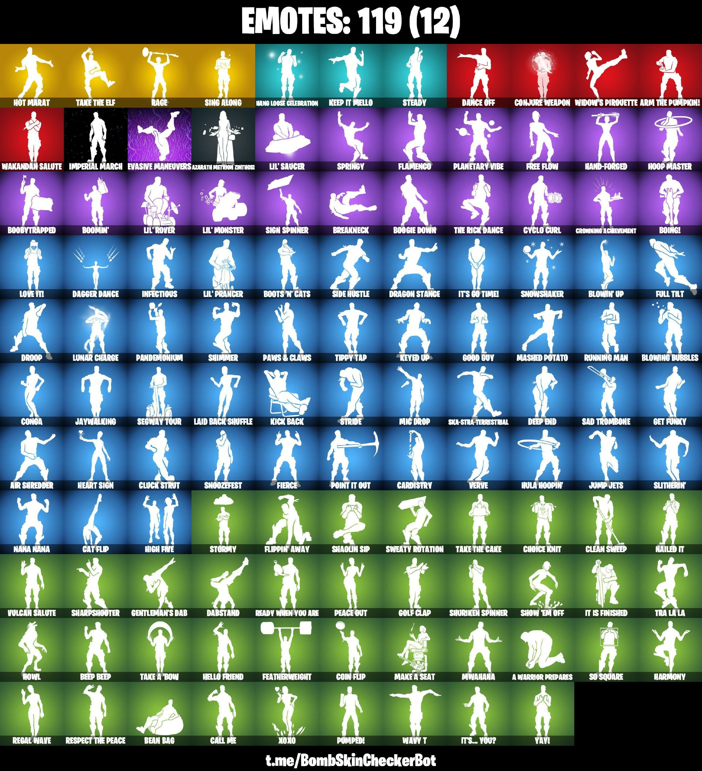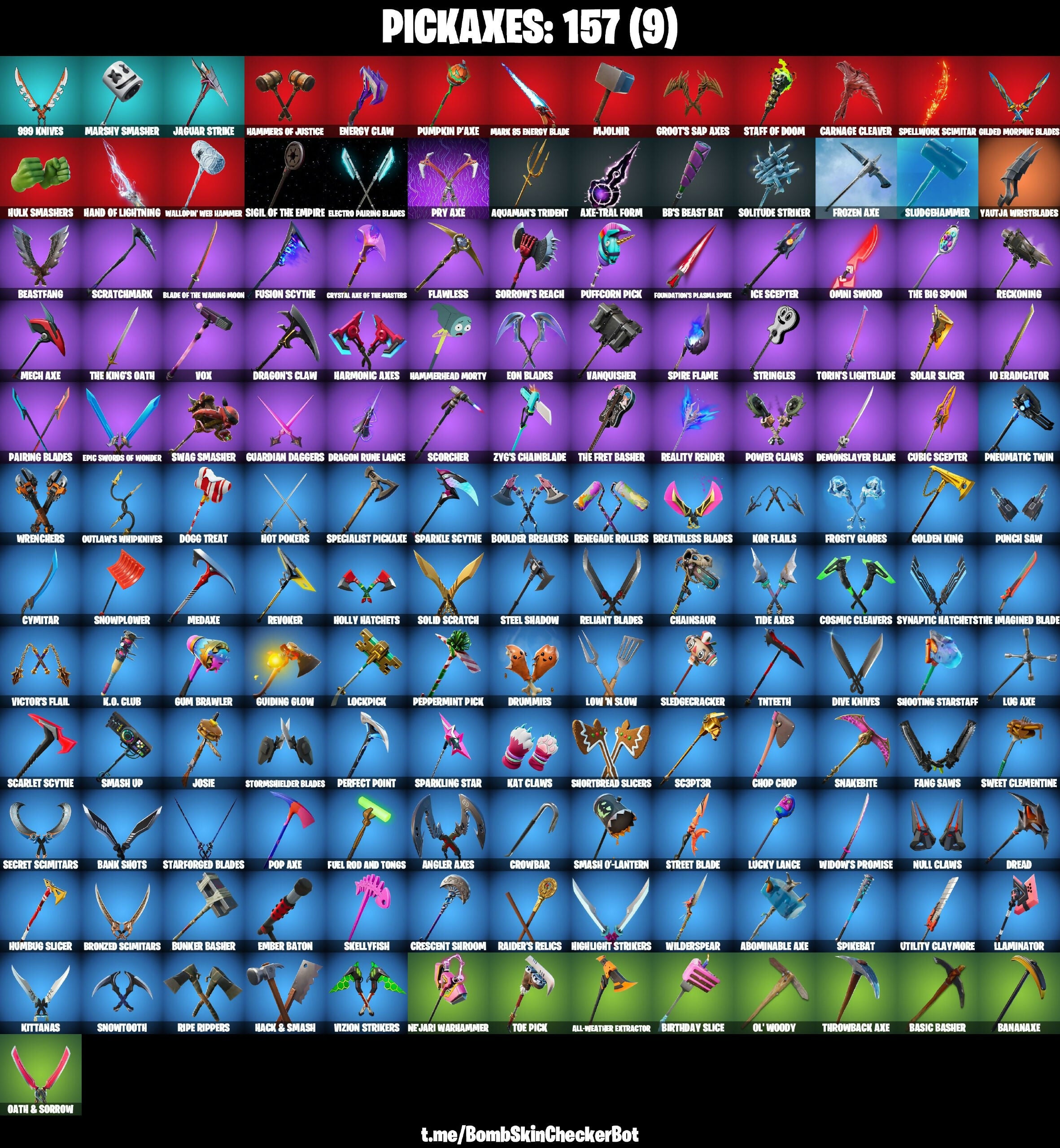 10 Eradicator, 8-Ball Vs Scratch, 999 Knives, A Warrior Prepares, A.I.M., Abominable Axe, Adira, Agent Jones, Agent Peely, Air Shredder, All-weather Extractor, Alli, Andromeda, Angler Axes, Aquaman, Aquaman's Trident, Arctic Adeline, Arm The Pumpkin!, Axe-tral Form, Azarath Metrion Zinthos!, BB's Beast Bat, Bananaxe, Bank Shots, Basic Basher, Bean Bag, Beast Boy, Beastfang, Beep Beep, Birthday Slice, Blackheart, Blade of the Waning Moon, Blizzard Bomber, Blowin' Up, Blowing Bubbles, Boing!, Boobytrapped, Boogie Down, Boomin', Boots 'N' Cats, Boulder Breakers, Breakneck, Breathless Blades, Bronzed Scimitars, Brutus (Fully Golden), Bunker Basher, Bunker Jonesy, Cable, Calamity, Call Me, Cameo Vs Chic, Cardistry, Carnage, Carnage Cleaver, Cat Flip, Catalyst, Chainsaur, Charlotte, Choice Knit, Chop Chop, Chord Kahele, Clark Kent, Clean Sweep, Cloud Striker, Cluck, Cluck Strut, Coin Flip, Conga, Conjure Weapon, Cosmic Cleavers, Crescent Shroom, Crowbar, Crowning Achievement, Crystal Axe of the Masters, Cubic Scepter, Cyclo Curl, Cymitar, Dabstand, Dagger Dance, Dance Off, Daredevil, Darth Vader, Deadpool, Deep End, Deimos, Demi, Demogorgon, Demonslayer Blade, Dire, Dive Knives, Dj Yonder, Doctor Doom, Doctor Sloane, Doctor Strange, Dogg Treat, Dragon Rune Lance, Dragon Stance, Dragon's Claw, Dread, Droop, Drummies, Dusk, Electro Pairing Blades, Ember, Ember Baton, Energy Claw, Eon Blades, Epic Swords of Wonder, Erisa, Eternal Knight, Eternal Voyager, Evasive Maneuvers, Evie, Fabio Sparklemane, Fable, Fade, Fang Saws, Featherweight, Fierce, Fixer, Flamenco, Flawless, Flippin' Away, Foundation's Plasma Spike, Free Flow, Frost Squad, Frosty Globes, Frozen Axe, Fuel Rod and Tongs, Full Tilt, Fusion, Fusion Scythe, Gear Specialist Maya, Gentleman's Dab, Get Funky, Giddy-Up, Gilded Morphic Blades, Golden King, Golf Clap, Good Guy, Green Goblin, Groot, Groot's Sap Axes, Guardian Daggers, Guggimon, Guiding Glow, Gum Brawler, Gumbo, Gunnar, Hack & Smash, Hammerhead Morty, Hammers of Justice, Hand of Lightning, Hand-Forged, Hang Loose Celebration, Harlowe, Harmonic Axes, Harmony, Haven, Heart Sign, Hello Friend, High Five, Highlight Strikers, Holly Hatchets, Hoop Master, Hot Marat, Hot Pokers, Howl, Hula Hoopin', Hulk Smashers, Humbug Slicer, Hybrid, Ice Scepter, Imperial March, Indiana Jones, Infectious, Iris, It Is Finished, It's 60 Time!, It's... You?, J.B. Chimpanski, Jaguar Strike, Jaywalking, Jennifer Walters, Joey, Josie, Journey Vs Hazard, Jules, Jump Jets, Jun-Hwan, K.O. Club, Kat Claws, Katalina, Keep It Mello, Keyed Up, Kiara K.O., Kick Back, Kit, Kittanas, Kondor, Kor, Kor Flails, Krisabelle, Kymera, Laguna, Laid Back Shuffle, Laminator, Lara Croft, Lexa, Lil' Monster, Lil' Prancer, Lil' Rover, Lil' Saucer, Llamabro, Lockpick, Locky Lance, Love It!, Low 'N Slow, Lt. Evergreen, Lt. John Llama, Lug Axe, Lunar Charge, Luxe, Lynx, Major Mancake, Make A Seat, Malcore, Malik, Mancake, Mandalorian, Mark 85 Energy Blade, Marshy Smasher, Mashed Potato, Master Key, Mave, Mech Axe, Medaxe, Menace, Meowscles, Mic Drop, Midas (Fully Golden), Mjolnir, Mwahaha, Mystique, Nailed It, Nana Nana, Nejari Warhammer, Neymar Jr, Nightshade, Null Claws, Oath & Sorrow, Ocean, Ol' Woody, Omni Sword, Onesie, Outlaw's Whipknives, Pairing Blades, Pandemonium, Paws & Claws, Peace Out, Peely, Peppermint Pick, Perfect Point, Planetary Vibe, Pneumatic Twin, Point It Out, Point Patroller, Polar Peely, Pop Axe, Powder, Power Claws, Predator, Prowler, Pry Axe, Puffcorn Pick, Pumped!, Pumpkin P'axe, Punch Saw, Rage, Raider's Relics, Raz, Ready When You Are, Reality Render, Rebirth Raven, Reckoning, Reese, Regal Wave, Reliant Blades, Remedy Vs Toxin, Renegade Rollers, Respect The Peace, Revoker, Rick Sanchez, Ripe Rippers, Rippley Vs Sludge, Ronin, Rox, Ruin, Running Man, SC3PT3R, Sabina, Sad Trombone, Santa Dogg, Scarlet Scythe, Scorcher, Scratchmark, Scuba Jonesy, Secret Scimitars, Seeker, Segway Tour, Sentinel, Sgt. Winter, Shanta, Shaolin Sip, Sharpshooter, Shimmer, Shooting Starstaff, Shortbread Slicers, Show 'Em Off, Shuriken Spinner, Side Hustle, Sidewinder, Sigil of the Empire, Sign Spinner, Sing Along, Singularity, Siona, Ska-Stra-Terrestrial, Skellyfish, Skye, Slayer Juice Wrld, Sled Ready Guff, Sledgecracker, Slitherin', Sludgehammer, Smash O'-Lantern, Smash Up, Snakebite, Snap, Snoozefest, Snowmando, Snowplower, Snowshaker, Snowtooth, So Square, Solar Slicer, Solid Scratch, Solitude Striker, Sorrow's Reach, Sparkle Scythe, Sparkle Supreme, Sparkling Star, Specialist Pickaxe, Spellwork Scimitar, Spider-Man, Spikebat, Spire Assassin, Spire Flame, Springy, Staff of Doom, Starforged Blades, Steady, Steel Shadow, Storm, Stormfarer, Stormshielder Blades, Stormy, Stratus, Street Blade, Stride, Stringles, Sultura, Sunny, Swag Smasher, Sweaty Rotation, Sweet Clementine, Synaptic Hatchets, Take A Bow, Take The Cake, Take The Elf, Tarana, Tart Tycoon, The Big Spoon, The Cube Queen, The Foundation, The Fret Basher, The Ice King, The Imagined, The Imagined Blades, The King's Oath, The Origin, The Prisoner, The Rick Dance, The Scientist, Thor, Throwback Axe, Tide Axes, Tilted Teknique, Tinteth, Tippy Tap, Tntina, Toe Pick, Tony Stark, Toona Fish, Torin, Torin's Lightblade, Tra La La, Trilogy, Trog, Tsuki 2.0, Turk Vs Riptide, Ultima Knight, Utility Claymore, Vanquisher, Vega, Vendetta, Verve, Victor's Flail, Vizion Strikers, Vox, Vulcan Salute, Wakandan Salute, Wallop'in Web Hammer, Wavy T, Widow's Pirouette, Widow's Promise, Wilde, Wilderspear, Wolverine, Wooly Warrior, Wrenchers, X-Lord, Xenomorph, Xoxo, Yautja Wristblades, Yay!, Yond3r, ZVG's Chainblade, Zenith, Zyg