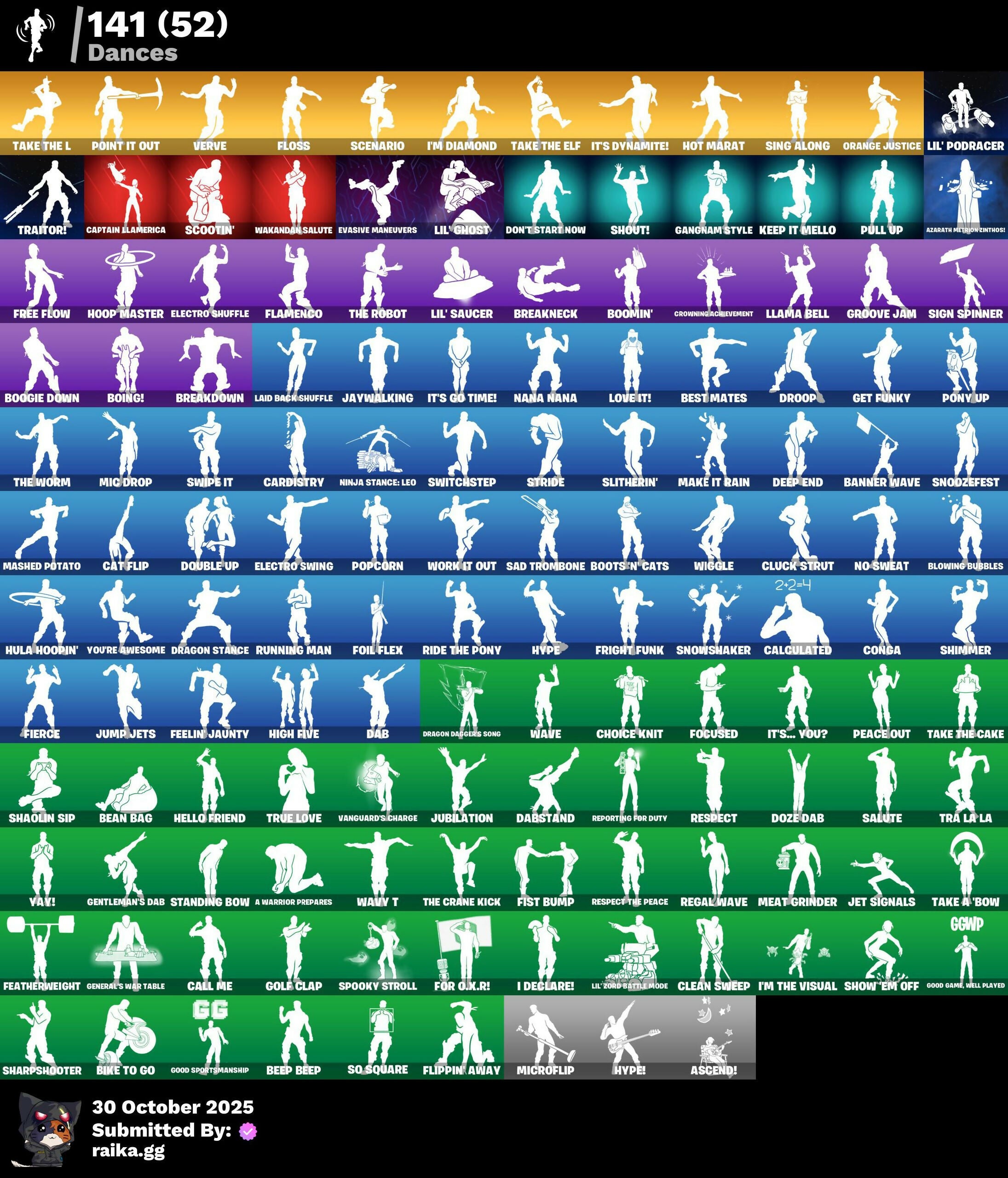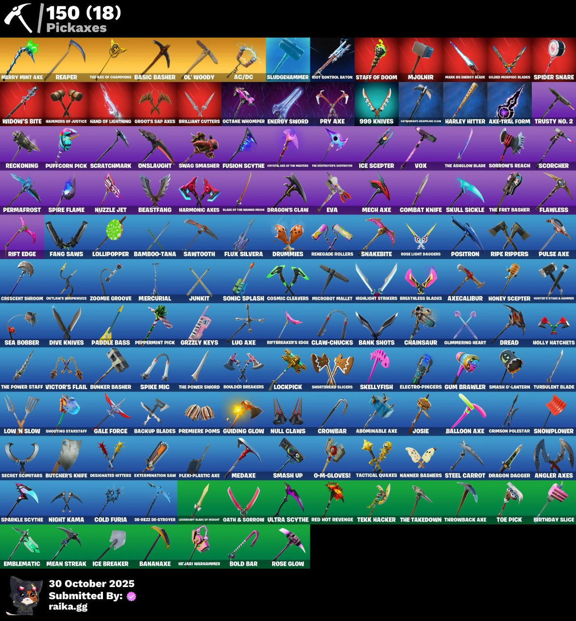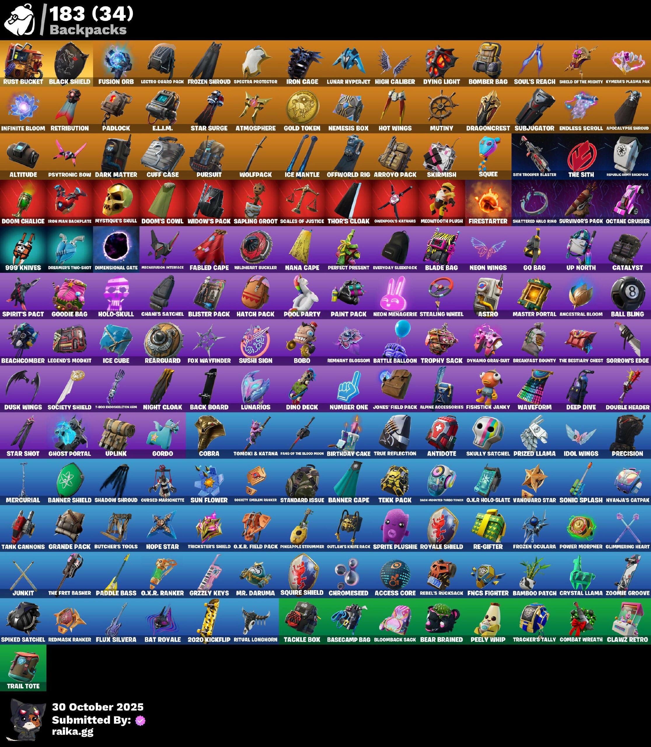2020 Kickflip, 8-Ball vs Scratch, 999 Knives, A Warrior Prepares, A.I.M., AC/DC, Abominable Axe, Access Core, Agent Jones, Agent Patch, Alli, Alpine Accessories, Alpine Ace, Altitude, Ancestral Bloom, Angler Axes, Antidote, Apocalypse Shroud, Arroyo Pack, Ascend!, Assault Trooper, Astro, Astroworld Cyclone, Atmosphere, Axe-Tral Form, Axecalibur, Azarath Metrion Zinthos!, Back Board, Back-Mounted Turbo Toner, Backlash, Backup Blades, Ball Bling, Balloon Axe, Bamboo Patch, Bamboo-Tana, Bananaxe, Bank Shots, Banner Cape, Banner Shield, Banner Trooper, Banner Wave, Basecamp Bag, Basic Basher, Bat Royale, Battle Balloon, Battle Bus, Battle Gamer Mae, Battlehawk, Beachcomber, Bean Bag, Bear Brained, Beast Boy & Raven, Beastfang, Beep Beep, Best Mates, Bike To Go, Birthday Cake, Birthday Slice, Black Knight, Black Shield, Black Widow Outfit, Blackheart, Blade Bag, Blade of the Waning Moon, Blaze, Blister Pack, Blizzabelle, Bloomback Sack, Blowing Bubbles, Blue Squire, Bobo, Boing!, Bold Bar, Bomber Bag, Boogie Down, Boomin', Boots 'N' Cats, Boulder Breakers, Breakdown, Breakfast Bounty, Breakneck, Breathless Blades, Brilliant Cutters, Brite Storm Bomber, Bunker Basher, Bunker Jonesy, Butcher's Knife, Butcher's Tools, Calamity, Calculated, Call Me, Cameo vs Chic, Captain Ilamerica, Carbide, Cardistry, Cat Flip, Catalyst, Catwoman Zero, Catwoman's Grappling Claw, Chainsaur, Champion Surf Witch, Chani, Chani's Satchel, Choice Knit, Chromeseed, Claw-Chucks, Clawz Retro, Clean Sweep, Climmering Heart, Clone Trooper, Cluck, Cluck Strut, Clutch, Cobra, Cold Furia, Combat Knife, Combat Wreath, Conga, Constructor, Cosmic Cleavers, Crescent Shroom, Crimson Polestar, Crowbar, Crowning Achievement, Crystal Axe of the Masters, Crystal Llama, Cuff Case, Cursed Marionette, DJ Yonder, Dab, Dabstand, Dark Matter, Dark Voyager, De-Rezz De-Stroyer, Deep Dive, Deep End, Deimos, Demi, Desert Dominator, Designated Hitters, Dimensional Gate, Dino Deck, Dino Megazord, Dire, Dive Knives, Doctor Doom, Don't Start Now, Doom Chalice, Doom's Cowl, Double Header, Double Up, Doze Dab, Dragon Dagger, Dragon Daggers Song, Dragon Stance, Dragon's Claw, Dragoncrest, Dread, Dreamer's Two-Shot, Drift, Droop, Drummies, Dusk, Dusk Wings, Dying Light, Dynamo Grav-Suit, E.L.I.M., Echo, Electro Shuffle, Electro Swing, Electro-Pincers, Elite Agent, Elite Zadie, Elite's Sigil, Ember, Emblematic, Endless Scroll, Energy Sword, Enforcer, Eternal Voyager, Eva, Evasive Maneuvers, Everyday Sleeppack, Extermination Saw, FNCS Fighter, Fable, Fabled Cape, Fang Saws, Fang of the Blood Moon, Fashion Banshee, Featherweight, Feelin' Jaunty, Fierce, Firestarter, Fishstick Janky, Fist Bump, Flamenco, Flawless, Flippin' Away, Floss, Flux Silvera, Focused, Foil Flex, For O.X.R.!, Founder's Glider, Founder's Umbrella, Fox Wayfinder, Free Flow, Fright Funk, Frozen Oculiara, Frozen Shroud, Fusion, Fusion Orb, Fusion Scythe, GGWP, Gale Force, Gangnam Style, General's War Table, Gentleman's Dab, Get Funky, Ghost Portal, Ghoul Trooper, Giddy-Up, Gilded Morphic Blades, Glimmering Heart, Glow, Go Bag, Gold Token, Golf Clap, Good Game, Well Played, Good Sportsmanship, Goodie Bag, Gordo, Grande Pack, Green Ranger, Grimoire, Grind, Grizzly Keys, Groot, Groot's Sap Axes, Groove Jam, Grzzly Keys, Guiding Glow, Gum Brawler, Hammers of Justice, Hand of Lightning, Harley Hitter, Harmonic Axes, Hatch Pack, Headhunter Prime, Hello Friend, High Caliber, High Five, Highlight Strikers, Holly Hatchets, Holo-Skull, Honey Scepter, Honor Guard, Hoop Master, Hope Star, Hot Marat, Hot Wings, Hula Hoopin', Hunter's Stake & Hammer, Huntress, Hybrid, Hype, Hype!, I Declare!, I'm Diamond, I'm The Visual, Ice Breaker, Ice Cube, Ice Mantle, Ice Scepter, Idol Wings, Ikonik, Infinite Bloom, Iron Cage, Iron Man Backplate, It's Dynamite!, It's Go Time!, It's... You?, Jaywalking, Jennifer Walters, Jet Signals, Jones' Field Pack, Josie, Journey vs Hazard, Jubilation, Jump Jets, Junkit, Keep It Mello, Kondor, Krisabelle, Kymera, Kymera's Plasma Pak, Laguna, Laid Back Shuffle, Lara Croft, Lectro Guard Pack, Legend's Modkit, Legendary Blade of Insight, Lexa, Lil' Ghost, Lil' Podracer, Lil' Saucer, Lil' Zooid Battle Mode, Llama Bell, Llambro, Lockpick, Lollipopper, Love It!, Low 'n Slow, Lt. Evergreen, Lt. Ripp Slade, Lug Axe, Lunar Hyperjet, Lunarios, Luxe, Lynx, Make It Rain, Mancake, Mandalorian, Manic, Mark 85 Energy Blade, Mashed Potato, Master Key, Master Portal, Mave, Mean Streak, Meat Grinder, Mech Axe, Mecha Cuddle Master, Mechafusion Interface, Medaxe, Menace, Meowtooth Plush, Mercurial, Merry Mint Axe, Mic Drop, Microbot Mallet, Microflip, Midfield Maestro, Mission Specialist, Mjolnir, Moonwalker, Mr. Daruma, Mutiny, Mystique, Mystique's Skull, Nana Cape, Nana Nana, Nanner Bashers, Nejari Warhammer, Nemesis Box, Neon Menagerie, Neon Wings, Night Cloak, Night Kama, Nightshade, Ninja Stance: Leo, No Sweat, Null Claws, Number One, Nuzzle Jet, Nyanja's Catpak, O-M-Gloves!, O.X.R Holo-Slate, O.X.R. Field Pack, O.X.R. Ranker, Oath & Sorrow, Octane Cruiser, Octane Whomper, Offworld Rig, Ol' Woody, Omega (Stage 5), Onesie, Onslaught, Onyx Winter, Orange Justice, Outlander, Outlaw's Knife Rack, Outlaw's Whipknives, Owenpool's Katanas, Paddle Bass, Padlock, Paint Pack, Party Trooper, Pastel, Peace Out, Peekaboo, Peely, Peely Whip, Peppermint Pick, Perfect Present, Permafrost, Pig The Butcher, Pineapple Strummer, Plexi-Plastic Axe, Point It Out, Polar Peely, Polly, Pony Up, Pool Party, Popcorn, Positron, Powder, Power Morpher, Precision, Predator, Premiere Poms, Prized Llama, Pry Axe, Psytronic Bow, Puffcorn Pick, Pull Up, Pulse Axe, Pursuit, Ragnarok, Raven, Raz, Re-Gifter, Reaper, Rearguard, Rebel's Rucksack, Rebirth Raven, Reckoning, Red Hot Revenge, Red-Nosed Raider, Redline, Redmask Ranker, Reese, Regal Wave, Remedy vs Toxin, Remnant Blossom, Renegade Rollers, Reporting For Duty, Republic Army Backpack, Respect, Respect The Peace, Retribution, Ride The Pony, Rift Edge, Riftbreaker's Edge, Ri