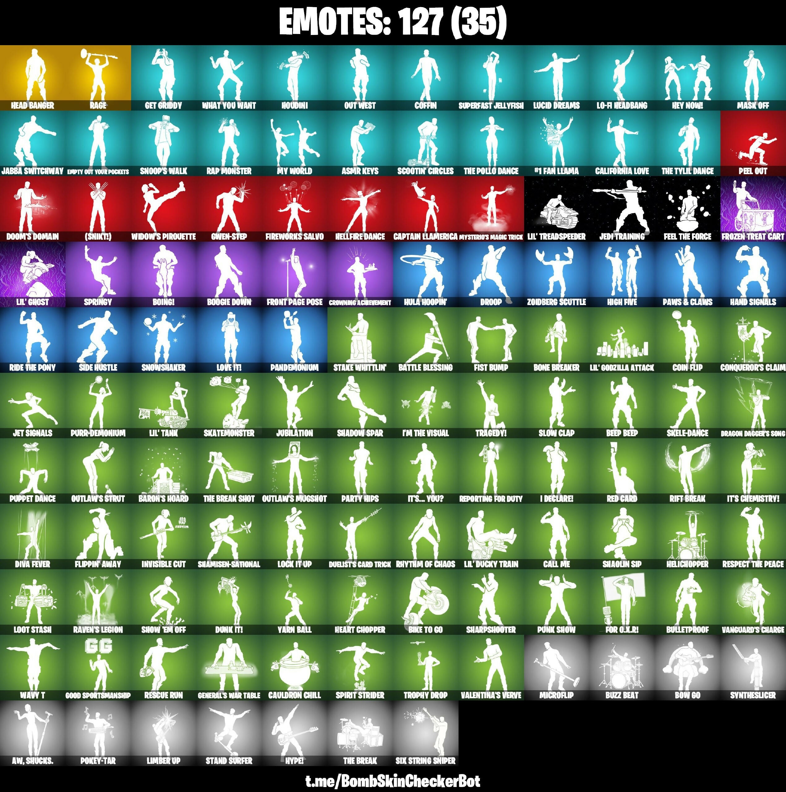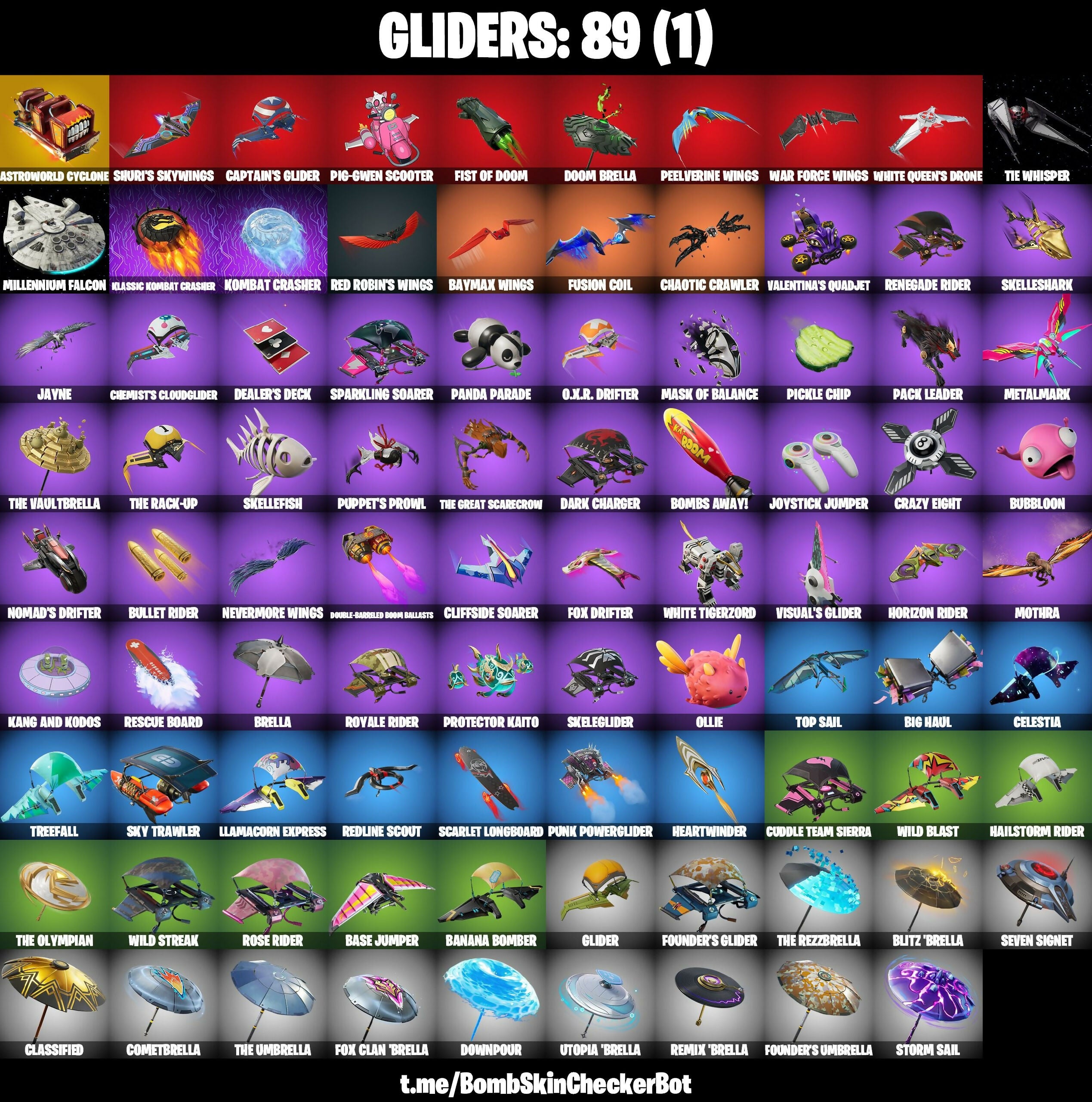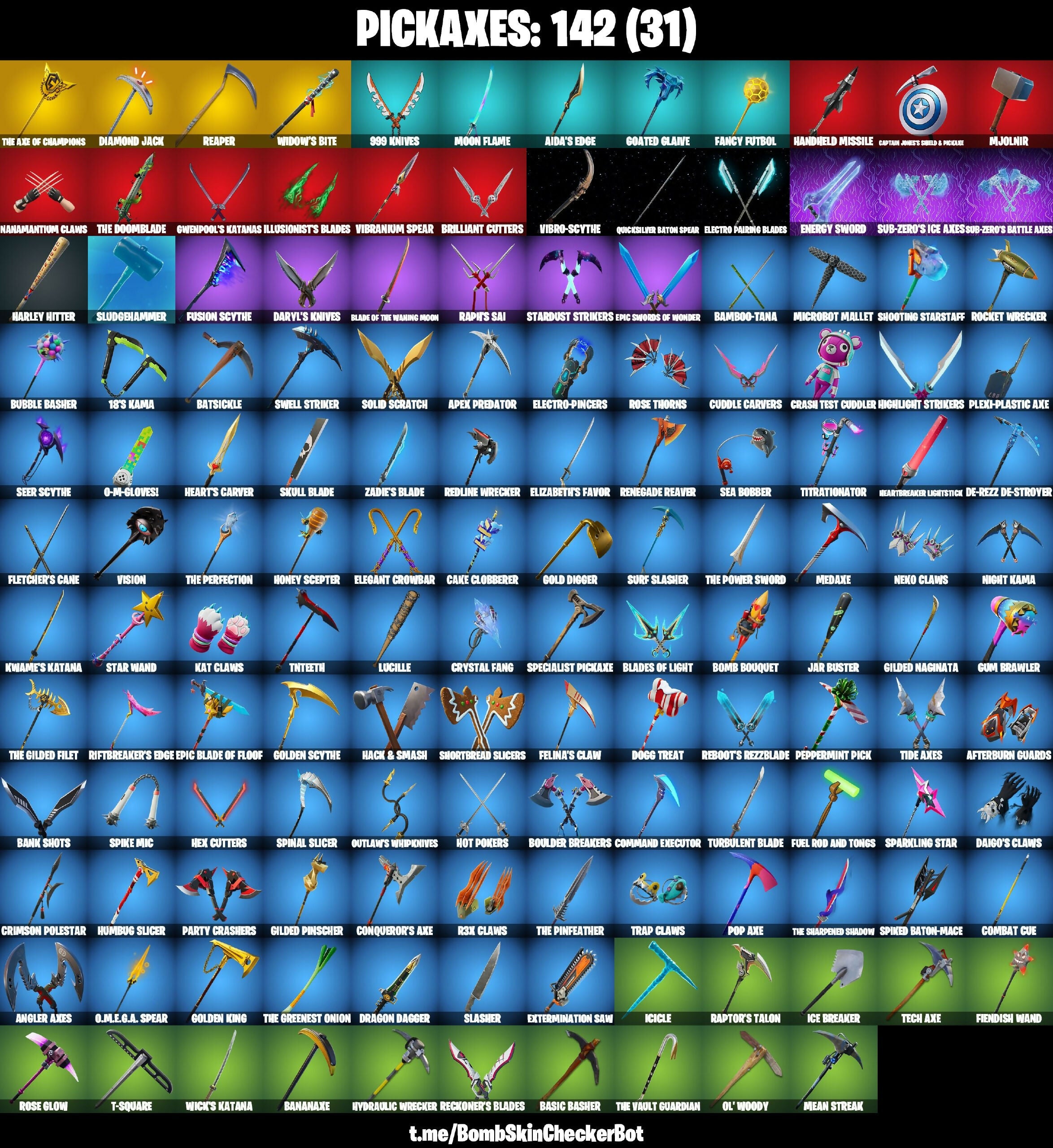 #1 Fan Llama, (SnikT!), 1-Ball, 18's Kama, 8-Ball vs Scratch, 999 Knives, ASMR Keys, Aerial Assault Bomber, Afterburn, Afterburn Guards, Agent Patch, Agent Peely, Aida's Edge, Andy Fangerson, Angler Axes, Apex Predator, Apprentice Evie, Astroworld Cyclone, Augury, Aura, Aw, Shucks., Ayla Winn, Bamboo-Tana, Banana Bomber, Bananaxe, Bank Shots, Baron's Hoard, Base Jumper, Basic Basher, Batsickle, Battle Blessing, Battle Gamer Mae, Baymax Wings, Beach Jules, Beep Beep, Bernie, Big Dill, Big Haul, Bike To Go, Blade Of The Waxing Moon, Blades Of Light, Blitz 'Brella, Blitz Knight, Boing!, Bomb Bouquet, Bombs Away!, Bone Breaker, Bones, Boogie Down, Boulder Breakers, Bow Go, Brella, Brilliant Cutters, Brutus, Bubble Basher, Bubbloon, Bullet Rider, Bulletproof, Buzz Beat, Cable, Cake Clobberer, California Love, Call Me, Cameo vs Chic, Captain America's Shield & Pickaxe, Captain Jones, Captain Llamerica, Captain Phasma, Captain's Glider, Carmine Rosso, Cassidy Quinn, Castaway Jonesy, Cauldron Chill, Celestia, Champion Kuno, Champion Surf Witch, Chani, Chaos Director, Chaotic Crawler, Chemist's Cloudglider, Chica, Classified, Cliffside Soarer, Codename E.L.F., Coffin, Coin Flip, Combat Cue, Cometbrella, Command Executor, Conqueror's Axe, Conqueror's Claim, Crash Test Cuddler, Crazy Eight, Crimson Polestar, Crowning Achievement, Crystal Fang, Cuddle Carvers, Cuddle Team Leader, Cuddle Team Sierra, Cuddle Team Specialist, Daigo, Daigo's Claws, Danica, Dark Bomber, Dark Charger, Daryl Dixon, Daryl's Knives, De-Rezz De-Stroyer, Deadpool, Dealer's Deck, Diamond Jack, Die with a Smile Bruno, Diva Fever, Dogg Treat, Domino, Doom, Doom Brella, Doom's Domain, Double-Barreled Boom Ballasts, Downpour, Dragon Dagger, Dragon Dagger's Song, Dream, Droop, Duelist's Card Trick, Duke, Dunk It!, Durrr Taisho, Dynamo Tntina, Electro Pairing Blades, Electro-Pincers, Elegant Crowbar, Eleven, Elizabeth Swann, Elizabeth's Favor, Emma Frost, Empty Out Your Pockets, Energy Sword, Epic Blade Of Floof, Epic Swords Of Wonder, Explorer Emilie, Extermination Saw, Fade, Fancy Futbol, Feel The Force, Felina, Felina's Claw, Fiendish Wand, Finesse Finisher, Fireworks Salvo, First Order Stormtrooper, Fist Bump, Fist of Doom, Fletcher Kane, Fletcher's Cane, Flippin' Away, For O.X.R.!, Founder's Glider, Founder's Umbrella, Fox Clan 'Brella, Fox Drifter, Front Page Pose, Frozen Fishstick, Frozen Nog Ops, Frozen Treat Cart, Fuel Rod And Tongs, Fusion, Fusion Coil, Fusion Scythe, Galaxy Scout, Gear Specialist Maya, General's War Table, Get Griddy, Gilded Naginata, Gilded Pinscher, Glider, Goated Glaive, Godzilla Evolved, Gold Digger, Golden King, Golden Scythe, Good Sportsmanship, Goosebumps, Green Ranger, Gum Brawler, Gwen-Step, Gwenpool, Gwenpool's Katanas, Hack & Smash, Hailstorm Rider, Hana Park, Hand Signals, Handheld Missile, Harley Hitter, Haruka of the Masks, Head Banger, Headhunter Prime, Heart Chopper, Heart's Carver, Heartbreaker Lightstick, Heartwinder, Helichopper, Hellfire Dance, Hero Baymax, Hex Cutters, Hey Now!, High Five, Highlight Strikers, Honey Scepter, Horizon Rider, Hot Pokers, Houdini, Hula Hoopin', Humbug Slicer, Hydraulic Wrecker, Hype!, I Declare!, I'm The Visual, Ice Breaker, Icicle, Illusionist's Blades, Invisible Cut, Iris, It's Chemistry!, It's... You?, Jabba Switchway, Jade, Jar Buster, Jayne, Jedi Training, Jet Signals, Joltara, Joss, Journey vs Hazard, Joystick Jumper, Jubilation, Juice Wrld, Kang and Kodos, Kat Claws, Katalina, Keisha Cross, Kendo, Kitana (Mk3), Klassic Kombat Crasher, Knight Conqueror, Kombat Crasher, Krykan Arvek, Kwame, Kwame's Katana, LBC '93 Dogg, Lady of Cranes, Lewis Hamilton, Lil' Ducky Train, Lil' Ghost, Lil' Godzilla Attack, Lil' Tank, Lil' Treadspeeder, Limber Up, Lionel Messi, Lllamacorn Express, Lo-Fi Headbang, Lock It Up, Loot Stash, Love It!, Lt. Ripp Slade, Lucid Dreams, Lucille, Marked Marauder, Marshall Never More, Mask Off, Mask of Balance, Mean Streak, Mecha Rex, Medaxe, Meowdas, Meowscles, Metalmark, Microbot Mallet, Microflip, Midas (Fully Golden), Millennium Falcon, Mjolnir, Moon Flame, Mothra, Mr. Dappermint, Murdoc, My World, Mysterio, Mysterio's Magic Trick, Nanomantium Claws, Neko Claws, Neko Hatsune Miku, Nevermore Wings, Night Kama, Nomad's Drifter, Nyangelica, Nyanja, O-M-Gloves!, O.M.E.G.A Suit Alpha, O.M.E.G.A. Spear, O.X.R. Drifter, Ocean, Ol' Woody, Ollie, Omen Hunter Calamity, Onyx Winter, Out West, Outlaw Midas, Outlaw's Mugshot, Outlaw's Strut, Outlaw's Whipknives, P.A.N.D.A Team Leader, Pack Leader, Panda Parade, Pandemonium, Par Patroller, Party Crashers, Party Hips, Paws & Claws, Peel Out, Peelverine, Peelverine Wings, Peppermint Pick, Per Aspera Ad Astra, Pickle Chip, Pig-Gwen Scooter, Plexi-Plastic Axe, Point Patroller, Pokey-Tar, Polly, Pop Axe, Power Punk, Protector Kato, Psylocke, Punk Powerglider, Punk Show, Puppet Dance, Puppet's Prowl, Purr-Demonium, Quicksilver Baton Spear, R3X Claws, Rage, Rap Monster, Rapha's Sai, Raphael, Raptor's Talon, Raven Team Syd, Raven's Legion, Reaper, Rebel Oro, Reboot Man, Reboot's Rezzblade, Reckoner's Blades, Recon Raptor, Red Card, Red Robins Wings, Red-Nosed Raider, Redline Racer, Redline Scout, Redline Wrecker, Remedy vs Toxin, Remix 'Brella, Renegade, Renegade Reaver, Renegade Rebel, Renegade Rider, Reporting For Duty, Rescue Board, Rescue Run, Respect The Peace, Rhythm Of Chaos, Rick Grimes, Ride The Pony, Rift Break, Riftbreaker's Edge, Riftreaver Drift, Rippley vs Sludge, Robin, Rocket Wrecker, Rose Glow, Rose Rider, Rose Team Leader, Rose Thorns, Royale Rider, Rubius, Russel, Sabrina Carpenter, Safari, Sagan, Sanctum, Santa Dogg, Scarlet Longboard, Scootin' Circles, Sea Bobber, Sedona, Seer Scythe, Seven Signet, Shadow Blade Hope, Shadow Spar, Shady Doggo, Shamisen-Sational, Shaolin Sip, Sharpshooter, Shooting Starstaff, Shortbread Slicers, Show 'Em Off, Shuri, Shuri's Skywings, Side Hostile, Sir Raven, Siren, Six String Sniper, Skatemonster, Skele-Dance, Skeleglider, Skellefish, Skelleshark, Skul