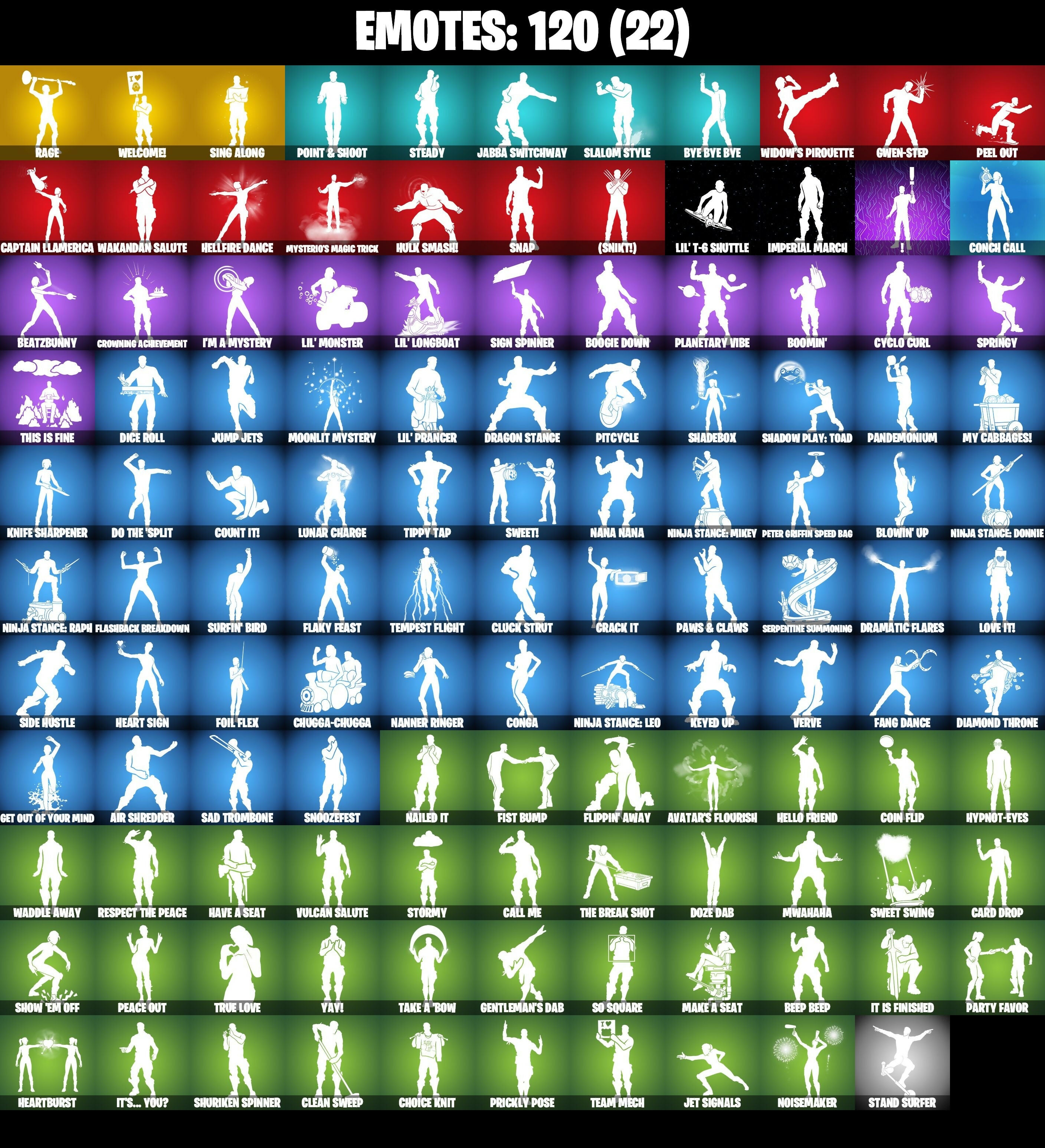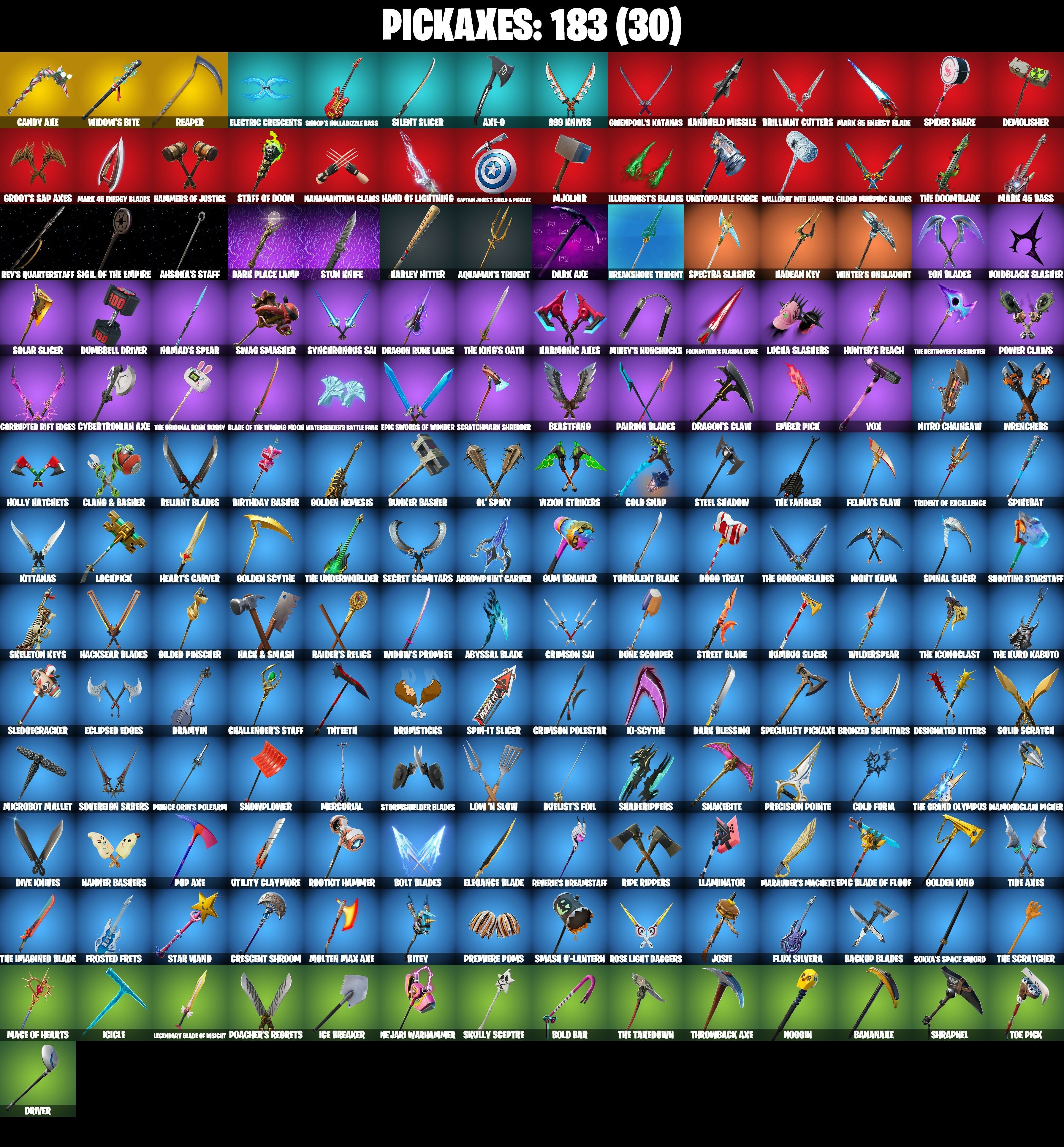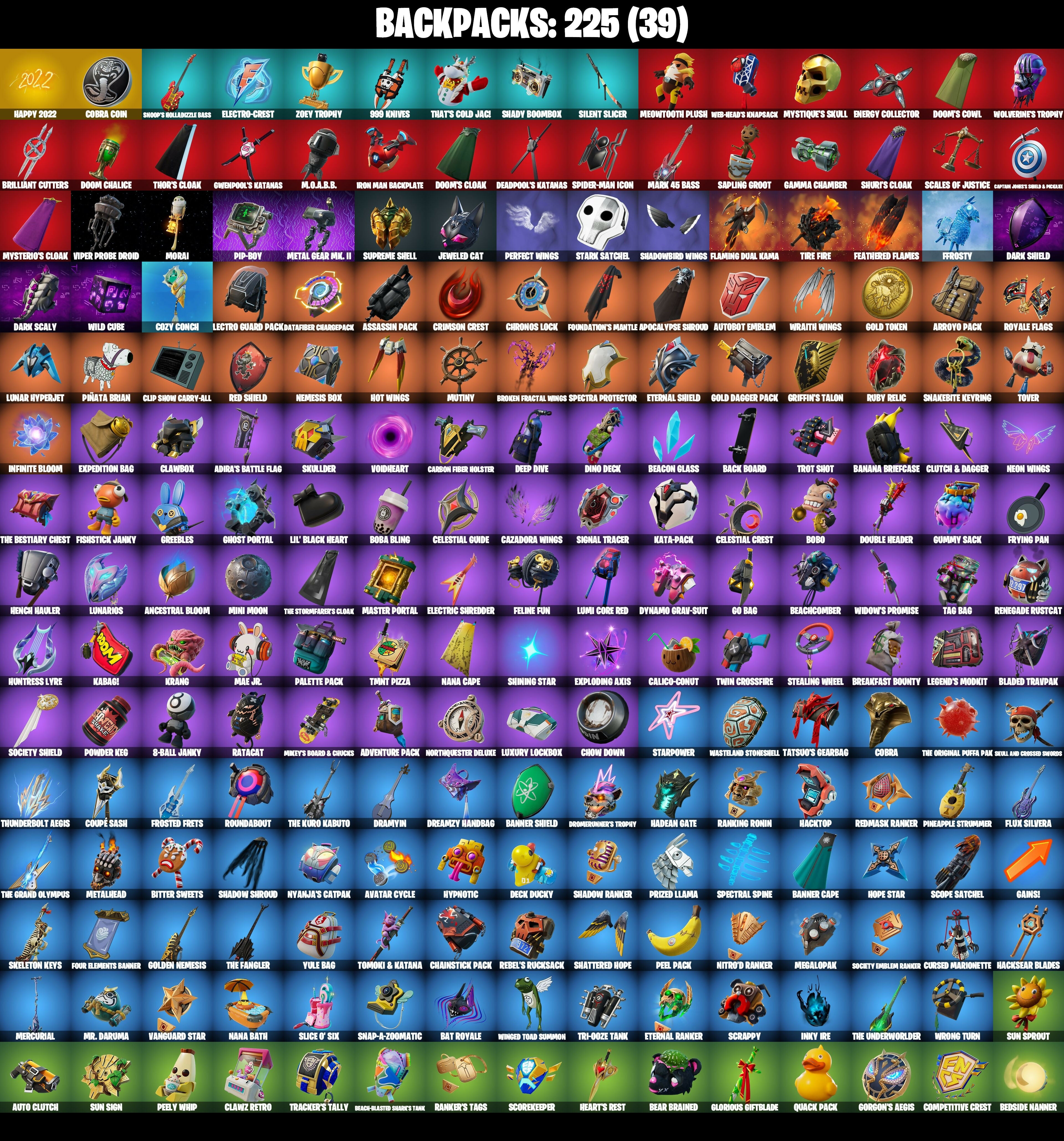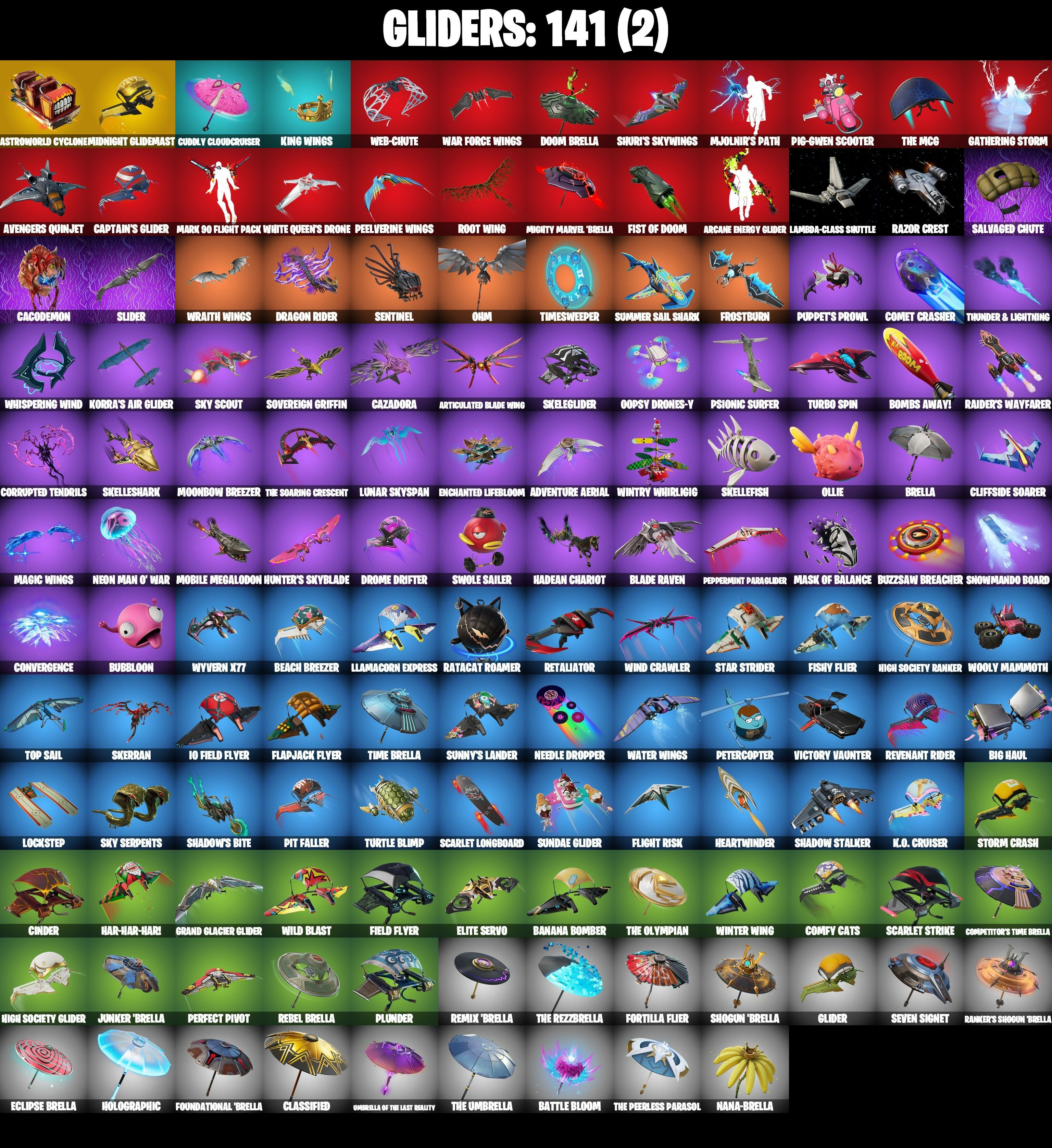(Snikt!), 8-Ball Janky, 999 Knives, Absez, Abstrakt, Abyssal Blade, Adira, Adira's Battle Flag, Adventure Aerial, Adventure Pack, Agent Peely, Ahsoka Tano, Ahsoka's Staff, Air Shredder, Ancestral Bloom, Antonia, Antonia (Yellow Diamond), Aphrodite, Apocalypse Shroud, Aquaman, Aquaman's Trident, Arcane Energy Glider, Arctic Adeline, Arrowpoint Carver, Arroyo Pack, Artemis, Articulated Blade Wing, Assassin Pack, Astra, Astrea, Astroworld Cyclone, Auto Clutch, Autobot Emblem, Avatar Cycle, Avatar's Flourish, Avengers Quinjet, Axe-O, Back Board, Backup Blades, Banana Bomber, Banana Briefcase, Bananaxe, Banner Cape, Banner Shield, Bat Royale, Battle Bloom, Beach Breezer, Beach-Blast Shark's Tank, Beachcomber, Beacon Glass, Bear Brained, Beastfang, Beatzbunny, Bedside Manner, Beep Beep, Big Haul, Birthday Basher, Bitey, Bitter Sweets, Blackheart, Blade Raven, Blade of the Waning Moon, Bladed Travpak, Blowin' Up, Boba Bling, Bobo, Bold Bar, Bolt Blades, Bombs Away!, Boogie Down, Boomin', Breakfast Bounty, Breakshore Trident, Brella, Brilliant Cutters, Broken Fractal Wings, Bronzed Scimitars, Brutus (Fully Golden), Bubbloon, Bugha, Bunker Basher, Bunker Jonesy, Buzzsaw Breacher, Bye Bye Bye, Cacodemon, Calico-Coconut, Call Me, Candy Axe, Caper, Captain America’s Shield & Pickaxe, Captain James Shield & Pickle, Captain Jones, Captain Llamerica, Captain's Glider, Carbon Fiber Holster, Card Drop, Catwoman Comic Book Outfit, Cazadora, Cazadora Wings, Celestial Crest, Celestial Guide, Cerberus, Cerberus (Blazing Fire Cerberus), Chainstick Pack, Challenger's Staff, Chillout, Choice Knit, Chow Down, Chronos Lock, Chugga-Chugga, Cinder, Clang & Basher, Clara, Classified, Clawbox, Clawz Retro, Clean Sweep, Cliffside Soarer, Clip Show Carry-All, Cluck Strut, Clutch & Dagger, Cobra, Cobra Coin, Coin Flip, Cold Furia, Cold Snap, Combat Tech Jules, Comet Crasher, Comfy Cats, Competitive Crest, Competitor's Time Brella, Conch Call, Conga, Convergence, Corrupted Rift Edges, Corrupted Tendrils, Count It!, Coupe Sash, Cozy Conch, Crack It, Crescent Shroom, Crimson Crest, Crimson Polestar, Crimson Sai, Crowning Achievement, Cryptic, Crystal, Cuddly Cloudcruiser, Cursed Marionette, Cybertronian Axe, Cyclo Curl, D'Ark, Dark Axe, Dark Blessing, Dark Jonesy, Dark Place Lamp, Dark Red Knight, Dark Rex, Dark Scaly, Dark Shield, Dark Wild Card, Darth Vader, Datafiber Chargepack, Deadpool, Deadpool's Katanas, Deck Docky, Deep Dive, Demi, Demolisher, Designated Hitters, Diamond Hanz, Diamond Throne, Diamondclaw Picker, Dice Roll, Dino Deck, Dive Knives, Do The 'Split, Doctor Doom, Dogg Treat, Doggo, Doom, Doom Brella, Doom Chalice, Doom's Cloak, Doom's Cowl, Double Header, Doze Dab, Dragon Rider, Dragon Rune Lance, Dragon Stance, Dragon's Claw, Dramatic Flares, Dramyin, Dreamzy Handbag, Driftwalker, Driver, Drome Drifter, Dromerunner's Trophy, Drumsticks, Duelist's Foil, Dumbbell Driver, Dummy, Dune Scooper, Dynamo Grav-Suit, Eclipse Brella, Eclipsed Edges, Electric Crescents, Electric Shredder, Electro-Crest, Elegance Blade, Elite Servo, Ember Pick, Emma Frost, Enchanted Lifebloom, Energy Collector, Eon Blades, Epic Blade of Floof, Epic Swords of Wonder, Era, Eternal Knight, Eternal Ranker, Eternal Shield, Evie, Expedition Bag, Exploding Axis, Explorer Emile, Fade, Fang Dance, Feathered Flames, Felina, Felina's Claw, Feline Fun, Field Flyer, Fish Thicc, Fish Thicc (RDR Cave Fish Thicc), Fishstick Janky, Fishy Flier, Fist Bump, Fist of Doom, Flakes Power, Flaky Feast, Flaming Dual Kama, Flapjack Flyer, Flashback Breakdown, Flight Risk, Flippin' Away, Flux Silvera, Flying Pan, Foil Flex, Fortilla Flier, Foundation's Mantle, Foundation's Plasma Spike, Foundational 'Brella, Four Elements Banner, Frostburn, Frosted Frets, Frosty, Gains!, Gamma Chamber, Gathering Storm, Gear Specialist Maya, Gentleman's Dab, Get Out Of Your Mind, Ghost Enforcer, Ghost Portal, Ghoul Trooper, Gilded Morphic Blades, Gilded Pinscher, Gingerbread Raider, Glider, Glorious Giftblade, Go Bag, Gold Dagger Pack, Gold Token, Golden King, Golden Nemesis, Golden Scythe, Gorgon's Aegis, Grand Glacier Glider, Greebles, Griffin's Talon, Groot, Groots Sap Axes, Guild, Gum Brawler, Gumbo, Gumbo (Sour Gumbo), Gummy Fishstick, Gummy Sack, Gwen-Step, Gwenpool, Gwenpool's Katanas, Hack & Smash, Hacksear Blades, Hacktop, Hadean Chariot, Hadean Gate, Hadean Key, Hades, Hammers of Justice, Hand of Lightning, Handheld Missile, Happy 2022, Har-Har-Har!, Harley Hitter, Harlowe, Harmonic Axes, Have A Seat, Haven, Haxsaur, He-Jari Warhammer, Heart Sign, Heart's Rest, Heartburst, Hearts Carver, Heartwinder, Hellfire Dance, Hello Friend, High Society Glider, High Society Ranker, Holiday Boxy, Holly Hatchets, Holographic, Hope, Hope Star, Hot Wings, Hulk, Hulk Smash!, Humbug Slicer, Hunter's Reach, Hunter's Skyblade, Huntress Lyre, Hybrid, Hypnot-Eyes, Hypnotic, I'm A Mystery, IO Field Flyer, Ice Breaker, Icicle, Illusionist's Blades, Imperial March, Incinerator Kuno, Indiana Jones, Infinite Bloom, Inky Ike, Iris, Iron Man Backplate, Iron Man Mk 45, Iso, It Is Finished, It's... You?, Jabba Switchway, Jennifer Walters, Jet Signals, Jeweled Cat, John Wick, Jonesy The First, Josie, Jules, Jules (Shadow Jules), Jump Jets, Junker 'Brella, K.O. Cruiser, Kabagi, Kado Thorne, Kata-Pack, Keyed Up, Ki-Scythe, King Wings, Kit, Kit (Action Kit), Kittanas, Knife Sharpener, Korra, Korra (Balanced), Korra's Air Glider, Krang, Krisabelle, Lagona, Lambda-Class Shuttle, Lectro Guard Pack, Legend's Modkit, Legendary Blade of Insight, Lil Spilt, Lil Spilt (Time Breaker Lil Spilt), Lil' Black Heart, Lil' Longboat, Lil' Monster, Lil' Prancer, Lil' T-6 Shuttle, Llaminator, Lllamacorn Express, Lockpick, Lockstep, Longshot, Lorenzo, Love It!, Low 'n Slow, Lt. John Llama, Lucha Slashers, Lumi Core Red, Lunar Charge, Lunar Hyperjet, Lunar Skyspan, Lunarios, Luxury Lockbox, M.O.A.B.B., Mace of Hearts, Mae, Mae Jr., Magic Wings, Make A Seat, Malik, Mancake, Mandalorian, Marauder's Machete, Mariposa, Ma