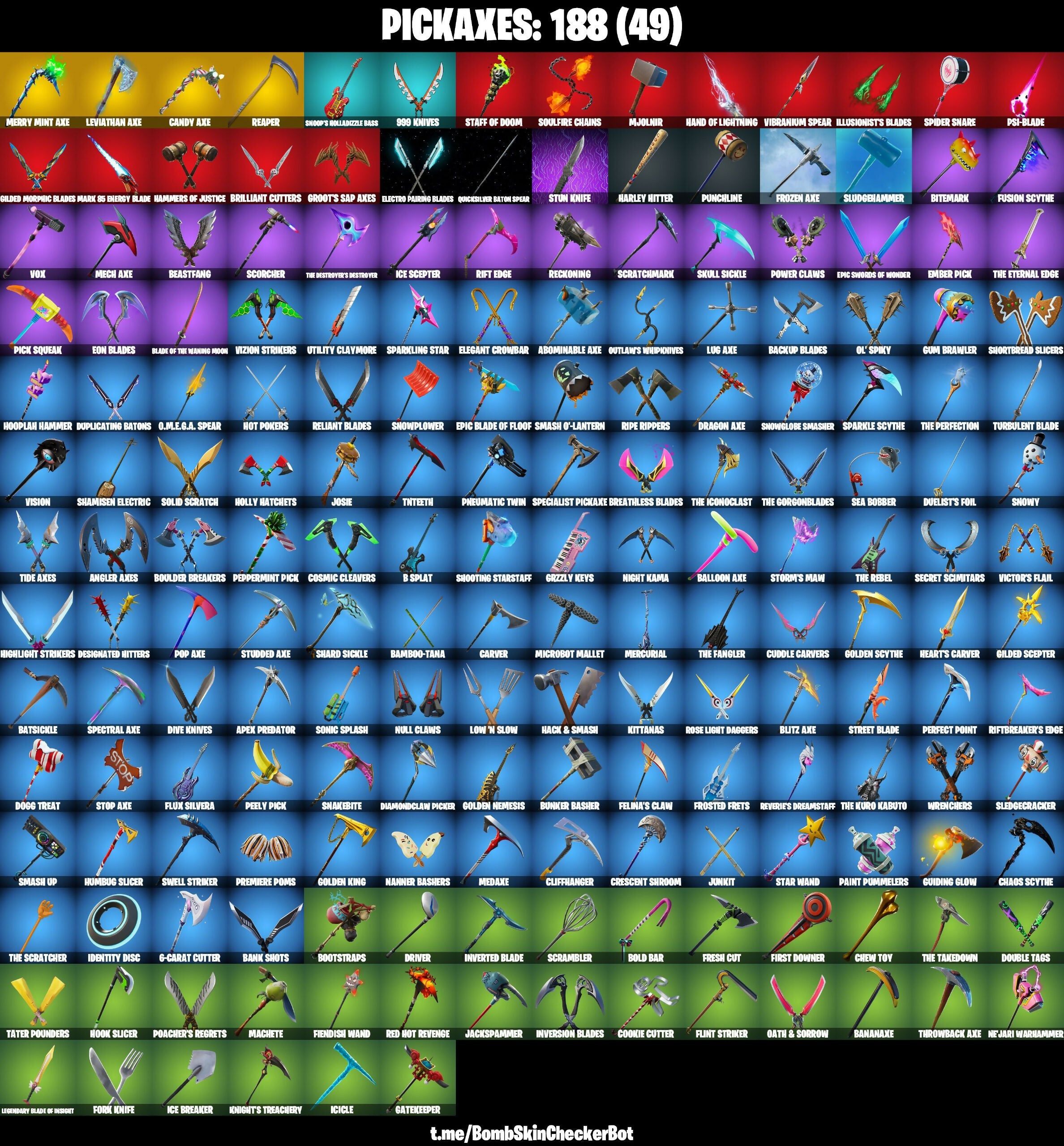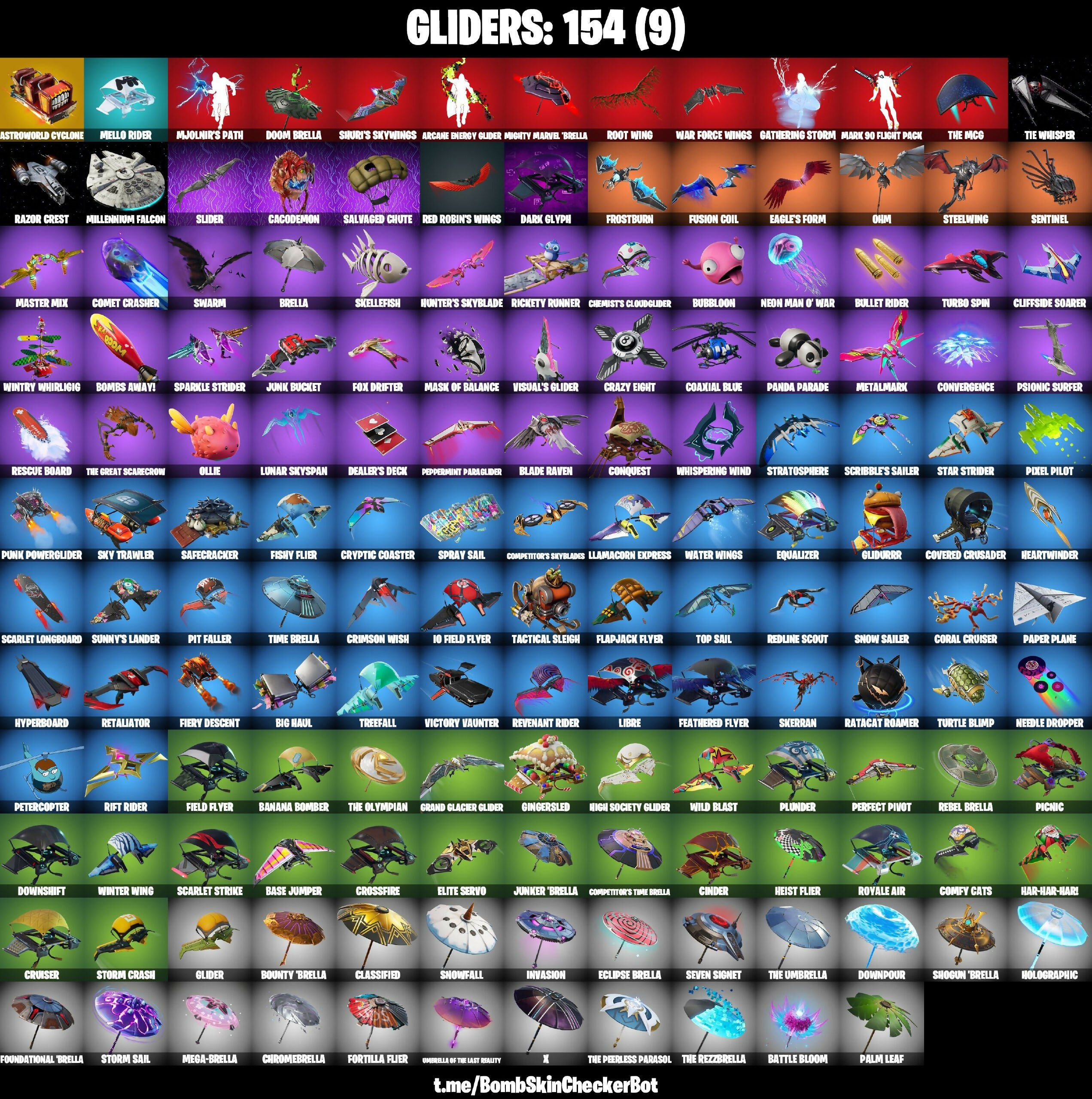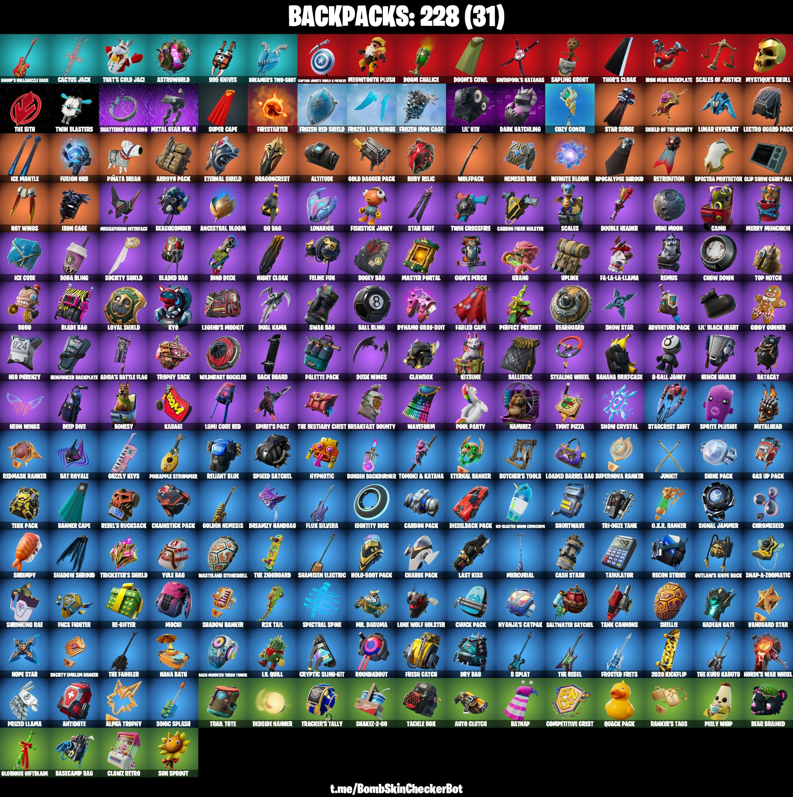 10 Field Flyer, 2020 Kickflip, 6-Carat Cutter, 8 Splat, 8-Ball Janky, 8-Ball Vs Scratch, 999 Knives, A Warrior Prepares, Abominable Axe, Adira's Battle Flag, Adventure Pack, Agent Peely, Air Horn, Air Shredder, Alpha Trophy, Altitude, Ancestral Bloom, Angler Axes, Antidote, Apex Predator, Apocalypse Shroud, Arcane Energy Glider, Arctic Adeline, Arroyo Pack, Astro Jack, Astroworld, Astroworld Cyclone, Aura, Auto Clutch, B Splat, Bachii, Back Board, Backup Blades, Ball Bling, Ballistic, Balloon Axe, Bamboo-Tana, Banana Bomber, Banana Briefcase, Bananaxe, Bank Shots, Banner Cape, Baron's Hoard, Base Jumper, Basecamp Bag, Bat Royale, Batnap, Batsickle, Battle Bloom, Beachcomber, Bear Brained, Beastfang, Bedside Manner, Beep Beep, Behold!, Big Haul, Bike To Go, Bike-Mounted Turbo Tower, Birdie, Bitemark, Blade Bag, Blade Of The Waning Moon, Blade Raven, Bladed Bag, Blaze, Blitz Axe, Blitz Knight, Bloomin' Bouquet, Blowing Bubbles, Boba Bling, Bobo, Bogey Bag, Boing!, Bold Bar, Bombastic, Bombs Away!, Bonesy, Boogeyman, Boogie Down, Boomin', Bootstraps, Boulder Breakers, Bounce Berry, Bounty 'Brella, Breakfast Bounty, Breaking Point, Breakneck, Breakpoint, Breezy, Brella, Brilliant Cutters, Brutus (Fully Golden), Bubloon, Buckets, Bullet Rider, Bullseye, Bunker Basher, Bunker Jonesy, Bunsen Backburner, Burpee, Busy, Butcher's Tools, Cacodemon, Cactus Jack, Calamity, Calculated, Call Me, Cameo Vs Chic, Camo, Candy Axe, Cap Kick, Captain America Shield & Sheild, Captain L'America, Carbon Commando, Carbon Fiber Holster, Carbon Pack, Card Drop, Carver, Cash Stash, Cat Flip, Catalyst, Cauldron Chill, Chainstick Pack, Chaos Scythe, Charge Pack, Chemist's Cloudglider, Chew Toy, Chill Count, Choice Knit, Chow Down, Chrome Punk, ChromeBrella, Chromeseed, Chuck Pack, Cinder, Classified, Classy Strut, Clawbox, Clawz Retro, Clean Sweep, Cliffhanger, Cliffside Soarer, Clinical Crosser, Clip Show Carry-All, Cluck Strut, Coaxial Blue, Cobalt, Coin Flip, Comet Crasher, Comfy Cats, Commandline, Commando, Competitive Crest, Competitor's Skyblades, Competitor's Time Brella, Conquest, Convergence, Cookie Cutter, Coral Cruiser, Cosmic Cleavers, Covered Crusader, Cozy Conch, Crabby, Crazy Eight, Crescent Shroom, Crimson Wish, Crossfire, Crowning Achievement, Cruiser, Cryptic, Cryptic Coaster, Cryptic Sling-Kit, Crystal, Cuddle Carvers, Curling Iron, Dabstand, Dancin' Domino, Dark Glyph, Dark Hatchling, Dark Tricera Ops, Deadpool, Dealer's Deck, Deep Dive, Demi, Denied, Designated Hitters, Diamond Diva, Diamond Throne, Diamondclaw Picker, Dieselback Pack, Dino Deck, Dire, Disc Spinner, Dive Knives, Dj Yonder, Doctor Doom, Dogg Treat, Doggo, Doom Brella, Doom Chalice, Doom's Cowl, Double Header, Double Tags, Downpour, Downshift, Doze Dab, Dragon Axe, Dragoncrest, Dream Feet, Dreamer's Two-Shot, Dreamzy Handbag, Drift, Drift (Stage 5), Driver, Droop, Dry Bag, Dual Kama, Duelist’s Foil, Duplicating Batons, Dusk, Dusk Wings, Dynamo, Dynamo Grab-Suit, Eagle's Form, Eclipse Brella, Electro Pairing Blades, Electro Swing, Elegant Crowbar, Elite Servo, Ember Pick, Eon Blades, Epic Blade Of Floof, Epic Swords Of Wonder, Equalizer, Eternal Knight, Eternal Ranker, Eternal Shield, Eternal Voyager, FNCS Fighter, Fa-La-La-Llama, Fable, Fabled Cape, Face Palm, Fade, Feathered Flyer, Featherweight, Felina, Felina’s Claw, Feline Fun, Field Flyer, Fiendish Wand, Fiery Descent, Firestarter, First Downer, First Order Banner, Fishstick, Fishstick Janky, Fishy Flier, Fist Bump, Flamenco, Flapjack Flyer, Flashy Fishwork, Flint Striker, Flippin' Away, Flux Silvera, Focus, Foil Flex, Follow The Butterfly, Fork Knife, Fortilla Flier, Foundational 'Brella, Fox Drifter, Free Flow, Fresh Catch, Fresh Cut, Frostburn, Frosted Frets, Frozen Axe, Frozen Iron Cage, Frozen Love Ranger, Frozen Love Wings, Frozen Raven, Frozen Red Knight, Frozen Red Shield, Fusion, Fusion Coil, Fusion Orb, Fusion Scythe, Garrison, Gas Up Pack, Gatekeeper, Gathering Storm, Gear Specialist Maya, Gentleman's Dab, Get Funky, Ghoul Trooper, Giddy Gunner, Giddy-Up, Gilded Morphic Blades, Gilded Scepter, Ginger Gunner, Gingersled, Glider, Glidurr, Glorious Giftblade, Go Bag, Go Home!, Go Mufasa, Gold Dagger Pack, Golden King, Golden Nemesis, Golden Scythe, Golf Clap, Good Sportsmanship, Grand Glacier Glider, Grizzly Keys, Groot, Groot’s Sap Axes, Guan Yu, Guff Gringle, Guiding Glow, Gum Brawler, Gun Show, Gwenpool's Katanas, Hack & Smash, Hadean Gate, Hamirez, Hammers Of Justice, Hand Of Lightning, Har-Har-Hari, Harley Hitter, Harley Quinn, Have A Seat, Head Banger, Heartwinder, Heart’s Carver, Heist Flier, Hello Friend, Hench Hauler, High Five, High Society Glider, Highlight Strikers, Holiday Boxy, Holly Hatchets, Holo-Boot Pack, Holographic, Hook Slicer, Hooplah Hammer, Hope, Hope Star, Hoppity, Horde's War Wheel, Hot Marat, Hot Pokers, Hot Wings, Howl, Hula Hoopin, Humbug Slicer, Hunter's Skyblade, Huntress, Hyperboard, Hypnot-Eyes, Hypnotic, I Declare!, I'm A Mystery, Ice Breaker, Ice Cube, Ice Mantle, Ice Scepter, Ice-Blasted Snow Crunch, Icicle, Identity Disc, Illusionist’s Blades, Infinite Bloom, Infinite Dab, Introducing..., Invasion, Inversion Blades, Inverted Blade, Iris, Iron Cage, Iron Man Backplate, It Is Finished, It's Go Time!, It's... You?, Jackie, Jackspammer, Jaywalking, Jellie, Jennifer Walters, Josie, Journey Vs Hazard, Jubilation, Jules, Jump Around, Jump Jets, Jungle Scout, Junk Bucket, Junker 'Brella, Junkit, Kabagi, Keyed Up, Kiss The Cup, Kit, Kitsune, Kittanas, Knife Sharpener, Knight’s Treachery, Kondor, Krang, Kuno, Kyo, Laguna, Laid Back Shuffle, Last Kiss, Lectro Guard Pack, Legend's Modkit, Legendary Blade Of Insight, Leviathan Axe, Lexa, Libre, Lil Quill, Lil' Black Heart, Lil' Kev, Lil' Prancer, Lina Scorch, Living Large, Llamacorn Express, Loaded Barrel Bag, Lone Wolf Holster, Love It!, Low ‘N Slow, Loyal Shield, Lt. Evergreen, Lug Axe, Lumi Core Red, Lunar Hyperjet, Lunar Skyspan, Lunarios, Lynx, Machete, Make A Seat, Maki Maste