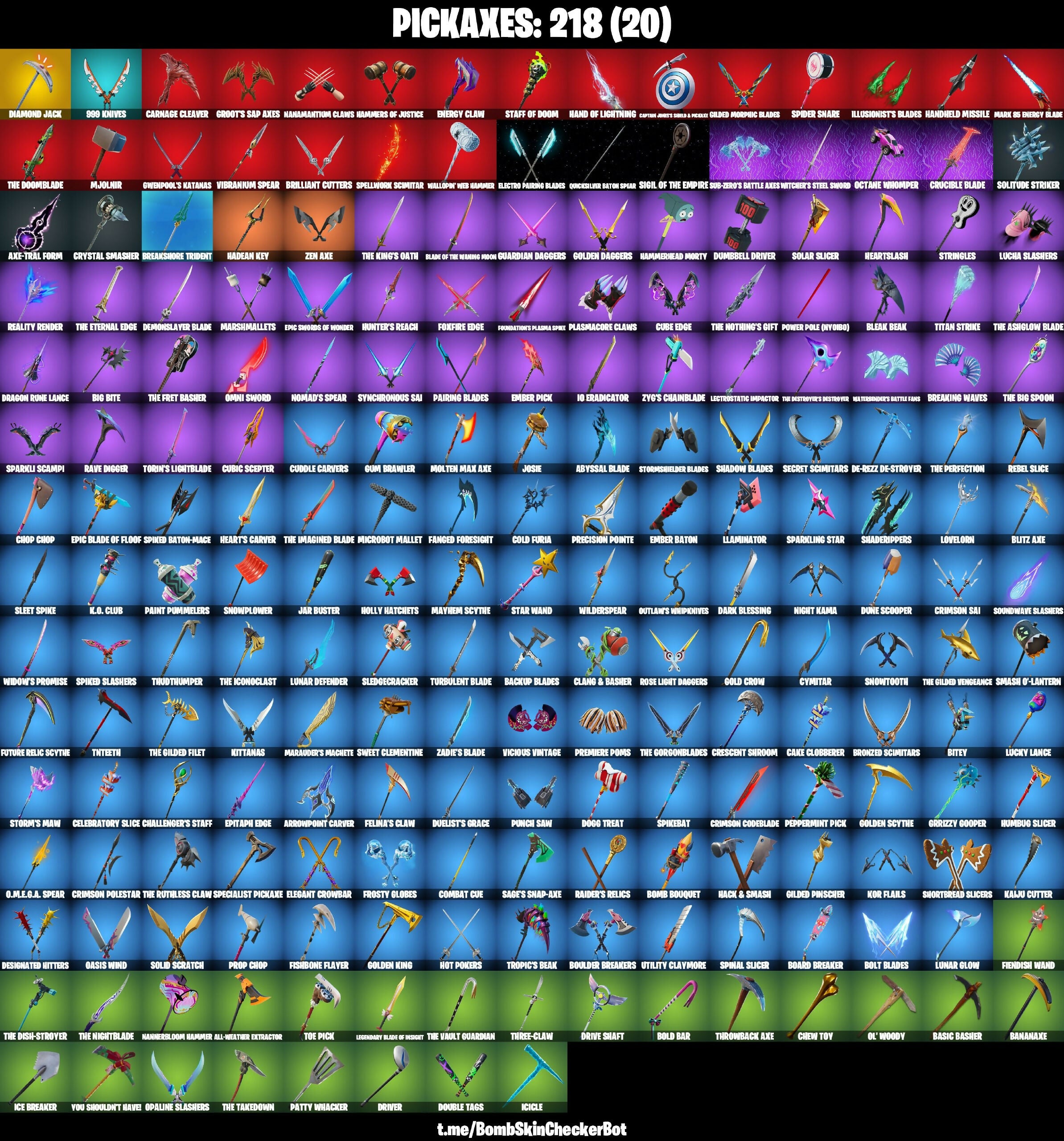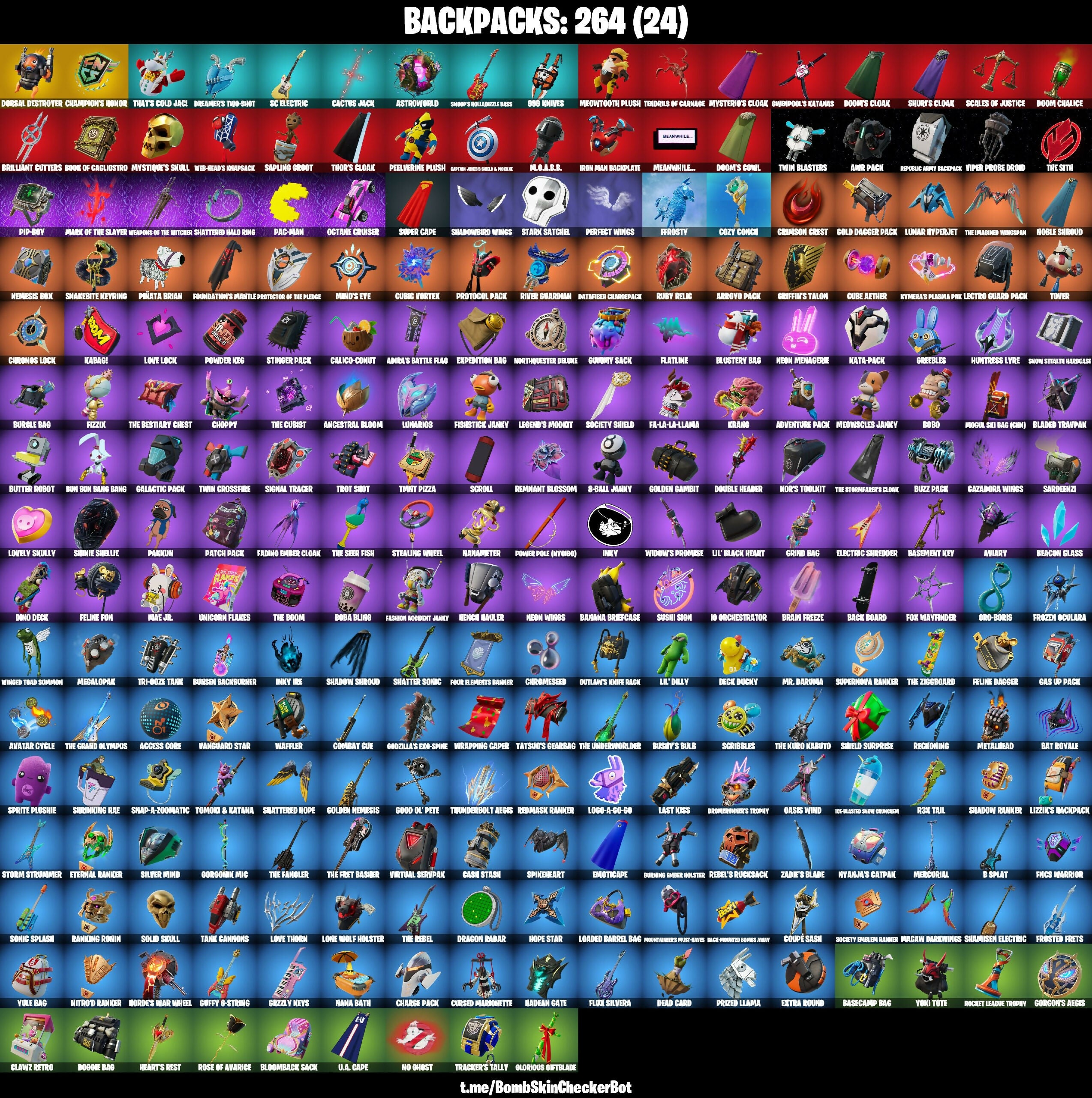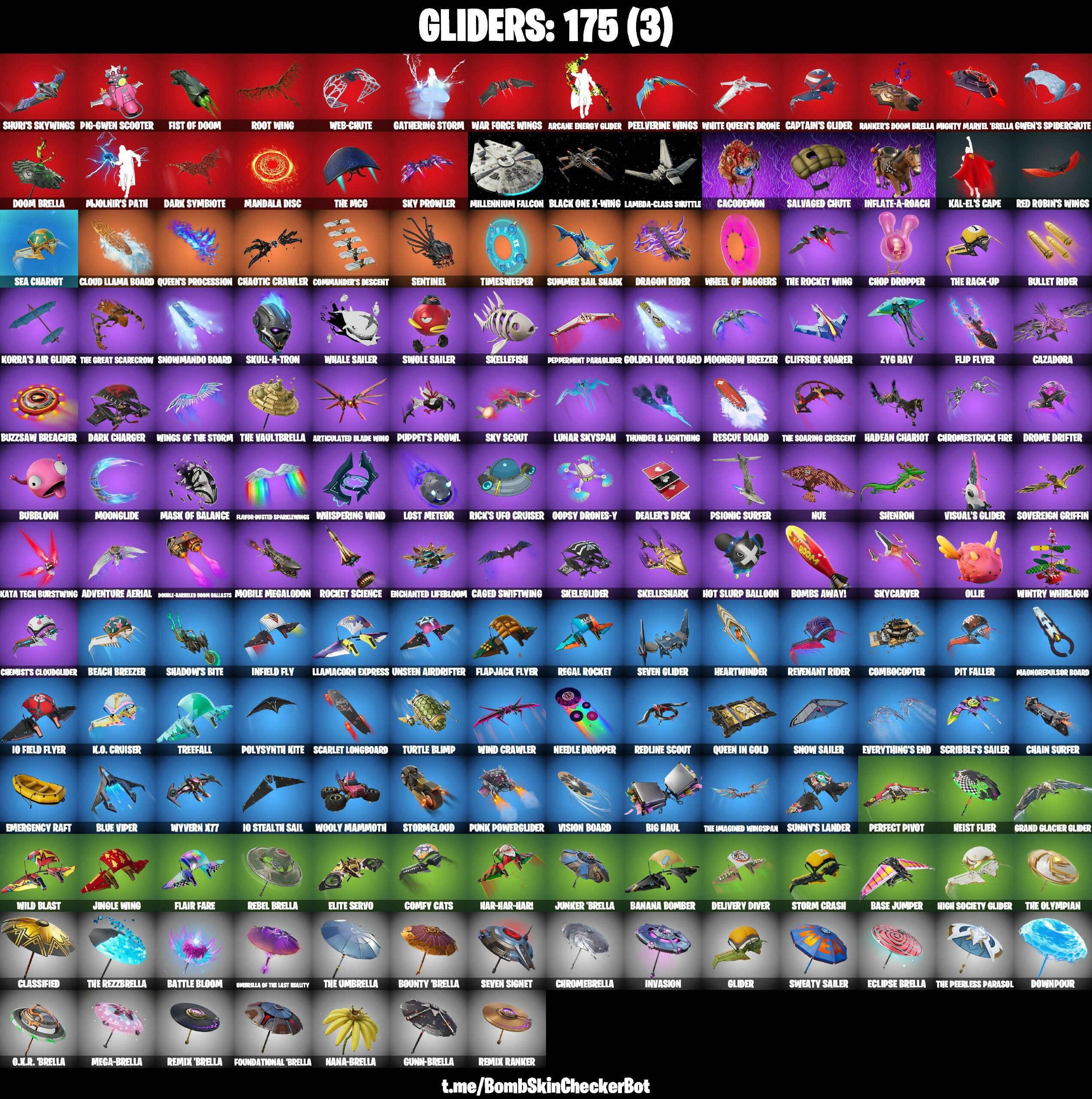 1-Ball, 10 Field Flyer, 10 Orchestrator, 10 Stealth Sail, 8-Ball Janky, 999 Knives, AWP Pack, Absenz, Abyssal Blade, Access Core, Adira, Adira's Battle Flag, Adventure Aerial, Adventure Pack, Aftermath, Agent Peely, All-Weather Extractor, Ancestral Bloom, Aphrodite, Arachrobatics, Arcane Energy Glider, Arctic Adeline, Arrowpoint Carver, Arroyo Pack, Artemis, Articulated Blade Wing, Astro Jack, Astroworld, Aura, Avatar Cycle, Avatar’s Flourish, Aviary, Axe-Tral Form, B Splatt, Back Board, Back-Mounted Bombs Away, Backup Blades, Balance Board, Banana Bomber, Banana Briefcase, Bananaxe, Baron’s Hoard, Base Jumper, Basecamp Bag, Basement Key, Basic Basher, Bat Royale, Battle Bloom, Beach Breezer, Beacon Glass, Bear Hug, Beep Beep, Beerus, Big Bite, Big Fan, Big Haul, Bike To Go, Bim Bam Boom, Birdie, Bitey, Black One X-Wing, Blade of the Waning Moon, Bladed Travpak, Bleak Beak, Blitz Axe, Blitz Knight, Blizzard Bomber, Bloomback Sack, Blowin’ Up, Blue Viper, Blustery Bag, Board Breaker, Boba Bling, Boba Snack, Bobo, Bold Bar, Bolt Blades, Bomb Bouquet, Bombs Away!, Boogie Down, Book of Caligustro, Boosting Ki, Boulder Breakers, Bounty 'Brella, Brain Freeze, Breaking Waves, Breakshore Trident, Brilliant Cutters, Bring It Around, Bronzed Scimitars, Brutus, Bubbloon, Bullet Rider, Bullseye, Bun Bun Bang Bang, Bunsen Backburner, Burgle Bag, Burning Ember Holster, Burnoff, Bushy's Bulb, Butter Robot, Buzz Pack, Buzzsaw Breacher, Bytes, Cacodemon, Cactus Jack, Caged Swiftwing, Cake Clobberer, Calico-Coconut, Call Me, Called Shot, Captain Jones, Captain LLamerica, Captain's Glider, Carnage, Carnage Cleaver, Cash Stash, Cauldron Chill, Cazadora, Cazadora Wings, Celebratory Slice, Cerberus, Chain Surfer, Challenger's Staff, Champion's Honor, Chaos Director, Chaotic Crawler, Charge Pack, Charlotte, Chef’s Special, Chemist's Cloudglider, Chew Toy, Choice Knit, Chop Chop, Chop Dropper, Choppy, Chrome Punk, Chromeseed, Chromestruck Fire, Chromobrella, Chronos Lock, Clang & Basher, Clara, Classified, Clawz Retro, Clean Sweep, Cliffside Soarer, Clinical Crosser, Cloud Llama Board, Coin Flip, Cold Furia, Combat Cue, Combocopter, Comfy Cats, Commander's Descent, Conch Call, Conjure Weapon, Contract Giller, Count It!, Coupe Sash, Court Commander, Cozy Conch, Crescent Shroom, Crimson Codeblade, Crimson Crest, Crimson Polestar, Crimson Sai, Crowning Achievement, Crucible Blade, Crystal Smasher, Cube Aether, Cube Assassin, Cube Edge, Cubic Scepter, Cubic Vortex, Cuddle Carvers, Curling Iron, Cursed Marionette, Cyclo Curl, Cymitar, D'Ark, Dagger Dance, Dance Monkey, Dark Blessing, Dark Charger, Dark Symbiote, Darth Vader, Datafiber Chargepack, De-Rezz De-Stroyer, Dead Card, Deadpool, Dealer's Deck, Decaying Dribbler, Deck Ducky, Deep Dab, Delivery Diver, Demonslayer Blade, Designated Hitters, Desirable, Diamond Jack, Dino Deck, Dirtbike Challenge, Dizzie, Doctor Doom, Doctor Slone, Doctor Strange, Doggie Bag, Doggo Treat, Doom, Doom Brella, Doom Chalice, Doom Slayer, Doom's Cloak, Doom's Cowl, Doom’s Domain, Dorsal Destroyer, Double Header, Double Tags, Double-Barreled Boom Ballists, Downpour, Dragon Radar, Dragon Rider, Dragon Rune Lance, Dramatic Flares, Dreamer's Two-Shot, Drippin’ Flavor, Drive Shaft, Driver, Drome Drifter, Dromerunner's Trophy, Duelist's Grace, Dumbbell Driver, Dune Scooper, Dusty, Dynamo TNTina, Eclipse Brella, Electric Shredder, Electro Pairing Blades, Electrostatic Impactor, Elegant Crowbar, Elite Servo, Ember Baton, Ember Pick, Emergency Raft, Emma Frost, Emoticape, Empress Fan Dance, Enchanted Lifebloom, Energy Claw, Epic Blade of Floof, Epic Swords of Wonder, Epitaph Edge, Era, Eren Jaeger, Erisa, Eternal Ranker, Everybody Loves Me, Everything's End, Evie, Evil Plan, Expedition Bag, Explorer Emilie, Expressionism, Extra Round, Fa-La-La-Llama, Fabio Sparklemane, Fading Ember Cloak, Fanged Foresight, Fashion Accident Janky, Felina, Felina's Claw, Feline Dagger, Feline Fini, Fiendish Wand, Fireworks Salvo, Fishbone Flayer, Fishstick Janky, Fist Bump, Fist of Doom, Fistbump, Fixer, Fizzix, Flair Fare, Flapjack Flyer, Flatline, Flip Flyer, Flippin’ Sexy, Flux Silvera, Foil Flex, Follow The Butterfly, Foundation's Mantle, Foundation's Plasma Spike, Foundational 'Brella, Four Elements Banner, Fox Wayfinder, Foxfire Edge, Frost Squad, Frosted Frets, Frosty, Frosty Globes, Frozen Ocillara, Future Relic Scythe, Galactic Pack, Gas Up Pack, Gathering Storm, Gear Specialist Maya, Geralt Of Rivia, Get Griddy, Get Out Of Your Mind, Ggwp, Gilded Morphic Blades, Gilded Pinscher, Given-Step, Glider, Glorious Giftblade, Godzilla's Exo-Spine, Gold Blooded Ace, Gold Crow, Gold Dagger Pack, Golden Daggers, Golden Gambit, Golden King, Golden Look Board, Golden Nemesis, Golden Scythe, Good Game, Well Played, Good Guy, Good Ol' Pete, Goosebumps, Gorgon's Aegis, Gorgonik Mic, Grand Glacier Glider, Greebles, Griffin's Talon, Grind Bag, Grizzly Gooper, Grizzly Keys, Groot, Groot's Sap Axes, Grrz, Guardian Daggers, Guffy G-String, Guggimon, Guitar Walk, Gum Brawler, Gumbo, Gummy Sack, Gunn-Brella, Gunnar, Gwen's Spiderchute, Gwenpool, Gwenpool's Katanas, HICS Warrior, Hack & Smash, Hadean Chariot, Hadean Gate, Hadean Key, Hades, Hammerhead Morty, Hammers of Justice, Hand of Lightning, Hand-Forged, Handheld Missile, Har-Har-Hari, Harlowe, Have A Seat, Haven, Head Banger, Heart Sign, Heart's Carver, Heart's Rest, Heartburst, Heartsplash, Heartwinder, Heist Flier, Hellfire Dance, Helsie, Hench Hauler, High Society Glider, Highwire, Holiday Boxy, Holly Hatchets, Hope Star, Horde's War Wheel, Hot Pokers, Hot Slurp Balloon, Humbug Slicer, Hunter's Reach, Huntress Lyre, Hype!, Hypnot-Eyes, I Declare!, I Need You To Concentrate, I.K.O. Cruiser, IO Eradicator, Ice Breaker, Icicle, Icy-Blasted Snow Crunchgum, Igni Sign, Illusionist's Blades, Imani, Imperial March, In Da Party, Indiana Jones, Infield Fly, Inflate-A-Roach, Inky, Inky Ire, Intensity, Invasion, Iron Man Backplate, It Is Finished, It’s A Vibe, It