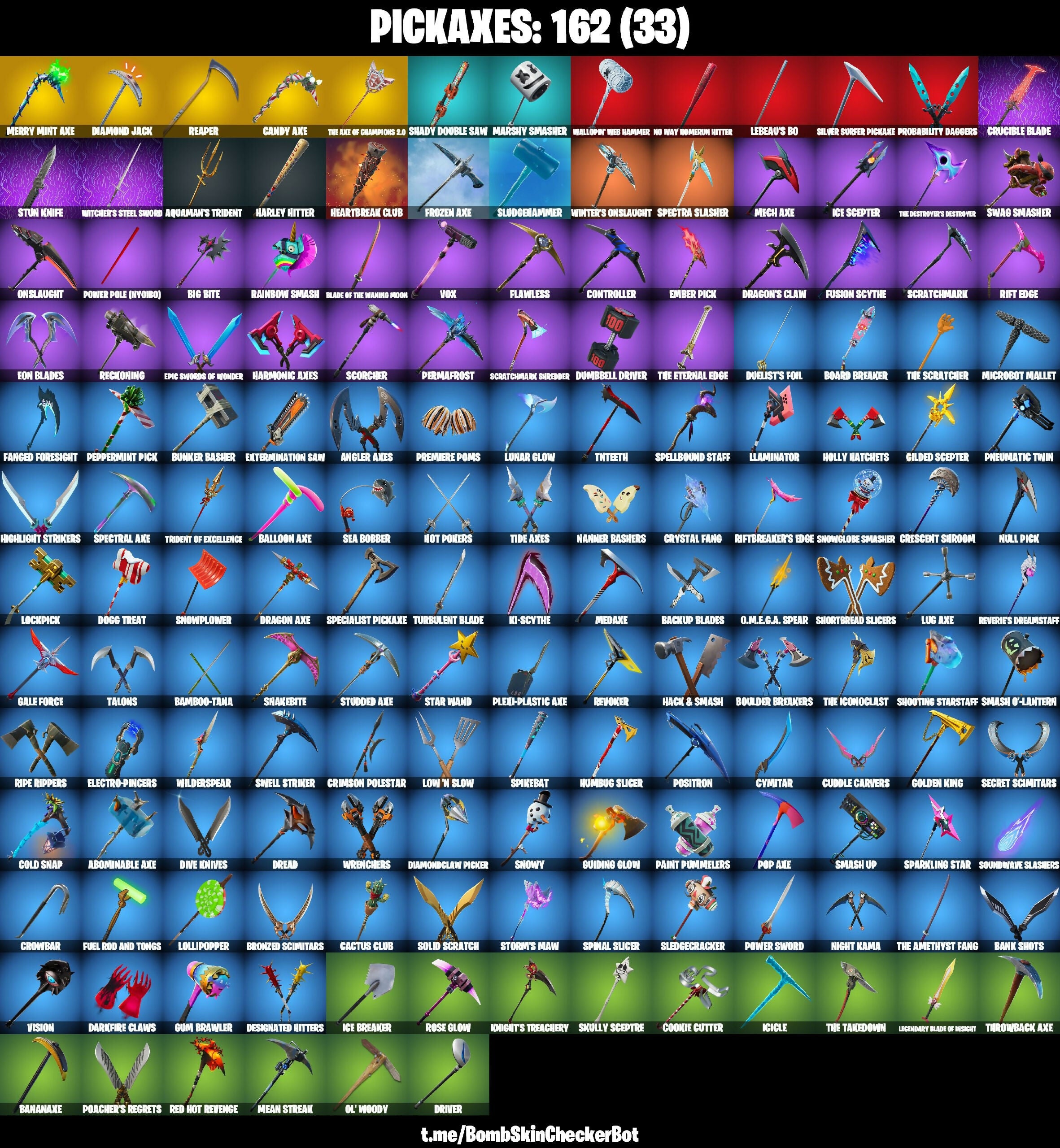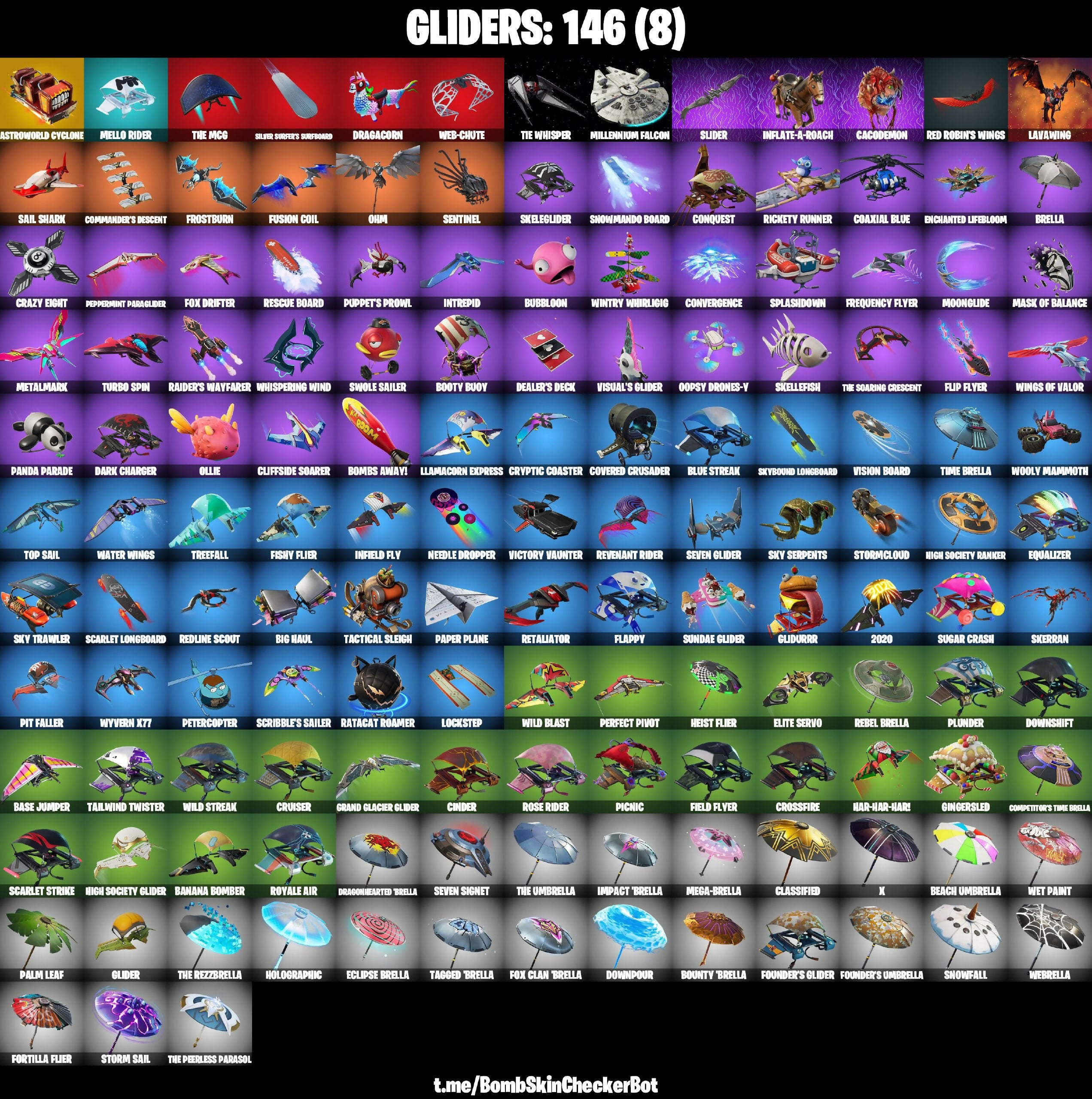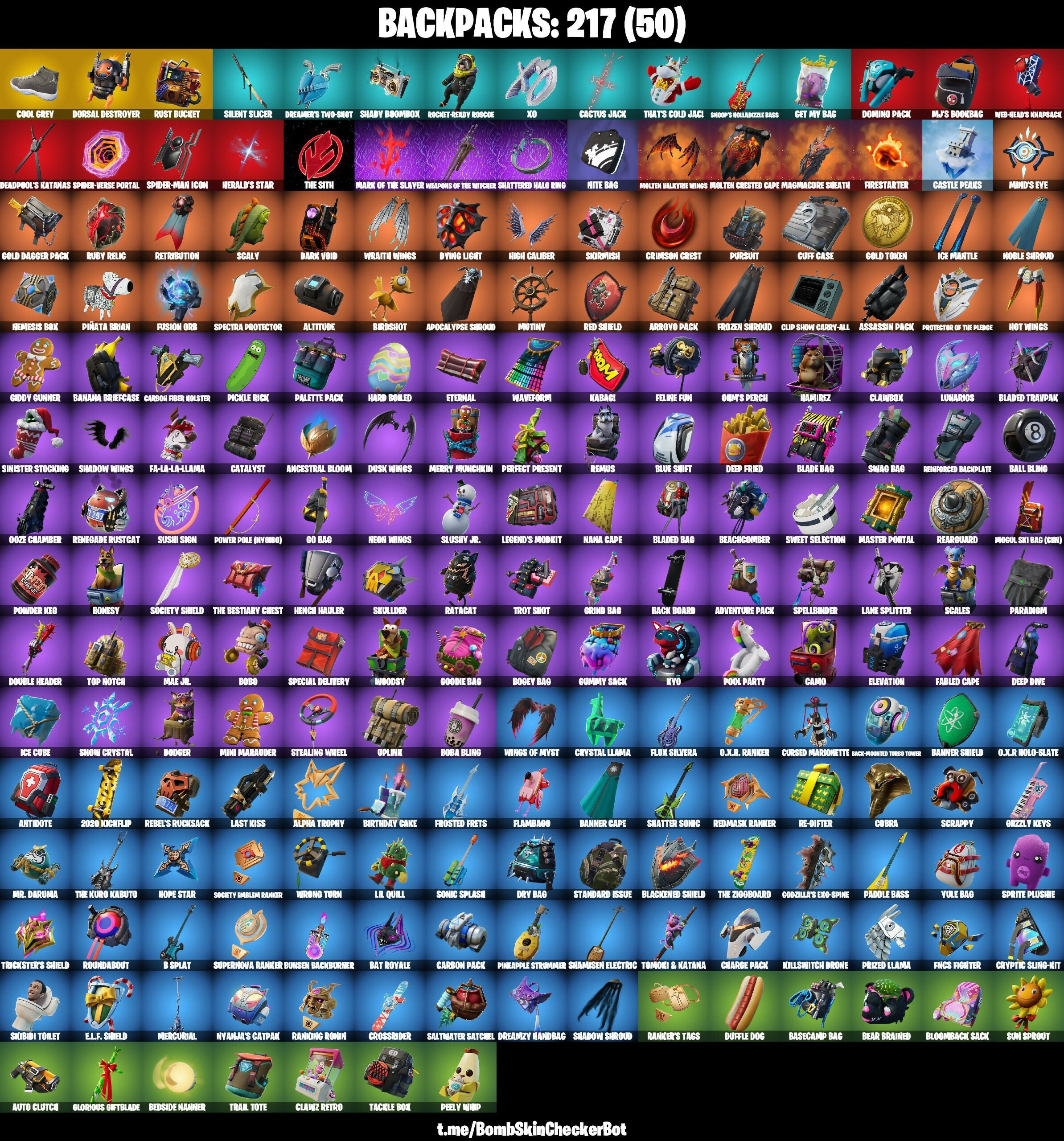 2020, 2020 Kickflip, 8-Ball Vs Scratch, Abominable Axe, Adventure Pack, Aerial Assault Trooper, Agent Peely, Air Shredder, Alpha Trophy, Altitude, Ancestral Bloom, Andre, Angler Axes, Antidote, Apocalypse Shroud, Aquaman's Trident, Archetype, Arctic Adeline, Arctic Assassin, Around The Clock, Arroyo Pack, Assassin Pack, Astroworld Cyclone, Aura, Auto Clutch, B-Splat, Back Board, Back-Haunted Turbo Tower, Backlash, Backup Blades, Balance Board, Ball Bling, Balloon Axe, Bamboo-Tana, Banana Bomber, Banana Briefcase, Bananaxe, Bank Shots, Banner Cape, Banner Shield, Base Jumper, Basecamp Bag, Bat Royale, Battle Call, Battlehawk, Beach Umbrella, Beachcomber, Bear Brained, Bedside Manner, Beef Boss, Beep Beep, Big Bite, Big Haul, Bike To Go, Birdshot, Birthday Cake, Blackened Shield, Blackheart, Blade Bag, Blade Of The Waning Moon, Bladed Bag, Bladed Travpak, Blaze, Blitz Knight, Bloomback Sack, Blue Shift, Blue Streak, Blue Striker, Blue Team Leader, Board Breaker, Boba Bling, Boba Snack, Bobo, Bogey Bag, Boing!, Bombs Away!, Bonesy, Boogeyman, Boogie Down, Booty Buoy, Boulder Breakers, Bounty Brella, Breakdown, Brella, Bring It, Brite Bomber, Bronzed Scimitars, Brutus (Fully Golden), Bubbloon, Bullseye, Bunker Basher, Bunker Jonesy, Bunsen Backburner, Cacodemon, Cactus Club, Cactus Jack, Calamity, Calculated, Call Me, Called Shot, Cameo Vs Chic, Camo, Candy Axe, Carbide, Carbon Commando, Carbon Fiber Holster, Carbon Pack, Card Drop, Castle Peaks, Castor, Cat Flip, Catalyst, Chalk Outline, Chaos Agent, Charge Pack, Chimichanga!, Choice Knit, Cinder, Circuit Breaker, Classified, Clawbox, Clawz Retro, Clean Groove, Cliffside Soarer, Clip Show Carry-All, Cloaked Shadow, Cloud Striker, Cluck Strut, Coaxial Blue, Cobalt, Cobra, Codename E.L.F., Coin Flip, Cold Snap, Commander's Descent, Competitors Time Brella, Conga, Conquest, Contract Giller, Controller, Convergence, Cookie Cutter, Cool Grey, Covered Crusader, Crackshot, Crazy Eight, Crescent Shroom, Crimson Crest, Crimson Polestar, Crossfire, Crossrider, Crowbar, Crowning Achievement, Crucible Blade, Cruiser, Cryptic Coaster, Cryptic Sling-Kit, Crystal, Crystal Fang, Crystal Llama, Cuddle Carvers, Cuff Case, Curling Iron, Cursed Marionette, Cymitar, DJ Yonder, Dab, Dark Charger, Dark Vanguard, Dark Void, Darkfire Claws, Deadpool, Deadpool's Katanas, Dealer's Deck, Deep Dive, Deep Fried, Demi, Designated Hitters, Diamond Jack, Diamond Throne, Diamondclaw Picker, Dive Knives, Do The 'Split, Dodger, Dogg Treat, Domino, Domino Pack, Doom Slayer, Dorsal Destroyer, Double Header, Downpour, Downshift, Doze Dab, Dragacorn, Dragon Axe, Dragon Stance, Dragon's Claw, Dragonhearted Brella, Dread, Dreamer's Two-Shot, Dreamzy Handbag, Drift, Drift (Stage 5), Driver, Droop, Dry Bag, Duelist's Foil, Duffle Dog, Dumbbell Driver, Dummy, Dunk On 'Em, Dusk Wings, Dusty, Dusty Dardevil, Dying Light, E.L.F. Shield, Eagle, Eclipse Brella, Electro-Pincers, Elevation, Elite Servo, Ember, Ember Pick, Enchanted Lifebloom, Eon Blades, Epic Swords Of Wonder, Equalizer, Eternal, Everybody Loves Me, Extermination Saw, FISHTICK, FNCS Fighter, Fa-La-La-Llama, Fable, Fabled Cape, Face Palm, Fade, Fancy Feet, Fanged Foresight, Feline Fun, Field Flyer, Fierce, Firestarter, Fishy Flier, Fist Bump, Flambago, Flappy, Flashback Breakdown, Flawless, Flip Flyer, Flippin' Away, Flux Silvera, Foil Flex, Fortilla Flier, Founder's Glider, Founder's Umbrella, Fox Clan Brella, Fox Drifter, Free Flow, Frequency Flyer, Frostburn, Frosted Frets, Frozen Axe, Frozen FISHTICK, Frozen Nog Ops, Frozen Shroud, Fuel Rod And Tongs, Full Tilt, Fusion, Fusion Coil, Fusion Orb, Fusion Scythe, Fusion! Hah!!, GG Smiley, Gale Force, Gear Specialist Maya, Gentleman's Dab, Geralt of Rivia, Get Funky, Get Griddy, Get My Bag, Ghoul Trooper, Giddy Gunner, Giddy-Up, Gilded Scepter, Ginger Gunner, Gingersled, Glider, Glidurr, Glorious Giftblade, Go Bag, Go Go Power Rangers, Godzilla’s Exo-Spine, Gold Dagger Pack, Gold Token, Golden King, Golf Clap, Good Sportsmanship, Goodie Bag, Grand Glacier Glider, Grind Bag, Grizzly Keys, Groove Jam, Guiding Glow, Gum Brawler, Gumbo, Gummy Sack, Hack & Smash, Hamirez, Hangtime, Har-Har-Har!, Hard Boiled, Harley Hitter, Harlowe, Harmonic Axes, Have A Seat, Haven, Head Banger, Heartbreak Club, Heartbreak Ranger, Heist Flier, Hello Friend, Helsie, Hench Hauler, Herald's Star, Heron Stance Hero, Hey Now!, High Caliber, High Five, High Society Glider, High Society Ranker, Highlight Strikers, Hit It, Holiday Boxy, Holly Hatchets, Holographic, Hoop Master, Hope, Hope Star, Hot Pokers, Hot Wings, Hula Hoopin', Humbug Slicer, Huntress, Hybrid, Hype, Hype!, Hypnot-Eyes, I Declare!, I Need You To Concentrate, I'm A Mystery, Ice Breaker, Ice Cube, Ice Mantle, Ice Scepter, Icicle, Idis, Igni Sign, Impact Brella, Imperial Stormtrooper, Infield Fly, Infinite Dab, Inflate-A-Roach, Intrepid, It's A Vibe, It's Go Time!, It's... You?, Jabba Switchway, Jack-O-Pattern, Jazz Hands, Jet Signals, John Wick, Journey Vs Hazard, Jubilation, Jules, Jump Jets, Kabag!, Keep It Mello, Ki-Scythe, Killswitch Drone, Kit, Knife Sharpener, Knight's Treachery, Krisabelle, Kyo, Laguna, Laid Back Shuffle, Lane Splitter, Last Kiss, Lavawing, LeBeau's Bo, Legend's Modkit, Legendary Blade Of Insight, Lewis Hamilton, Lil Quill, Lil Split, Lil' Longboat, Lil' Monster, Lil' Prancer, Llamacorn Express, Llaminator, Lock It Up, Lockpick, Lockstep, Lollipopper, Love It!, Low 'N Slow, Lt. Evergreen, Lt. John Llama, Lug Axe, Lunar Charge, Lunar Glow, Lunar Party, Lunarios, Luxe, Lynx, M.J.'s Bookbag, MJ (No Way Home), Mae Jr., Magma, MagmaCore Sheath, Make A Seat, Mark of the Slayer, Marsh Walk, Marshmello, Marshy Smasher, Mask Of Balance, Massai, Master Key, Master Portal, Mean Streak, Mech Axe, Medaxe, Mega-Brella, Mello Rider, Meowscles, Mercurial, Merry Marauder, Merry Mint Axe, Merry Munchkin, Metalmark, Mic Drop, Microbot Mallet, Midas (Fully Golden), Midas' Shadow, Millennium Falcon, Mind Blown, Mind's Eye, Mini Maraud