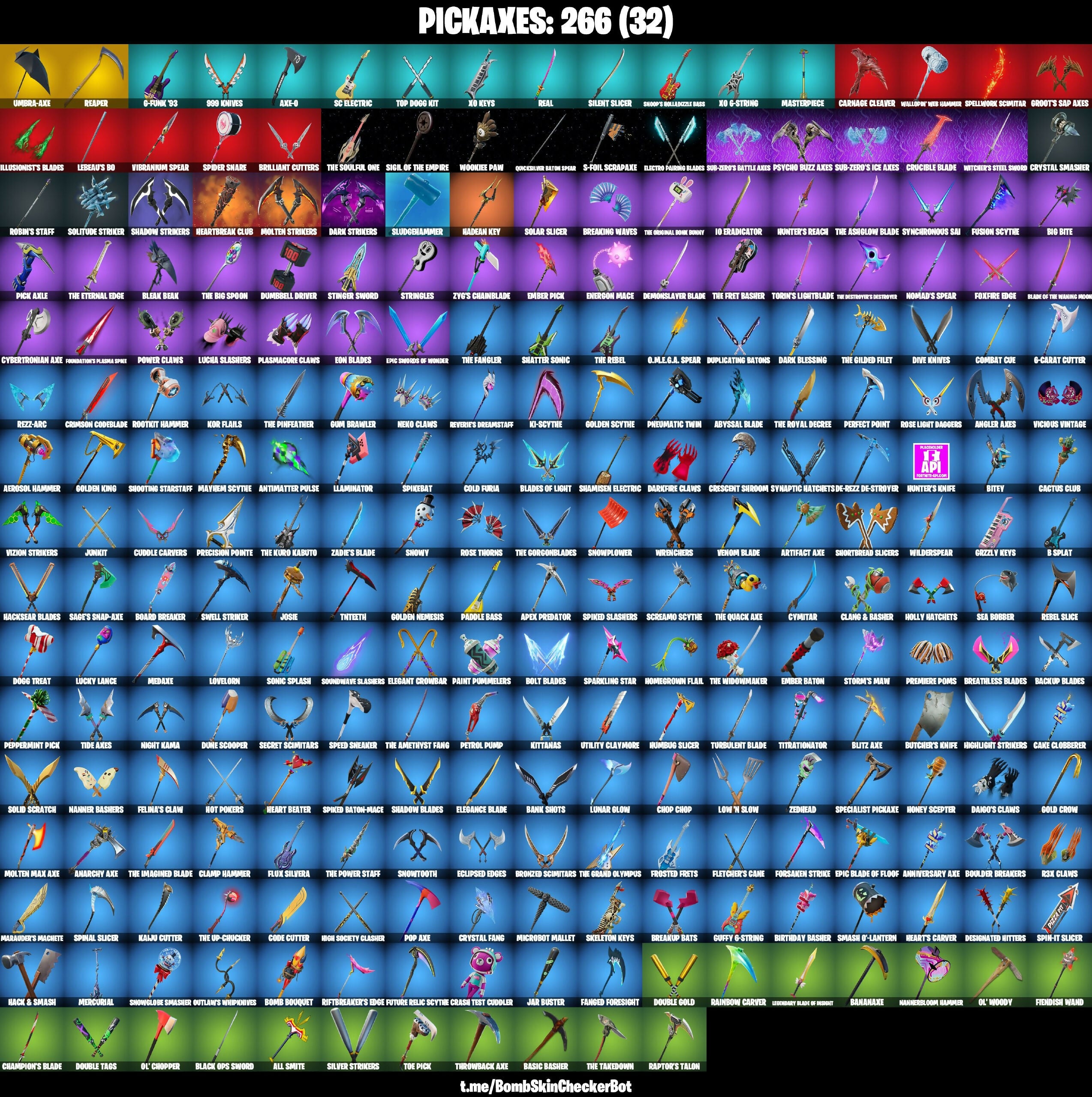 1-Ball, 10 Eradicator, 6-Carat Cutter, 8-Ball Vs Scratch, 999 Knives, Absenz, Abyssal Blade, Adeline, Aerosol Hammer, Agent Peely, Air Shredder, Aire, Airphorian, All Might, All Smite, Anarchy Axe, Andre, Anglar Axes, Anniversary Axe, Antimatter Pulse, Antonia, Apex Predator, Arcane Research, Artifact Axe, Axe-O, B Splat, Backup Blades, Balance Board, Bananaxe, Bank Shots, Baron's Hoard, Basic Basher, Battle Blessing, Battlebus, Beatzbunny, Beep Beep, Big Bite, Big Dill, Big Fan, Bike To Go, Birdarang Flourish, Birthday Basher, Bitey, Black Ops Sword, Blade of the Waning Moon, Blades of Light, Bleak Beak, Blinding Lights, Blitz Axe, Blitz Knight, Blizzard Bomber, Board Breaker, Boba Snack, Boing!, Bolt Blades, Bomb Bouquet, Bone Breaker, Bonejamin, Boogie Down, Boosting Ki, Boulder Breakers, Bounce Wit It, Boy's a Liar, Bratty, Breaking Waves, Breakup Bats, Breathless Blades, Brilliant Cutters, Bronzed Scimitars, Brutus (Fully Golden), Buckets, Buckle Up, Budge, Bumblebee, Butcher's Knife, Bye Bye Bye, Cactus Club, Cake Clobberer, Call Me, Called Shot, Cameo Vs Chic, Camille, Cammy, Caper, Captain Llamerica, Carey, Carnage, Carnage Cleaver, Cassidy Quinn, Catwoman Zero, Cauldron Chill, Celebrate Me, Champion's Blade, Chaos Director, Charlotte, Chef's Special, Chicken Wing It, Choice Knit, Chop Chop, Chrome Punk, Clamp Hammer, Clang & Basher, Clara, Clean Sweep, Cloud Striker, Code Cutter, Coin Flip, Cold Furia, Combat, Combat Cue, Combat Tech Jules, Count It!, Crack It, Crash Test Cuddler, Crescent Shroom, Crimson Codeblate, Crowning Achievement, Crucible Blade, Crystal Fang, Crystal Smasher, Cuddle Carvers, Cybertronian Axe, Cyclo Curl, Cymitar, D'Ark, Dagger Dance, Daigo, Dango's Claws, Dark Blessing, Dark Doggo, Dark Power Chord, Dark Strikers, Darkfire Claws, De-Rezz De-Stroyer, Deadpool, Demonslayer Blade, Designated Hitters, Diamond Diva, Dice Roll, Dill With It, Disco Diva, Dive Knives, Dizzie, Doctor Slone, Dogg Treat, Doom Slayer, Double Gold, Double Tags, Doze Dab, Dramatic Flares, Droop, Duelist's Card Trick, Dumbbell Driver, Dune Scooper, Dunk It!, Duplicating Batons, Dusty, Dynamo Dancer, Dynamo Tntina, Eclipsed Edges, Electro Paubrla Blades, Elegance Blade, Elegant Crowbar, Ember Baton, Ember Pick, Empress Fan Dance, Energon Mace, Eon Blades, Epic Blade of Floof, Epic Swords of Wonder, Era, Errant, Eva, Expressionism, Fabio Sparklemane, Fade, Fang Dance, Fanged Foresight, Feelin' Jaunty, Felina, Felina's Claw, Fiendish Wand, Fish Thicc, Fist Bump, Fixer, Flaky Feast, Fletcher Kane, Fletcher's Cane, Flippin' Away, Flux Silvera, Foil Flex, Follow The Butterfly, Foscarken Strike, Foundation's Plasma Spike, Foxfire Edge, Frosted Frets, Frozen Treat Cart, Full Tilt, Fusion, Fusion Scythe, Future Relic Scythe, G-Funk '93, GGWP, Game Knight, Gatling Gun, Gear Specialist Maya, Geek Time, Geralt of Rivia, Get Loose, Get Out of Your Mind, Glitch, Godzilla Evolved, Gold Crow, Golden King, Golden Nemesis, Golden Scythe, Goldie, Good Game, Well Played, Good Guy, Grimoire, Grizzly Keys, Groot's Sap Axes, Guffy G-String, Guggimon, Gum Brawler, Gumbo, Hack & Smash, Hacksbear Blades, Hadean Key, Hammer On, Hana, Hand-Forged, Harlowe, Have a Seat, Haven, Haxsaur, Haylee Skye, Head Banger, Heart Beater, Heart Sign, Heart of a King, Heart's Carver, Heartbreak Club, Heartbreak Ranger, Helichopper, Helsie, Hero Baymax, High Five, High Society Clasher, Highlight Strikers, Highwire, Hola Hoopin', Holiday Boxy, Holly Hatchets, Homegrown Flail, Honey Scepter, Hot Pokers, Hunter's Knife, Hunter's Reach, Hype!, Hypnot-Eyes, I Declare!, Ice Spice, Igni Sign, Illusionist's Blades, Imani, Imperial March, In Da Party, In Ha Mood, Instrument of Destruction, Interstellar Bass, Introducing..., Invisible Cut, Iris, It Is Finished, It's Chemistry!, It's... You?, Izzik, J Balvin, J.B. Chimpanski, Jade, Jaina, Jake Bug Dance, Jar Buster, Jet Signals, Joey, Josie, Joss, Journey Vs Hazard, Juh-Hwan, Jules, Juliet, Junkit, Kado Thorne, Kaiju Cutter, Kaws Skeleton, Keep 'Em Crispy, Keisha Cross, Kendo, Keyed Up, Khaby Lame, Ki-Scythe, Kick Back, Killswitch, Kingsley, Kit, Kittanas, Kor, Kor Flails, Krisabelle, Kymera, LBC '93 Dogg, Last Forever, Lazy Shuffle, LeBeau's Bo, Leafy Longboardin', Legendary Blade of Insight, Lightrider, Lil' Godzilla Attack, Lil' Monster, Lil' Rover, Lil' Saucer, Lil' Supercar, Lina Scorchi, Llaminator, Lock It Up, Lorenzo, Love It!, Lovelorn, Low 'N Slow, Lt. Evergreen, Lt. John Llama, Lucha Slashers, Lucky Lance, Lunar Charge, Lunar Glow, Lunar Party, Mae, Make a Seat, Marauder's Machete, Marika, Mariposa, Massai, Masterpiece, Maxxed Out Max, Mayhem Scythe, Meat Grinder, Mecha R3x, Medaxe, Megatron, Meowdas, Meowscles, Mercurial, Microbot Mallet, Microflip, Midas (Fully Golden), Mini Dogfight, Mini Slayer Restump, Miracle Trickshot, Miss Bunny Penny, Mizuki, Molten Max Axe, Molten Omen, Molten Strikers, Morgan Myst, Mwahaha, Myna, Mystica, Nailed It, Nanner Bashers, Nannerbloom Hammer, Neko Claws, Nezumi, Night Kama, Ninja Stance: Donnie, Ninja Stance: Leo, Ninja Stance: Mikey, Nolan Chance, Nomad's Spear, Nyanja, O.M.E.G.A. Spear, Ocean, Ol' Chopper, Ol' Woody, Opal, Optimus Prime, Orcscaller Baton Spear, Out West, Outlaw Midas, Outlaw's Mugshot, Outlaw's Strut, Outlaw's Whipknives, Paddle Bass, Paint Pummellers, Pandemonium, Parade Riffs, Paws & Claws, Peppermint Pick, Perfect Point, Petrol Pump, Phantom Meowscles, Pick Axle, Pig The Butcher, Piper Pace, Pirouette, Pitcycle, Planetary Vibe, Plasmacore Claws, Pneumatic Twin, Point & Shoot, Point Patroller, Polar Peely, Polly, Pop Axe, Popular Vibe, Power Claws, Power Punk, Precision Pointe, Premiere Poms, Psycho Bandit, Psycho Buzz Axes, Pull Up, Pumped!, Punk Show, Puppet Dance, Purr-Demonium, Purradise Meowscles, Rage Quit, Rainbow Carver, Raptor's Talon, Raven's Legion, Ready When You Are, Real, Reaper, Rebel Slice, Recon Raptor, Red Card, Relik, Remedy Vs Toxin, Renee, Renzo the Destroyer, Respect The Peace, Reverie, Reverie's Drea