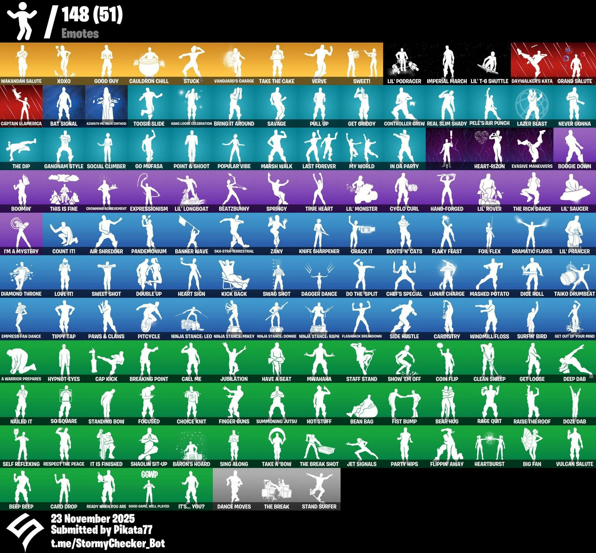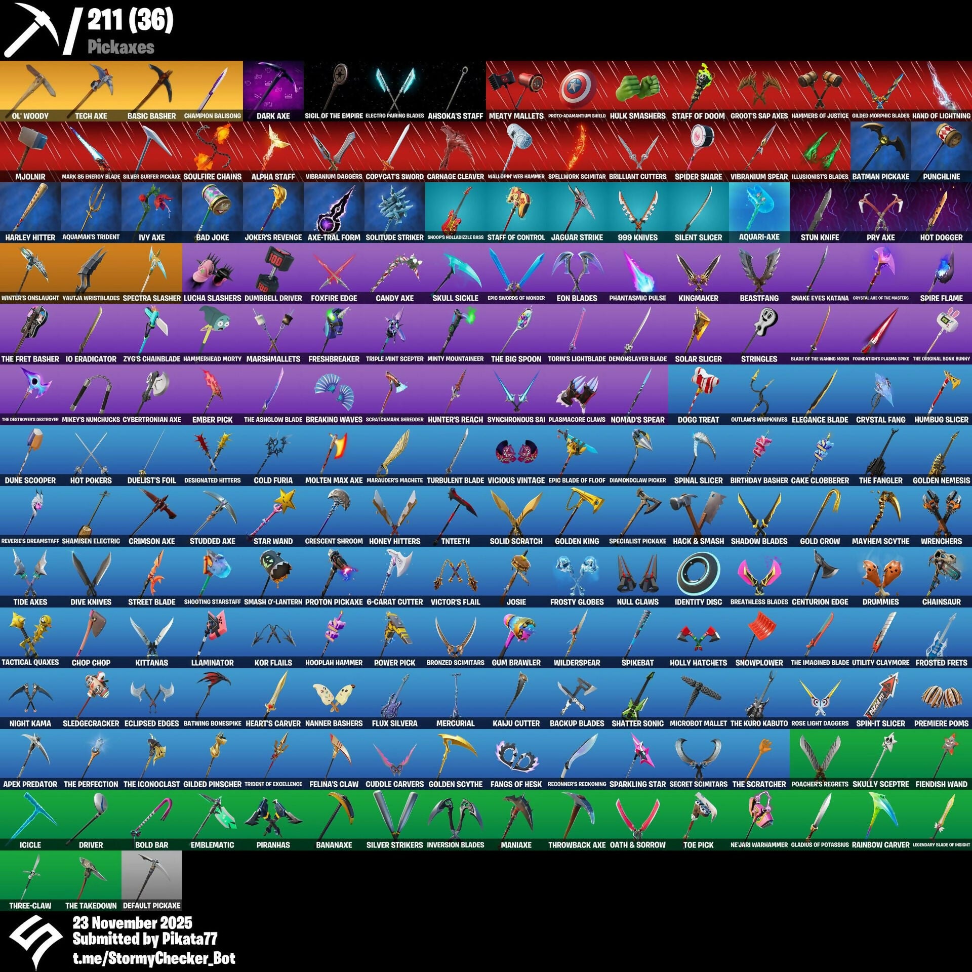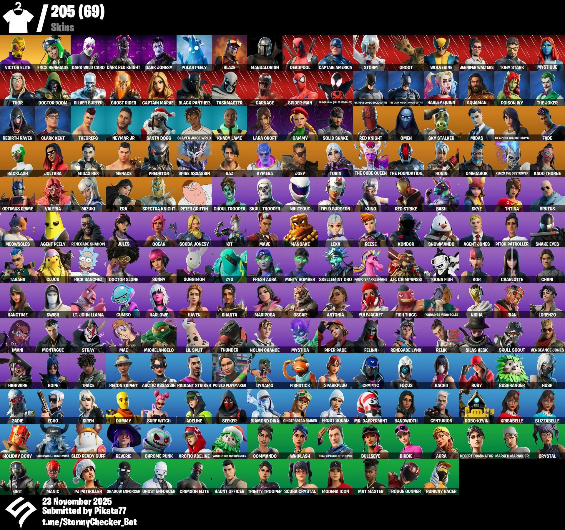 205 Skins | FNCS Renegade | Victor Elite | Solid Snake | Mariposa | Santa Dogg | Ol' Woody | Tech Axe | Basic Basher | Tornado | 400 VB