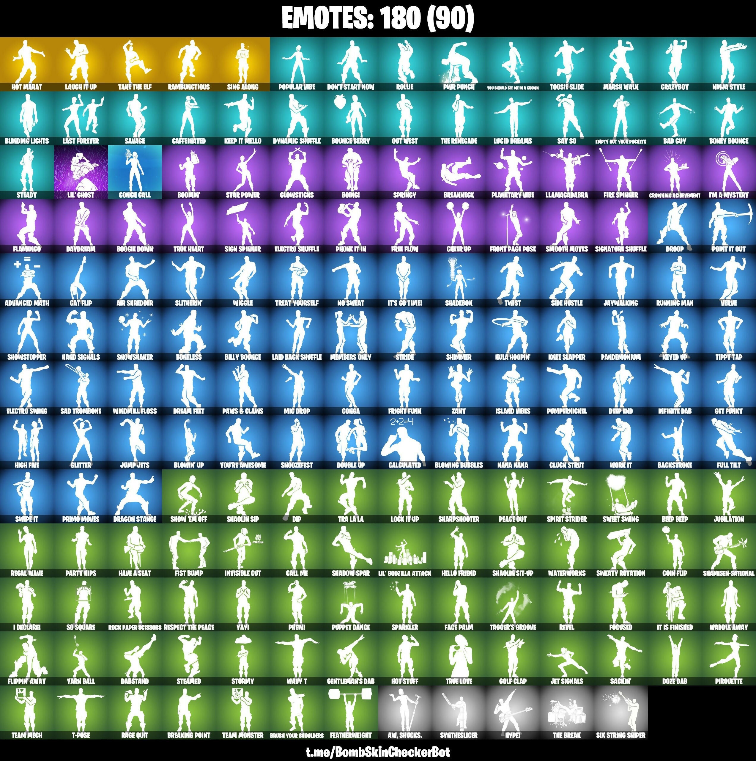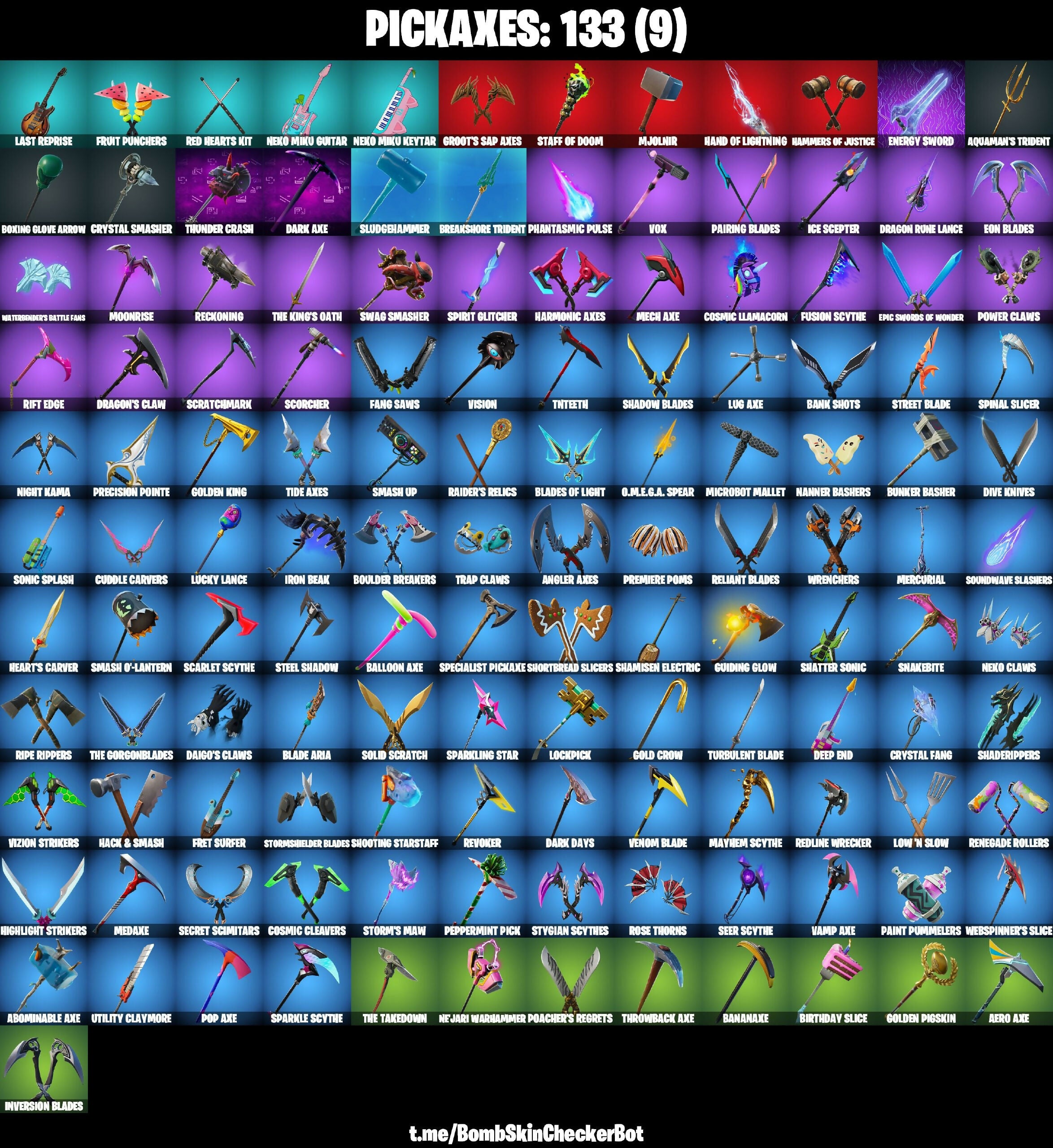 8-Ball Vs Scratch, Abominable Axe, Adira, Advanced Math, Aero Axe, Agent Peely, Air Shredder, Angler Axes, Aphrodite, Aquaman, Aquaman's Trident, Arachne Couture, Arctic Assassin, Ark, Augury, Avira, Aw, Shucks., Backstroke, Bad Guy, Balloon Axe, Bananaxe, Bank Shots, Beach Bomber, Beep Beep, Bernie, Billy Bounce, Birthday Slice, Blackheart, Blacklight, Blade Aria, Blades Of Light, Blaze, Blinding Lights, Blowin' Up, Blowing Bubbles, Boing!, Boneless, Boney Bounce, Boogie Down, Boomin', Boulder Breakers, Bounce Berry, Boxing Glove Arrow, Breaking Point, Breakneck, Breakpoint, Breakshore Trident, Brite Bomber, Brush Your Shoulders, Brutus, Bullseye, Bunker Basher, Bunker Jonesy, Caffeinated, Calamity, Calculated, Call Me, Cameo Vs Chic, Cat Flip, Catalyst, Catrina, Cerberus, Champion Kyra, Chaos Double Agent, Cheer Up, Clara, Clash, Clinical Crosser, Cloak Shadow, Cluck Strut, Codename E.L.E., Coin Flip, Conchi Call, Conga, Corrupted Arachne, Corrupted Insight, Corrupted Shotgun, Cosmic Cleavers, Cosmic Llamacorn, Cozy Chomps, Crazyboy, Crowning Achievement, Crystal, Crystal Fangs, Crystal Smasher, Cuddle Carvers, DJ Yonder, Dabstand, Daigo, Daigo's Claws, Danica, Dark Axe, Dark Bomber, Dark Days, Dark Jonesy, Dark Red Knight, Dark Wild Card, Daydream, Deadpool, Deep End, Demi, Derby Dynamo, Dip, Dire, Dive Knives, Doctor Doom, Don't Start Now, Double Agent Hush, Double Agent Wildcard, Double Up, Doublecross, Doze Dab, Dragon Rune Lance, Dragon Stance, Dragon's Claw, Dream, Dream Feet, Drift (Stage 5), Droop, Dusk, Dynamic Shuffle, Dynamo Dancer, Electro Shuffle, Electro Swing, Ember, Empty Out Your Pockets, Energy Sword, Eon Blades, Epic Swords Of Wonder, Era, Eternal Knight, Eternal Voyager, Evie, Fable, Face Palm, Fade, Fang Saws, Featherweight, Field Agent Kyra, Fire Spinner, Fire Surfer, Fist Bump, Flamenco, Flippin' Away, Focused, Free Flow, Fright Funk, Front Page Pose, Frozen Fishstick, Frozen Love Ranger, Frozen Nog Ops, Frozen Raven, Frozen Red Knight, Fruit Punchers, Full Tilt, Fusion, Fusion Scythe, Galaxia, Galaxy Scout, Gear Specialist Maya, Gentleman's Dab, Get Funky, Ghoul Trooper, Giddy-up, Gingerbread Raider, Glitter, Glowsticks, Gnash, Godzilla Evolved, Gold Crow, Golden King, Golden Pigskin, Golf Clap, Grave, Green Arrow, Green Roots Billie (Die With A Smile / Behind), Groot, Groot's Sap Axes, Guiding Glow, Hack & Smash, Hammers Of Justice, Hand Of Lightning, Hand Signals, Harmonic Axes, Have A Seat, Heart's Carver, Heidi, Hello Friend, Hero Baymax, High Five, Highlight Strikers, Holiday Boxy, Hope, Hot Marat, Hot Stuff, Hula Hoopin', Huntress, Hybrid, Hype!, I Declare!, I'm A Mystery, Ice Scepter, Infinite Dab, Inversion Blades, Invisible Cut, Iris, Iron Beak, Island Vibes, It Is Finished, It's Go Time!, Jade, Jaywalking, Jennifer Walters, Jet Signals, Jing, Joespruit, Jolly Jammer, Journey Vs Hazard, Jubilation, Jules, Jump Jets, Keep It Mello, Kendo, Keyed Up, Kit, Knee Slapper, Korra, Kyra, Laid Back Shuffle, Last Forever, Last Reprise, Laugh It Up, Lil' Ghost, Lil' Godzilla Attack, Llamacadabra, Lock It Up, Lockpick, Lovethorn, Low 'N Slow, Lt. Evergreen, Lucid Dreams, Lucky Lance, Lug Axe, Lynx, Malik, Mandalorian, Manic, Marked Marauder, Marsh Walk, Maven, Mayhem, Mayhem Scythe, Mech Axe, Medaxe, Medusa, Members Only, Meowscles, Mercurial, Mic Drop, Microbot Mallet, Midas (Fully Golden), Midnight Dusk, Mjolnir, Moonrise, Mystique, Nalia, Nana Nana, Nanner Bashers, Nejari Warhammer, Neko Claws, Neko Hatsune Miku, Neko Miku Guitar, Neko Miku Keytar, Night Kama, Nightshade, Nightsurf Bomber, Ninja Style, No Sweat, Nyanja, O.M.E.G.A. Spear, O.M.E.G.A. Suit Alpha, Ocean, Onesie, Oscar, Out West, Paint Pummelers, Pairing Blades, Pandemonium, Party Hips, Paws & Claws, Peace Out, Peekaboo, Peely, Peppermint Pick, Perfect Shadow, Persephone, Phantasmic Pulse, Phew!, Phone It In, Pirouette, Pitstop, Planetary Vibe, Poacher's Regrets, Point It Out, Pop Axe, Popular Vibe, Poseidon, Powder, Power Claws, Precision Pointe, Premiere Poms, Prickly Patroller, Primo Moves, Pumpernickel, Puppet Dance, Pwr Punch, Rage Quit, Raider's Relics, Rambunctious, Rapscallion, Ravage, Reconing, Red Heart's Kit, Red Knight, Red Roots Billie, Red Strike, Red-Nosed Raider, Redline, Redline Racer, Redline Wrecker, Reese, Regal Wave, Reliant Blades, Remedy Vs Toxin, Renegade Rollers, Respect The Peace, Revel, Revoker, Rift Edge, Riley, Ripe Rippers, Rippley Vs Sludge, Robin, Rock Paper Scissors, Rollie, Rook, Rosa, Rose Thorns, Rox, Running Man, Runway Racer, Russel, Sackin', Sad Trombone, Savage, Say So, Scarlet Commander, Scarlet Scythe, Scorcher, Scorpion, Scratchmark, Scuba Jonesy, Secret Scimitars, Seeker, Seer Scythe, Sentinel, Sgt. Winter, Shadebox, Shaderippers, Shadow Blade Hope, Shadow Blades, Shadow Skully, Shadow Spar, Shadowbird, Shamisen Electric, Shamisen-Sational, Shaolin Sip, Shaolin Sit-Up, Sharpshooter, Shatter Sonic, Shimmer, Shooting Starstaff, Shortbread Slicers, Show 'Em Off, Showstopper, Side Hustle, Sidewinder, Sign Spinner, Signature Shuffle, Sing Along, Singularity, Siona, Six String Sniper, Skull Ranger, Skye, Sledgehammer, Slingshot, Slitherin', Sludgehammer, Slurpentine, Smash O'-Lantern, Smash Up, Smooth Moves, Snakebite, Snap, Snoozefest, Snowbell, Snowshaker, So Square, Solid Scratch, Sonia, Sonic Splash, Soundwave Slashers, Sparkle Scythe, Sparkle Supreme, Sparkler, Sparkling Star, Specialist Pickaxe, Spinal Slicer, Spirit Glitcher, Spirit Hunter Saeko, Spirit Strider, Splatterella, Springy, Staff Of Doom, Star Power, Star-Spangled Ranger, Starfish, Starflare, Steady, Steamed, Steel Shadow, Storm, Storm's Maw, Stormfarer, Stormshielder Blades, Stormy, Stratus, Street Blade, Stride, Stygian Scythes, Summer Fable, Sun Strider, Survival Specialist, Swag Smasher, Sweaty Rotation, Sweet Swing, Swipe It, Syntheslicer, T-Pose, Tagger's Groove, Take The Elf, Team Mech, Team Monster, The Ace, The Break, The Devourer, The Gorgonblades, The Ice King, The King's Oath, The Mac