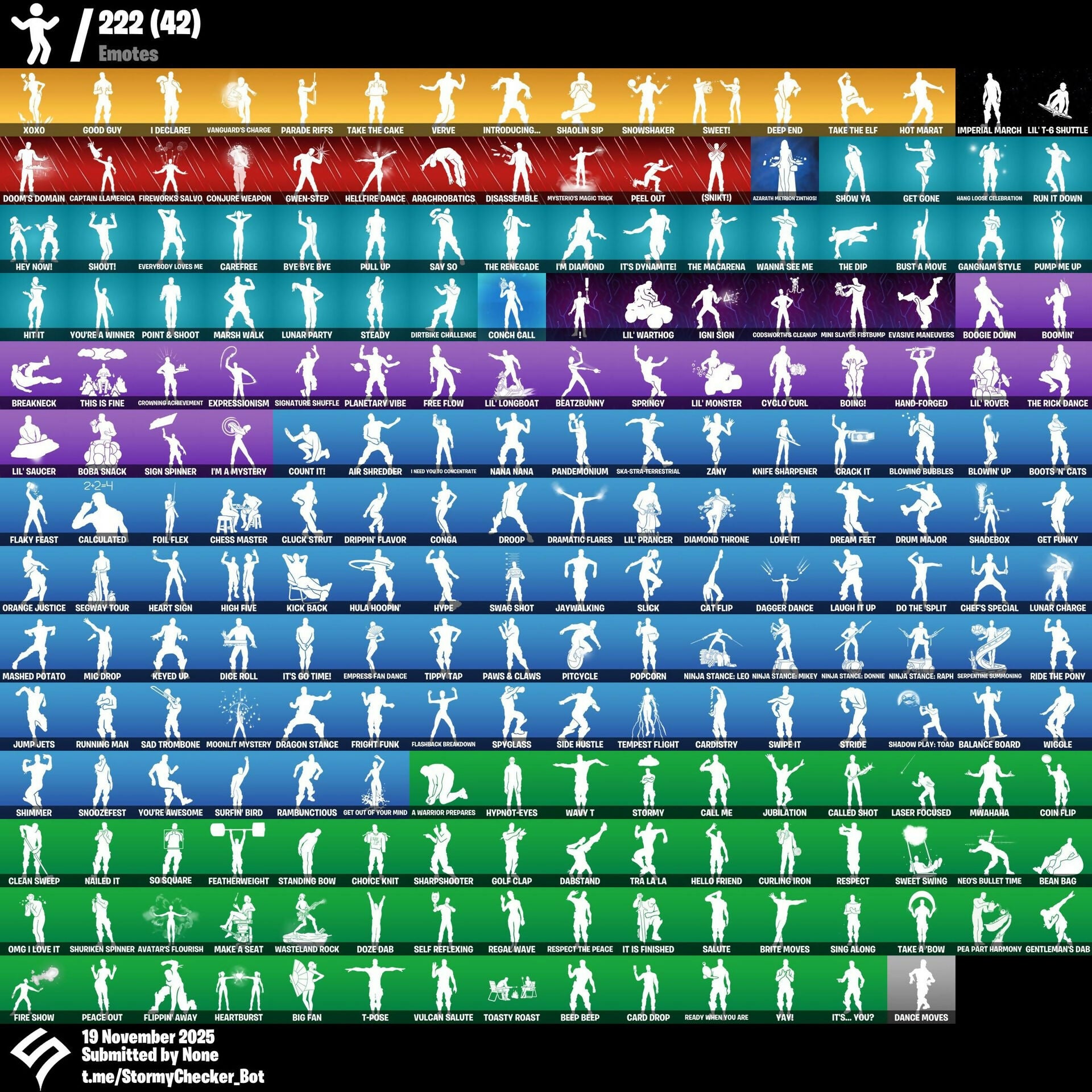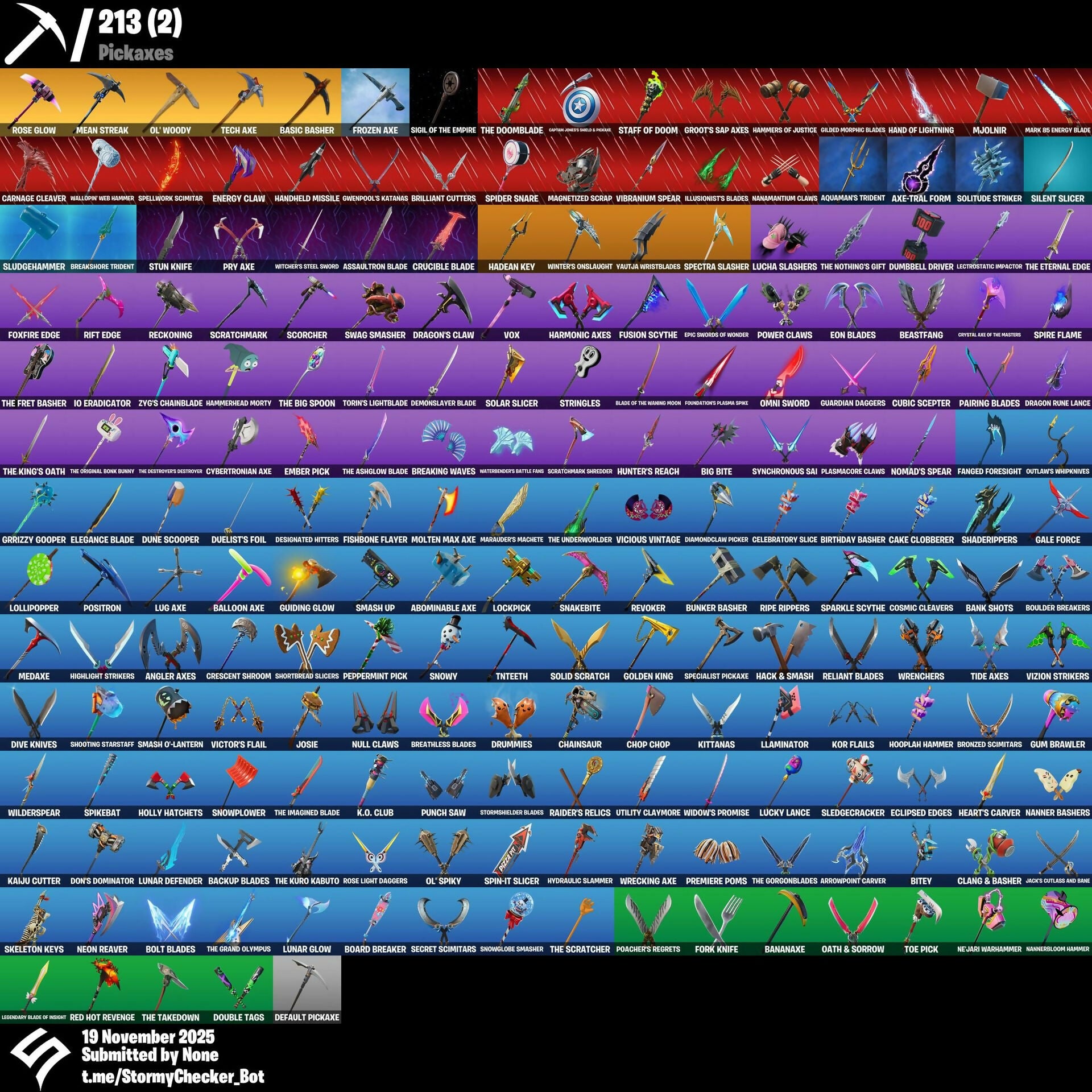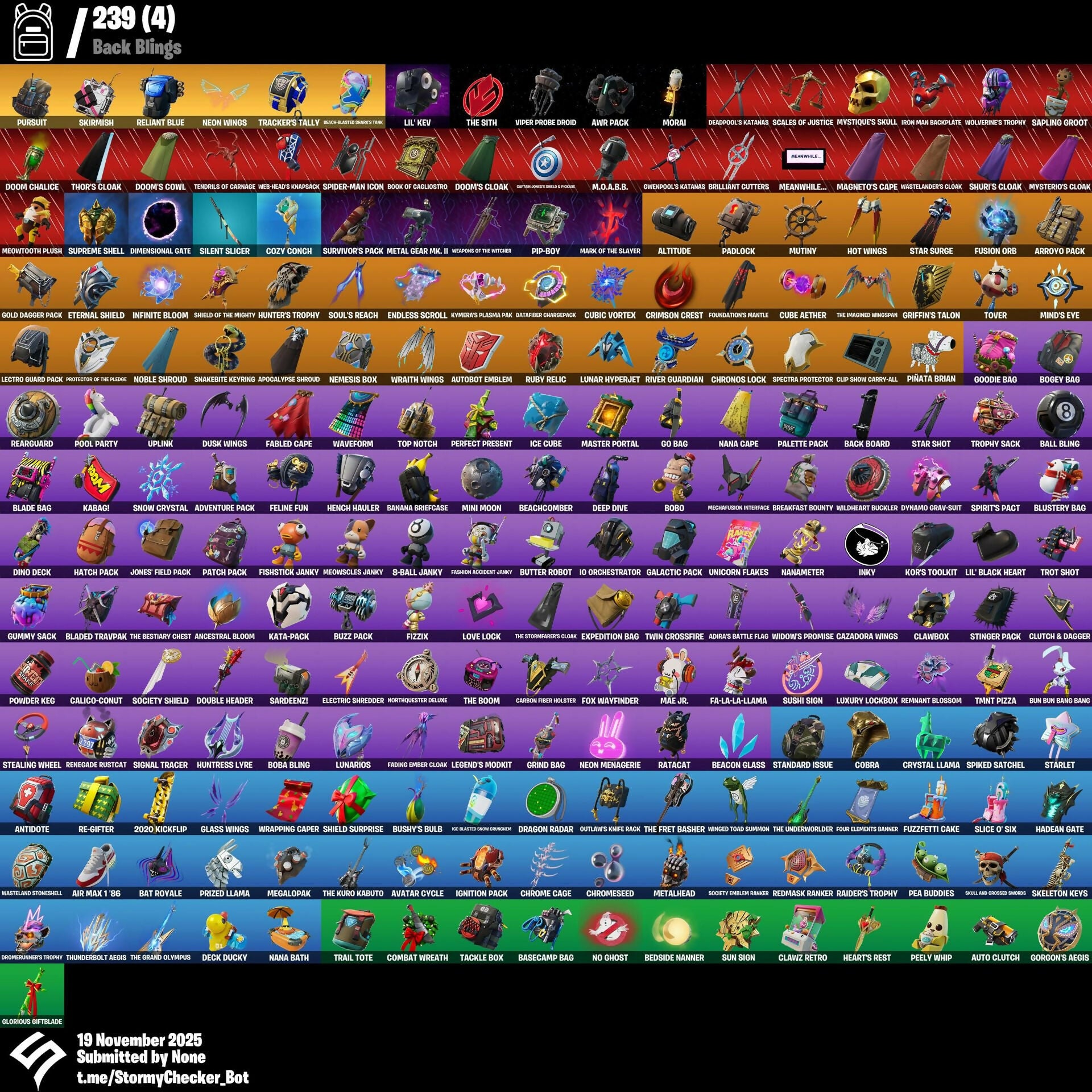 (Snikts!), 2020 Kickflip, 8-Ball Janky, 8-Ball vs Scratch, A Warrior Prepares, Abominable Axe, Adira, Adira's Battle Flag, Adventure Pack, Agent Jones, Agent Peely, Ahsoka Tano, Air Max 1 '86, Air Shredder, Altitude, Ancestral Bloom, Angler Axes, Antidote, Antonia, Aphrodite, Apocalypse Shroud, Aquaman, Aquaman's Trident, Arachrobatics, Arctic Adeline, Arrowpoint Carver, Arroyo Pack, Artemis, Assaultron Blade, Auto Clutch, Autobot Emblem, Avatar Cycle, Avatar's Flourish, Awr Pack, Axe-tral Form, Azarath Metrion Zinthos!, Back Board, Backup Blades, Balance Board, Ball Bling, Balloon Axe, Banana Briefcase, Bananaxe, Bank Shots, Basecamp Bag, Basic Basher, Bat Royale, Battlehawk, Beachcomber, Beacon Glass, Bean Bag, Beastfang, Beatzbunny, Bedside Nanner, Beep Beep, Big Bite, Big Fan, Birthday Basher, Bitey, Blackheart, Blade Bag, Blade of the Waning Moon, Bladed Travpak, Blowin' Up, Blowing Bubbles, Blustery Bag, Board Breaker, Boba Bling, Boba Snack, Bobo, Bogey Bag, Boing!, Bolt Blades, Boogie Down, Book of Cagliostro, Boomin', Boots 'n' Cats, Boulder Breakers, Breakfast Bounty, Breaking Waves, Breakneck, Breakshore Trident, Breathless Blades, Brilliant Cutters, Brite Moves, Brite Raider, Bronzed Scimitars, Brutus, Bun Bun Bang Bang, Bunker Basher, Bunker Jonesy, Bushy's Bulb, Bust A Move, Butter Robot, Buzz Pack, Bye Bye Bye, Bytes, Cake Clobberer, Calamity, Calculated, Calico-Conut, Call Me, Called Shot, Cameo vs Chic, Captain Clamerica, Captain Jones, Captain Jones's Shield & Pickaxe, Carbide, Carbon Fiber Holster, Card Drop, Cardistry, Carefree, Carnage, Carnage Cleaver, Cat Flip, Catalyst, Cazadora Wings, Celebratory Slice, Cerberus, Chainsaur, Charlotte, Chef's Special, Chess Master, Choice Knit, Chop Chop, Chrome Cage, Chrome Punk, Chromeseed, Chronos Lock, Clang & Basher, Clawbox, Clawz Retro, Clean Sweep, Clip Show Carry-All, Cluck, Cluck Strut, Clutch & Dagger, Cobra, Codsworth's Cleanup, Coin Flip, Combat Wreath, Conch Call, Conga, Conjure Weapon, Cosmic Cleavers, Count It!, Cozy Conch, Crack It, Crescent Shroom, Crimson Crest, Crowning Achievement, Crucible Blade, Crystal Axe of the Masters, Crystal Llama, Cube Aether, Cubic Scepter, Cubic Vortex, Curling Iron, Cybertronian Axe, Cyclo Curl, DJ Yonder, Dabstand, Dagger Dance, Dance Moves, Darth Vader, Datafiber Chargepack, Deadpool, Deadpool's Katanas, Deck Ducky, Deep Dive, Deep End, Default Pickaxe, Demi, Demonslayer Blade, Designated Hitters, Diamond Throne, Diamondclaw Picker, Dice Roll, Dimensional Gate, Dino Deck, Dirtbike Challenge, Disassemble, Dive Knives, Do The 'Split, Doctor Doom, Doctor Slone, Doctor Strange, Don's Dominator, Doom, Doom Chalice, Doom Slayer, Doom's Cloak, Doom's Cowl, Doom's Domain, Double Header, Double Tags, Doze Dab, Dragon Radar, Dragon Rune Lance, Dragon Stance, Dragon's Claw, Dramatic Flares, Dream Feet, Drift, Drippin' Flavor, Dromerunner's Trophy, Droop, Drum Major, Drummies, Duelist's Foil, Dumbbell Driver, Dune Scooper, Dusk Wings, Dusty, Dynamo Gravy-Suit, Eclipsed Edges, Electric Shredder, Elegance Blade, Ember, Ember Pick, Emma Frost, Empress Fan Dance, Endless Scroll, Energy Claw, Eon Blades, Epic Swords of Wonder, Era, Erisa, Eternal Knight, Eternal Shield, Evasive Maneuvers, Everybody Loves Me, Evie, Expedition Bag, Expressionism, Fa-La-La-Llama, Fabio Sparklemane, Fable, Fabled Cape, Fade, Fading Ember Cloak, Fanged Foresight, Fashion Accident Janky, Featherweight, Feline Fun, Fire Show, Fireworks Salvo, Fish Thicc, Fishbone Flayer, Fishstick Janky, Fizzix, Flaky Feast, Flashback Breakdown, Flippin' Away, Foil Flex, Fork Knife, Foundation's Mantle, Foundation's Plasma Spike, Four Elements Banner, Fox Wayfinder, Foxfire Edge, Free Flow, Fright Funk, Frozen Axe, Fusion, Fusion Orb, Fusion Scythe, Fuzzfetti Cake, Galactic Pack, Gale Force, Gangnam Style, Gear Specialist Maya, Gentleman's Dab, Geralt of Rivia, Get Funky, Get Gone, Get Out Of Your Mind, Giddy-Up, Gilded Morphic Blades, Glass Wings, Glorious Giftblade, Go Bag, Gold Dagger Pack, Golden King, Golf Clap, Good Guy, Goodie Bag, Gorgon's Aegis, Griffin's Talon, Grind Bag, Griz, Grizzly Gooper, Groot, Groot's Sap Axes, Guardian Daggers, Guggimon, Guiding Glow, Gum Brawler, Gumbo, Gummy Sack, Gunnar, Gwen-step, Gwendpool's Katanas, Gwenpool, Gwenpool's Katanas, Hack & Smash, Hadean Gate, Hadean Key, Hades, Hammerhead Morty, Hammers of Justice, Hand of Lightning, Hand-forged, Handheld Missile, Hang Loose Celebration, Harlowe, Harmonic Axes, Hatch Pack, Haven, Heart Sign, Heart's Carver, Heart's Rest, Heartburst, Hellfire Dance, Hello Friend, Helsie, Hench Hauler, Hey Now!, High Five, Highlight Strikers, Highwire, Hit It, Holiday Boxy, Holly Hatchets, Hooplah Hammer, Hope, Hot Marat, Hot Wings, Hula Hoopin', Hunter's Reach, Hunter's Trophy, Huntress, Huntress Lyre, Hybrid, Hydraulic Slammer, Hype, Hypnot-eyes, I Declare!, I Need You To Concentrate, I'm A Mystery, I'm Diamond, IO Eradicator, IO Orchestrator, Ice Cube, Igni Sign, Ignition Pack, Illusionist's Blades, Imani, Imperial March, Indiana Jones, Infinite Bloom, Inky, Introducing..., Iron Man Backplate, It Is Finished, It's Dynamite!, It's Go Time!, It's... You?, J.B. Chimpanski, Jack's Cutlass and Bane, Jaywalking, Jennifer Walters, Joey, Jones' Field Pack, Josie, Journey vs Hazard, Jubilation, Jules, Jump Jets, K.O. Club, Kabagi, Kado Thorne, Kaiju Cutter, Kata-Pack, Keyed Up, Khaby Lame, Kiara K.O., Kick Back, Kit, Kitanas, Knife Sharpener, Kondor, Kor, Kor Flails, Korra, Kors Toolkit, Krisabelle, Kymera, Kymera’s Plasma Pak, Lara Croft, Laser Focused, Laugh It Up, Lectro Guard Pack, Lectrostatic Impactor, Legend's Modkit, Lennox Rose, Lexa, Lil 't-6 Shuttle, Lil Split, Lil' Black Heart, Lil' Kev, Lil' Longboat, Lil' Monster, Lil' Prancer, Lil' Rover, Lil' Saucer, Lil' Warthog, Llaminator, Lockpick, Lollipopper, Lorenzo, Love It!, Love Lock, Lt. Evergreen, Lt. John Llama, Lucha Slashers, Lucky Lance, Lug Axe, Lunar Charge, Lunar Defender, Lunar Glow, Lunar Hyperjet, Luna
