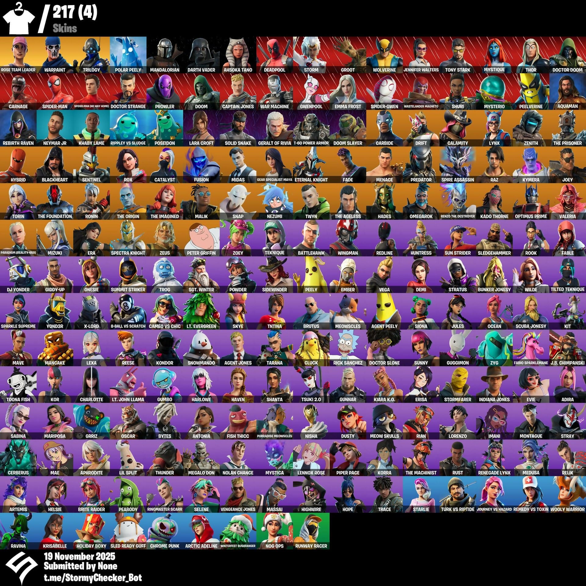 217 Skins | OG STW | Rose Team Leader | Warpaint | Trilogy | Solid Snake | Mariposa | Rose Glow | Mean Streak | Ol' Woody | S11-Badge-3 | S12-Badge-3 | 1750 VB