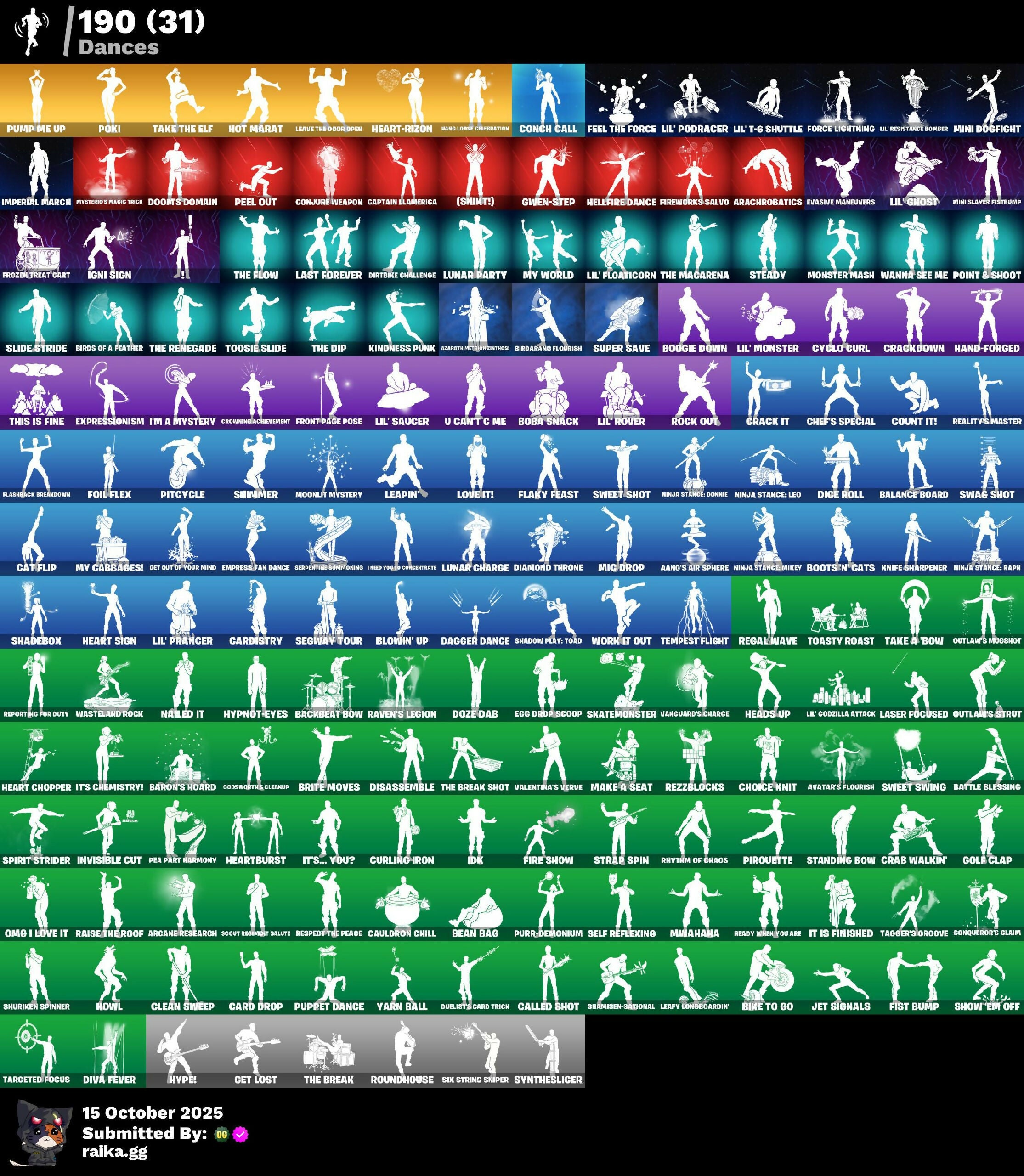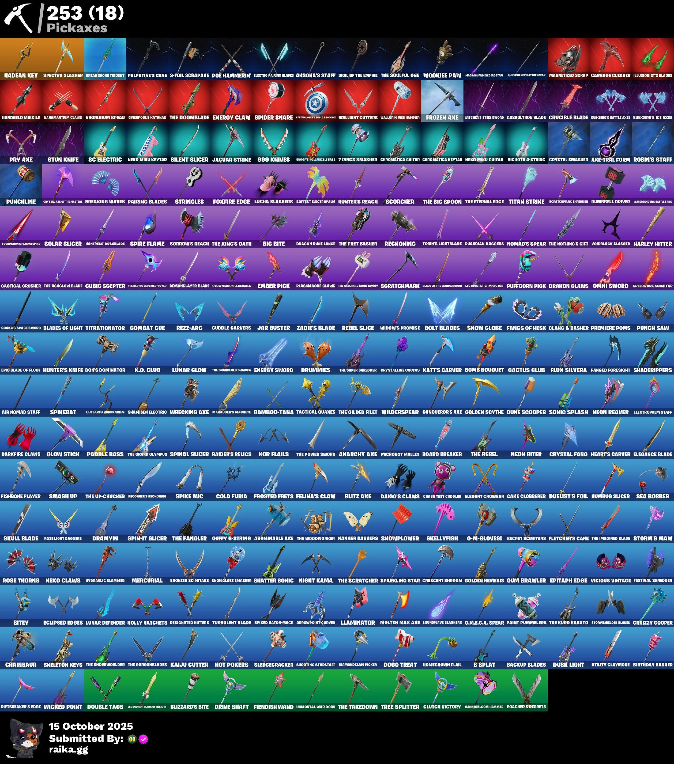 (Sniht!), 1-Ball, 7 Rings Smasher, 999 Knives, Aang, Aang's Air Sphere, Abominable Axe, Adira, Agent Jones, Agent Patch, Ahsoka Tano, Ahsoka's Staff, Air Nomad Staff, Alli, Alto, Anarchy Axe, Antonia, Aphrodite, Apprentice Evie, Arachrobatics, Arcane Research, Arctic Adeline, Ares, Ariana Grande, Arrowpoint Carver, Artemis, Assaultron Blade, Astrea, Avatar State Aang, Avatar's Flourish, Axe-Tral Form, Azarath Metrion Zinthos!, B Splat, Backbeat Bow, Backup Blades, Balance Board, Bamboo-Tana, Baron's Hoard, Battle Blessing, Bean Bag, Bichota 4-String, Big Bite, Big Dill, Bike To Go, Birdarang Flourish, Birds of a Feather, Birthday Basher, Bitey, Blade of the Warning Moon, Blades of Light, Blitz Axe, Blizzard's Bite, Blowin' Up, Board Breaker, Boba Snack, Bolt Blades, Bomb Bouquet, Bones, Boogie Down, Boots 'N' Cats, Boxy, Breaking Waves, Breakshore Trident, Brilliant Cutters, Brite Bomber, Brite Moves, Brite Raider, Bronzed Scimitars, Bytes, Cactical Crusher, Cactus Club, Cake Clobberer, Calamity, Called Shot, Captain America's Shield & Hookar, Captain Blamerica, Captain Jones, Card Drop, Cardistry, Carnage, Carnage Cleaver, Cassidy Quinn, Cat Flip, Cauldron Chill, Cerberus, Chainsaur, Chaos Director, Charlotte, Chef's Special, Choice Knit, Chromatica Guitar, Chromatica Keytar, Chrome Punk, Clang & Basher, Clean Sweep, Cluck, Clutch Victory, Codsworth's Cleanup, Cold Furia, Combat Cue, Conch Call, Conjure Weapon, Conqueror's Axe, Conqueror's Claim, Count It!, Crab Walkin', Crack It, Crackabella, Crackdown, Crackshot, Crash Test Cuddler, Crescent Shroom, Crowning Achievement, Crucible Blade, Crystal Axe of the Masters, Crystal Fang, Crystal Smasher, Crystalline Cactus, Cubic Scepter, Cuddle Carvers, Cuddli Team Specialist, Curling Iron, Cyclo Curl, DJ Yonder, Dagger Dance, Daigo, Daigo's Claws, Dark Doggo, Dark Tricera Ops, Darkfire Claws, Deimos, Demon Slayer Blade, Desert Dawn Lyric, Designated Hitters, Diamond Throne, Diamondclaw Picker, Dice Roll, Dirtbike Challenge, Disassemble, Diva Fever, Dizzie, Doctor Strange, Dogg Treat, Don's Dominator, Doom, Doom Slayer, Doom's Domain, Double Tags, Doze Dab, Dragon Rune Lance, Drakon Claws, Drakon Steel Hybrid, Dramyin, Drive Shaft, Drummies, Duelist's Card Trick, Duelist's Foil, Dumbbell Driver, Dune Scooper, Dusk Knight, Dusk Light, Dusty, Dynamo Tntina, Eclipsed Edges, Egg Drop Scoop, Electropalm Staff, Electrostatic Impactor, Elegance Blade, Elegant Crowbar, Ember Pick, Emma Frost, Emperor Palpatine, Empress Tan Dance, Energy Claw, Energy Sword, Enigmatic Gaga, Epic Blade of Floof, Epitaph Edge, Era, Eren Jaeger, Erisa, Evasive Maneuvers, Evie, Expressionism, Fabio Sparklemane, Fanged Foresight, Fangs of Hesk, Feel The Force, Felina, Felina's Claw, Festival Lace, Festival Shredder, Fiendish Wand, Fire Show, Fireworks Salvo, Fish Thicc, Fishbone Flayer, Fist Bump, Flaky Feast, Flashback Breakdown, Fletcher Kane, Fletcher's Cane, Flux Silvera, Foil Flex, Force Lightning, Foundation's Palace Spear, Foxfire Edge, Frontpage Pose, Frosted Frets, Frozen Axe, Frozen Treat Cart, General Grievous, Geralt Of Rivia, Get Lost, Get Out Of Your Mind, Giddy-Up, GloWnicorn Llamaxes, Glow Stick, Godzilla Evolved, Golden Nemesis, Golden Scythe, Golf Clap, Grizz, Grizzly Gooper, Guardian Daggers, Guffy 6-String, Gum Brawler, Gumbo, Gunnar, Gwen-Step, Gwenpool, Gwenpool's Katanas, Hadean Key, Hand-Forged, Handheld Missile, Harley Hitter, Harley Quinn, Harlowe, Haruka Of The Masks, Haven, Haylee Skye, Heads Up, Heart Chopper, Heart Sign, Heart's Carver, Heart-Rizon, Heartburst, Hellfire Dance, Helsie, Hemlock, Hero Baymax, Highwire, Holiday Boxy, Holly Hatchets, Homegrown Flail, Hope, Hot Marat, Hot Pokers, Howl, Humbug Slicer, Hunter's Knife, Hunter's Reach, Hydraulic Slammer, Hype!, Hypnot-Eyes, I Need You To Concentrate, I'm a Mystery, IDK, Igni Sign, Illusionist's Blades, Imani, Immortal War Doru, Imperial March, Indiana Jones, Invisible Cut, It Is Finished, It's Chemistry!, It's... You?, J.B. Chimpanski, Jack Skellington, Jade, Jaguar Strike, Jar Buster, Jet Signals, Joss, K.O. Club, Kado Thorne, Kaiju Cutter, Karuta Harley Quinn, Katt, Katt's Carver, Keisha Cross, Kendo, Khaby Lame, Kiara K.O., Killswitch, Kindness Punk, Knife Sharpener, Knight Conqueror, Komplex, Kor, Kor Flails, Korra, Krisabelle, Kymera, Lana Llane, Lara Croft, Laser Focused, Last Forever, Leafy 'Longboardin', Leapin', Leave The Door Open, Legendary Blade of Insight, Lennox Rose, Lightrider, Lil Split, Lil' Floaticorn, Lil' Ghost, Lil' Godzilla Attack, Lil' Monster, Lil' Podracer, Lil' Prancer, Lil' Resistance Bomber, Lil' Rover, Lil' Saucer, Lil' T-6 Shuttle, Liteshow, Llambro, Llaminator, Lorenzo, Love It!, Lt. John Llama, Lucha Slashers, Lunar Charge, Lunar Defender, Lunar Glow, Lunar Party, Lynx, Lyric, Mae, Magmavore Electroshot, Magnetized Scrap, Make A Seat, Malik, Mariposa, Massai, Medusa, Meg, Megalo Don, Meow Skulls, Meowdas, Mercurial, Mic Drop, Microbot Mallet, Mini Dogfight, Mini Slayer Fistbump, Miravoder's Machete, Mizuki, Molten Max Axe, Monster Mash, Montague, Montress Dugeskade, Moonlit Mystery, Morgan Myst, Mwahaha, My Cabbages!, My World, Mysterio, Mysterio's Magic Trick, Mystica, Nailed It, Nanner Bashers, Nannerbloom Hammer, Nanomantum Claws, Neko Claws, Neko Hatsune Miku, Neko Miku Guitar, Neko Miku Keytar, Neon Biter, Neon Reaver, Neymar Jr, Nezumi, Night Kama, Ninja Stance: Donnie, Ninja Stance: Leo, Ninja Stance: Mikey, Ninja Stance: Raph, Nisha, Nitelite, Nolan Chance, Nomad's Spear, Nyanja, O-M-Gloves!, O.M.E.G.A. Spear, OMG I Love It, Omni Sword, Oscar, Outlaw Midas, Outlaw's Mugshot, Outlaw's Strut, Outlaw's Unicorns, Paddle Bass, Paint Pummeler's, Pairing Blades, Palpatine's Cane, Paradigm (Reality-659), Paradise Meowclose, Pea Part Harmony, Peabody, Peel Out, Peelverine, Peter Griffin, Piper Pace, Pirouette, Pitcycle, Plasmacore Claws, Podcher's Regrets, Poe Dameron, Poe Hammerin', Poet, Point & Shoot, Poki, Polar Peely, Poseidon, Powder, Power Chord, Pow