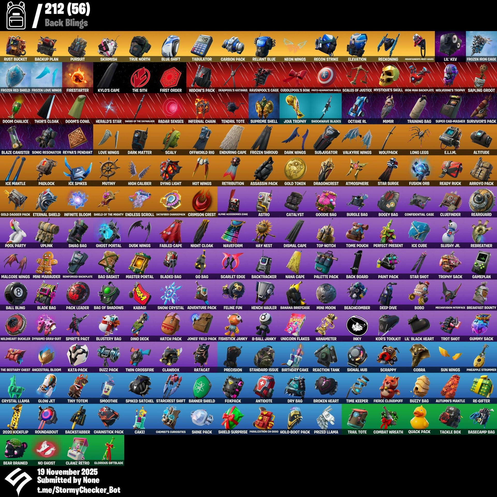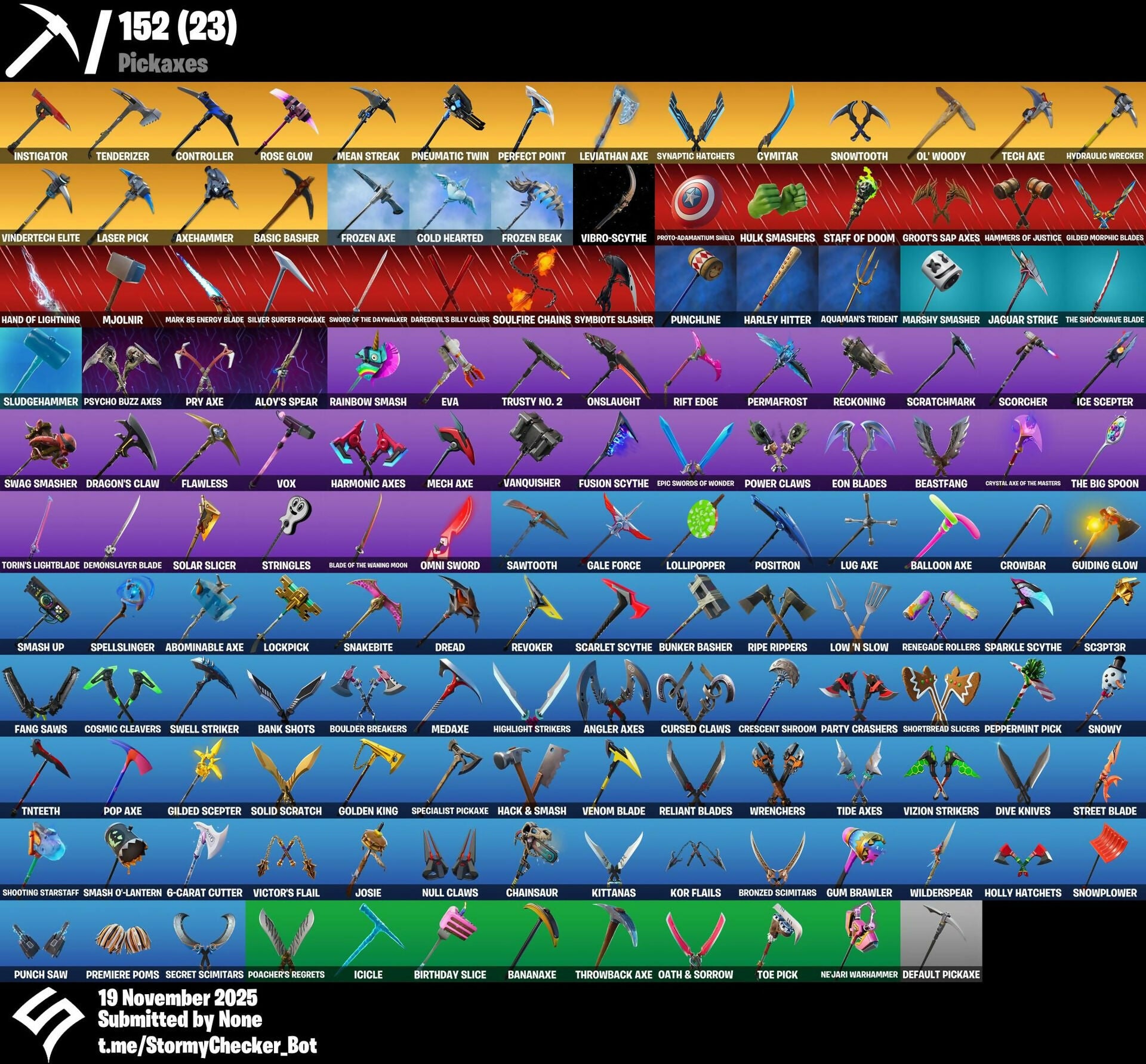 2020 Kickflip, 6-Carat Cutter, 8-Ball Janky, 8-Ball vs Scratch, A Warrior Prepares, A.I.M., Abominable Axe, Adventure Pack, Agent Jones, Agent Peely, Air Shredder, Aloy, Aloy's Spear, Alpine Ace (CAN), Altitude, Ancestral Bloom, Angler Axes, Antidote, Aquaman, Aquaman's Trident, Arachne, Arroyo Pack, Assassin Pack, Astro, Atmosphere, Autumn’s Mantle, Axehammer, B.R.U.T.E. Gunner, Back Board, Backstabber, Backtracker, Backup Plan, Bag of Shadows, Ball Bling, Balloon Axe, Banana Briefcase, Bananaxe, Bank Shots, Banner Shield, Bao Basket, Bao Bros, Basecamp Bag, Basic Basher, Battlehawk, Beachcomber, Bean Bag, Bear Brained, Beastfang, Beep Beep, Best Mates, Birdie, Birthday Cake, Birthday Slice, Biz, Black Widow Outfit, Blackheart, Blade, Blade Bag, Blade of the Waning Moon, Bladed Bag, Blaze, Blaze Canister, Blizzard Bomber, Blowing Bubbles, Blue Shift, Blue Striker, Blue Team Leader, Blustery Bag, Bobo, Bogey Bag, Boing!, Boobytrapped, Boogie Down, Boomin', Boots 'n' Cats, Boulder Breakers, Branded Brigadier, Breakdown, Breakfast Bounty, Breakneck, Breezy, Brite Bomber, Broken Heart, Bronzed Scimitars, Brutus, Bunker Basher, Bunker Jonesy, Burgle Bag, Bushranger, Buzz Pack, Buzzy Bag, Cake!, Calamity, Calculated, Call Me, Cameo vs Chic, Captain America, Carbide, Carbon Commando, Carbon Pack, Cardistry, Cat Flip, Catalyst, Chainsaur, Chainstick Pack, Charlotte, Chemist’s Curiosities, Chief Hopper, Choice Knit, Chun-Li, Clawbox, Clawz Retro, Clean Sweep, Cloud Striker, Cluck, Cluck Strut, Cluefinder, Cobalt, Cobra, Coin Flip, Cold Hearted, Combat Wreath, Confidential Case, Conga, Controller, Cosmic Cleavers, Crescent Shroom, Crimson Crest, Crowbar, Crowning Achievement, Crystal Axe of the Masters, Crystal Llama, Cuddlepool's Bow, Cuddlepowl, Cursed Claws, Cyclo Curl, Cymitar, DJ Yonder, Dabstand, Dance Moves, Daredevil, Daredevil's Billy Clubs, Dark Matter, Dark Voyager, Dark Wings, Datafiber Chargepack, Daywalker's Kata, Deadpool, Deadpool’s Katanas, Deep Dive, Deep End, Deep Sea Destroyer, Default Pickaxe, Demi, Demonslayer Blade, Diamond Diva, Dino Deck, Dire, Dismal Cape, Dive Knives, Doctor Doom, Doom Chalice, Doom’s Cowl, Dragon Stance, Dragon's Claw, Dragoncrest, Dread, Drift, Droop, Dry Bag, Dusk, Dusk Wings, Dying Light, Dynamo Grav-Suit, E.L.I.M., El Chapulin Colorado, Elevation, Elite Agent, Elmira, Ember, End Zone, Endless Scroll, Enduring Cape, Enforcer, Eon Blades, Epic Swords of Wonder, Eternal Knight, Eternal Shield, Eternal Voyager, Eva, Evasive Maneuvers, Evie, Fabio Sparklemane, Fable, Fabled Cape, Fade, Fang Saws, Featherweight, Feline Fun, Fennix, Fierce, Fierce Cloudpuff, Fire Spinner, Firestarter, First Order, Fishtstick Janky, Fixer, Flamenco, Flawless, Flippin' Away, Foxpack, Free Flow, Freestylin', Frost Squad, Frozen Axe, Frozen Beak, Frozen Iron Cage, Frozen Love Ranger, Frozen Love Wings, Frozen Raven, Frozen Red Knight, Frozen Red Shield, Frozen Shroud, Fusion, Fusion Orb, Fusion Scythe, Gale Force, Gameplan, Gangnam Style, Garrison, Gear Specialist Maya, Gentleman's Dab, Get Funky, Ghost Portal, Ghost Rider, Ghoul Trooper, Giddy-Up, Gilded Morphic Blades, Gilded Scepter, Glorious Giftblade, Glow Jet, Go Bag, Gold Dagger Pack, Gold Token, Golden King, Golf Clap, Goodie Bag, Grand Salute, Grim Fable, Groot, Groot's Sap Axes, Groove Jam, Guiding Glow, Gum Brawler, Gumbo, Gummy Sack, Gumshoe, Gunnar, Hack & Smash, Hammers of Justice, Hand of Lightning, Hand-forged, Harley Hitter, Harley Quinn, Harmonic Axes, Hatch Pack, Have A Seat, Haven, Havoc, Hay Man, Hay Nest, Heart-rizon, Heist, Hello Friend, Hemlock, Hench Hauler, Herald’s Star, High Caliber, High Five, Highlight Strikers, Holiday Boxy, Holly Hatchets, Holo-Boot Pack, Hoop Master, Hope, Hot Marat, Hot Wings, Hula Hoopin', Hulk Smashers, Huntress, Hybrid, Hydraulic Wrecker, Hype, I Declare!, I'm A Mystery, Ice Cube, Ice Mantle, Ice Scepter, Ice Spikes, Icicle, Infernal Chain, Infinite Bloom, Inky, Instigator, Instinct, Introducing..., Iris, Iron Man Backplate, It's Go Time!, J.B. Chimpanski, Jaguar Strike, Jaywalking, Jedi Training, Jennifer Walters, John Wick, Joia Trophy, Jones’ Field Pack, Josie, Journey vs Hazard, Jules, Jump Jets, Jumpshot, Kabag!, Kait Diaz, Kata-Pack, Keep It Mello, Keyed Up, King Flamingo, Kit, Kittanas, Kondor, Kor, Kor Flails, Kor's Toolkit, Kratos, Krisabelle, Kylo Ren, Kylo's Cape, Laguna, Laid Back Shuffle, Lara Croft, Laser Pick, Leviathan Axe, Lexa, Lil' Black Heart, Lil' Kev, Lil' Monster, Lil' Rover, Llamacadabra, Lockpick, Lollipopper, Long Legs, Love It!, Love Ranger, Love Wings, Low 'N Slow, Lt. Evergreen, Lt. John Llama, Lug Axe, Lunar Charge, Luxe, Lynx, Magnus, Malcore, Malcore Wings, Mancake, Mandalorian, Marcus Fenix, Mark 85 Energy Blade, Marshmimi, Marshy Smasher, Mashed Potato, Master Key, Master Portal, Mave, Mean Streak, Mech Axe, Mechafusion Interface, Medaxe, Menace, Meowscles, Merry Marauder, Mic Drop, Midas, Mimir, Mini Marauder, Mini Moon, Mission Specialist, Mjolnir, Moonwalker, Mutiny, Mwahaha, Mystique, Mystique's Skull, Nailed It, Nana Cape, Nana Nana, Nanameter, Ne'Jari Warhammer, Neon Wings, Never Gonna, Neymar Jr, Night Cloak, Nightshade, No Ghost, Nog Ops, Noir, Null Claws, Oath & Sorrow, Ocean, Octane RL, Offworld Rig, Ol' Woody, Omega, Omni Sword, Onesie, Onslaught, Orange Justice, Oscar, Pack Leader, Padlock, Paint Pack, Palette Pack, Pandemonium, Paralitazrôn CH-3000, Party Crashers, Pastel, Paws & Claws, Peace Out, Peely, Peppermint Pick, Perfect Point, Perfect Present, Permafrost, Phone It In, Pineapple Strummer, Pitch Patroller, Plague, Planetary Vibe, Plastic Patroller, Pneumatic Twin, Poacher's Regrets, Point It Out, Point Patroller, Polar Peely, Pool Party, Pop Axe, Popcorn, Positron, Powder, Power Claws, Precision, Predator, Premiere Poms, Prickly Patroller, Prized Llama, Prodigy, Proto-Adamantium Shield, Pry Axe, Psycho Bandit, Psycho Buzz Axes, Pump It Up, Punch Saw, Punchline, Pursuit, Quack Pack, Radar Senses, Rage Quit, 