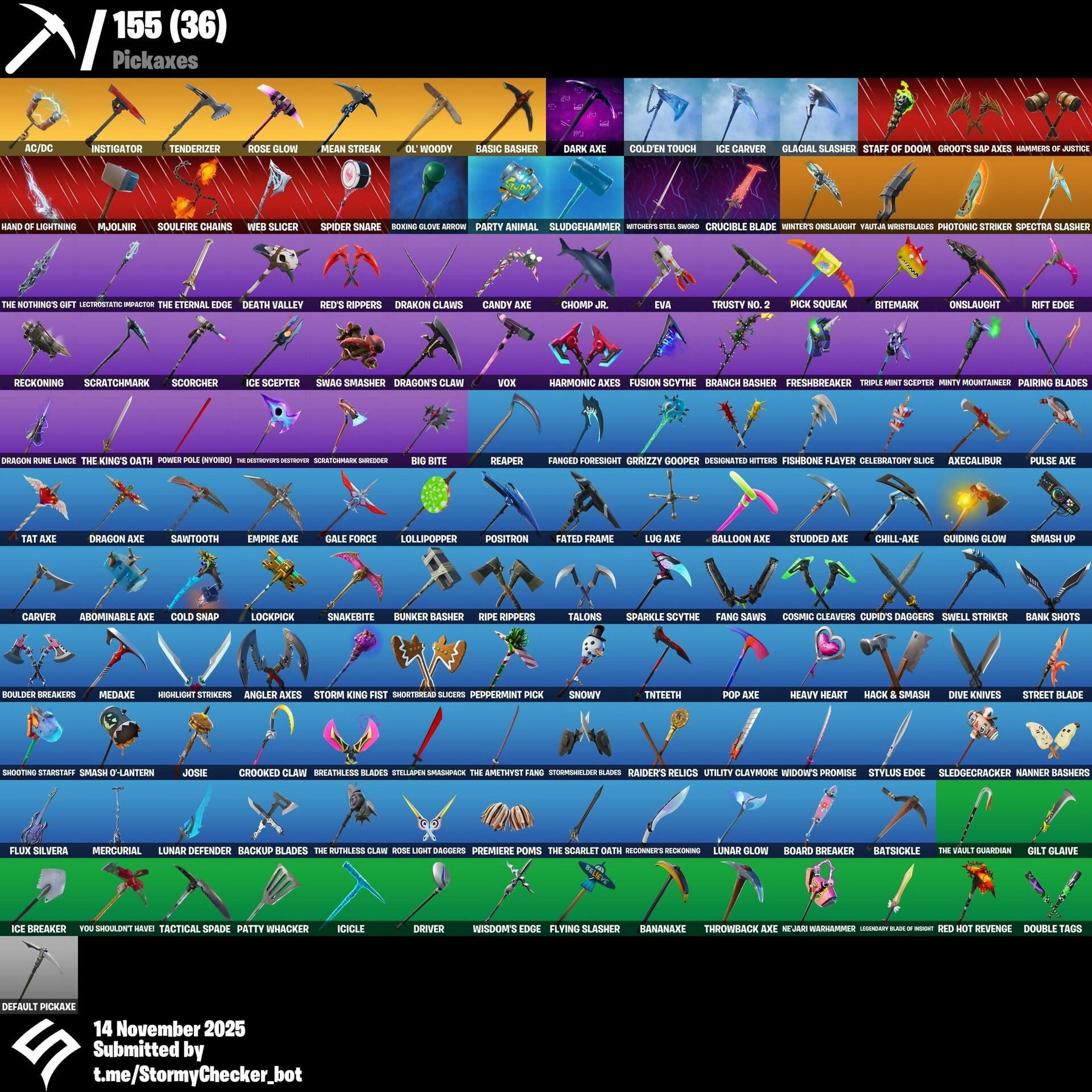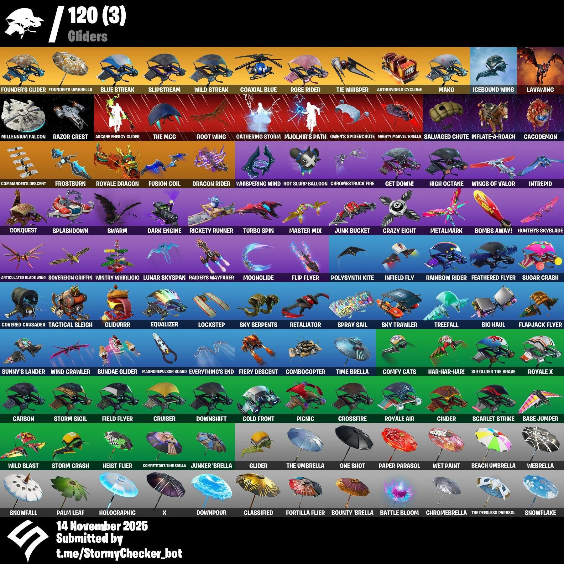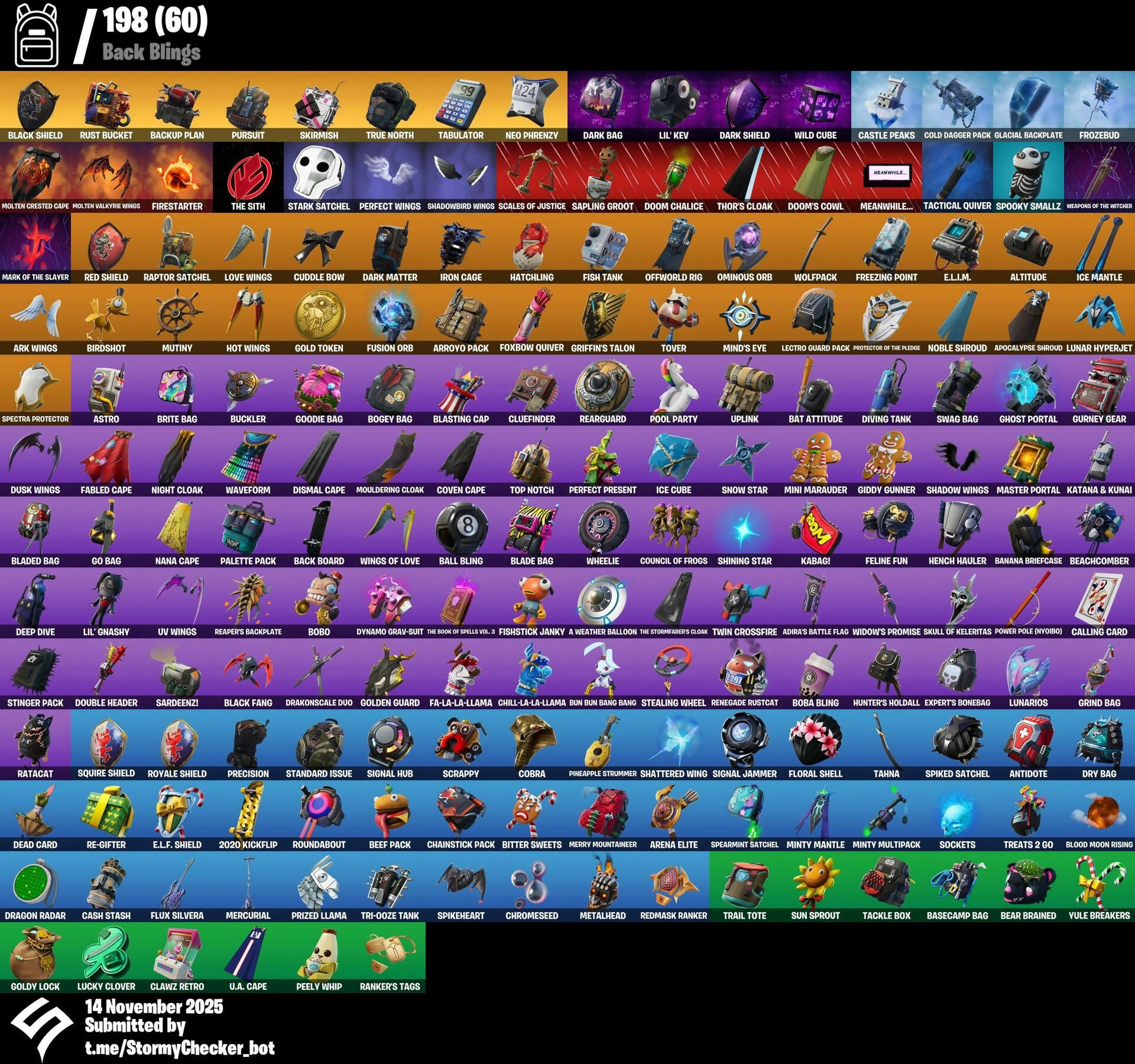 2020 Kickflip, 8-Ball vs Scratch, A Weather Balloon, A.I.M., Abominable Axe, Ac/Dc, Adira, Adira's Battle Flag, Agent Peely, Air Horn, Altitude, Angler Axes, Antidote, Apocalypse Shroud, Arachrobatics, Arcane Energy Glider, Arctic Adeline, Arctic Assassin, Arena Elite, Ark, Ark Wings, Arroyo Pack, Articulated Blade Wing, Assault Trooper, Astra, Astro, Astroworld Cyclone, Axecalibur, Back Board, Backup Blades, Backup Plan, Balance Board, Ball Bling, Balloon Axe, Banana Briefcase, Bananaxe, Bank Shots, Base Jumper, Basecamp Bag, Basic Basher, Bat Attitude, Batsickle, Battle Bloom, Battlehawk, Beach Umbrella, Beachcomber, Bear Brained, Beef Pack, Best Mates, Big Bite, Big Haul, Big Mouth, Birdshot, Bitemark, Bitter Sweets, Black Fang, Black Knight, Black Shield, Blackheart, Blade Bag, Bladed Bag, Blasting Cap, Blaze, Blood Moon Rising, Blowin' Up, Blowing Bubbles, Blue Squire, Blue Streak, Blue Team Leader, Board Breaker, Boba Bling, Boba Snack, Bobo, Bogey Bag, Boing!, Bolt, Bombs Away!, Boogie Down, Boomin', Boulder Breakers, Bouncer, Bounty 'Brella, Boxing Glove Arrow, Branch Basher, Breakpoint, Breathless Blades, Brite Bag, Brite Bomber, Brite Gunner, Brush Your Shoulders, Brutus, Buckler, Bulletproof, Bullseye, Bun Bun Bang Bang, Bunker Basher, Bunker Jonesy, Burnout, Bytes, Cacodemon, Calamity, Calculated, Call Me, Called Shot, Calling Card, Cameo vs Chic, Candy Axe, Carbide, Carbon, Carver, Cash Stash, Castle Peaks, Cat Flip, Catalyst, Celebratory Slice, Chainstick Pack, Chill-Axe, Chill-La-La-Llama, Chimichanga!, Chomp Jr., Chrome Punk, Chromebrella, Chromeseed, Chromestruck Fire, Cinder, Circuit Breaker, Clash, Classified, Clawz Retro, Clean Sweep, Cloaked Shadow, Cluck Strut, Cluefinder, Coaxial Blue, Cobra, Codename E.L.F., Cold Dagger Pack, Cold Front, Cold Snap, Cold'en Touch, Combocopter, Comfy Cats, Commander's Descent, Commando, Competitor's Time Brella, Conga, Conquest, Cosmic Cleavers, Council Of Frogs, Coven Cape, Covered Crusader, Crackshot, Crazy Eight, Crimson Scout, Crooked Claw, Crossfire, Crowning Achievement, Crucible Blade, Cruiser, Crusher, Crystal, Cuddle Bow, Cuddle Team Leader, Cupid's Daggers, Curling Iron, DJ Yonder, Dab, Dabstand, Dance Moves, Dark Axe, Dark Bag, Dark Bomber, Dark Engine, Dark Jonesy, Dark Matter, Dark Red Knight, Dark Shield, Dark Voyager, Dark Wild Card, Dead Card, Death Valley, Decaying Dribbler, Deep Dive, Default Pickaxe, Demi, Desert Dominator, Designated Hitters, Desperado, Dire, Dirtbike Challenge, Dismal Cape, Dive Knives, Diving Tank, Do The 'Split, Doctor Doom, Doom Chalice, Doom Slayer, Doom's Cowl, Double Header, Double Tags, Doublecross, Downpour, Downshift, Doze Dab, Dragon Axe, Dragon Radar, Dragon Rider, Dragon Rune Lance, Dragon Stance, Dragon's Claw, Drakon Claws, Drakon Steel Hybrid, Drakonscale Duo, Dream, Drift, Driver, Droop, Dry Bag, Dusk, Dusk Wings, Dusty, Dynamo Grav-Suit, E.L.F. Shield, E.L.I.M., Elite Agent, Empire Axe, Equalizer, Eva, Everything's End, Evie, Expert's Bonebag, Fa-La-La-Llama, Fable, Fabled Cape, Face Palm, Fang Saws, Fanged Foresight, Fate, Fated Frame, Feathered Flyer, Feline Fun, Field Flyer, Field Surgeon, Fiery Descent, Firestarter, Fireworks Team Leader, First Strike Specialist, Fish Tank, Fishbone Flayer, Fishstick Janky, Flamenco, Flapjack Flyer, Flashback Breakdown, Flip Flyer, Flippin' Away, Flippin' Sexy, Floral Shell, Floss, Flux Silvera, Flying Slasher, Fortilla Flier, Founder's Glider, Founder's Umbrella, Foxbow Quiver, Free Flow, Freestylin', Freezing Point, Fresh Aura, Freshbreaker, Frostbite, Frostburn, Frozebud, Frozen Fishstick, Frozen Nog Ops, Full Tilt, Fusion, Fusion Coil, Fusion Orb, Fusion Scythe, Gale Force, Gathering Storm, Gear Specialist Maya, Gentleman's Dab, Geralt of Rivia, Get Down!, Get Funky, Ghost Portal, Ghoul Trooper, Giddy Gunner, Giddy-up, Gildhart, Gilt Glaive, Ginger Gunner, Gingerbread Raider, Glacial Backplate, Glacial Slasher, Glider, Glidurrr, Gnash, Go Bag, Gold Blooded Ace, Gold Token, Golden Guard, Goldy Lock, Golf Clap, Goodie Bag, Grave, Green Arrow, Griffin's Talon, Grind Bag, Groot, Groot's Sap Axes, Groove Jam, Grriz, Grrizzy Gooper, Guff Gringle, Guiding Glow, Gurney Gear, Gwen's Spiderchute, Hack & Smash, Hammers Of Justice, Hana, Hand Of Lightning, Har-Har-Har!, Harmonic Axes, Hatchling, Have A Seat, Havoc, Heavy Heart, Heist Flier, Hello Friend, Helsie, Hench Hauler, Heron Stance Hero, High Five, High Octane, Highland Warrior, Highlight Strikers, Highrise Assault Trooper, Hollowhead, Holographic, Hope, Hot Marat, Hot Slurp Balloon, Hot Wings, Howl, Hula Hoopin', Human Bill, Hunter's Holdall, Hunter's Skyblade, Huntress, Hybrid, Hype, Hypnot-Eyes, I Declare!, I Need You To Concentrate, Ice Breaker, Ice Carver, Ice Crystal, Ice Cube, Ice Mantle, Ice Scepter, Icebound Midas, Icebound Wing, Icicle, Igni Sign, Infield Fly, Inflate-A-Roach, Instigator, Intrepid, Iris, Iron Cage, Isabelle, It Is Finished, It's Go Time!, Jack Gourdon, Jaywalking, Jennifer Walters, Joni The Red, Josie, Journey vs Hazard, Jump Jets, Jungle Scout, Junk Bucket, Junker 'Brella, Kabagi, Karve, Katana & Kunai, Kenji, Laguna, Laser Focused, Lavawing, Lectro Guard Pack, Lectrostatic Impactor, Legendary Blade Of Insight, Lennox Rose, Leviathan, Lil Split, Lil' Gnashy, Lil' Kev, Lil' Longboat, Lil' Prancer, Lockpick, Lockstep, Lollipopper, Love Ranger, Love Wings, Loveless, Lt. Evergreen, Lucky Clover, Lug Axe, Lunar Defender, Lunar Glow, Lunar Hyperjet, Lunar Party, Lunar Skyspan, Lunarios, Lynx, Magnorepulsor Board, Make A Seat, Make It Rain, Mako, Malik, Mancake, Mandalorian, Manic, Mark Of The Slayer, Marked Marauder, Massai, Master Mix, Master Portal, Maverick, Mean Streak, Meanwhile..., Medaxe, Members Only, Meow Skulls, Mercurial, Merry Marauder, Merry Mountaineer, Metalhead, Metalmark, Mic Drop, Midnight Ops, Mighty Marvel 'Brella, Millennium Falcon, Mina Park, Mind's Eye, Mini Marauder, Mini Slayer Fistbump, Minty Bomber, Minty Mantle, Minty Mountaineer, Minty Multip