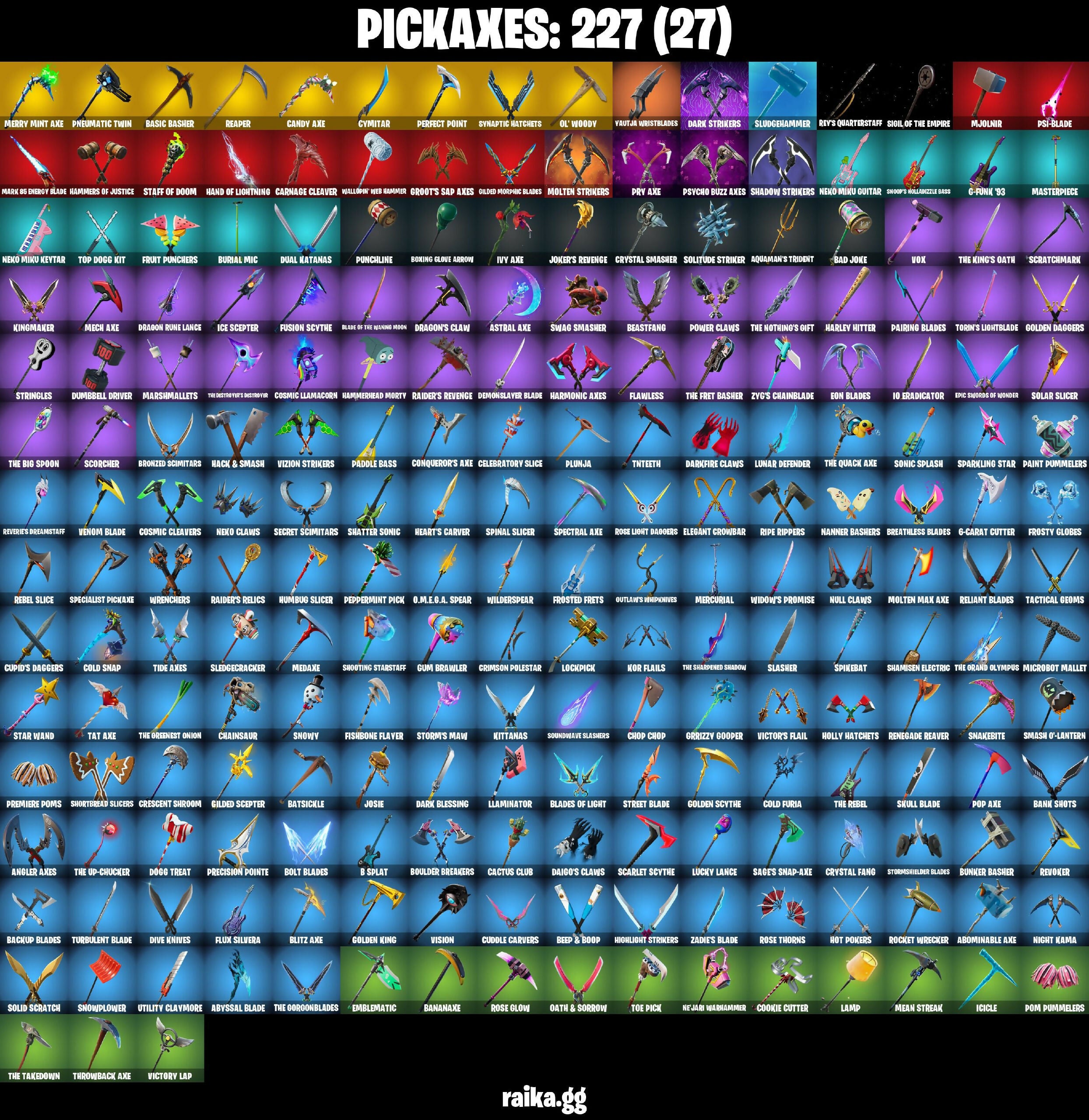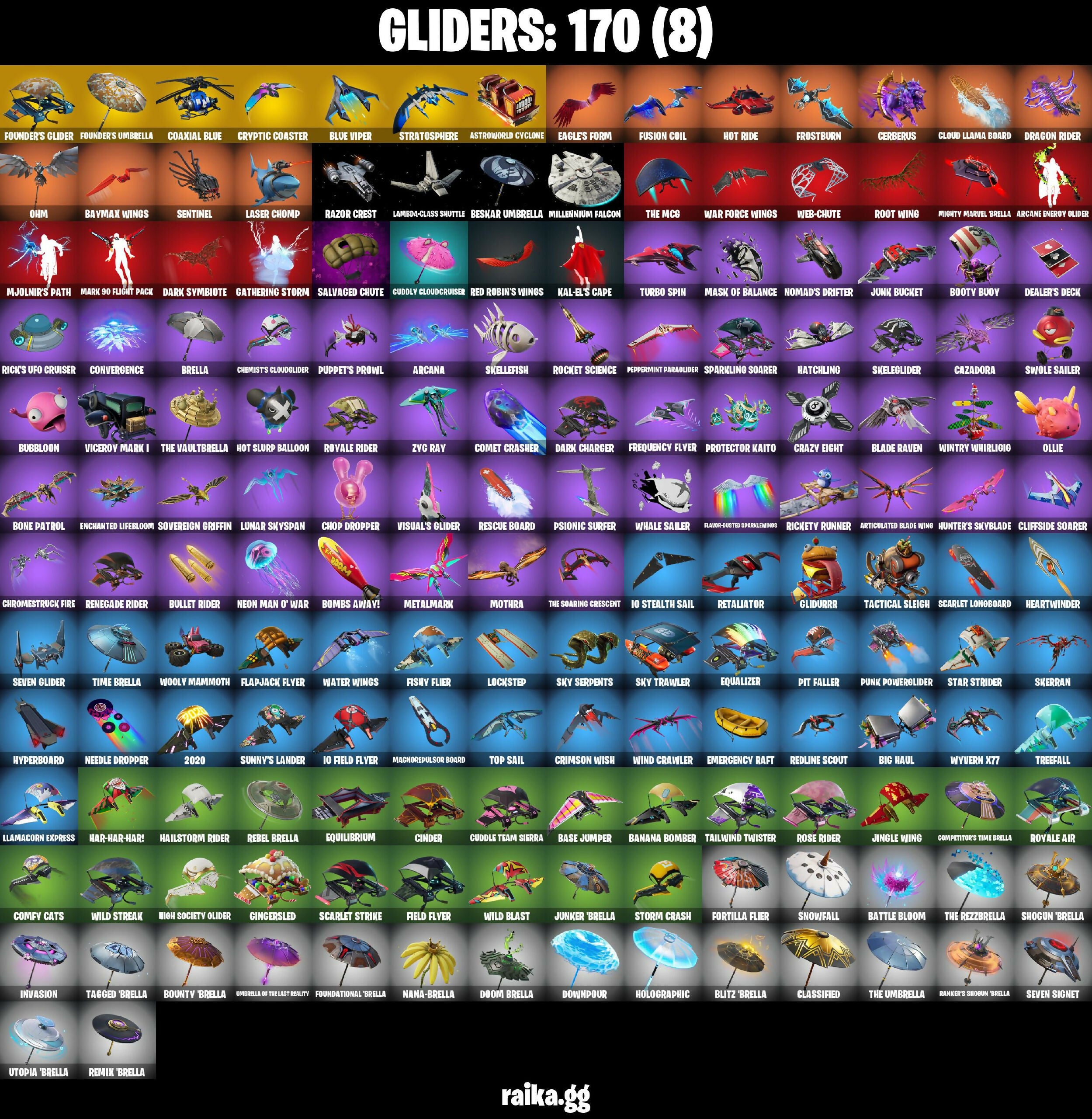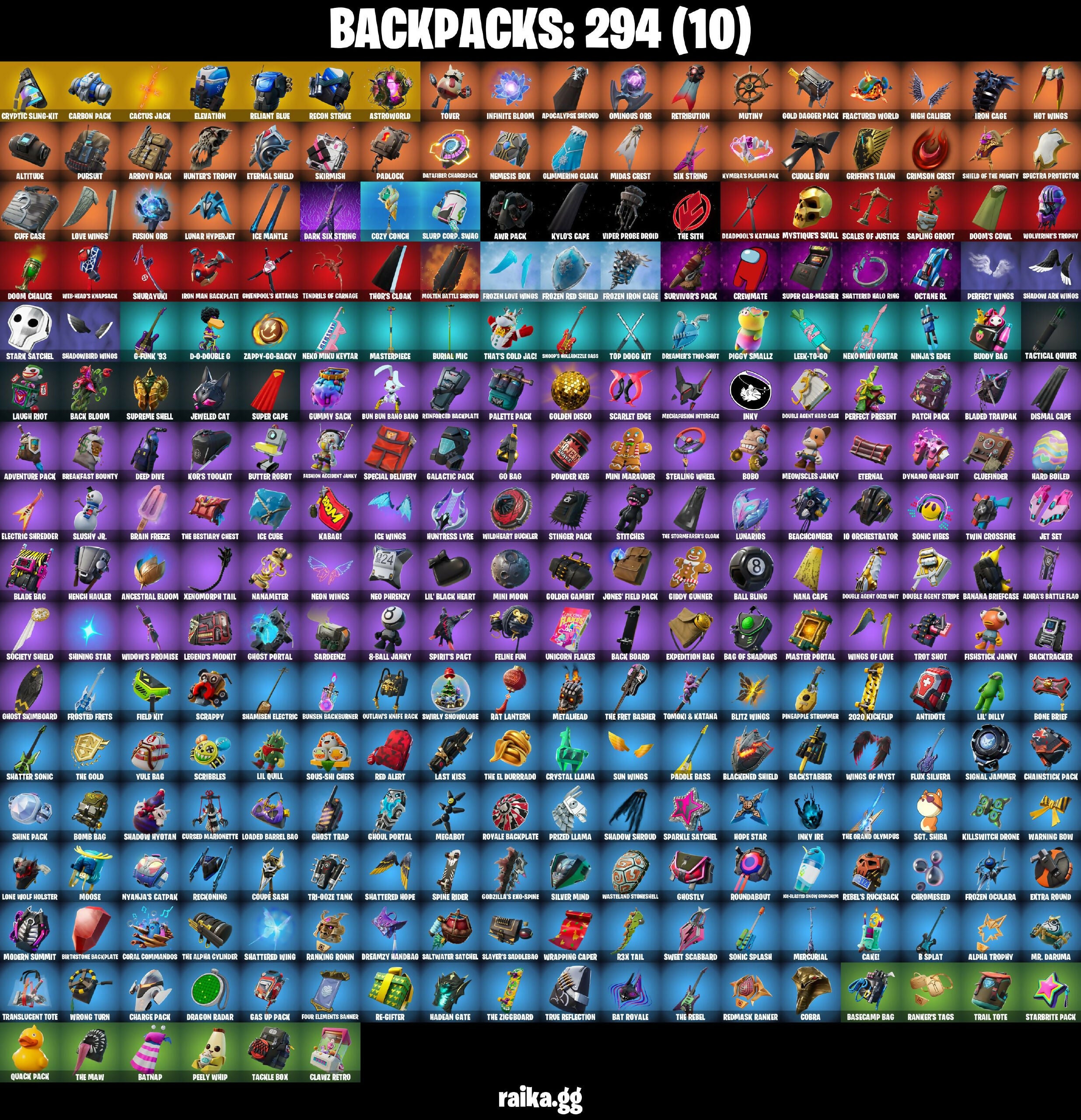 10 Orchestrator, 2020, 2020 Kickflip, 6-Carat Cutter, 8-Ball Janky, 8-Ball vs Scratch, A Warrior Prepares, Abominable Axe, Absenz, Abyssal Blade, Adira, Adira's Battle Flag, Adventure Pack, Aerial Assault Bomber, Aerial Assault Trooper, Agent Jones, Agent Peely, Air Shredder, Alpha Trophy, Altitude, Alto, Amazing Feets, Ancestral Bloom, Angler Axes, Antidote, Apocalypse Shroud, Aquaman, Aquaman's Trident, Arcana, Arcane Energy Glider, Arctic Adeline, Arctica, Ariana Grande, Arroyo Pack, Articulated Blade Wing, Assault Trooper, Astra, Astral Axe, Astro Jack, Astroworld, Astroworld Cyclone, Aura, Awr Pack, B Splat, Back Bloom, Back Board, Backstabber, Backtracker, Backup Blades, Bad Guy, Bad Joke, Bag of Shadows, Ball Bling, Baller, Banana Bomber, Banana Briefcase, Bananaxe, Bandollette, Bank Shots, Baron's Hoard, Bartstone Backplate, Base Jumper, Basecamp Bag, Basic Basher, Bat Royale, Batnap, Batsickle, Battle Blessing, Battle Bloom, Battle Call, Baymax Wings, Be Seeing You, Beachcomber, Beastfang, Beep & Boop, Beep Beep, Behold!, Beskar Umbrella, Bhangra Boogie, Big Fan, Big Haul, Bike To Go, Billy Bounce, Bim Bam Boom, Blackened Shield, Blackheart, Blade Bag, Blade Raven, Blade of the Waning Moon, Bladed Travpak, Blades of Light, Blinding Lights, Blinky, Blitz 'Brella, Blitz Axe, Blitz Wings, Blowin' Up, Blue Viper, Boardwalk Ruby, Bobo, Boing!, Bolt Blades, Bomb Bag, Bombs Away!, Bone Brief, Bone Patrol, Bones, Boogie Down, Boomin', Boop!, Booty Buoy, Boulder Breakers, Bounce Berry, Bounty 'Brella, Boxing Glove Arrow, Boys A Liar, Brain Freeze, Breakfast Bounty, Breakin', Breakpoint, Breathless Blades, Brella, Bring It Around, Brite Agent, Bronzed Scimitars, Bubbloon, Buddy Bag, Build-Up, Bullet Rider, Bulletproof, Bullseye, Bun Bun Bano Bano, Bunker Basher, Bunker Jonesy, Burial Mic, Burst Case Scenario, Butter Robot, Bytes, Cactus Club, Cactus Jack, Cake!, Call Me, Cameo vs Chic, Candy Axe, Cap Kick, Captain Conan Comic Book Outfit, Carbon Commando, Carbon Pack, Carnage Cleaver, Cartwheelin', Cassidy Quinn, Castaway Jonesy, Cat Flip, Catalyst, Cazadora, Celebratory Slice, Cerberus, Chainsaur, Chainstick Pack, Chaos Double Agent, Charge Pack, Charlotte, Chemist's Cloudglider, Chimichanga!, Choice Knit, Chop Chop, Chop Dropper, Chromeseed, Chromestruck Fire, Chugga-Chugga, Chun-Li, Cinder, Clara, Classified, Clawz Retro, Clean Sweep, Cliffside Soarer, Cloud Llama Board, Cloud Striker, Cluck Strut, Cluefinder, Clutch, Coaxial Blue, Cobalt, Cobra, Coin Flip, Cold Furia, Cold Snap, Comet Crasher, Comfy Cats, Competitor's Time Brella, Conga, Conqueror's Axe, Conqueror's Claim, Convergence, Cookie Cutter, Coral Commandos, Cosmic Cleavers, Cosmic Llamacorn, Coupe Sash, Cozy Conch, Crabby, Crazy Boat, Crazy Eight, Crescent Shroom, Crewmate, Crimson Crest, Crimson Polestar, Crimson Wish, Criss Cross, Crowning Achievement, Cryptic Coaster, Cryptic Sling-Kit, Crystal Fang, Crystal Llama, Crystal Smasher, Cuddle Bow, Cuddle Carvers, Cuddle Team Leader, Cuddle Team Sierra, Cuddle Team Specialist, Cuddly Cloudcruiser, Cuff Case, Cupid's Daggers, Cursed Marionette, Cymitar, D'ark, D-O-Double G, Daigo, Daigo's Claws, Dance Monkey, Dark Blessing, Dark Charger, Dark Doggo, Dark Power Chord, Dark Six String, Dark Strikers, Dark Symbiote, Darkfire Claws, Darth Vader, Datafiber Chargepack, Daydream, Deadpool, Deadpool's Katanas, Dealer's Deck, Deep Dive, Demi, Demonslayer Blade, Diamond Diva, Dismal Cape, Distraction Dance, Diva Fever, Dive Knives, Dizzie, Doctor Doom, Doctor Slone, Dogg Treat, Don't Start Now, Doom Brella, Doom Chalice, Doom's Cowl, Double Agent Hard Case, Double Agent Hush, Double Agent Ooze Unit, Double Agent Stripe, Double Agent Wildcard, Double Up, Downpour, Doze Dab, Dragon Radar, Dragon Rider, Dragon Rune Lance, Dragon Stance, Dragon's Claw, Dream, Dream Fleet, Dreamer's Two-Shot, Dreamzy Handbag, Drippin' Flavor, Droop, Dual Katanas, Duelist's Card Trick, Dumbbell Driver, Dummy, Dunk Powerglider, Durr Taisho, Dusk Knight, Dynamic Shuffle, Dynamo, Dynamo Grawl-Suit, Eagle's Form, Echo, Electric Shredder, Electro Swing, Elegant Crowbar, Elevation, Ember, Emblematic, Emergency Raft, Empty Out Your Pockets, Enchanted Lifebloom, Eon Blades, Epic Swords of Wonder, Equalizer, Equilibriom, Eternal, Eternal Knight, Eternal Shield, Evasive Maneuvers, Everybody Loves Me, Evie, Expedition Bag, Extra Round, Fabio Sparklemane, Face Palm, Fade, Fan Fervor, Fashion Accident Janky, Fate, Feelin' Jaunty, Feline Fun, Festival Praedrapa, Field Flyer, Field Kit, Fierce, Fishbone Flayer, Fishin', Fishstick (World Cup), Fishstick Janky, Fishy Flier, Fist Bump, Fixer, Flapjack Flyer, Flapper, Flawless, Flippin' Away, Flux Silvera, Focused, Foil Flex, Fortilla Flier, Foundational 'Brella, Founder's Glider, Founder's Umbrella, Four Elements Banner, Fractured World, Free Flow, Frequency Flyer, Front Page Pose, Frostburn, Frosted Frets, Frosty Globes, Frozen Iron Cage, Frozen Love Ranger, Frozen Love Wings, Frozen Oculary, Frozen Raven, Frozen Red Knight, Frozen Red Shield, Fruit Punchers, Full Tilt, Funk Ops, Fusion, Fusion Coil, Fusion Orb, Fusion Scythe, G-Funk '93, Galactic Pack, Galaxia, Gangnam Style, Gas Up Pack, Gathering Storm, Gear Specialist Maya, Get Funky, Get Griddy, Get Schwifty, Ghost Portal, Ghost Skimboard, Ghost Trap, Ghostly, Ghoul Portal, Giddy Gunner, Gilded Morphic Blades, Gilded Scepter, Ginger Gunner, Gingersled, Glidurr, Glimmer, Glimmering Cloak, Glitter, Glowsticks, Go Bag, Go Mufasa, Godzilla Evolved, Godzilla's Exo-Spine, Gold Brutus, Gold Dagger Pack, Gold Meowscles, Gold Midas, Gold Tntina, Golden Daggers, Golden Disco, Golden Gambit, Golden King, Golden Scythe, Golf Clap, Good Guy, Green Arrow, Green Roots Billie, Griffin's Talon, Grind, Grizz, Grizzly Gooper, Groot, Groot's Sap Axes, Gugimon, Gum Brawler, Gumbo, Gummy Sack, Gwenpool's Katanas, Hack & Smash, Hadean Gate, Hailstorm Rider, Hammerhead Morty, Hammers of Justice, Hand of Lightning, Hand-Forged, Hang On, Har-Har-H
