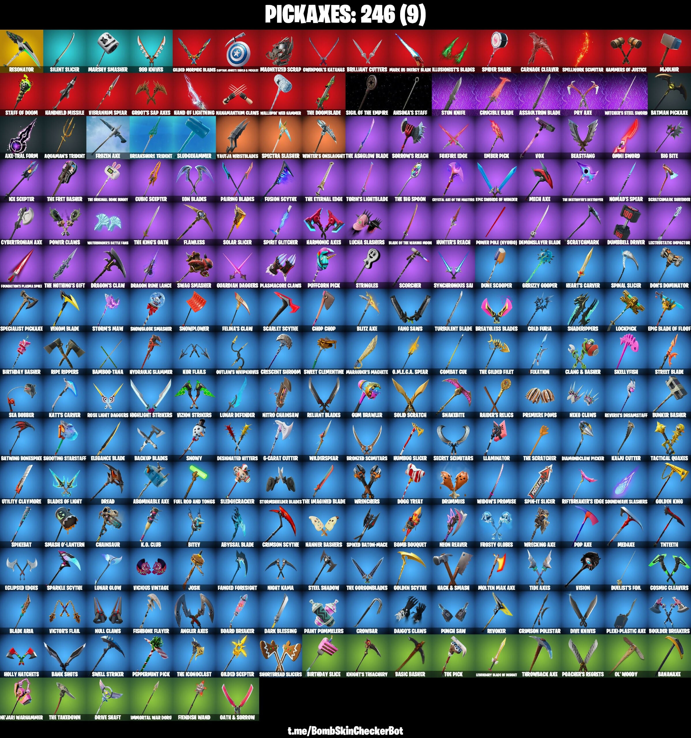 1-Ball, 6-Carat Cutter, 8-Ball vs Scratch, 999 Knives, Abominable Axe, Absenz, Abyssal Blade, Adira, Agent Jones, Agent Peely, Ahsoka Tano, Ahsoka's Staff, Alli, Angler Axes, Antonia, Aphrodite, Aquaman, Aquaman's Trident, Arctic Adeline, Ares, Assaultron Blade, Astra, Aura, Axe-Tral Form, Backup Blades, Bamboo-Tana, Bananaxe, Bank Shots, Basic Basher, Batman Comic Book Outfit, Batman Pickaxe, Batwing Bonespine, Beastfang, Big Bite, Birthday Basher, Birthday Slice, Bitey, Blackheart, Blade Aria, Blade of the Waning Moon, Blades of Light, Blitz Axe, Blitz Knight, Board Breaker, Bomb Bouquet, Boulder Breakers, Breakshore Trident, Breathless Blades, Brilliant Cutters, Brite Raider, Bronzed Scimitars, Brutus (Fully Golden), Bullseye, Bunker Basher, Bunker Jonesy, Bytes, Cameo vs Chic, Captain Jones, Carnage, Carnage Cleaver, Catalyst, Cerberus, Chainsaur, Chaos Director, Charlotte, Chop Chop, Chrome Punk, Clang & Basher, Cluck, Cobalt, Cold Furia, Combat Cue, Contract Giller, Cosmic Cleavers, Crescent Shroom, Crimson Polestar, Crimson Scythe, Crowbar, Crucible Blade, Crystal Axe of the Masters, Cubic Scepter, Cybertritonal Axe, Cybertronian Axe, D'Ark, Daigo, Daigo's Claws, Daigo’s Claws, Dark Blessing, Darth Vader, Deadpool, Deimos, Demi, Demonslayer Blade, Derby Dynamo, Designated Hitters, Diamond Diva, Diamondclaw Picker, Dive Knives, Doctor Doom, Doctor Strange, Dogg Treat, Don's Dominator, Doom, Doom Slayer, Dragon Rune Lance, Dragon's Claw, Dread, Drive Shaft, Drummies, Duelist's Foil, Dumbbell Driver, Dune Scooper, Dusty, Dynamo Tntina, Ebisa, Eclipsed Edges, Electrostatic Impactor, Elegance Blade, Ember, Ember Pick, Emma Frost, Eon, Eon Blades, Epic Blade Of Floof, Epic Blade of Floor, Epic Swords of Wonder, Era, Eternal Knight, Eternal Voyager, Evie, Fabio Sparklemane, Fade, Fallen Love Ranger, Fang Saws, Fanged Foresight, Felina, Felina's Claw, Fiendish Wand, Fish Thicc, Fishbone Flayer, Fixation, Flawless, Focus, Foundation's Plasma Spike, Foxfire Edge, Frosty Globes, Frozen Axe, Frozen Love Ranger, Frozen Raven, Frozen Red Knight, Fuel Rod and Tongs, Fusion, Fusion Scythe, Gear Specialist Maya, Geralt of Rivia, Gilded Morphic Blades, Gilded Scepter, Godzilla Evolved, Golden King, Golden Scythe, Grizzly Gooper, Groot, Groot's Sap Axes, Groots Sap Axes, Grriz, Guardian Daggers, Gum Brawler, Gumbo, Gunnar, Gwendpool's Katanas, Gwenpool, Gwenpool's Katanas, Hack & Smash, Hallolup Web Hammer, Hammers of Justice, Hand of Lightning, Handheld Missile, Handled Missile, Hanner Bashers, Harlowe, Harmonic Axes, Haven, Heart's Carver, Helsie, Hero Baymax, Highlight Strikers, Holiday Boxy, Holly Hatchets, Hope, Humbug Slicer, Hunter's Reach, Hybrid, Hydraulic Slammer, Ice Scepter, Illusionist's Blades, Imani, Immortal War Dogu, Immortal War Doru, Inferno, Iris, J.B. Chimpanski, Jackie, Jade, Jaeger, Jennifer Walters, Jing, Josie, Journey vs Hazard, Jules, K.O. Club, Kado Thorne, Kaiju Cutter, Katt, Katt's Carver, Kendo, Khaby Lame, Kiara K.O., Kit, Knight's Treachery, Kondor, Kor, Kor Flails, Korra, Krisabelle, Kymera, Laguna, Lara Croft, Legendary Blade of Insight, Lennox Rose, LeoTrostate Impactor, Lewis Hamilton, Lexa, Lil Split, Lina Scorch, Llamero, Llaminator, Lockpick, Lorenzo, Lt. Evergreen, Lt. John Llama, Lucia Slashers, Lunar Defender, Lunar Glow, Luxe, Lynx, Mae, Magnetized Scrap, Major Mancake, Malik, Mallory Web Hammer, Mancake, Mandalorian, Marauder's Machete, Mariposa, Mark 85 Energy Blade, Marshy Smasher, Massai, Master Key, Matterhorn's Battle Fans, Mave, Mech Axe, Medaxe, Medusa, Megalo Don, Menace, Meow Skulls, Meowdas, Meowscles (Fully Golden), Merry Marauder, Midas (Fully Golden), Mjolnir, Molten Battle Hound, Molten Max Axe, Molten Valkyrie, Montague, Moon Knight, Mysterio, Mystica, Mystique, Nanamatonium Claws, Nanamatun Claws, Ne'Jari Warhammer, Nejari Warhammer, Neon Reaver, Nexo Claws, Nezumi, Night Kama, Nisha, Nitro Chainsaw, Nolan Chance, Nomad's Spear, Null Claws, Nyanja, O.M.E.G.A. Spear, Oath & Sorrow, Ocean, Ol' Woody, Omegarok, Omni Sword, Onesie, Optimus Prime, Oscar, Outlaw's Whipknives, P-1000, Paint Pummelers, Pairing Blades, Paradox (Reality-669), Peabody, Peelverine, Peely, Peppermint Pick, Peter Griffin, Piper Pace, Pitstop, Plasmacore Claws, Plexi-Plastic Axe, Poacher's Regrets, Polar Peely, Pop Axe, Poseidon, Powder, Power Claws, Power Pole (Nyooid), Power Pole (Nyxoid), Predator, Premiere Poms, Prese, Pry Axe, Puffcorn Pick, Punch Saw, Purebase Meowscles, Raider's Relics, Rainbow Racer, Raz, Rebirth Raven, Red Strike, Reliant Blades, Relik, Remedy vs Toxin, Renegade Lynx, Renzo the Destroyer, Resonator, Reverie, Reverie's Dreamstaff, Reverie’s Dreamstaff, Revoker, Rian, Riftbreaker's Edge, Riftbreaker’s Edge, Ringmaster Scarr, Ripe Rippers, Rippley vs Sludge, Ronin, Rose Light Daggers, Rox, Ruin, Runway Racer, Rust, Sabina, Santa Dogg, Scarlet Scythe, Scorcher, Scratchmark, Scratchmark Shredder, Scuba Jonesy, Sea Bobber, Secret Scimitars, Seeker, Selene, Sentinel, Sgt. Winter, Shaderippers, Shadow Blade Hope, Shanta, Shooting Starsfat, Shooting Starsfax, Shortbread Slicers, Shuri, Sidewinder, Sigil of the Empire, Silent Slicer, Singularity, Siona, Skellyfish, Skye, Slayer Juice Wrld, Sled Ready Guff, Sledgecracker, Sludgebammer, Sludgehammer, Smash O' Lantern, Smash O'-Lantern, Snakebite, Snap, Snowglobe Smasher, Snowmando, Snowplower, Snowy, Solar Slicer, Solid Scratch, Solid Snake, Son Goku, Sorrow's Reach, Soundwave Slashers, Sparkle Scythe, Sparkle Supreme, Specialist Pickaxe, Spectra Knight, Spectra Slasher, Spellwork Scimitar, Sph-It Slicer, Spider Snare, Spider-Gwen, Spider-Man (Miles Morales), Spider-Man (No Way Home), Spiderman Gilded Reality, Spih-it Slicer, Spikebat, Spiked Baton-Mace, Spinal Slicer, Spirit Glitcher, Spirit Hunter Saeko, Staff of Doom, Steel Shadow, Storm, Storm's Maw, Stormfarer, Stormshielder Blades, Storm’s Maw, Stratus, Stray, Street Blade, Stringles, Stun Knife, Subzero Cryptic, Summit Striker, Sunny, Surf Wi