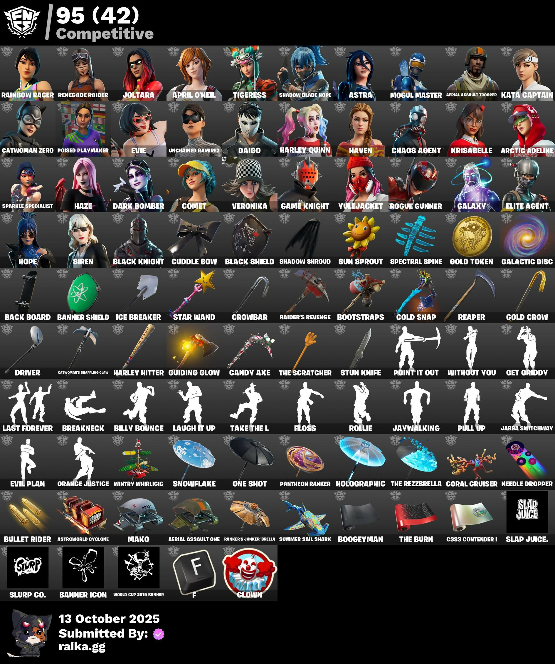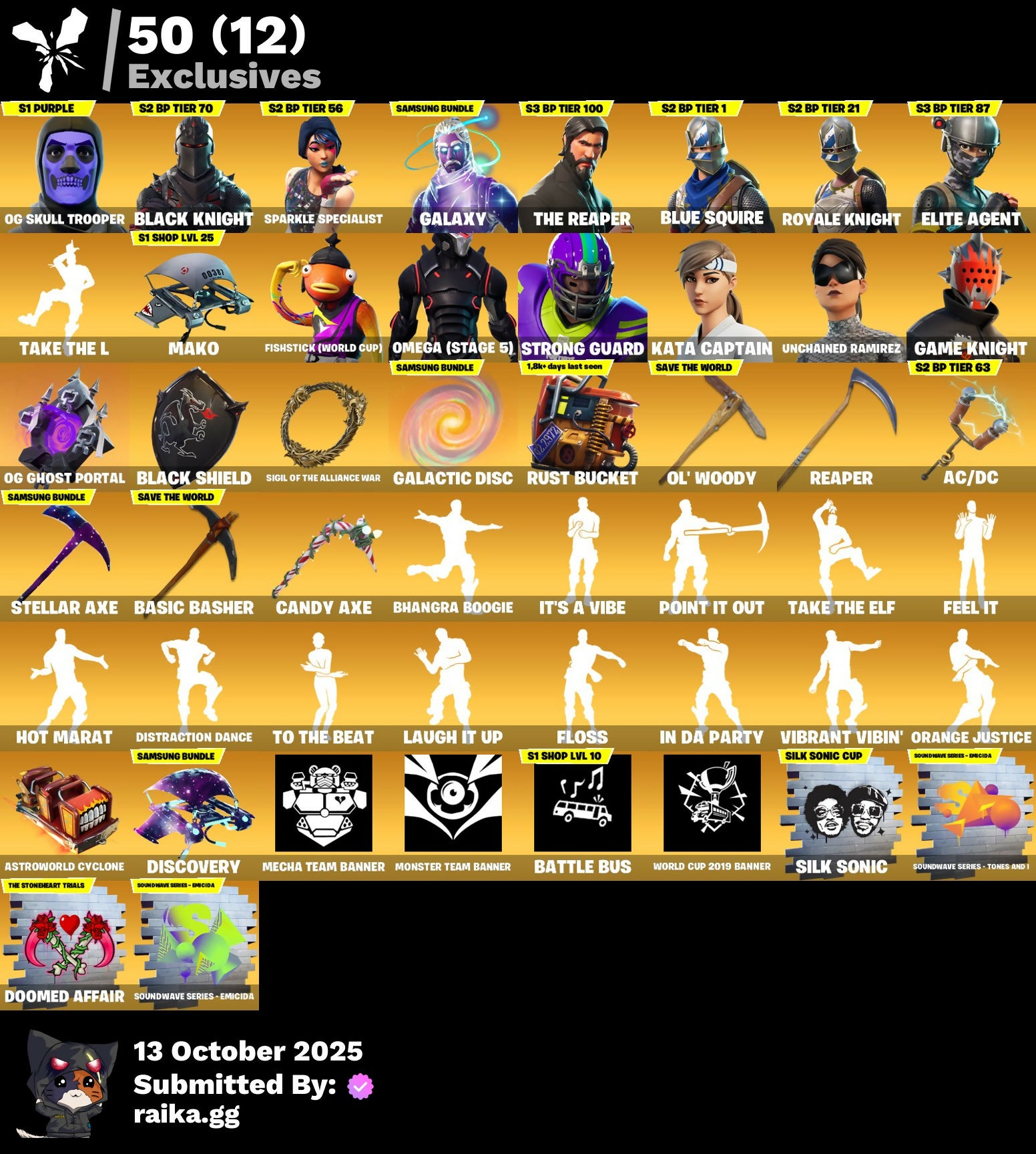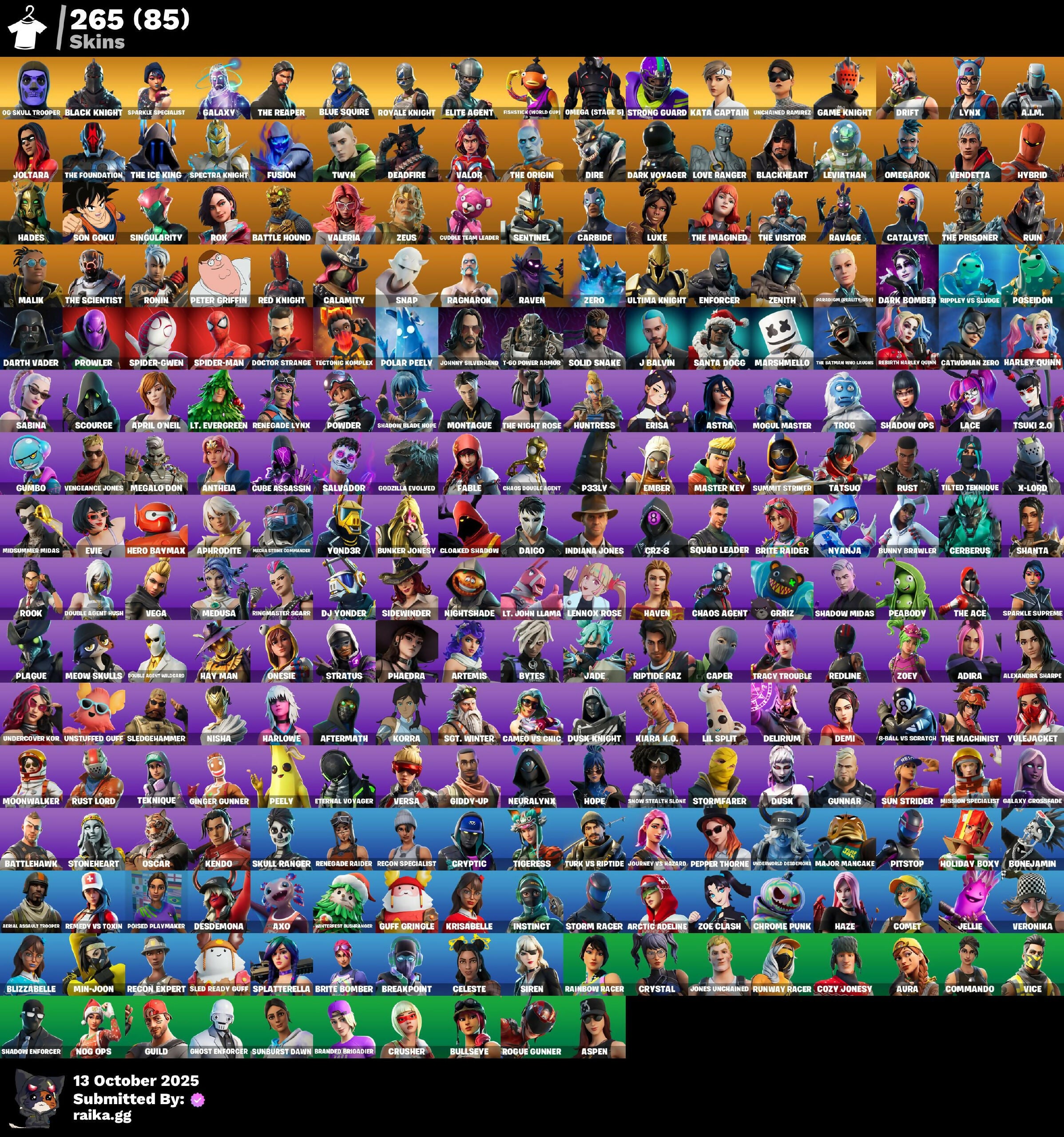 265 skins ☑️ Og Skull Trooper ☑️ Purple Skull Trooper ☑️ Black Knight ☑️ Sparkle Specialist ☑️ Galaxy ☑️ The Reaper ☑️ Blue Squire ☑️ 250 VB