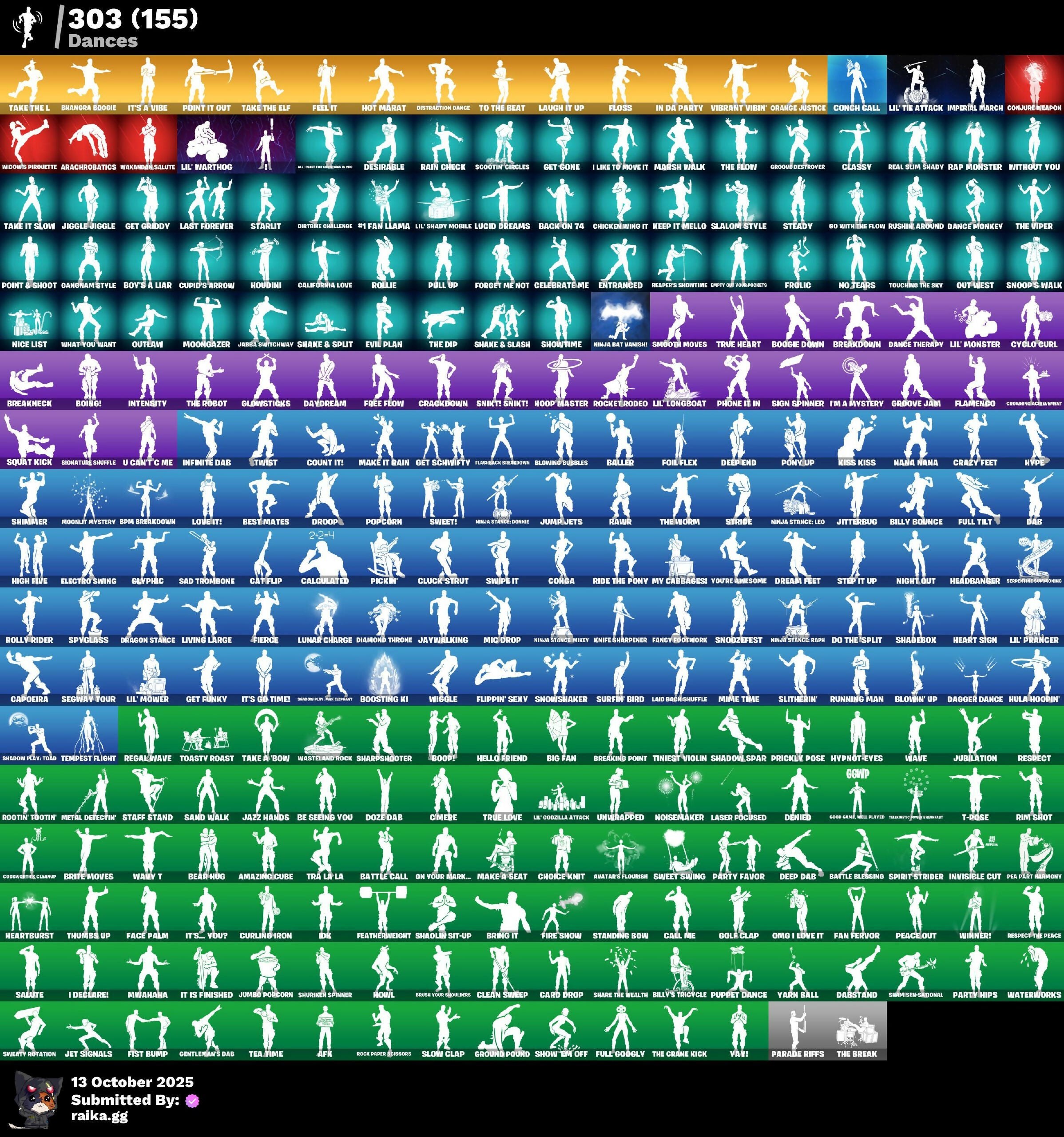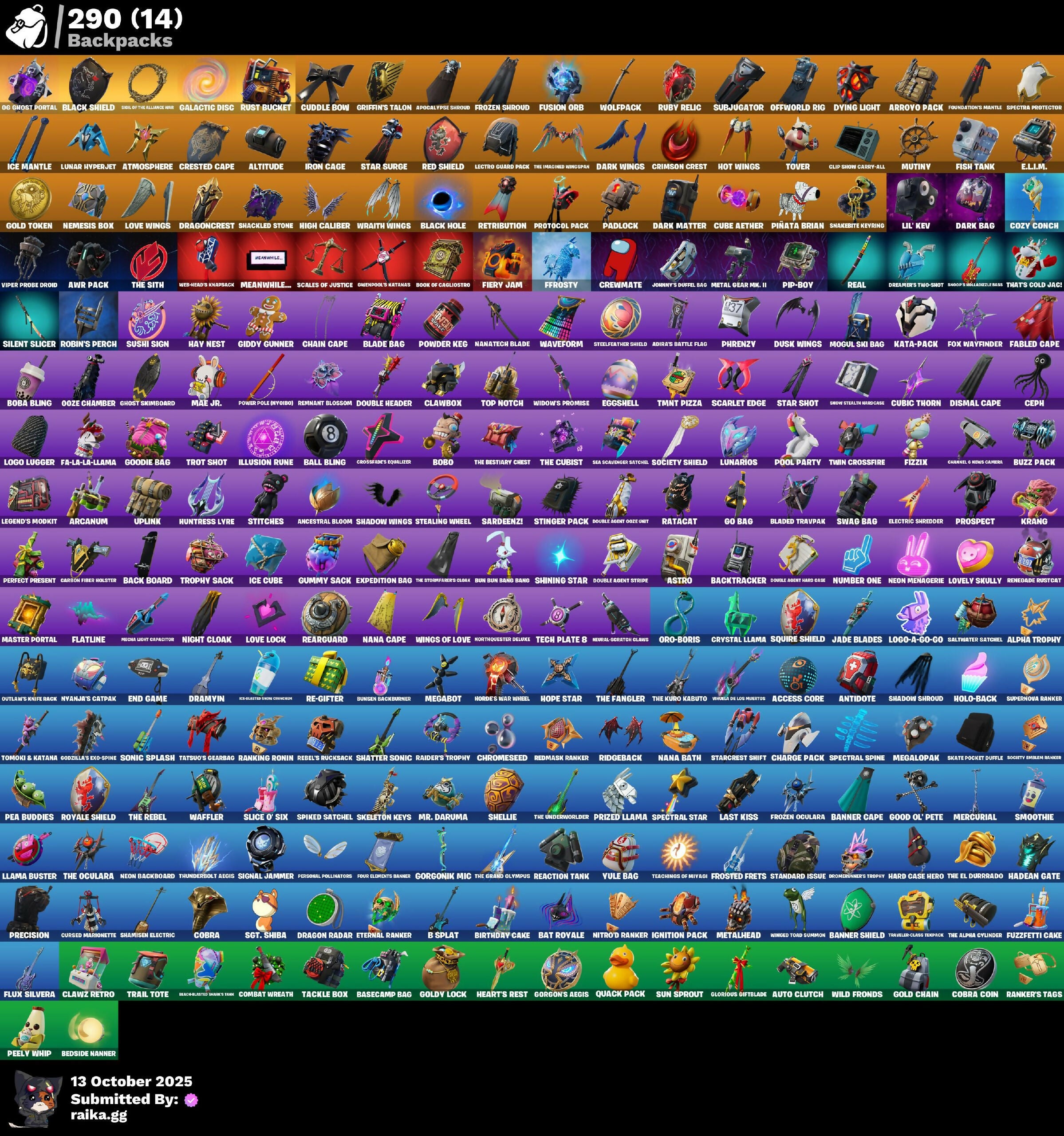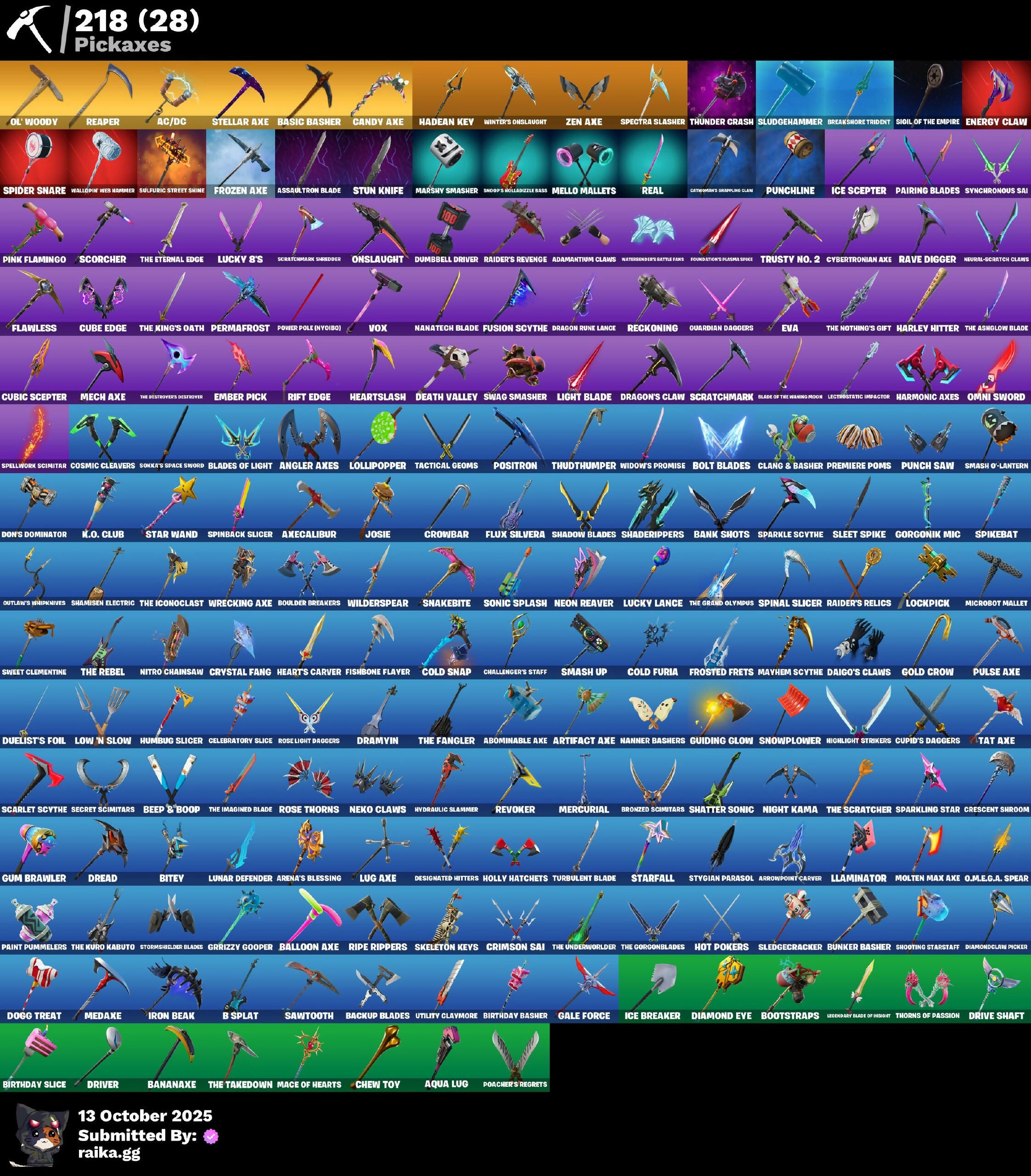 #1 Fan Llama, 8-Ball vs Scratch, A.I.M., AC/DC, AFK, Abominable Axe, Access Core, Adamantium Claws, Adira, Adira's Battle Flag, Aerial Assault One, Aerial Assault Trooper, Aftermath, Alexandra Sharpe, Alpha Trophy, Altitude, AmazingCube, Ancestral Bloom, Angler Axes, Anthea, Antidote, Aphrodite, Apocalypse Shroud, April O'Neil, Aqua Lug, Arachnobatics, Arcanum, Arctic Adeline, Arena's Blessing, Arrowpoint Carver, Arroyo Pack, Artemis, Artifact Axe, Aspen, Assaultron Blade, Astra, Astro, Astroworld Cyclone, Atmosphere, Aura, Auto Clutch, Avatar's Flourish, Awr Pack, Axecalibur, Axo, B Splat, BPM Breakdown, Back Board, Back On 74, Backtracker, Backup Blades, Ball Bling, Baller, Balloon Axe, Bananaxe, Bank Shots, Banner Cape, Banner Icon, Banner Shield, Basecamp Bag, Basic Basher, Bat Royale, Battle Blessing, Battle Bus, Battle Call, Battle Hound, Battlehawk, Be Seeing You, Bear Hug, Bedside Nanner, Beep & Boop, Best Mates, Bhangra Boogie, Big Fan, Billy Bounce, Billy's Tricycle, Birthday Basher, Birthday Cake, Birthday Slice, Bitey, Black Hole, Black Knight, Black Shield, Blackheart, Blade Bag, Blade of the Waning Moon, Bladed Travpak, Blades of Light, Blizzabelle, Blowin' Up, Blowing Bubbles, Blue Squire, Boba Bling, Bobo, Boing!, Bolt Blades, Bone Jamin, Boogeyman, Boogie Down, Boop!, Boosting Ki, Bootstraps, Boulder Breakers, Boys A Liar, Branded Brigadier, Breakdown, Breaking Point, Breakneck, Breakpoint, Breakshore Trident, Bring It, Brite Bomber, Brite Moves, Brite Raider, Bronzed Scimitars, Bullet Rider, Bullseye, Bun Bun Bang Bang, Bunker Basher, Bunker Jonesy, Bunny Brawler, Buzz Pack, Bytes, C3S3 Contender I, CRZ-8, Calamity, Calculated, California Love, Call Me, Cameo vs Chic, Candy Axe, Caper, Capoeira, Carbide, Card Drop, Cat Flip, Catalyst, Cattycorn's Grappling Claw, Catwoman Zero, Catwoman's Grappling Claw, Celebrate Me, Celebratory Slice, Celeste, Cerberus, Chain Cape, Challenger's Staff, Chaos Agent, Chaos Double Agent, Charge Pack, Chew Toy, Chickenwing It, Choice Knit, Chrome Punk, Chromeseed, Cimere, Clang & Basher, Classy, Clawbox, Clawz Retro, Clean Sweep, Cloaked Shadow, Clown, Cluck Strut, Cobra, Cobra Coin, Cold Furia, Cold Snap, Combat Wreath, Comet, Commando, Conch Call, Conga, Conjure Weapon, Coral Cruiser, Cosmic Cleavers, Count It!, Cozy Conch, Cozy Jonesy, Crackdown, Crazy Feet, Crescent Shroom, Crested Cape, Crimson Crest, Crimson Sai, Crowbar, Crusher, Cryptic, Crystal, Crystal Fang, Crystal Llama, Cube Aether, Cube Assassin, Cube Edge, Cubic Scepter, Cubic Thorn, Cuddle Bow, Cuddle Team Leader, Cupid's Arrow, Cupid's Daggers, Curling Iron, Cybertronian Axe, Cyclo Curl, DJ Yonder, Dab, Dabstand, Dagger Dance, Daigo, Daigo's Claws, Dance Monkey, Dance Therapy, Dark Bag, Dark Bomber, Dark Matter, Dark Voyager, Dark Wings, Darth Vader, Daydream, Deadfire, Death Valley, Deep Dab, Deep End, Delirium, Demi, Denied, Desdemona, Designated Hitters, Desirable, Diamond Eye, Diamond Throne, Diamondclaw Picker, Dire, Dirtbike Challenge, Discovery, Dismal Cape, Distraction Dance, Do The Split, Doctor Strange, Dogg Treat, Don's Dominator, Doomed Affair, Double Agent Hush, Double Agent Wildcard, Double Header, Doze Dab, Dragon Radar, Dragon Rune Lance, Dragon Stance, Dragon's Claw, Dragoncrest, Dramvin, Dramyin, Dread, Dream Feet, Drift, Drive Shaft, Driver, Droop, Duelist's Foil, Dumbbell Driver, Dusk, Dusk Knight, Dusk Wings, Dying Light, E.L.I.M., Eggshell, Electric Shredder, Electro Swing, Electrostatic Impactor, Elite Agent, Ember, Ember Pick, Empty Out Your Pockets, End Game, Energy Claw, Enforcer, Entranced, Erisa, Eternal Ranker, Eternal Voyager, Eva, Evie, Evil Plan, Expedition Bag, F, Fa-La-La-Llama, Fable, Fabled Cape, Face Palm, Fan Fervor, Fancy Footwork, Featherweight, Feel It, Fierce, Fire Show, Fish Tank, Fishbone Flayer, Fishstick (World Cup), Fist Bump, Fizzix, Flamenco, Flashback Skiddown, Flatline, Flawless, Flippin' Sexy, Floss, Flux Silvera, Foil Flex, Forget Me Not, Founder's Plasma Spiker, Fox Wayfinder, Free Flow, Frolic, Frosted Frets, Frozen Axe, Frozen Oculara, Frozen Shroud, Full Googly, Full Tilt, Fusion, Fusion Orb, Fusion Scythe, Fuzzetti Cake, Galactic Disc, Galaxy, Galaxy Crossfade, Gale Force, Game Knight, Ganondam Style, Gentleman's Dab, Get Funky, Get Gone, Get Griddy, Get Schwifty, Ghost Enforcer, Ghost Skimboard, Giddy Gunner, Giddy-Up, Ginger Gunner, Glorious Giftblade, Glowsticks, Glyphic, Go Bag, Go With The Flow, Godzilla Evolved, Godzilla's Exo-Spine, Gold Chain, Gold Crow, Gold Token, Goldy Lock, Golf Clap, Good Ol' Pete, Goodie Bag, Gorgon's Aegis, Gorgonik Mic, Griffin's Talon, Grizzly Gooper, Groove Destroyer, Groove Jam, Ground Pound, Grriz, Guardian Daggers, Guff Gringle, Guiding Glow, Guild, Gum Brawler, Gumbo, Gummy Sack, Gunnar, Hadean Gate, Hadean Key, Hades, Hard Case Hero, Harley Hitter, Harley Quinn, Harlowe, Harmonic Axes, Haven, Hay Man, Hay Nest, Haze, Headbanger, Heart Sign, Heart's Rest, Heartburst, Hearts Carver, Heartslash, Hello Friend, Hero Baymax, High Caliber, High Five, Highlight Strikers, Holiday Boxy, Holly Hatchets, Holo-Back, Holographic, Hoop Master, Hope, Hope Star, Hot Marat, Hot Pokers, Hot Wings, Houdini, Howl, Hula Hoop'in', Humbug Slicer, Huntress, Huntress Lyre, Hybrid, Hydraulic Slammer, Hype, Hypnoteyes, I Declare!, I Like To Move It, I'm A Mystery, IDK, Ice Breaker, Ice Cube, Ice Mantle, Ice Scepter, Ignition Pack, Illusion Rune, Imperial March, In Da Party, Indiana Jones, Infinite Dab, Instinct, Intensity, Invisible Cut, Iron Beak, Iron Cage, It Is Finished, It's A Vibe, It's Go Time!, It's... You?, J Balvin, Jabba Switchway, Jade, Jade Blades, Jaywalking, Jazz Hands, Jellie, Jet Signals, Jiggle Jiggle, Jitterbug, Johnny Silverhand, Joltara, Jones Unchained, Josie, Journey vs Hazard, Jubilation, Jumbo Popcorn, Jump Jets, K.O. Club, Kata Captain, Kata-Pack, Keep It Mello, Kendo, Kiara K.O., Kiss Kiss, Knife Sharpener, Korra, Krang, Krisabelle, Lace, Laid Back Shuffle, Laser Focused, Last F